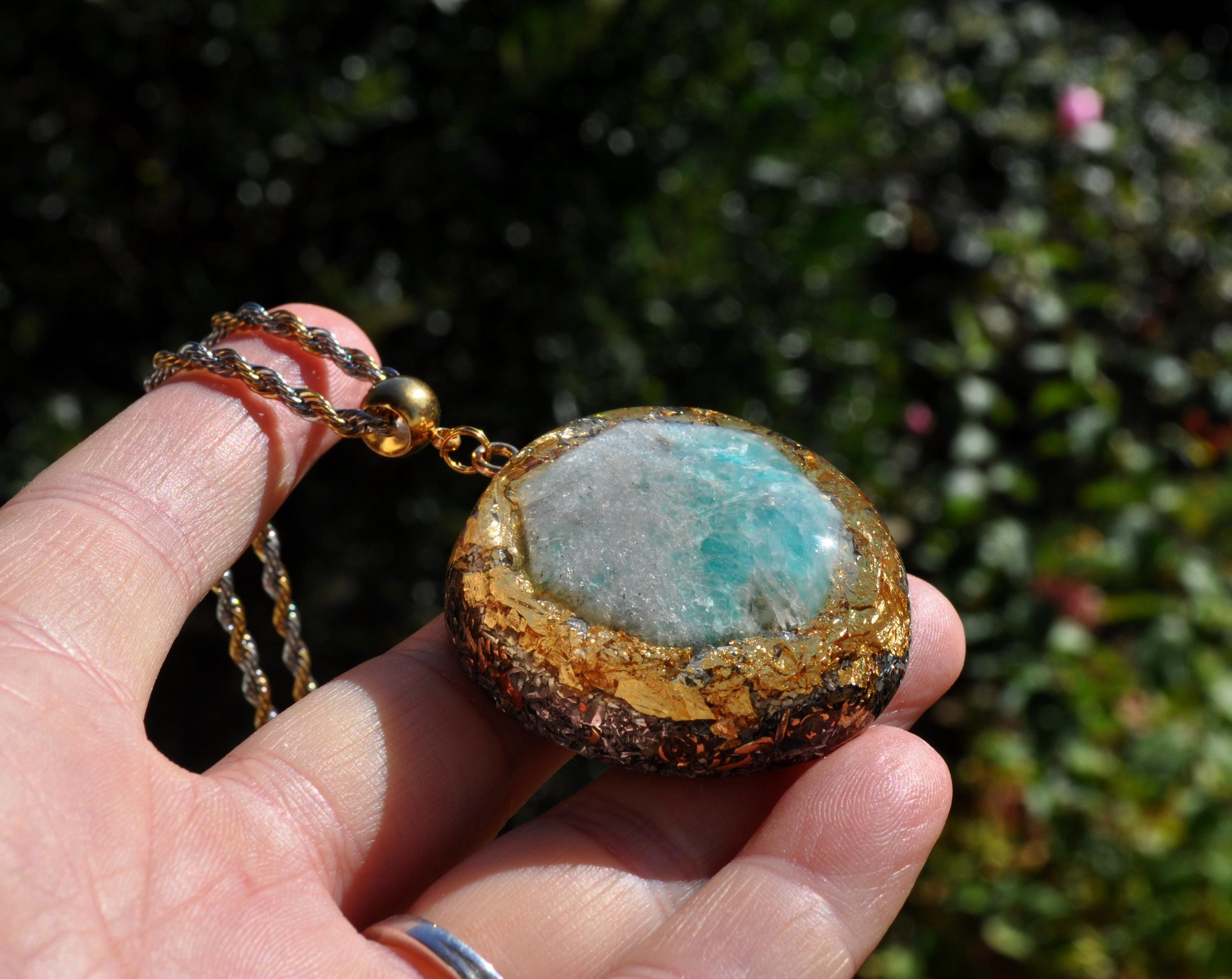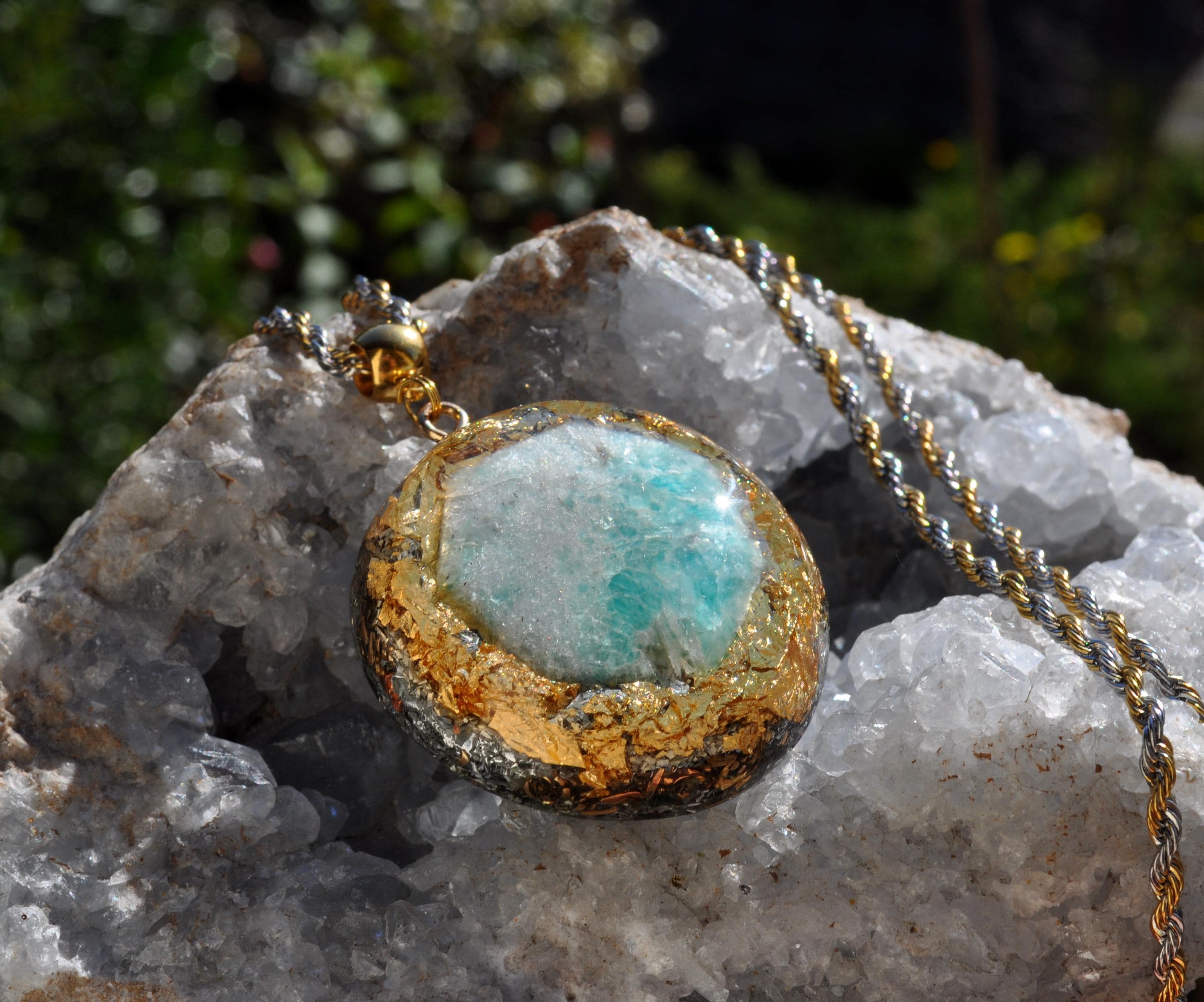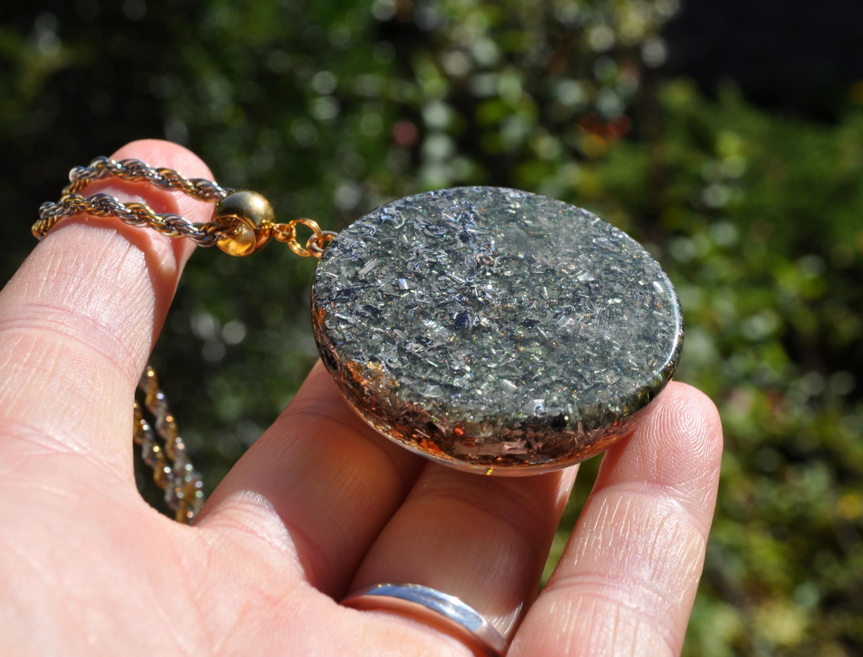 Revitalize your space and spirit with our handmade Orgonite pendant, featuring a meticulously crafted cabochon adorned with shimmering leaf gold flakes. Each pendant is infused with a harmonious blend of crystals — Rose Quartz, Black Tourmaline, Elite Shungite, and Rhodizite — beautifully encased in crystal-clear resin.