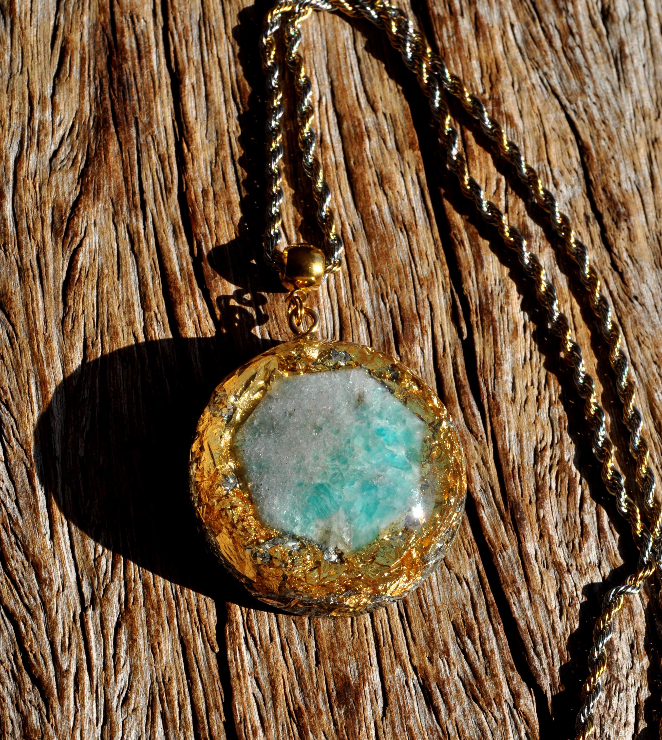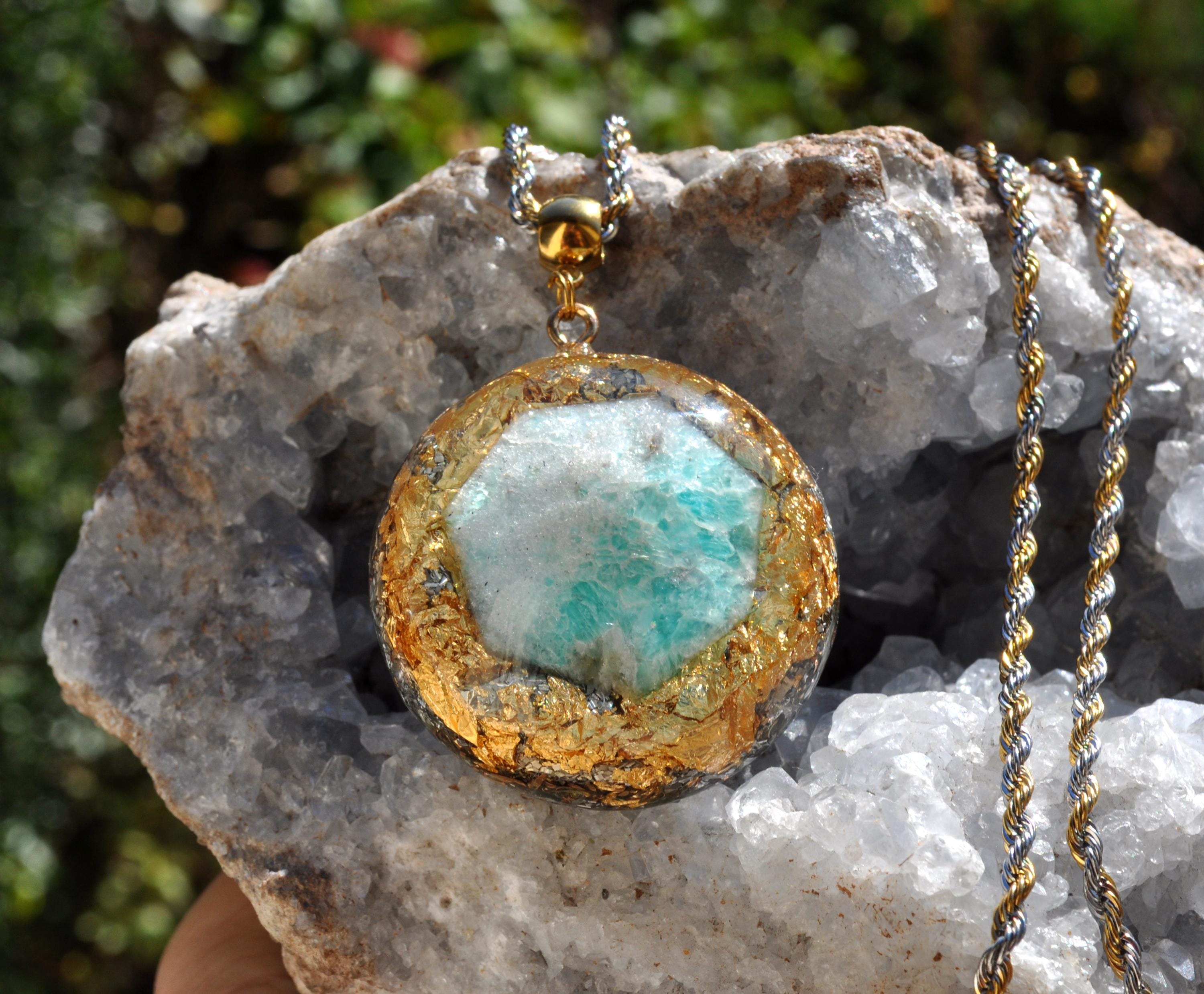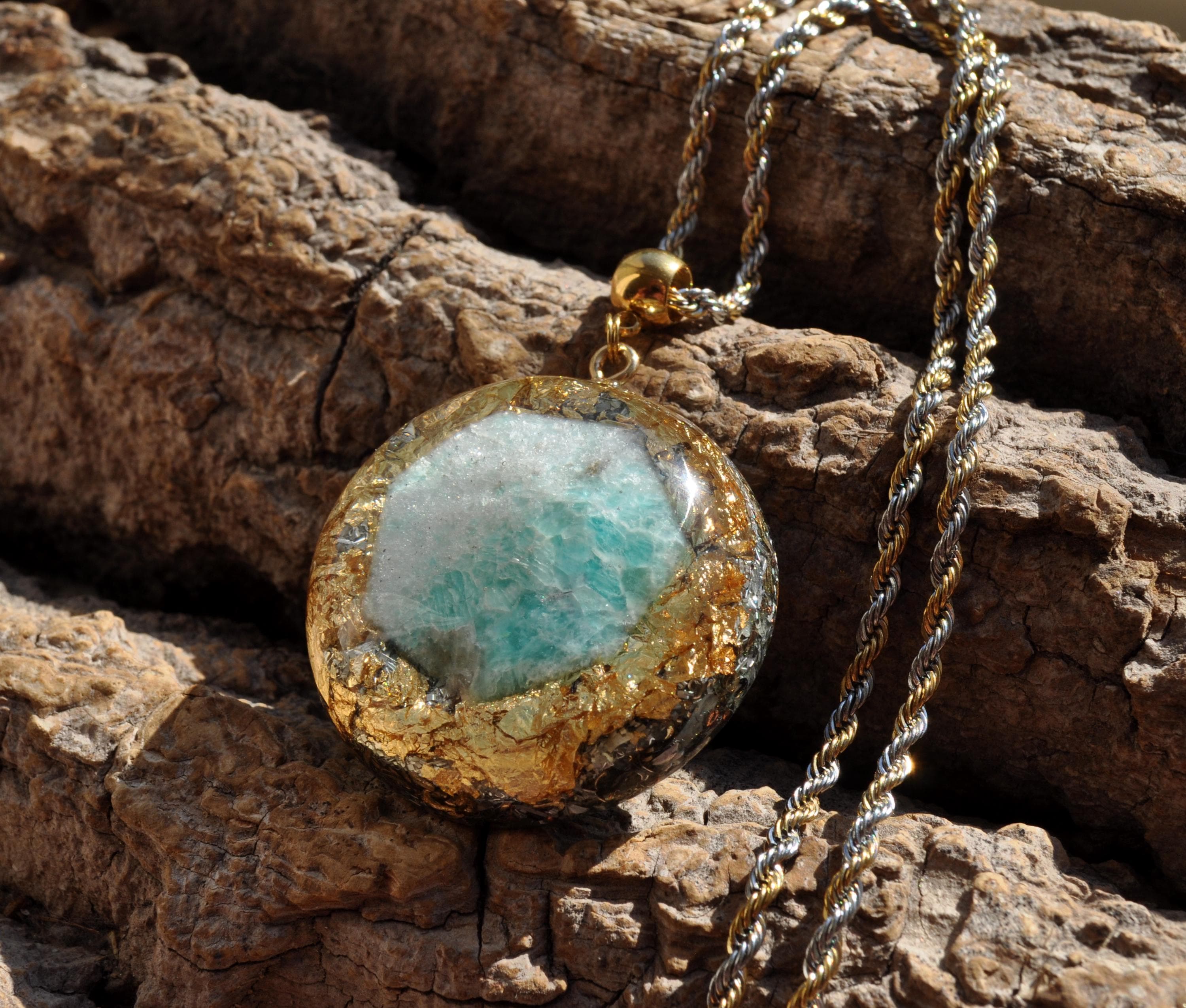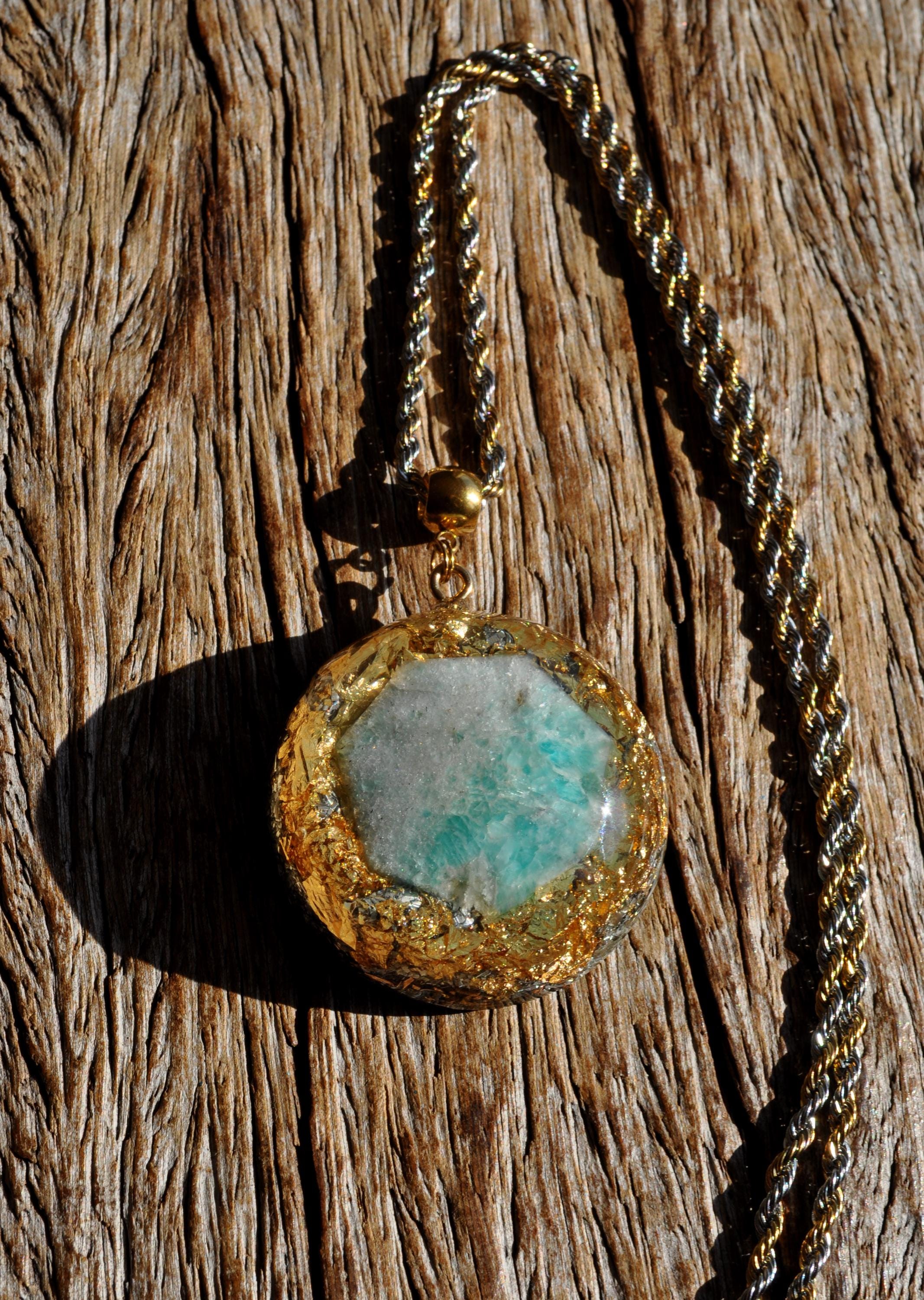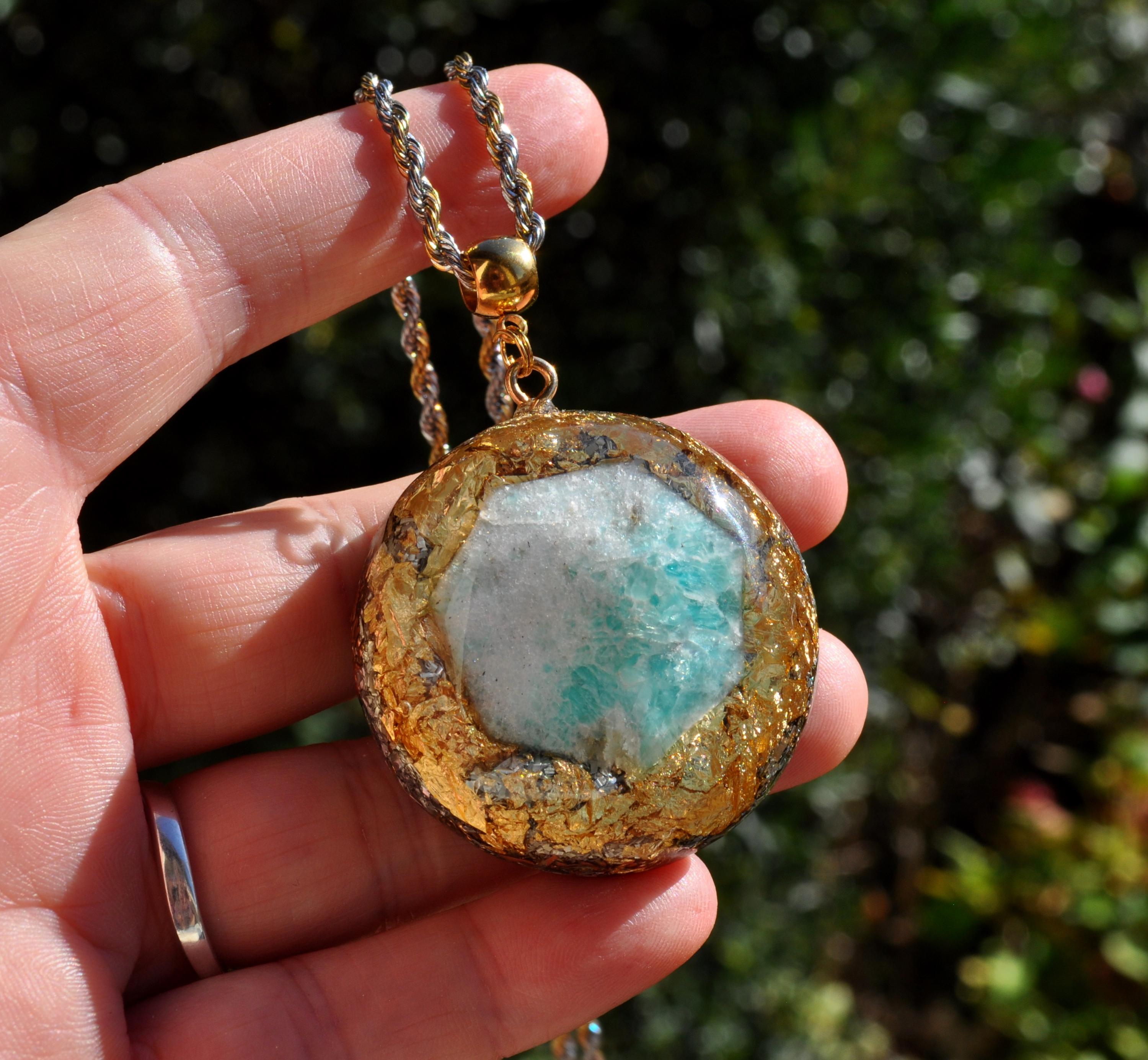 At the heart of this pendant lies a striking hexagonal Amazonite cabochon (measuring 4.2 cm / 1.65 inches in diameter), handcrafted by lapidarist Stefan from raw Amazonite stone and polished to a smooth, radiant finish. The hexagonal shape is a timeless symbol of harmony and balance, reflecting the interconnected flow of energy in nature and within ourselves. Its symmetry enhances the sense of equilibrium that Amazonite is traditionally associated with.