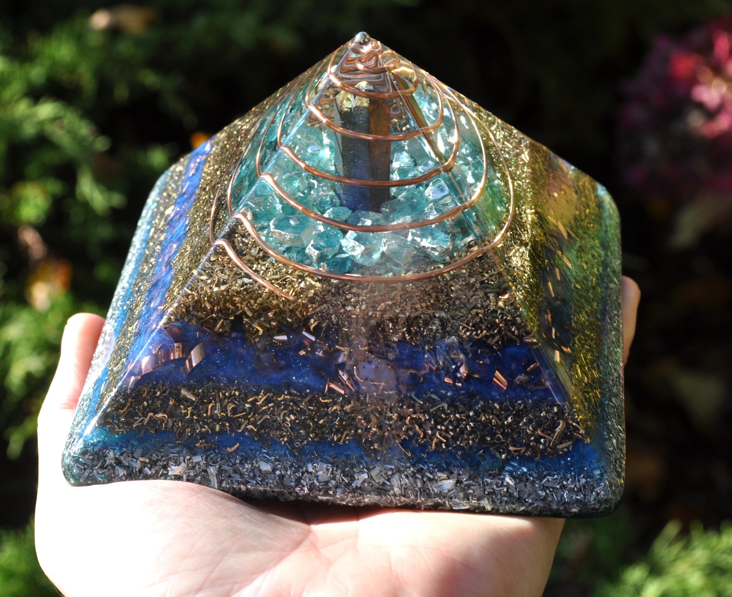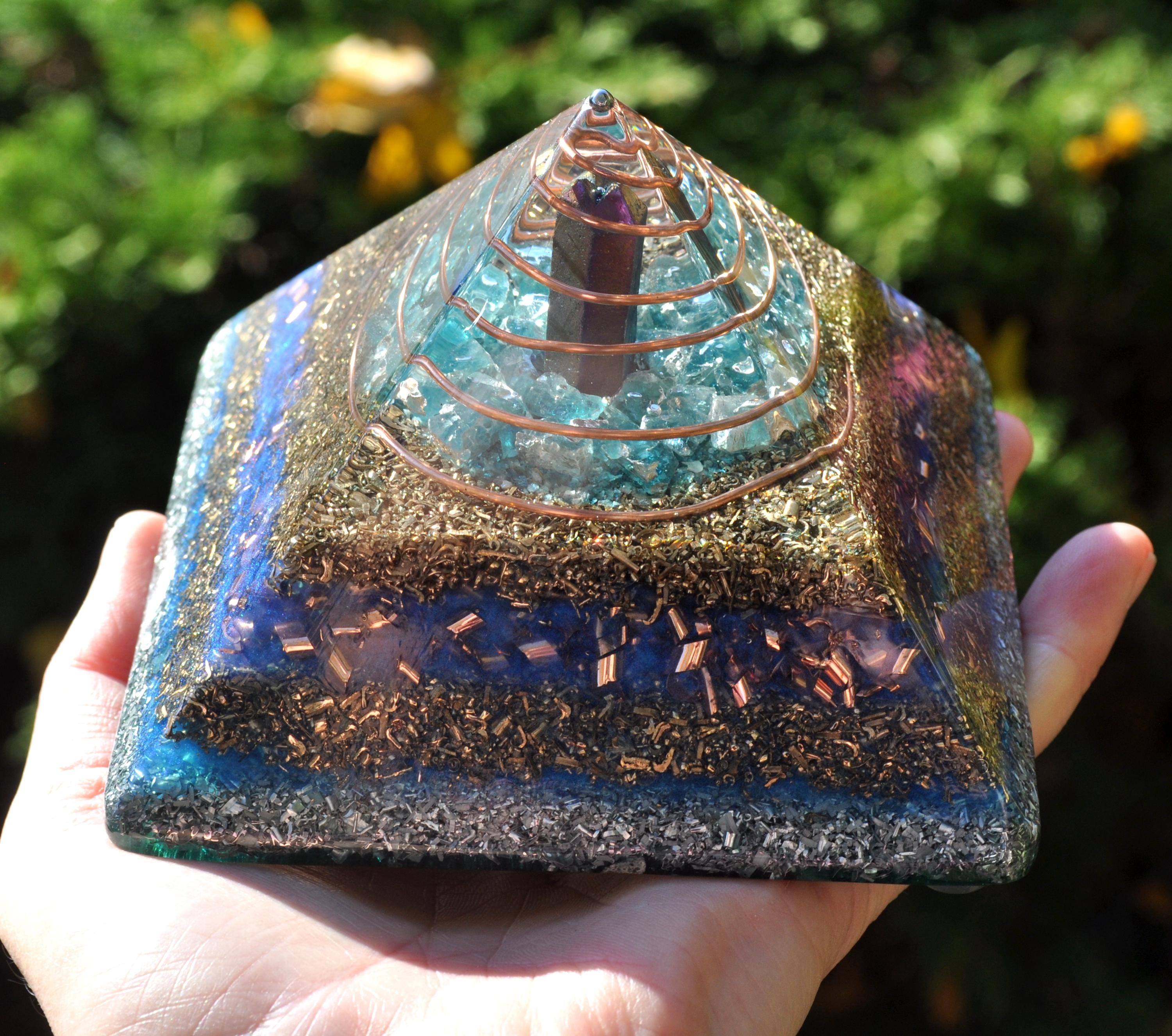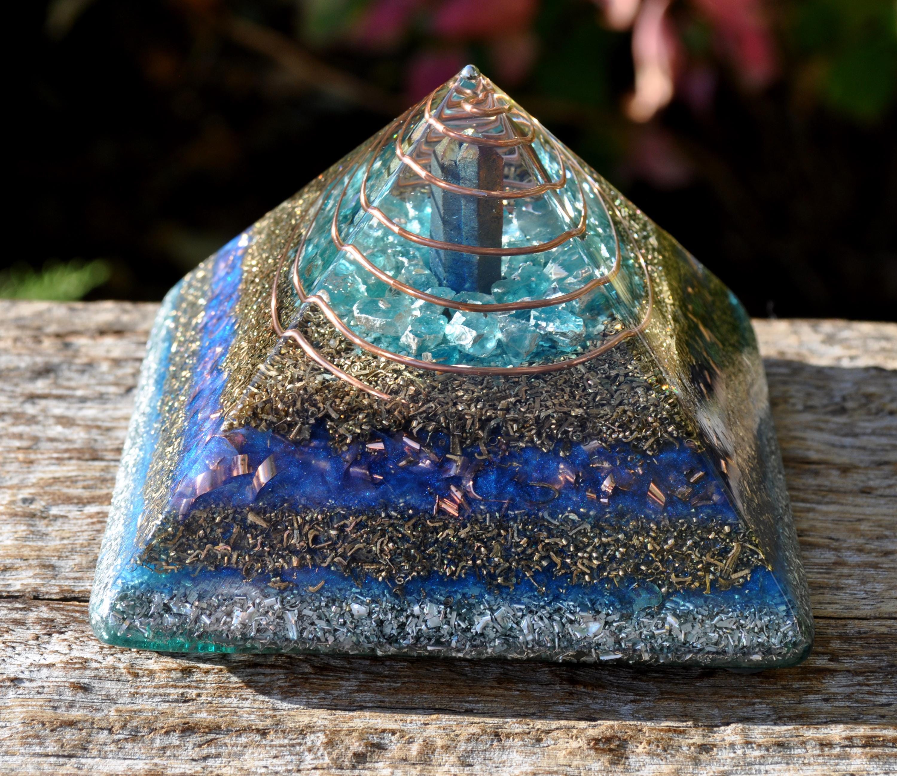 The pyramid is made from densely layered aluminum, bronze, copper, and brass shavings—materials traditionally used in Orgonite® for optimal energy flow. Four terminated quartz points sit within the metal layers, each directing energy outward to encourage a balanced, multidirectional effect. The durable resin creates natural pressure during curing, activating the piezoelectric qualities of the quartz.