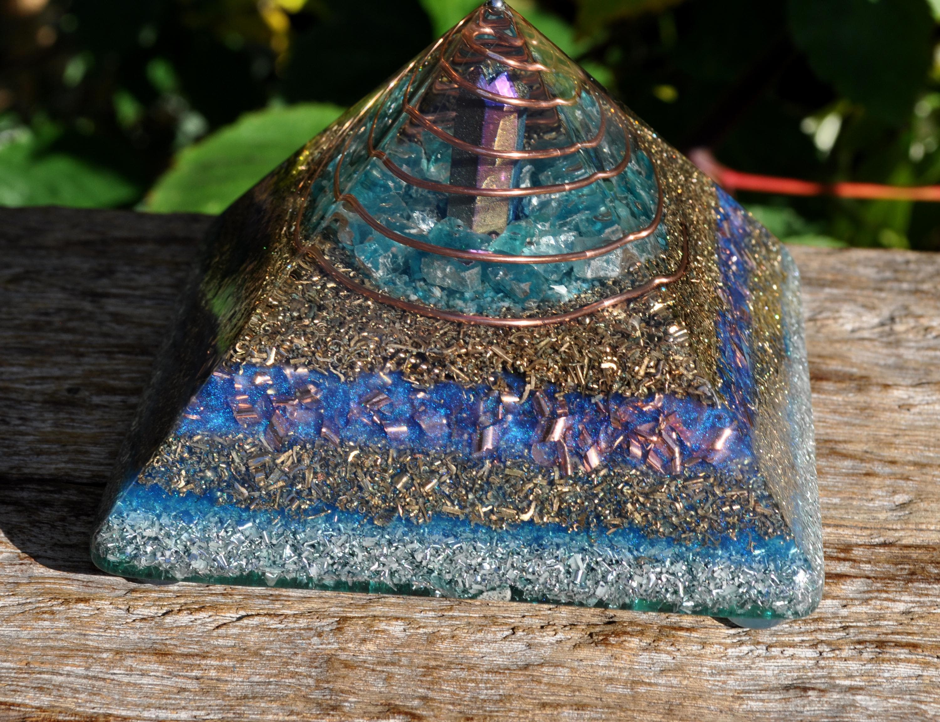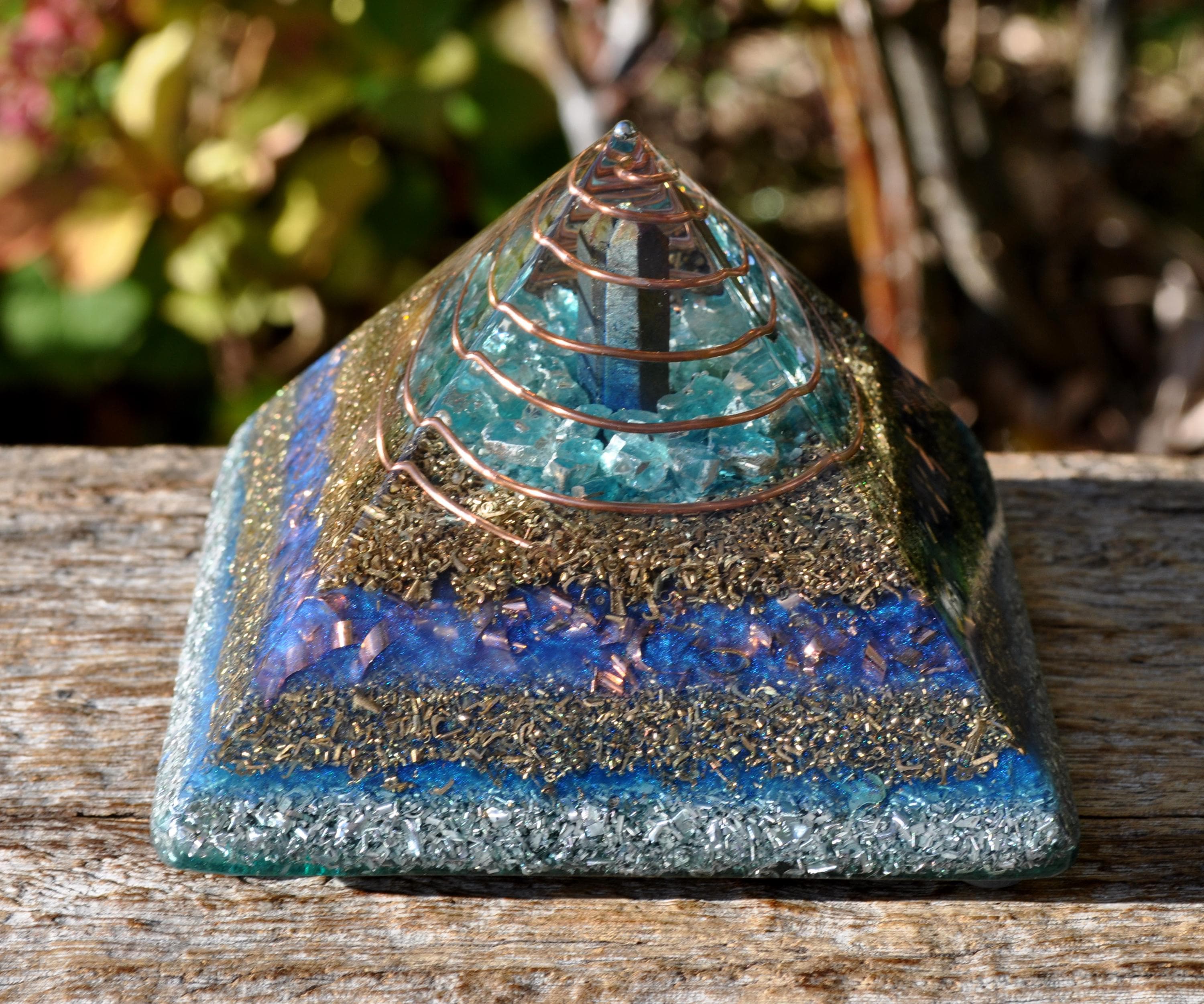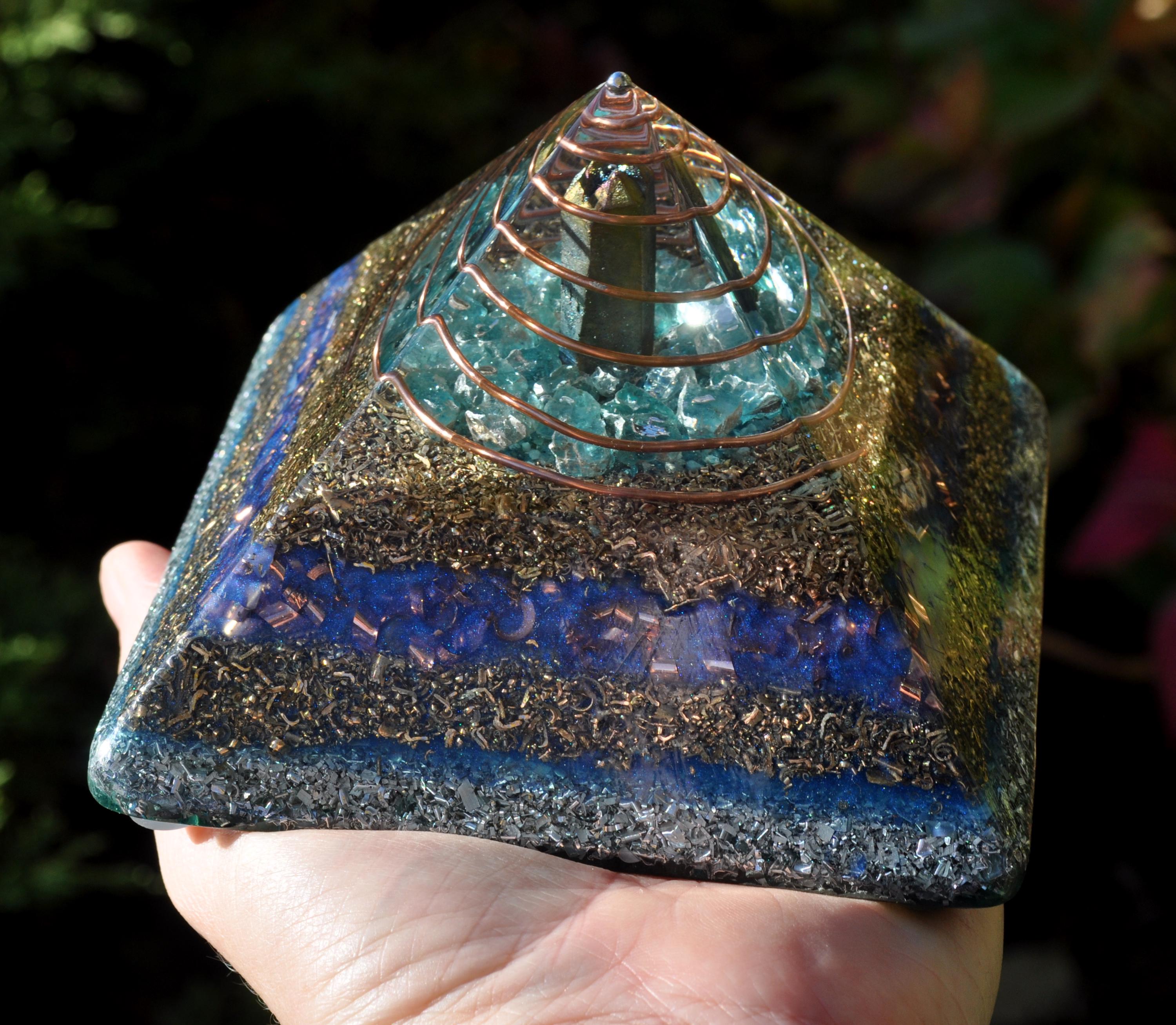 The pyramid is made from densely layered aluminum, bronze, copper, and brass shavings—materials traditionally used in Orgonite® for optimal energy flow. Four terminated quartz points sit within the metal layers, each directing energy outward to encourage a balanced, multidirectional effect. The durable resin creates natural pressure during curing, activating the piezoelectric qualities of the quartz.