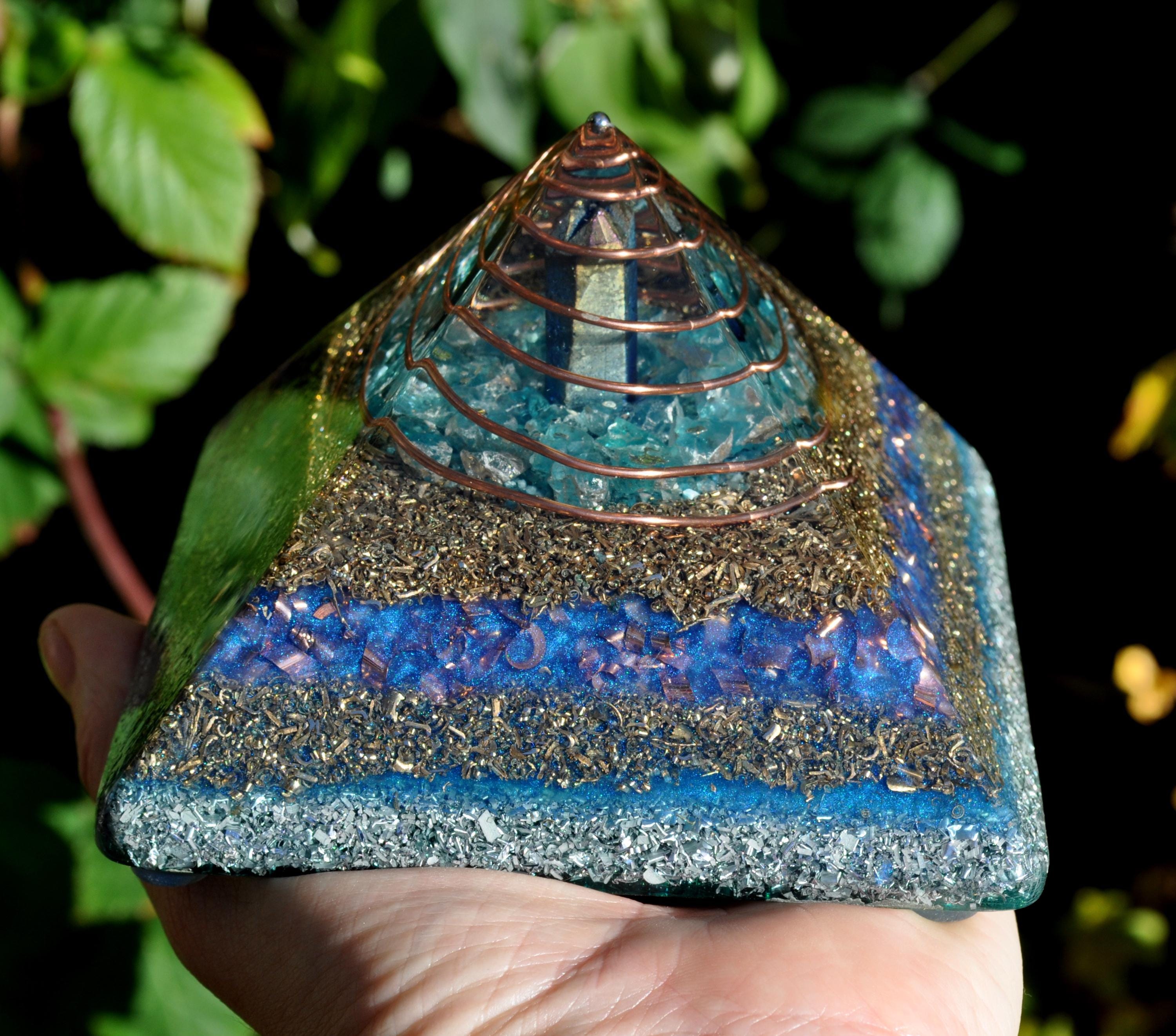 This handcrafted sky-blue Orgonite® Giza Pyramid is created using the exact proportions of the Great Pyramid of Giza. Its calming blue tones highlight the central Titanium Quartz point, which is surrounded by luminous Blue Apatite crystals to enrich the overall energetic atmosphere of the piece. A stainless-steel sphere positioned at the top disperses a softer, wider energetic field rather than a straight beam.