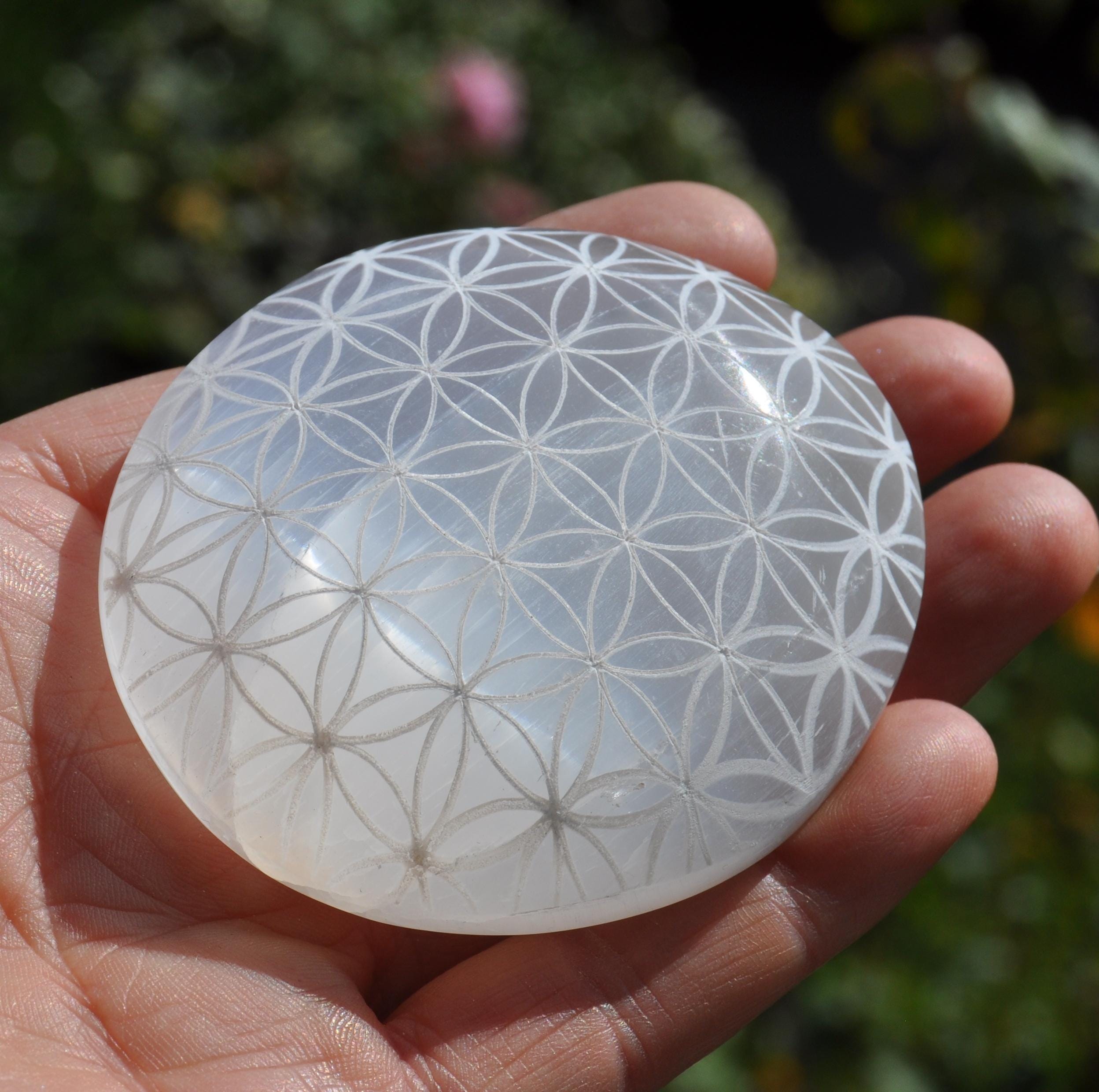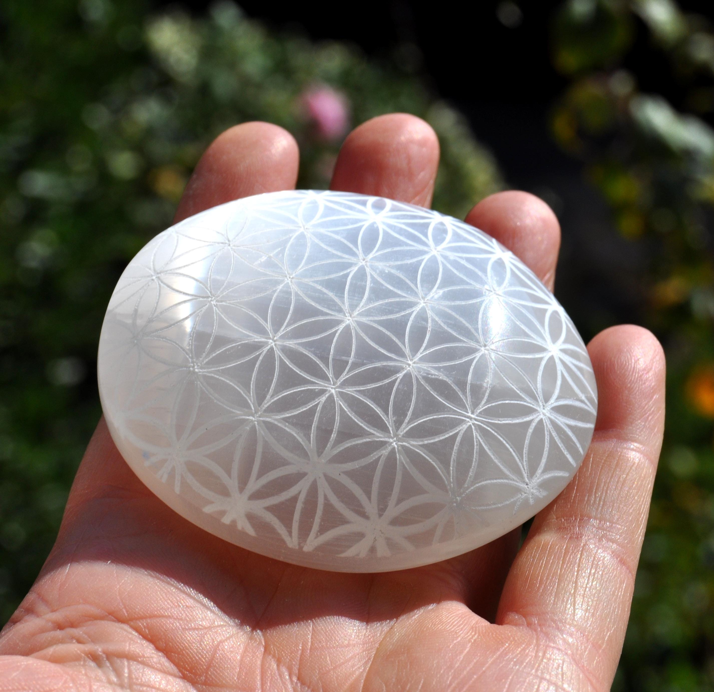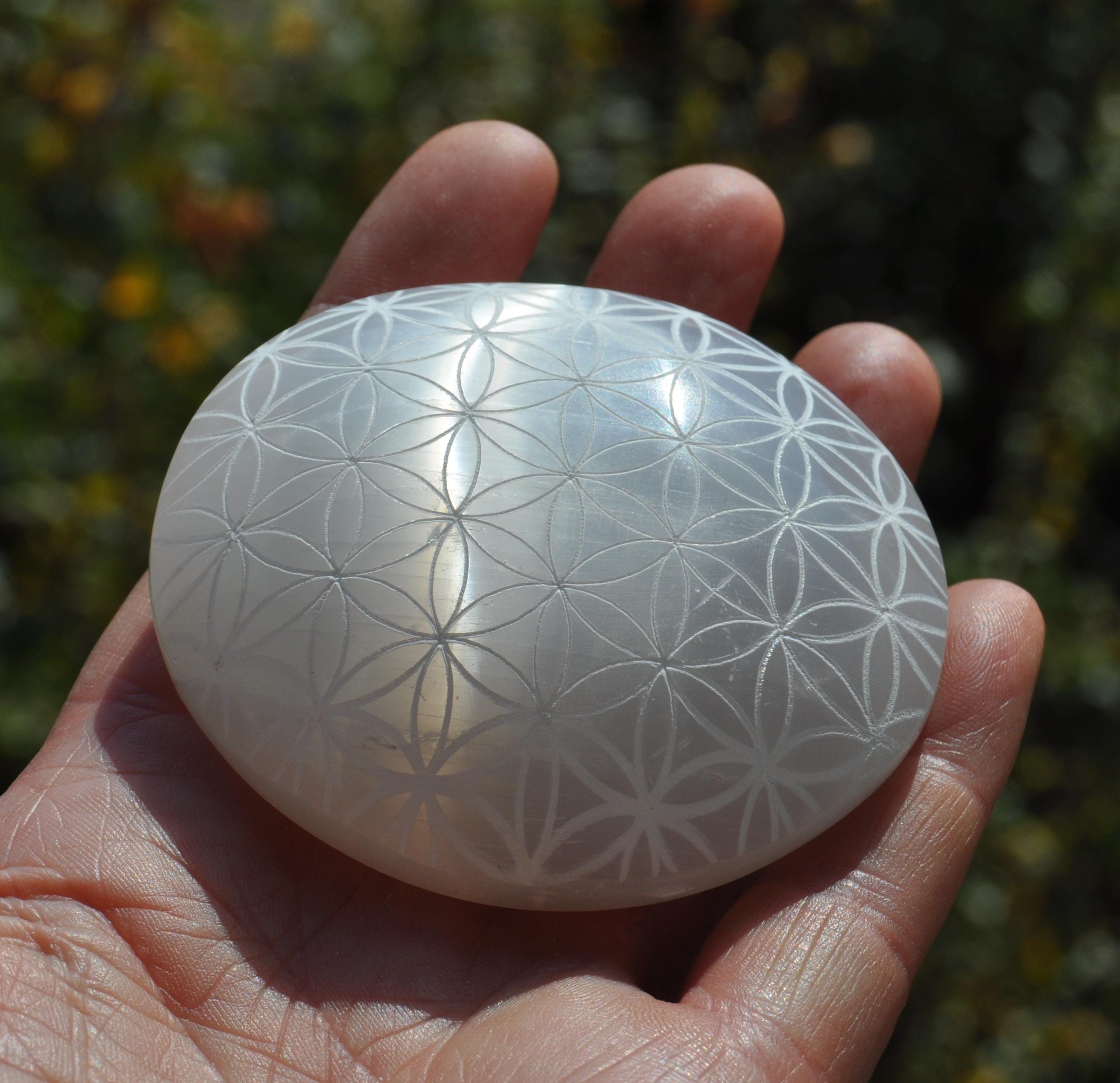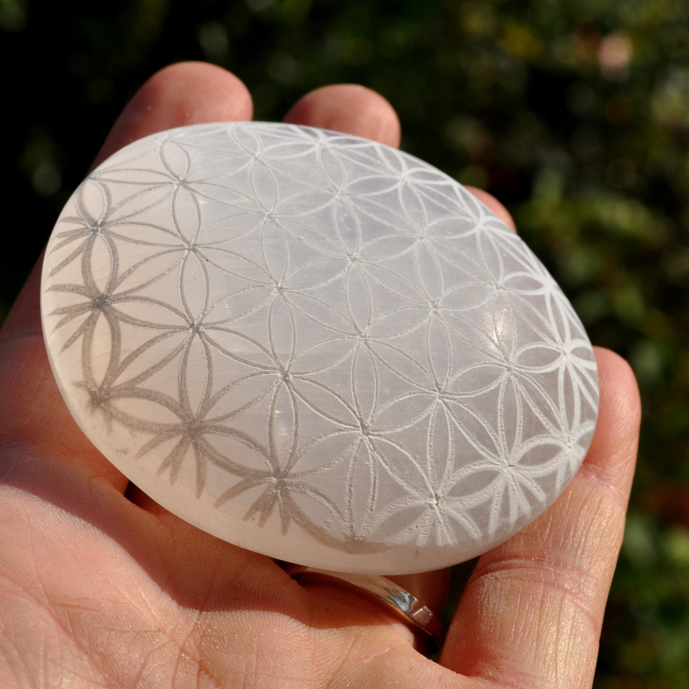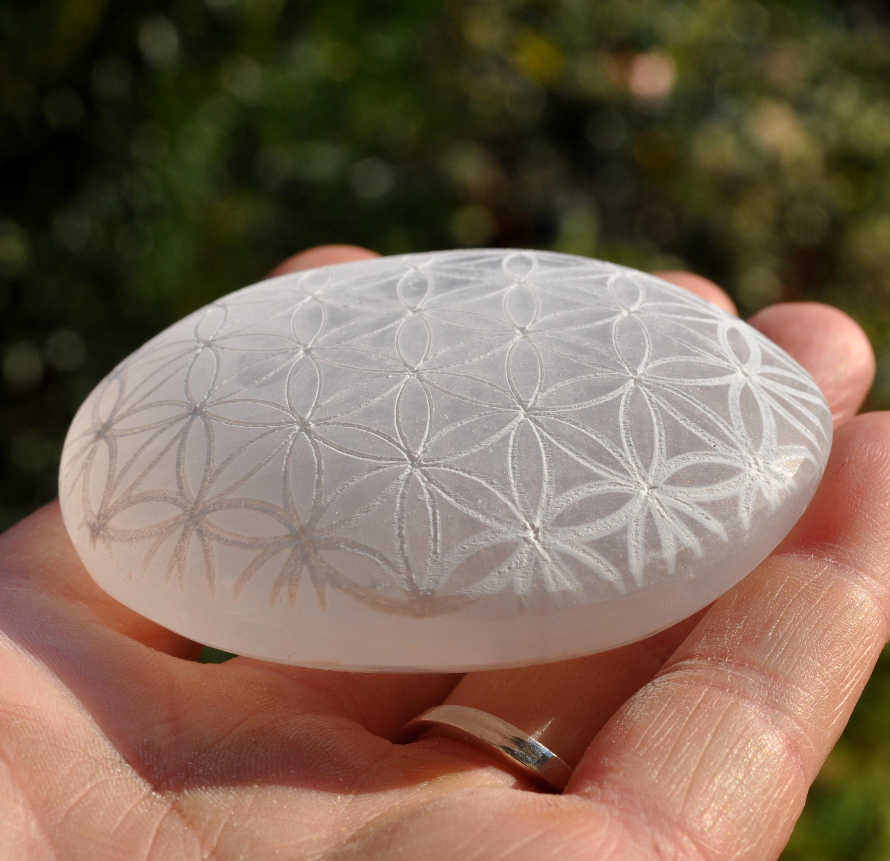 This beautiful Selenite palm stone features a carefully carved Flower of Life on one side. You will receive one crystal similar to the photos, each uniquely polished and handcrafted.