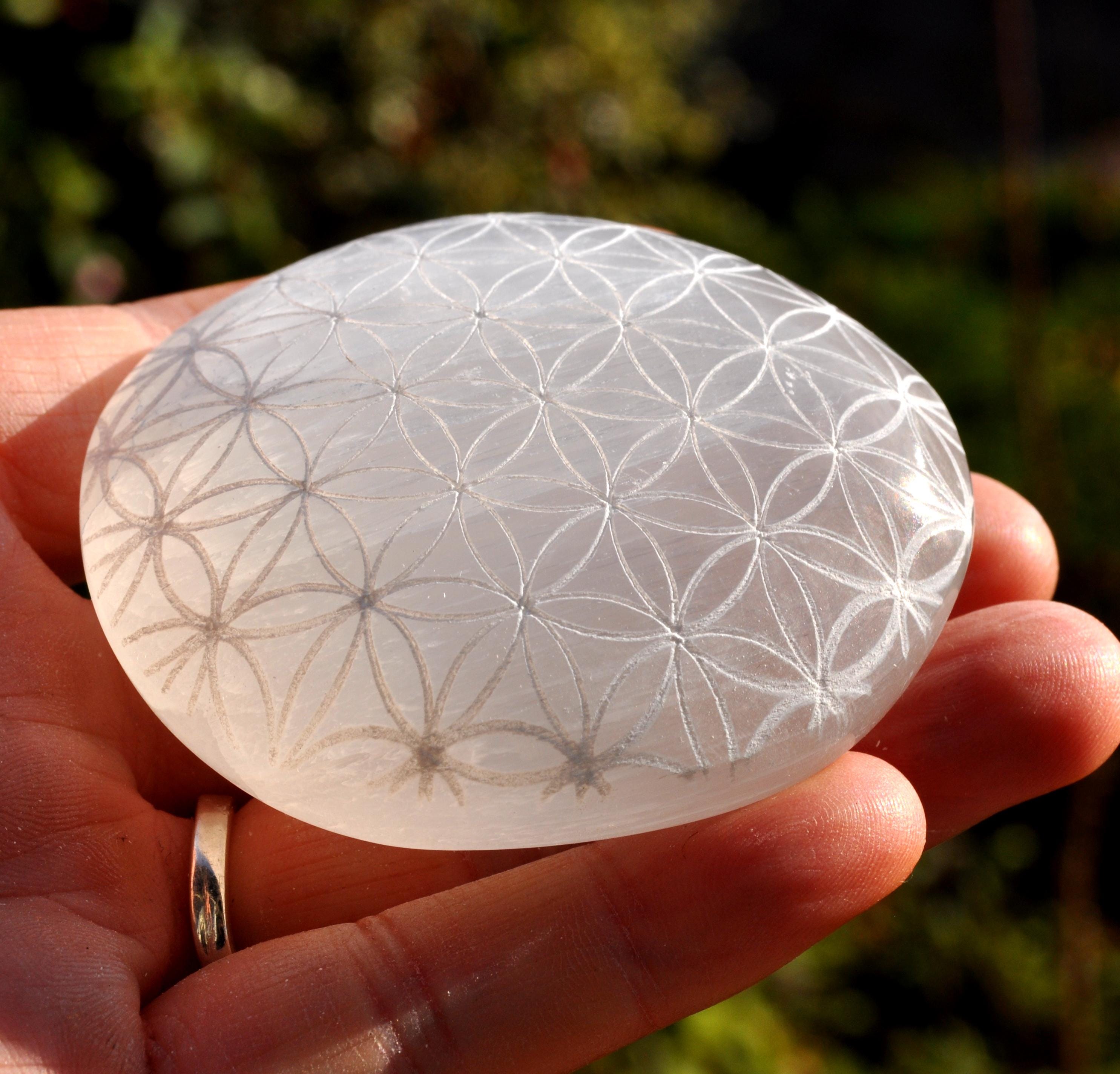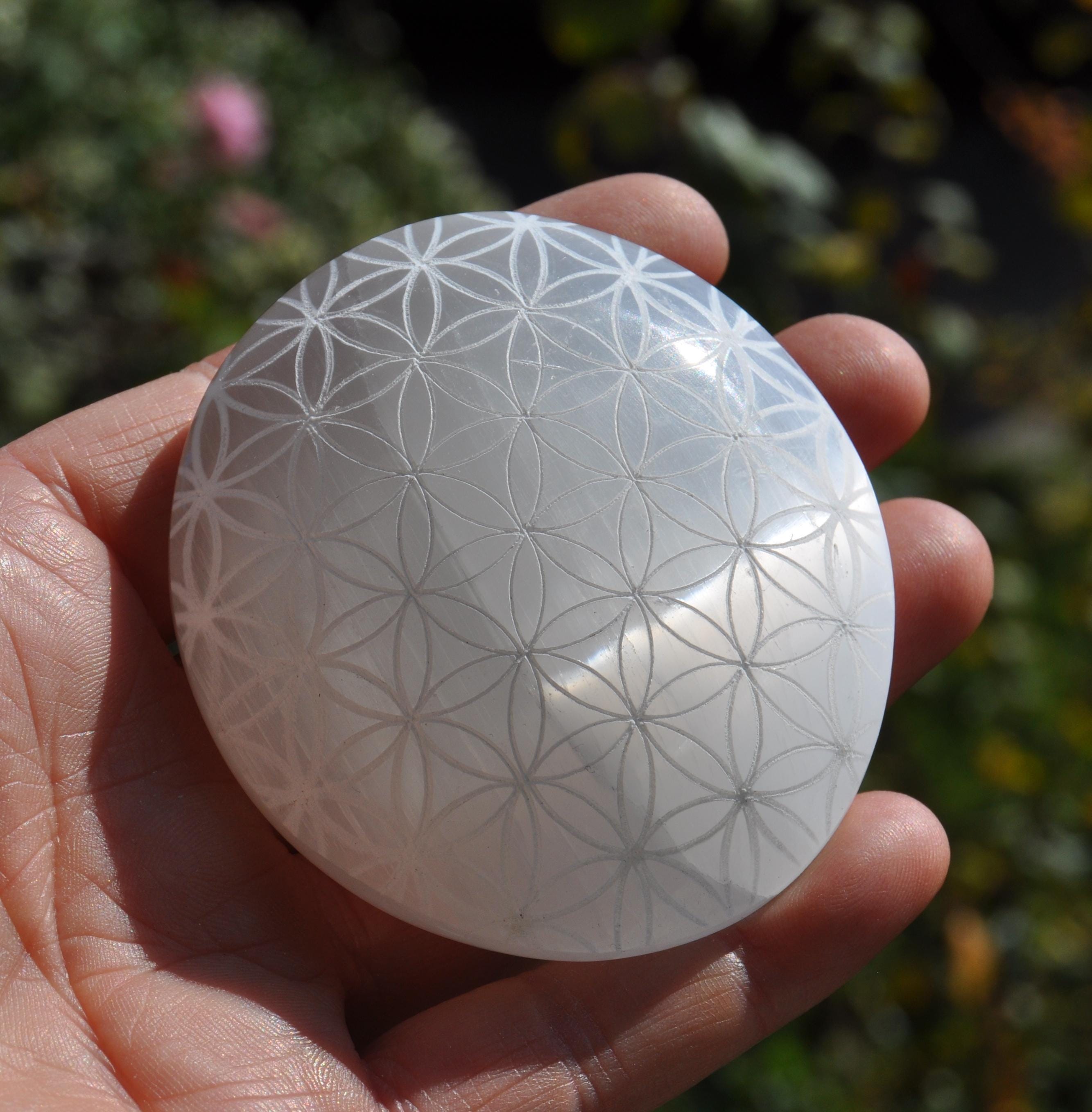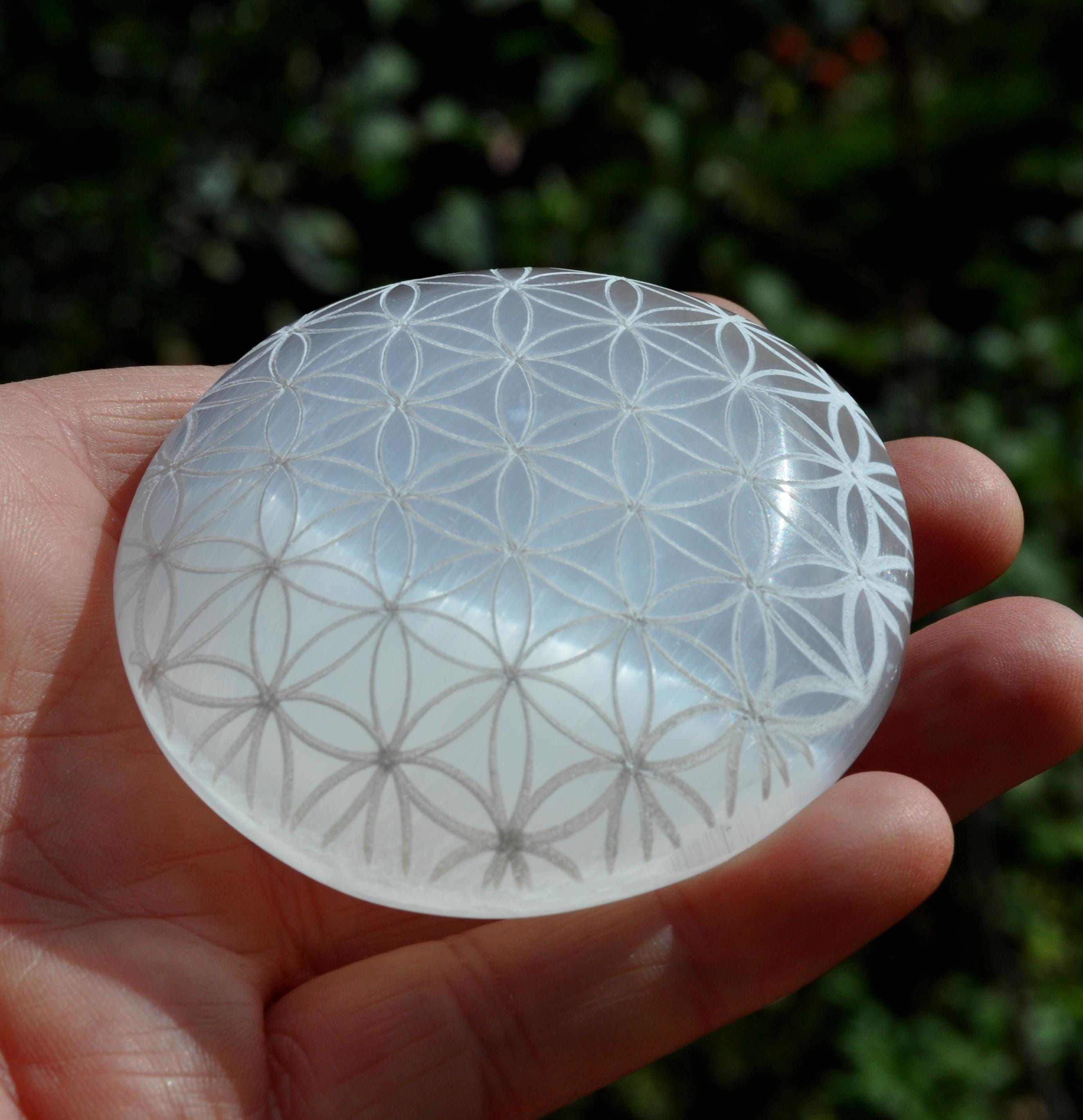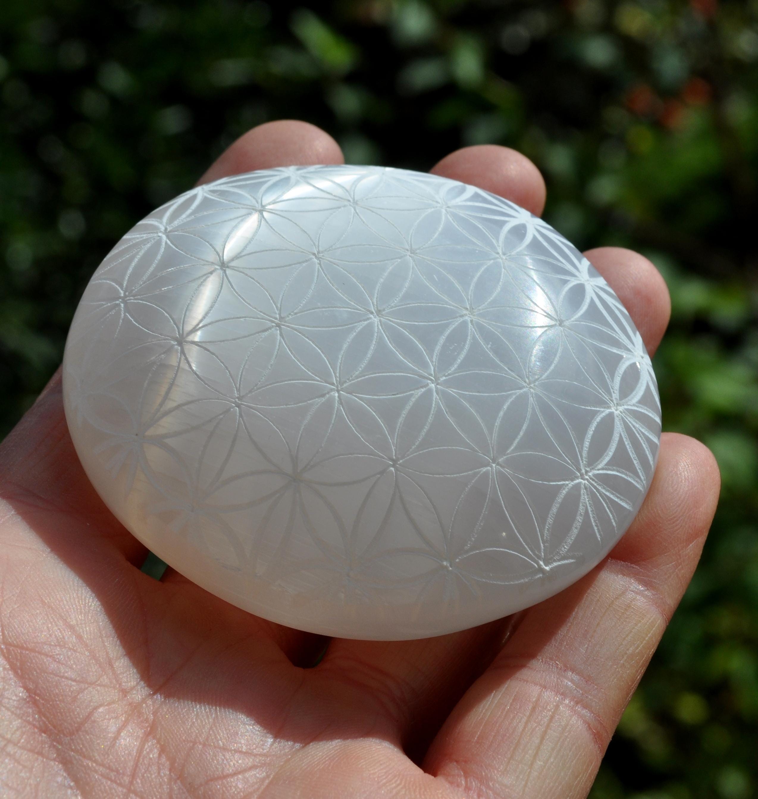 This beautiful Selenite palm stone features a carefully carved Flower of Life on one side. You will receive one crystal similar to the photos, each uniquely polished and handcrafted.