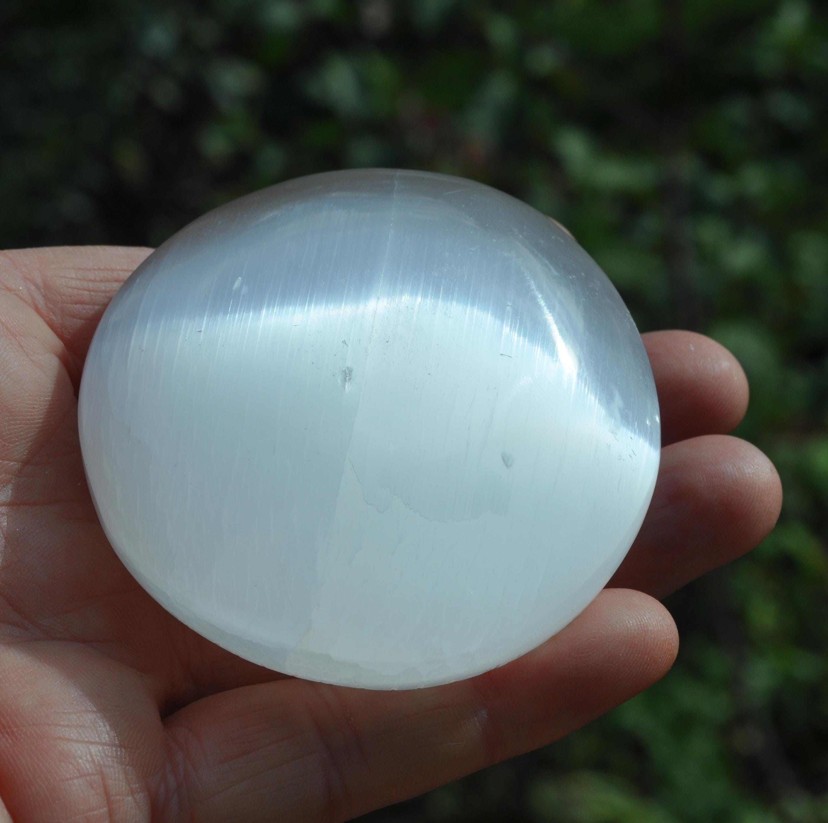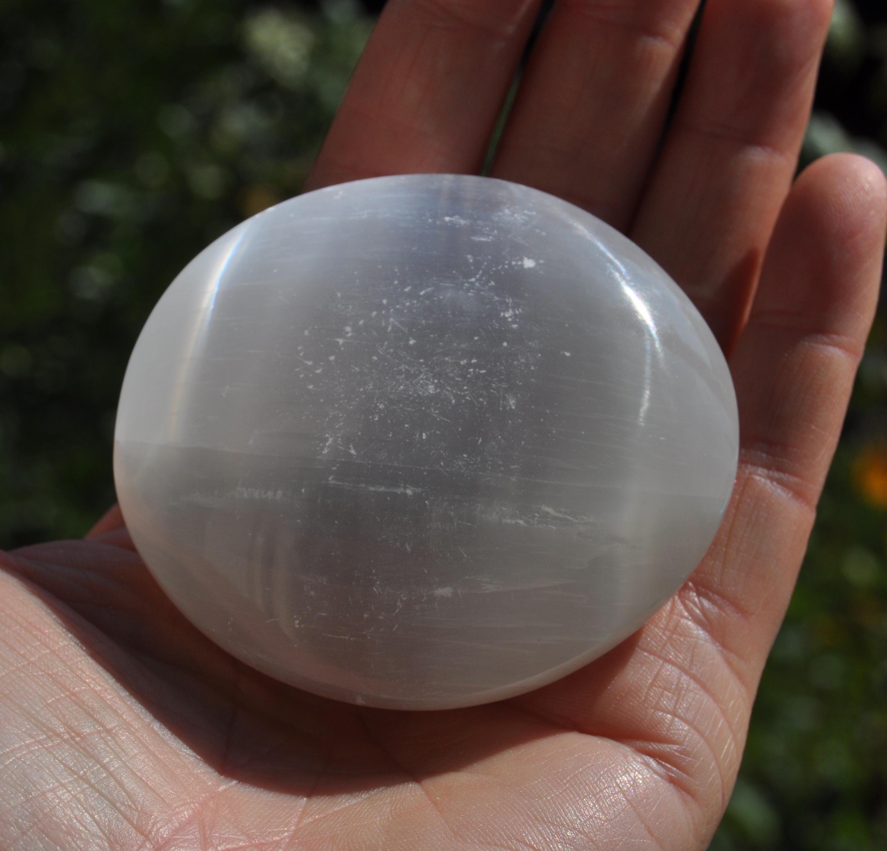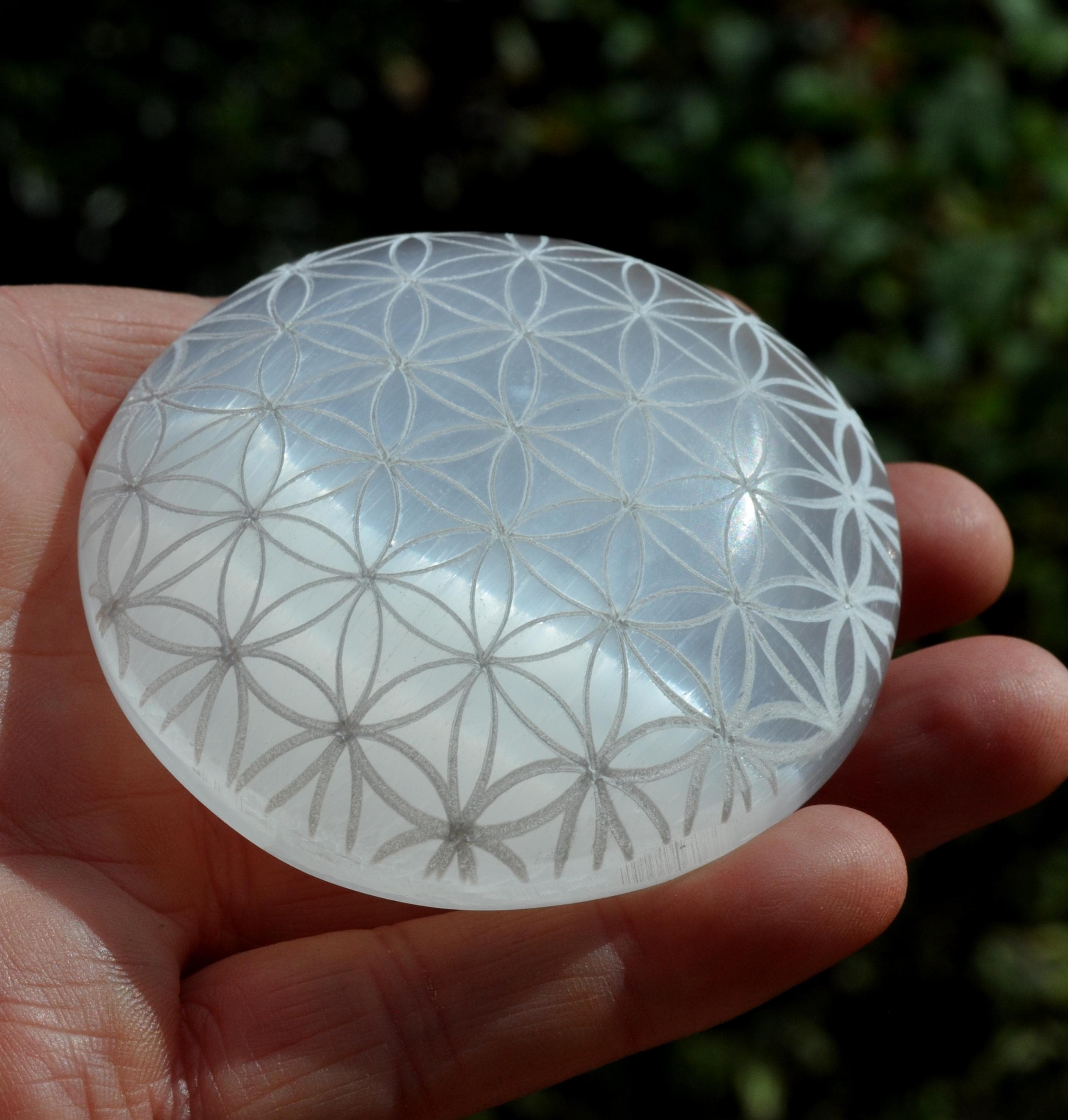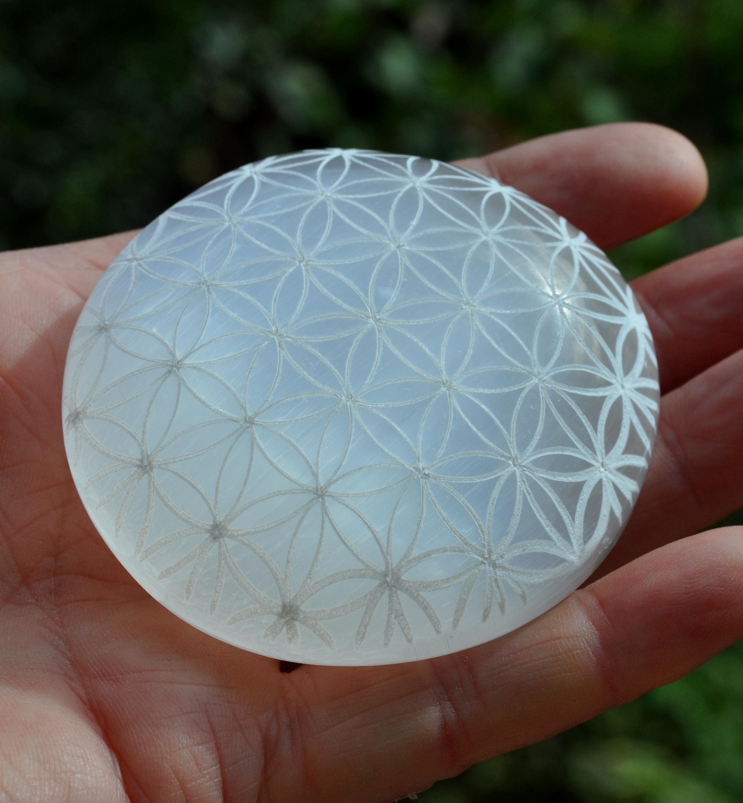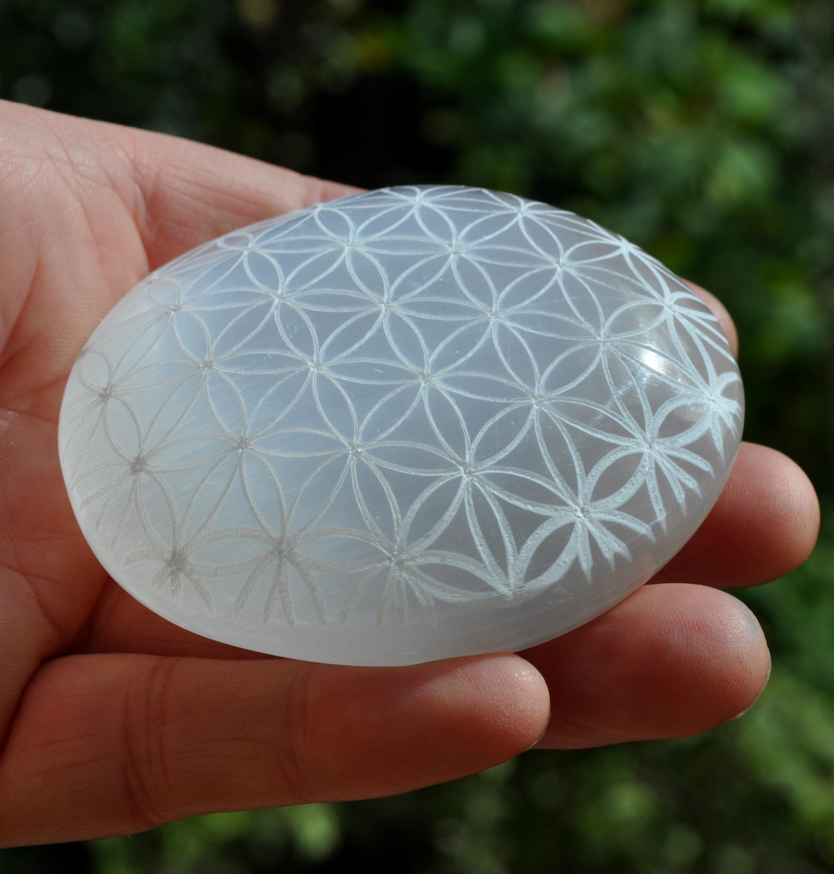 This beautiful Selenite palm stone features a carefully carved Flower of Life on one side. You will receive one crystal similar to the photos, each uniquely polished and handcrafted.