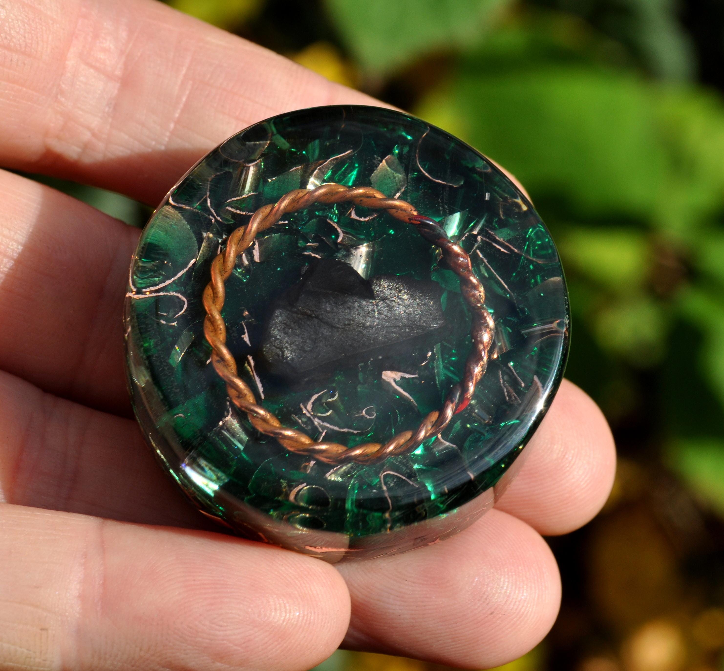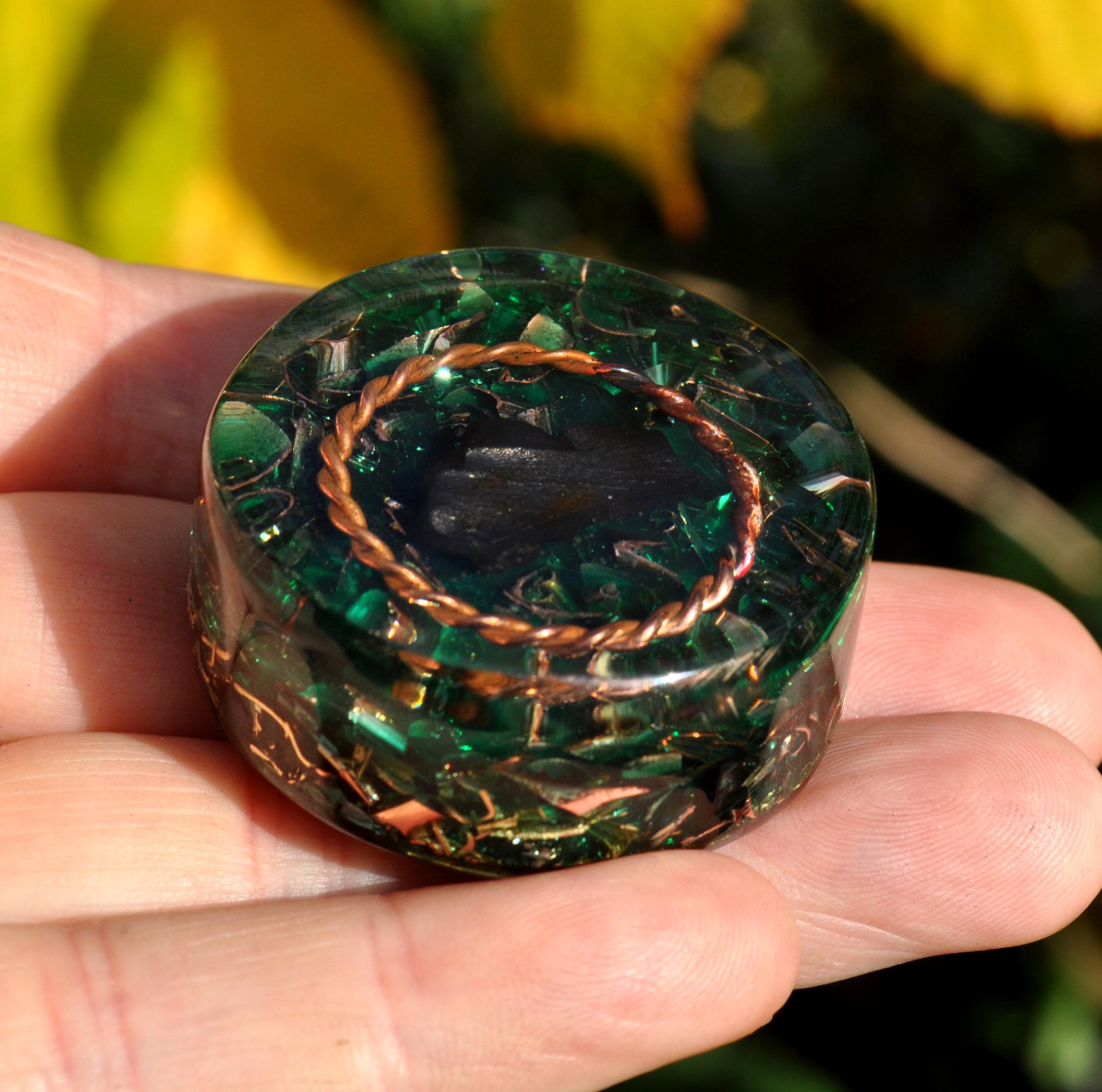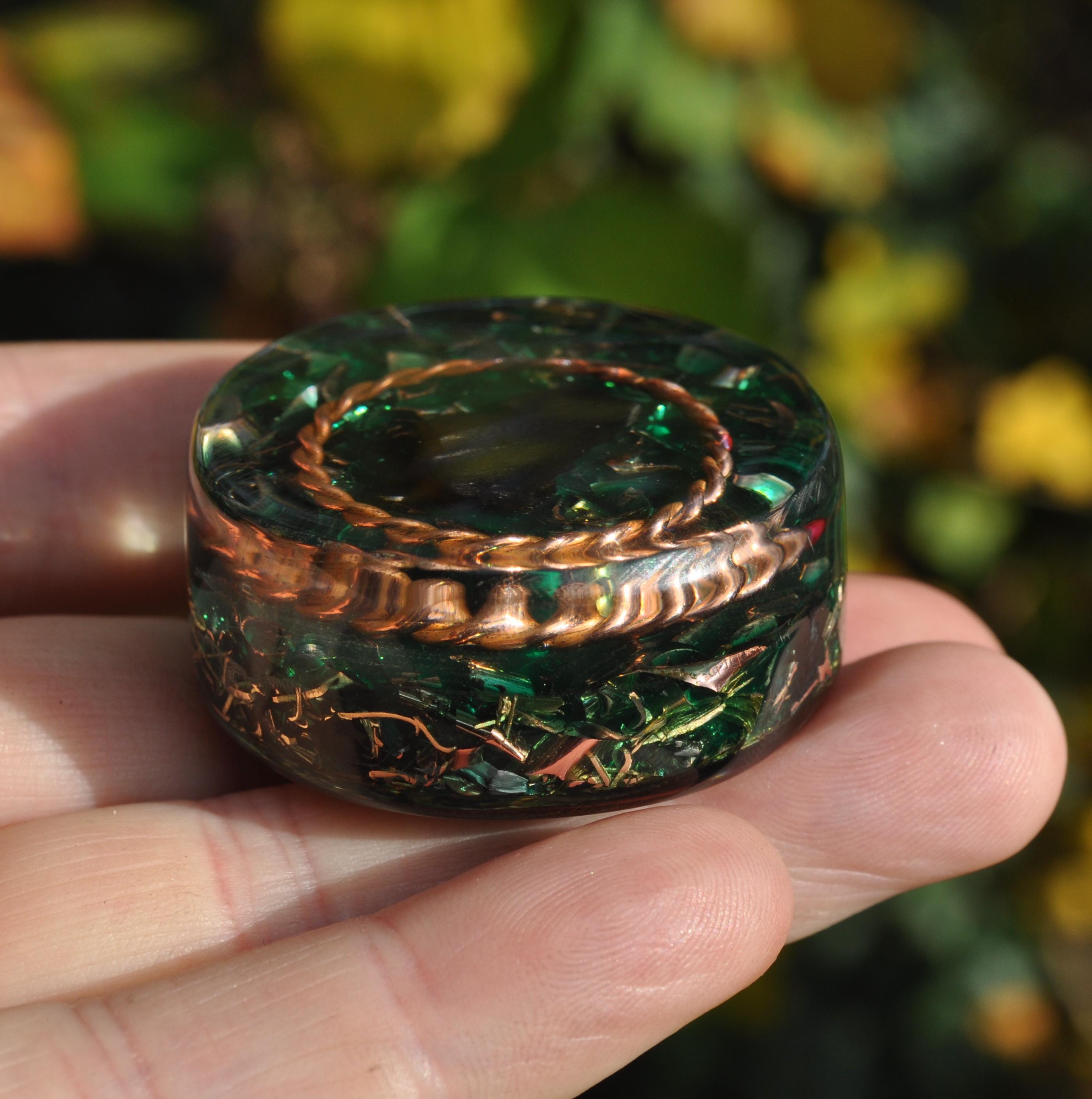 This piece features a handmade copper tensor ring, sculpted and incorporated into the design to amplify and harmonize the energetic qualities of the orgonite. Tensor rings are traditionally valued for their ability to enhance coherence, promote balance, and strengthen energetic flow.