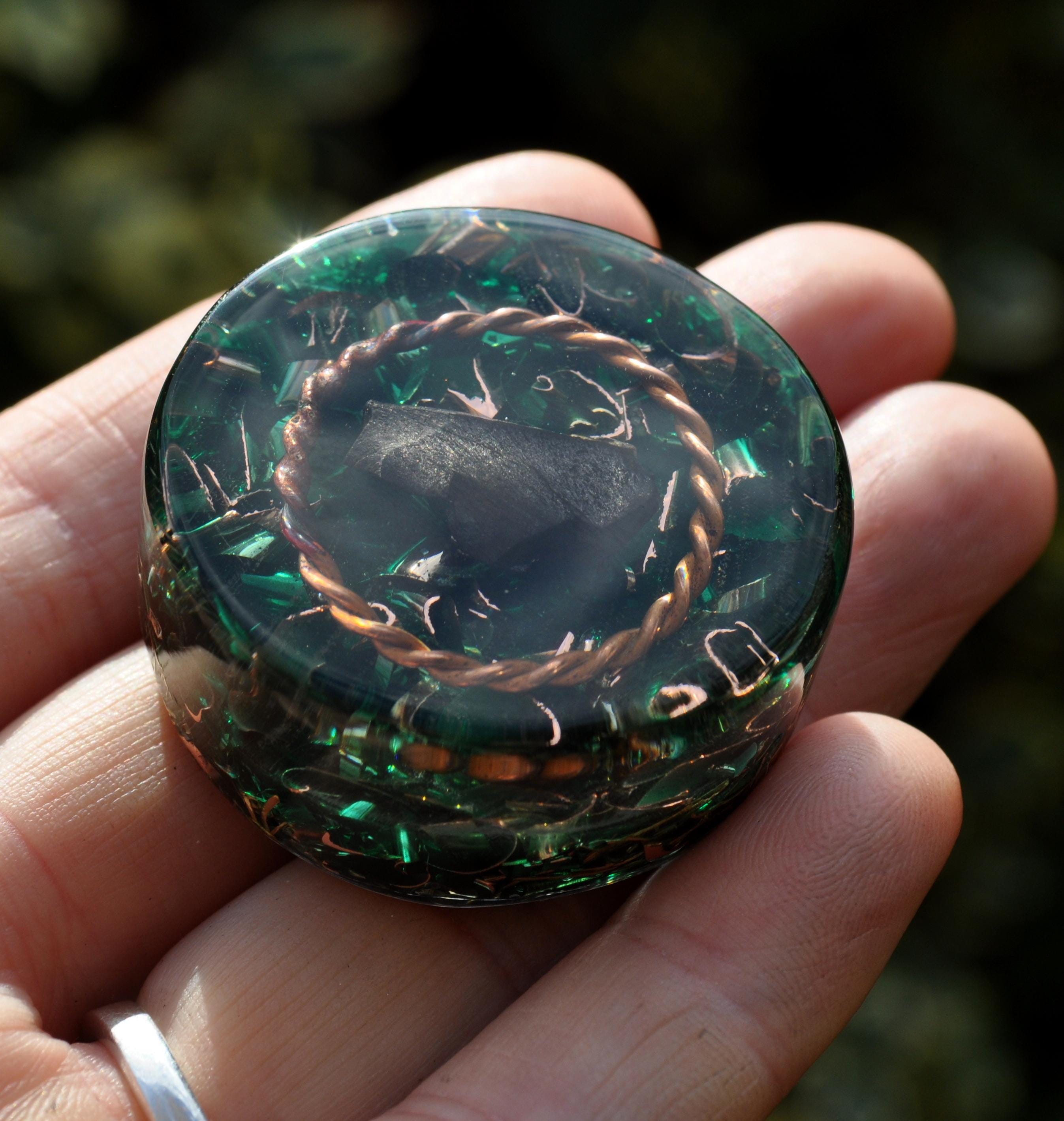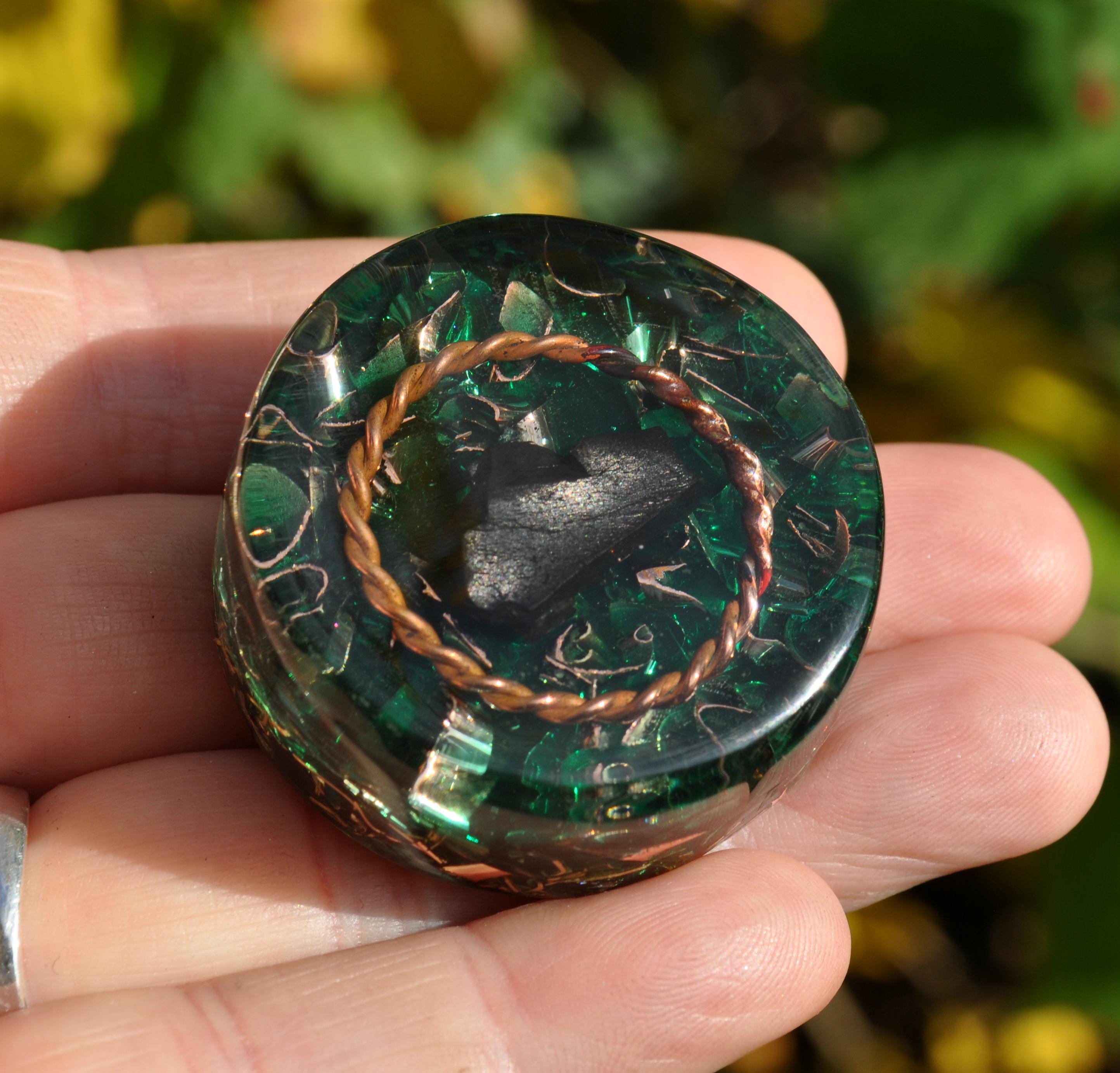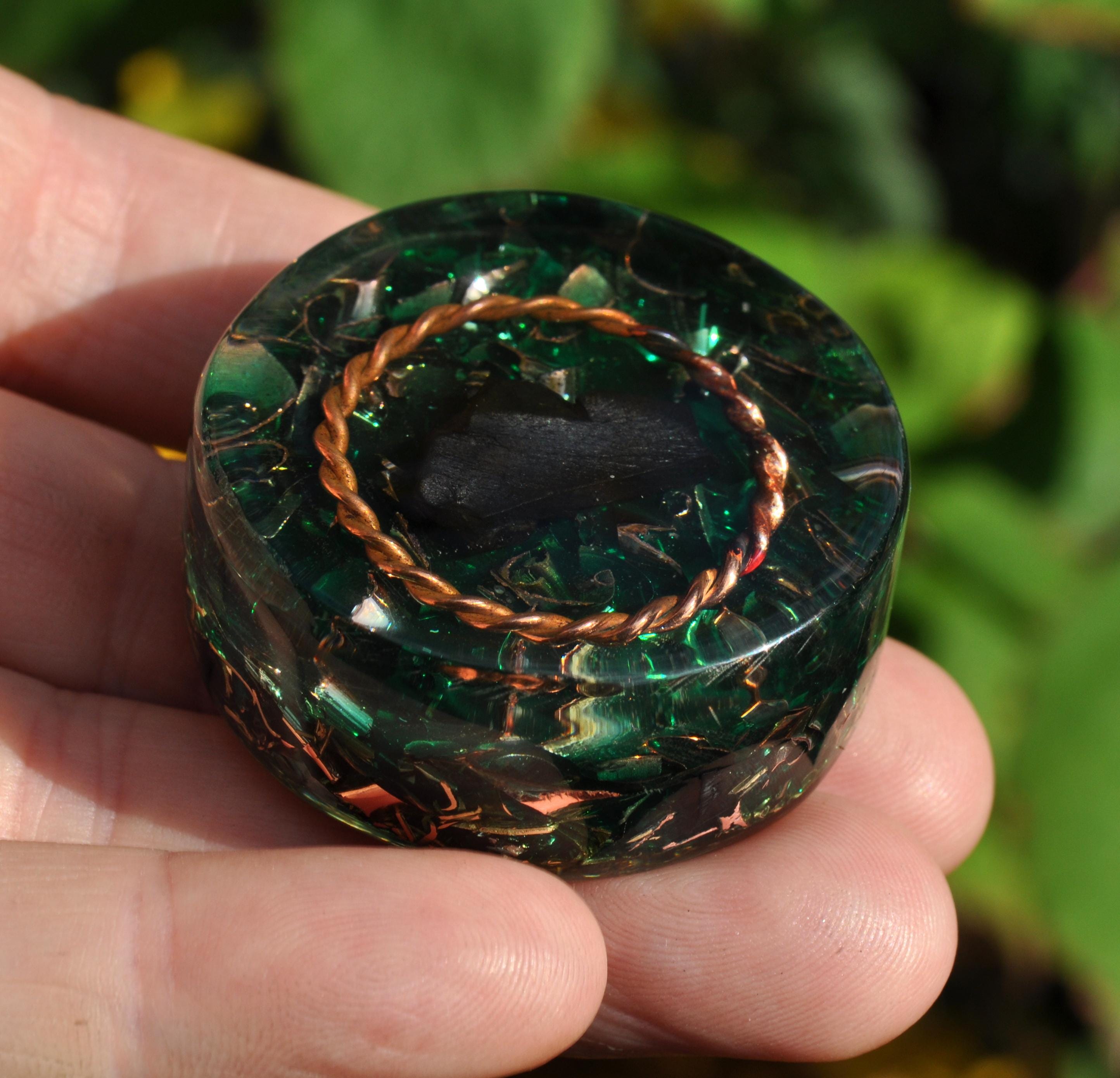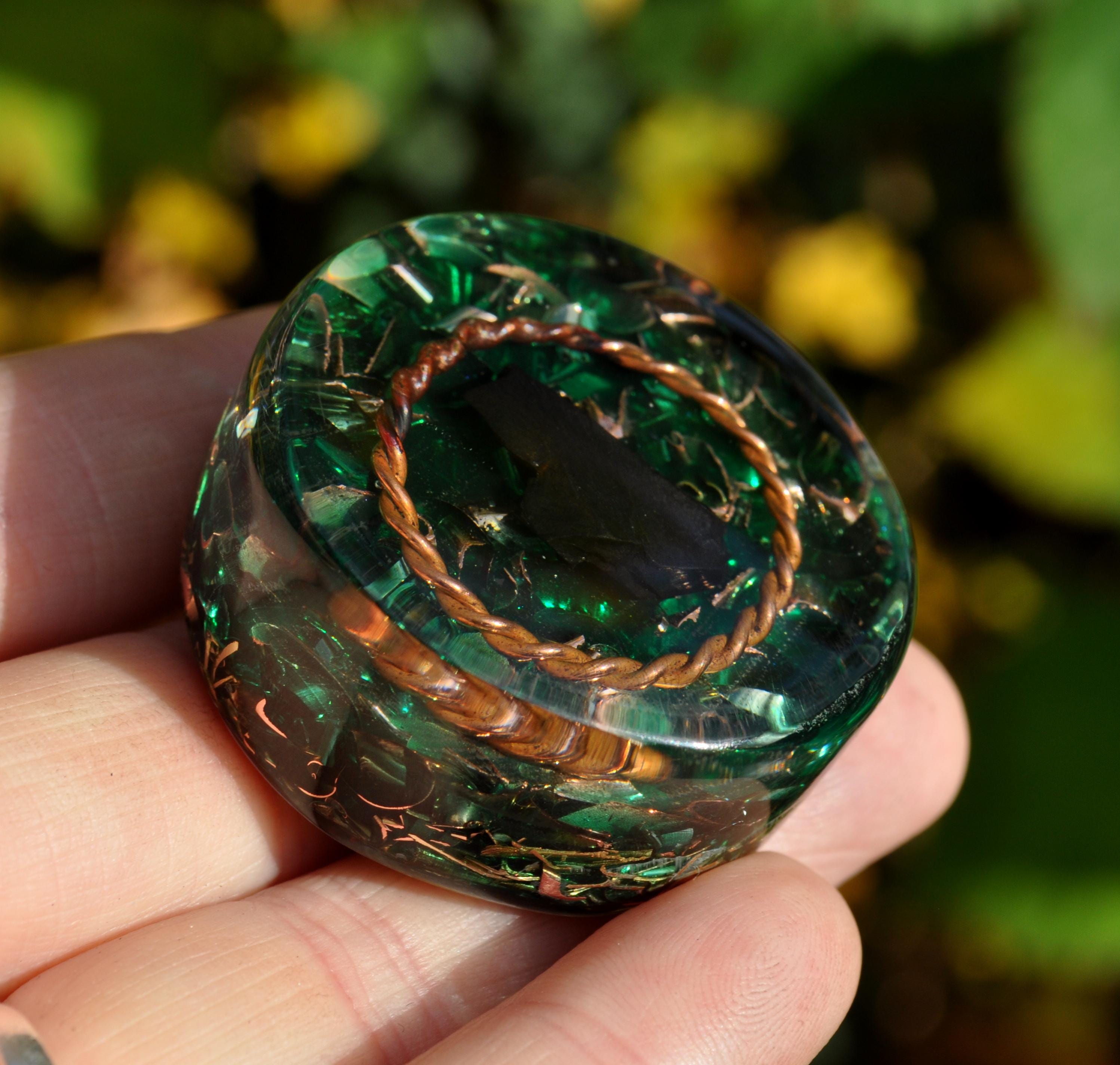 This piece features a handmade copper tensor ring, sculpted and incorporated into the design to amplify and harmonize the energetic qualities of the orgonite. Tensor rings are traditionally valued for their ability to enhance coherence, promote balance, and strengthen energetic flow.