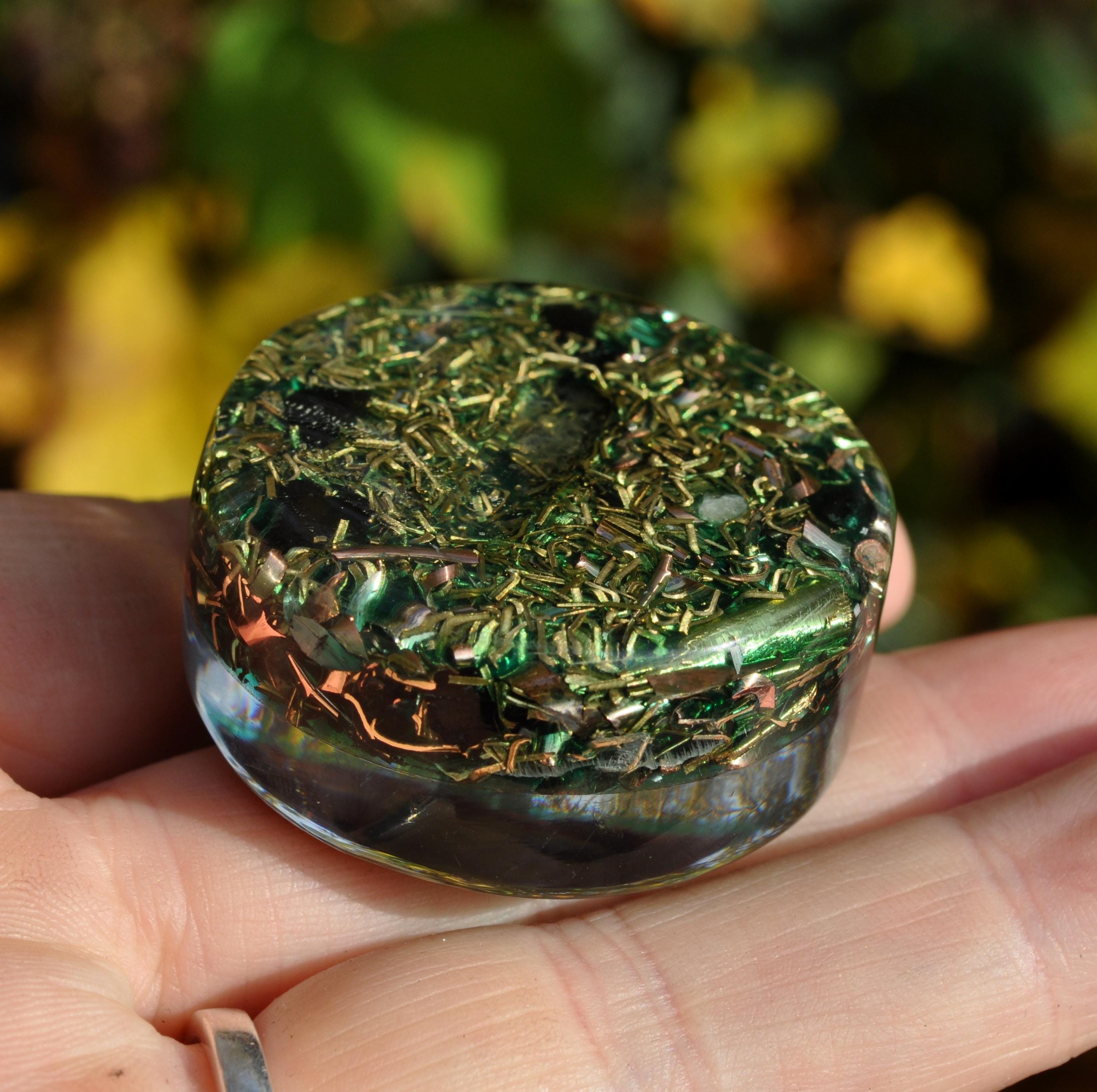 This pocket orgonite brings together intentional materials, artisan craftsmanship, and natural beauty. It makes a meaningful companion for daily use, meditation, grounding, or simply as a unique handmade art piece.
