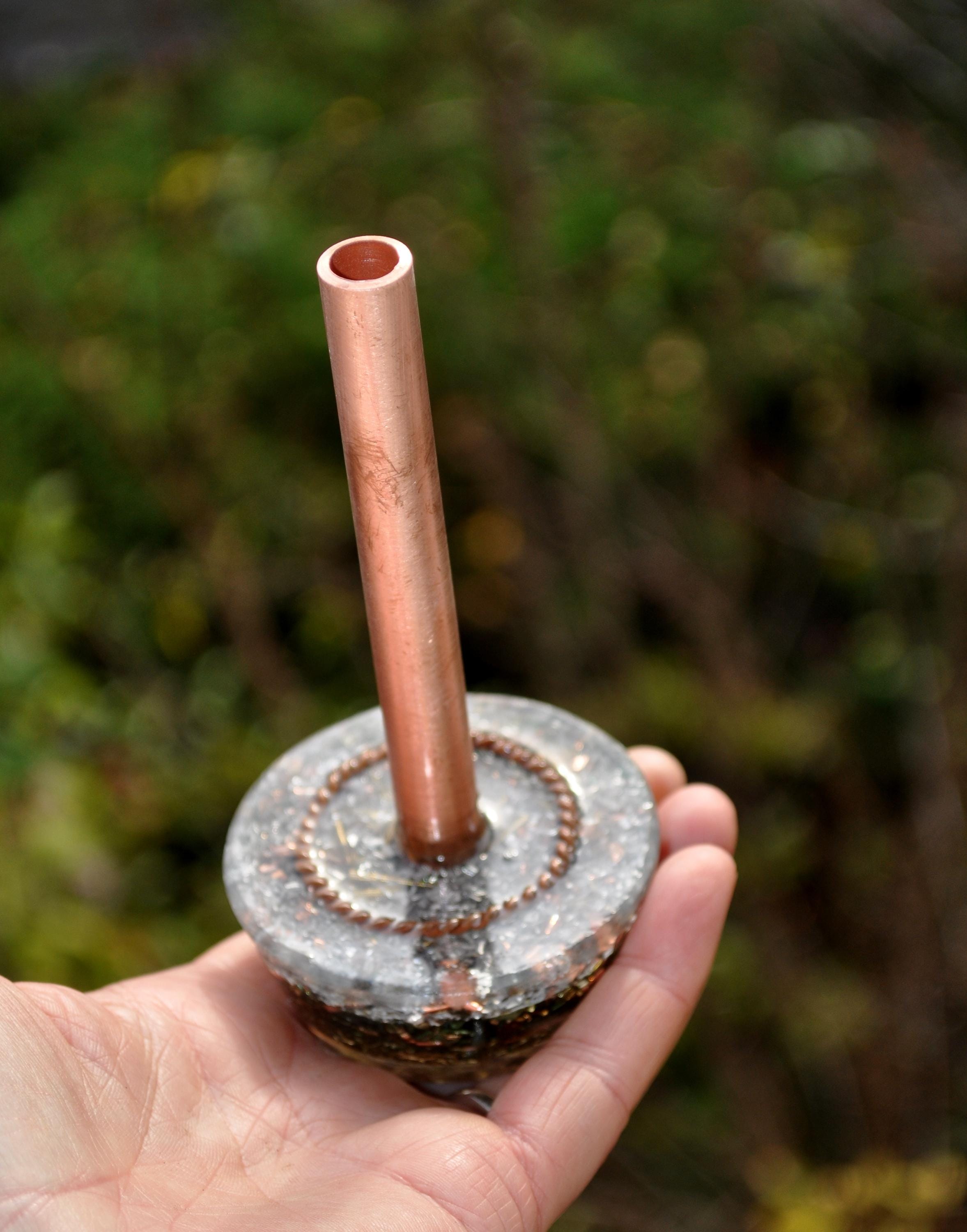 At its core is a copper pipe containing a double-terminated clear quartz crystal, symbolizing balance and energy flow. Around the pipe rests a handmade copper tensor ring, known for amplifying and organizing subtle energies.