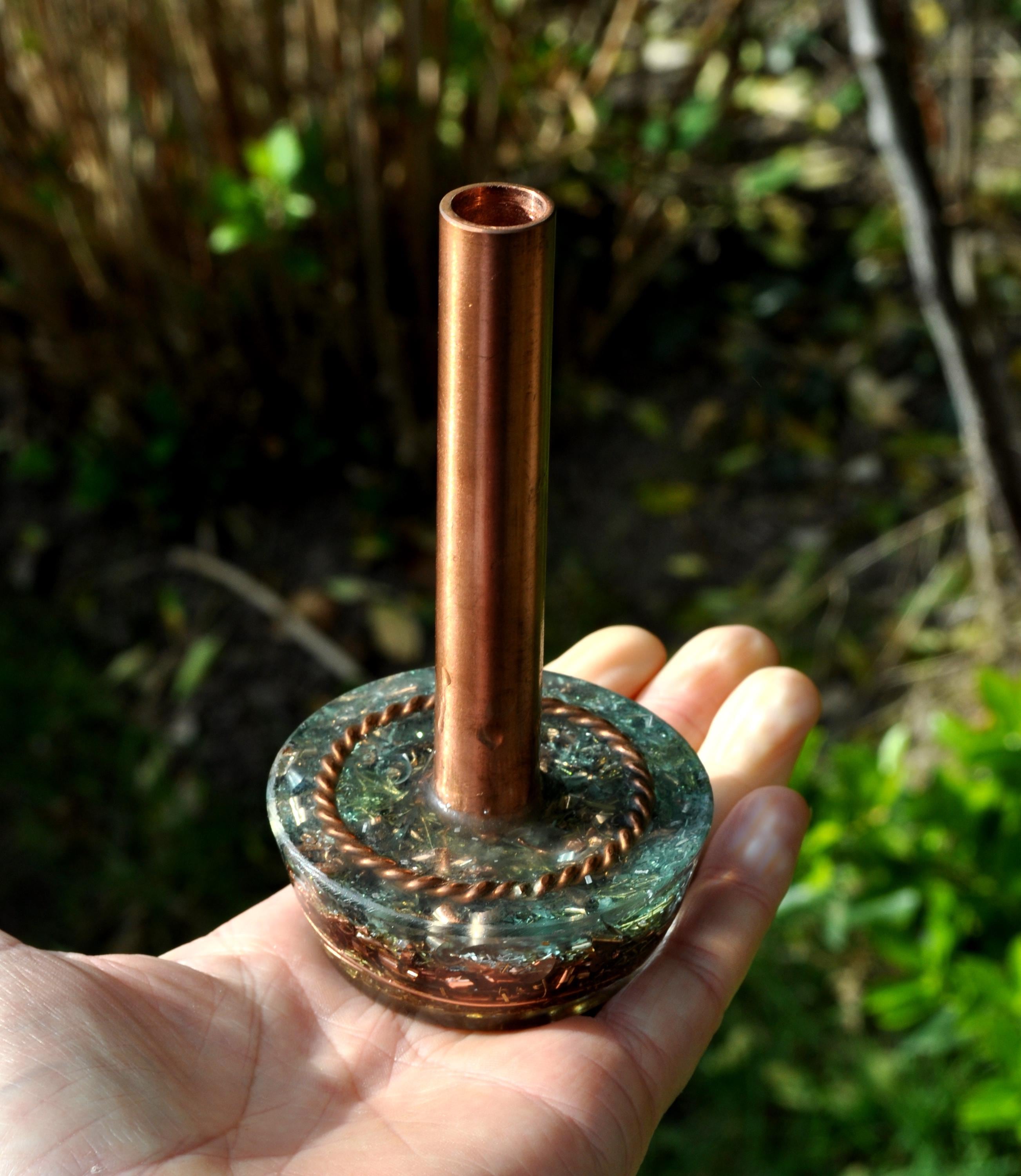 At its core is a copper pipe containing a double-terminated clear quartz crystal, symbolizing balance and energy flow. Around the pipe rests a handmade copper tensor ring, known for amplifying and organizing subtle energies.