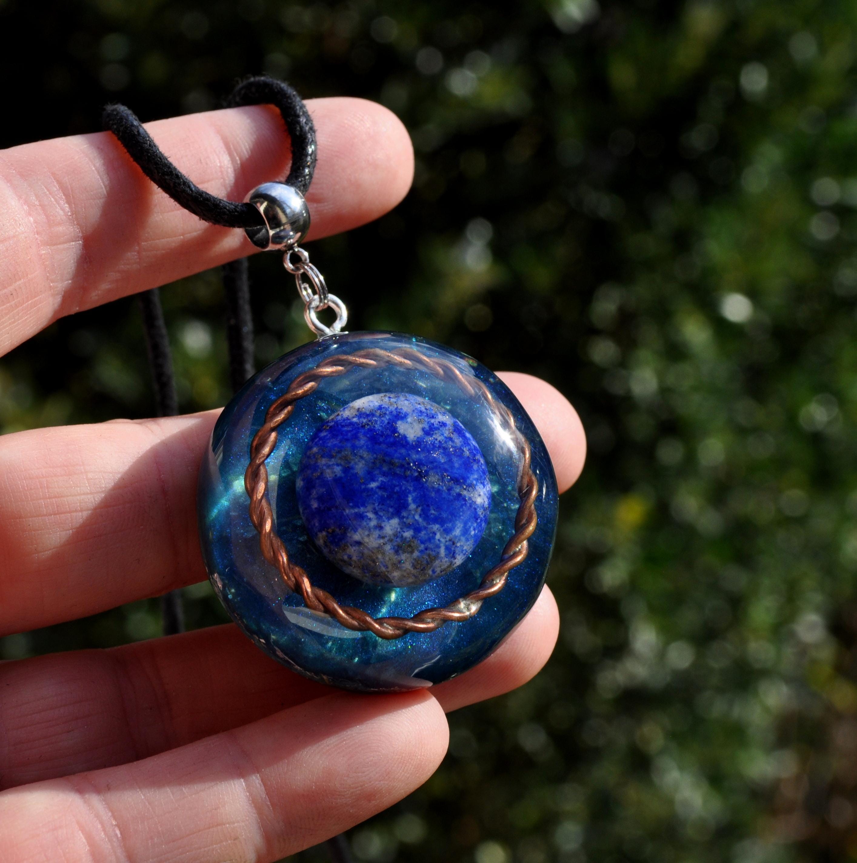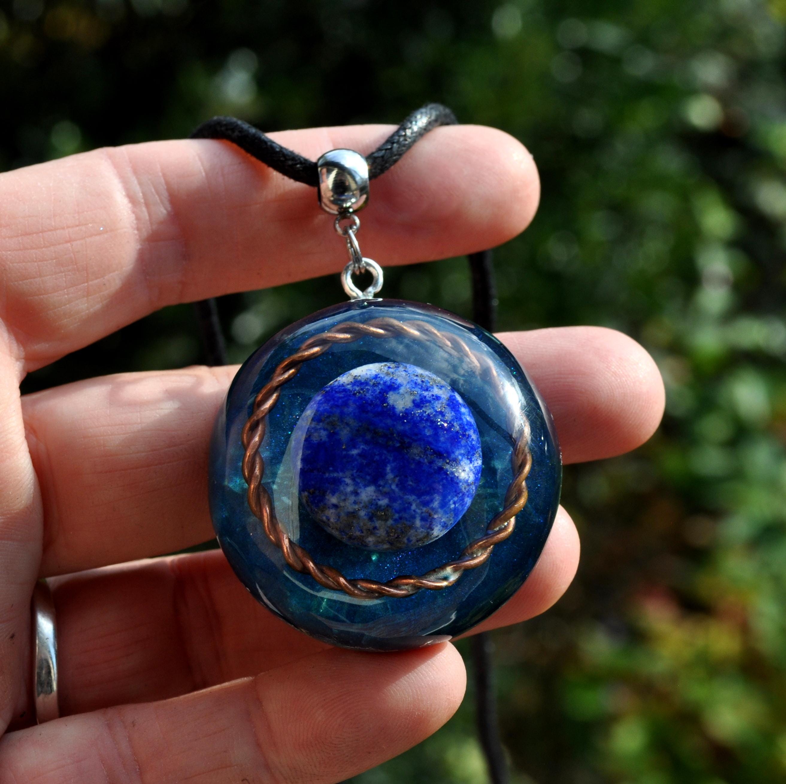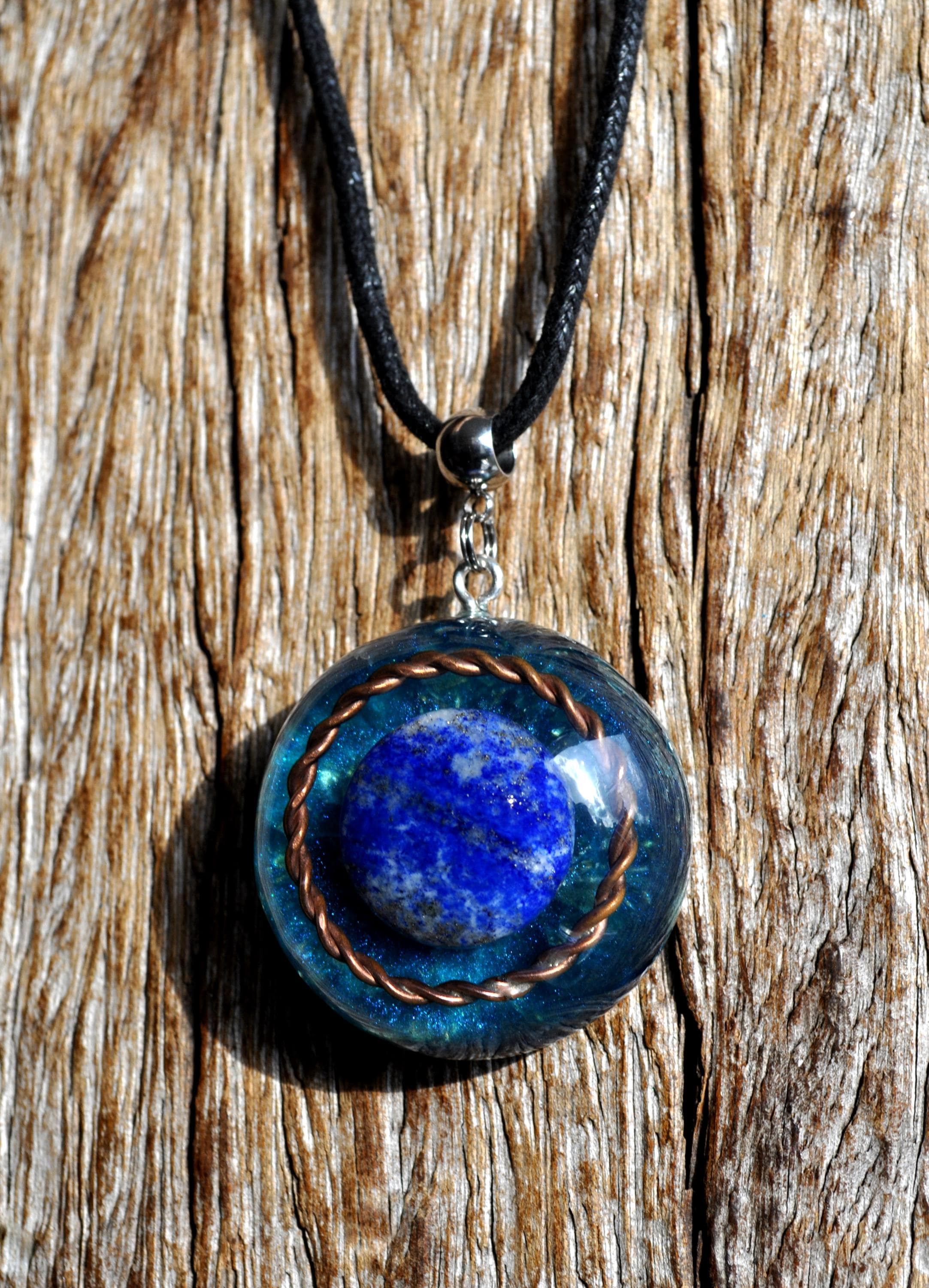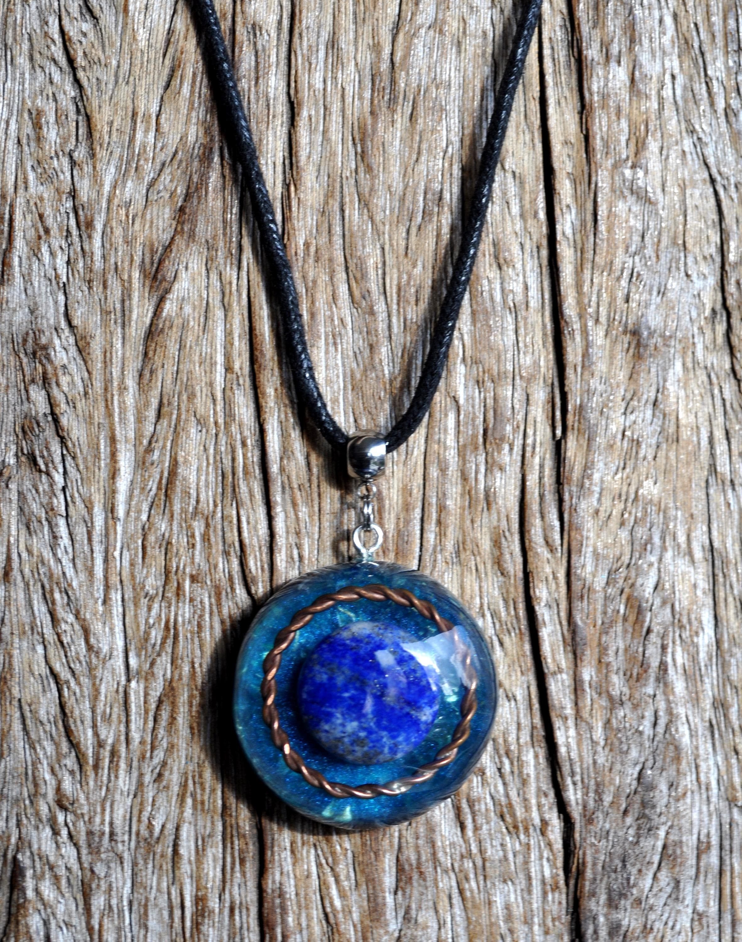 This handmade blue orgonite pendant features a vibrant Lapis Lazuli cabochon at its center, surrounded by a carefully crafted copper tensor ring. The tensor ring adds a geometric, harmonious element to the design, enhancing the layered metals and crystals in this 4.2 cm (1.65") diameter pendant.