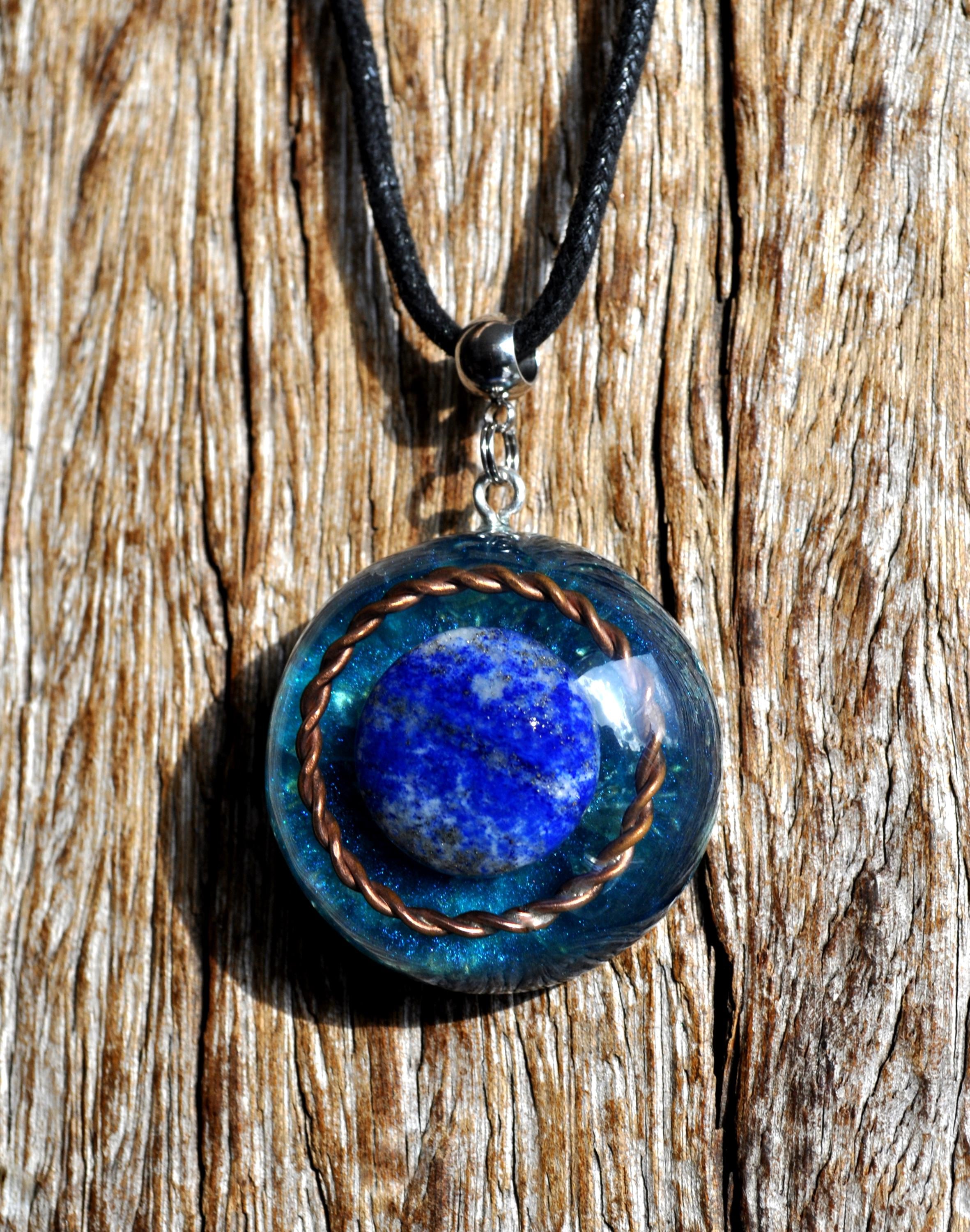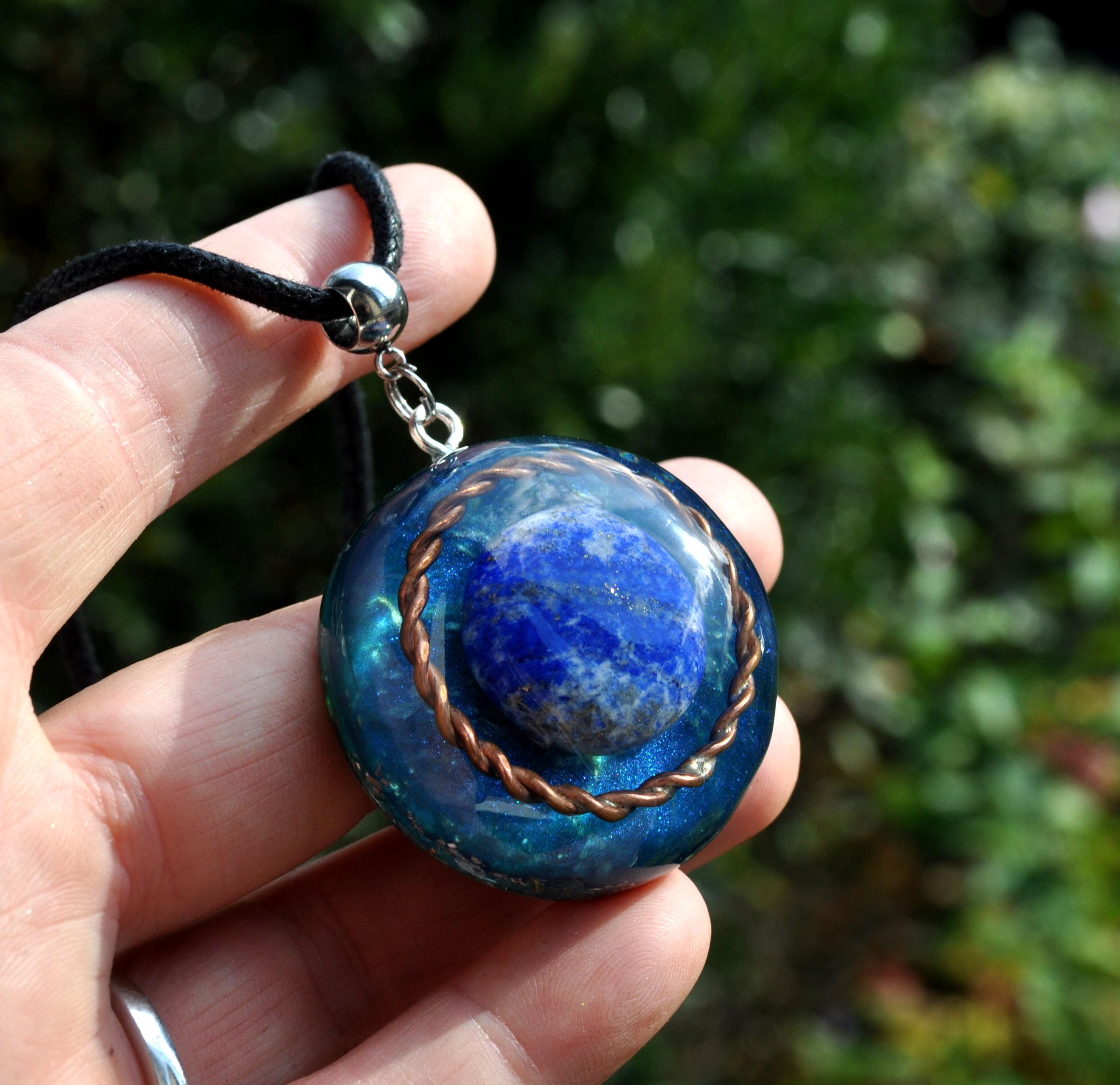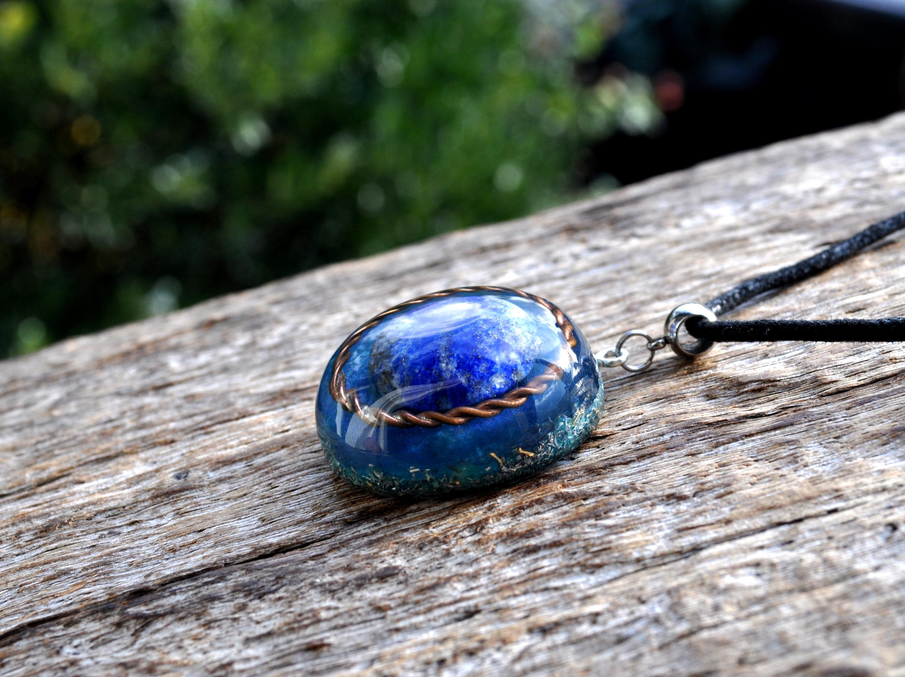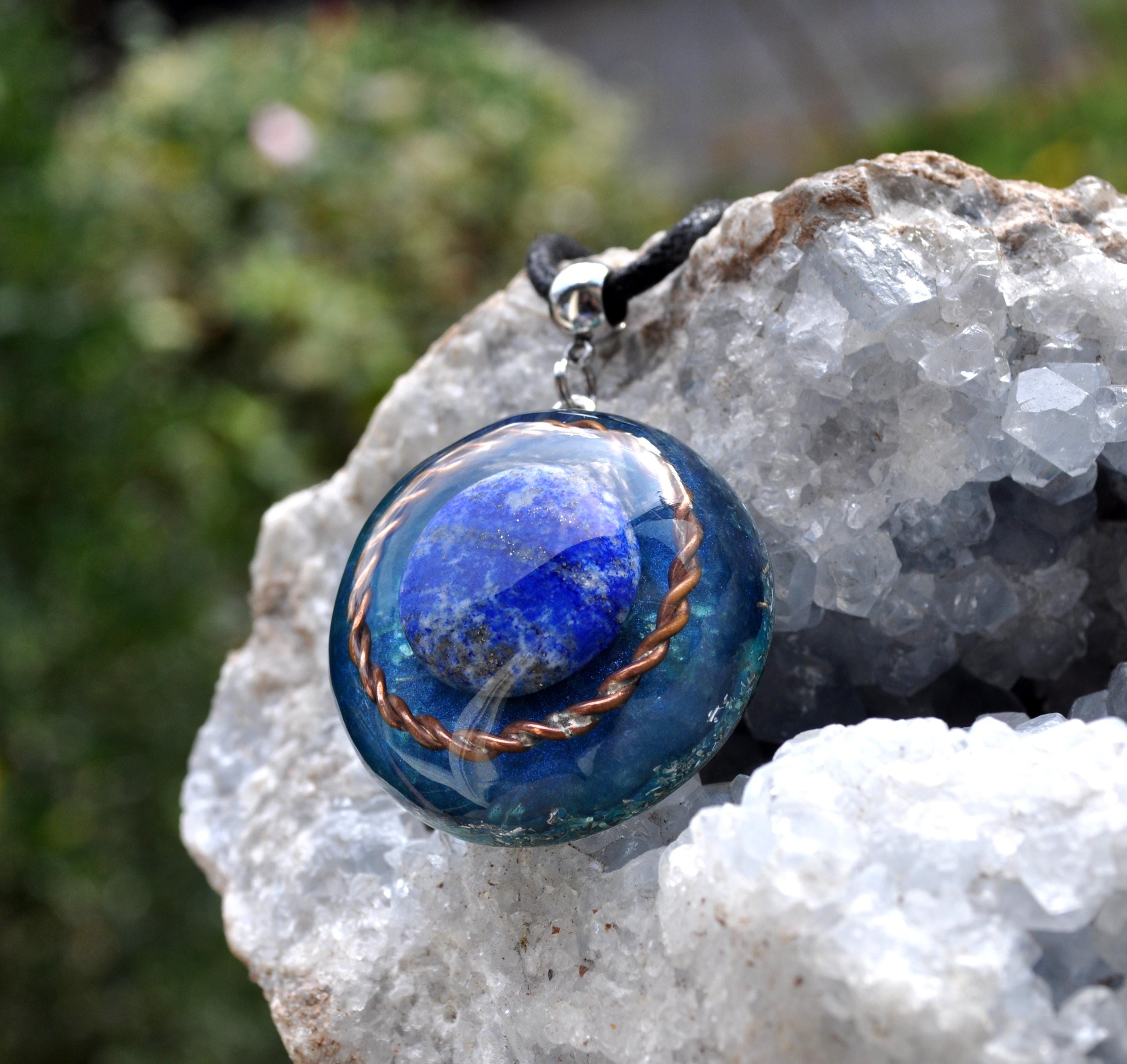 This handmade blue orgonite pendant features a vibrant Lapis Lazuli cabochon at its center, surrounded by a carefully crafted copper tensor ring. The tensor ring adds a geometric, harmonious element to the design, enhancing the layered metals and crystals in this 4.2 cm (1.65") diameter pendant.