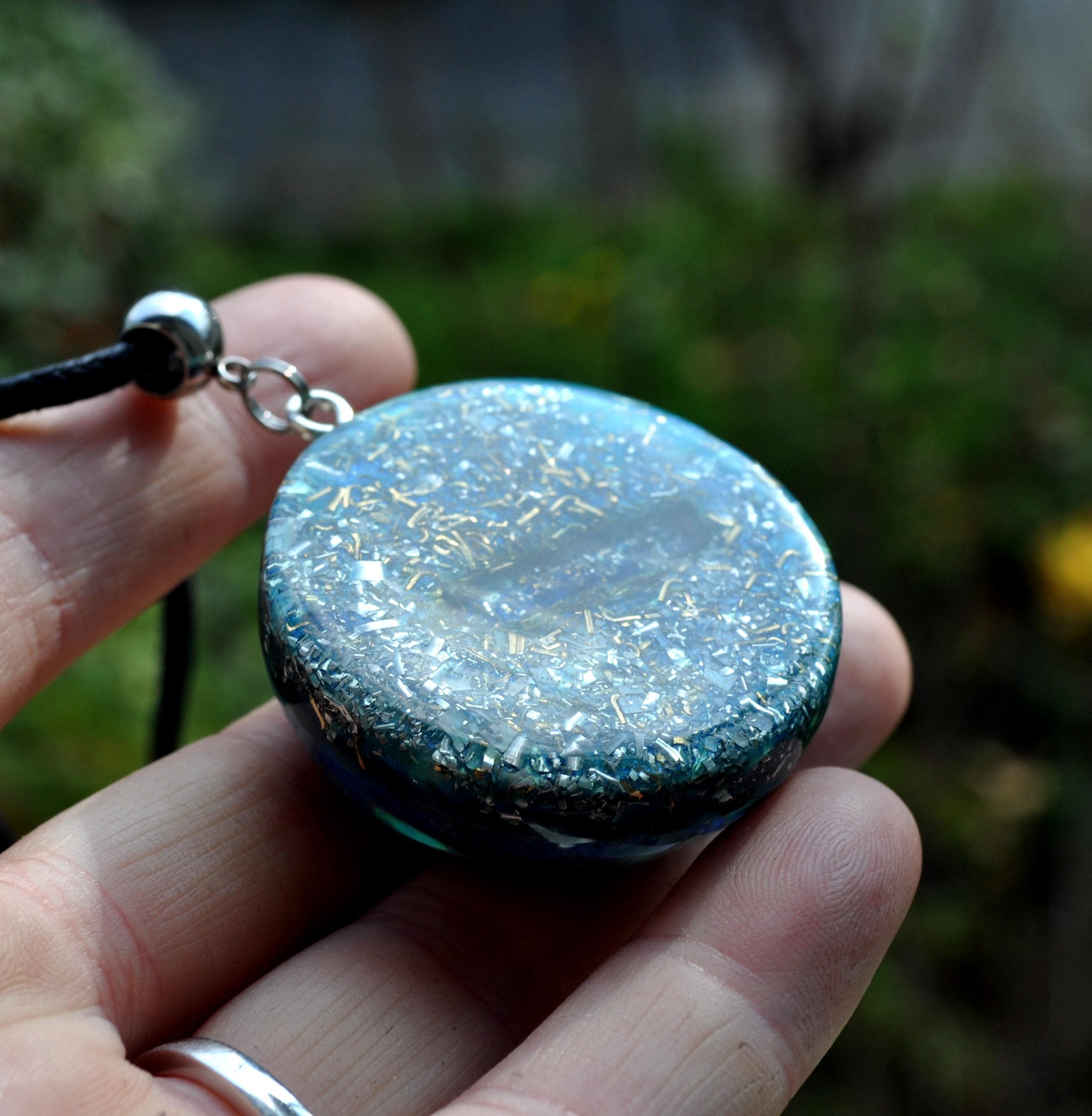 The pendant contains layers of carefully selected crystals embedded in durable resin, including Shattuckite, Rose Quartz, Black Tourmaline, Elite Shungite, Rhodizite, Pyrite, Selenite, and Clear Quartz. Each crystal is chosen to enhance the energy, balance, and visual beauty of the piece, creating a multi-dimensional and captivating accessory.