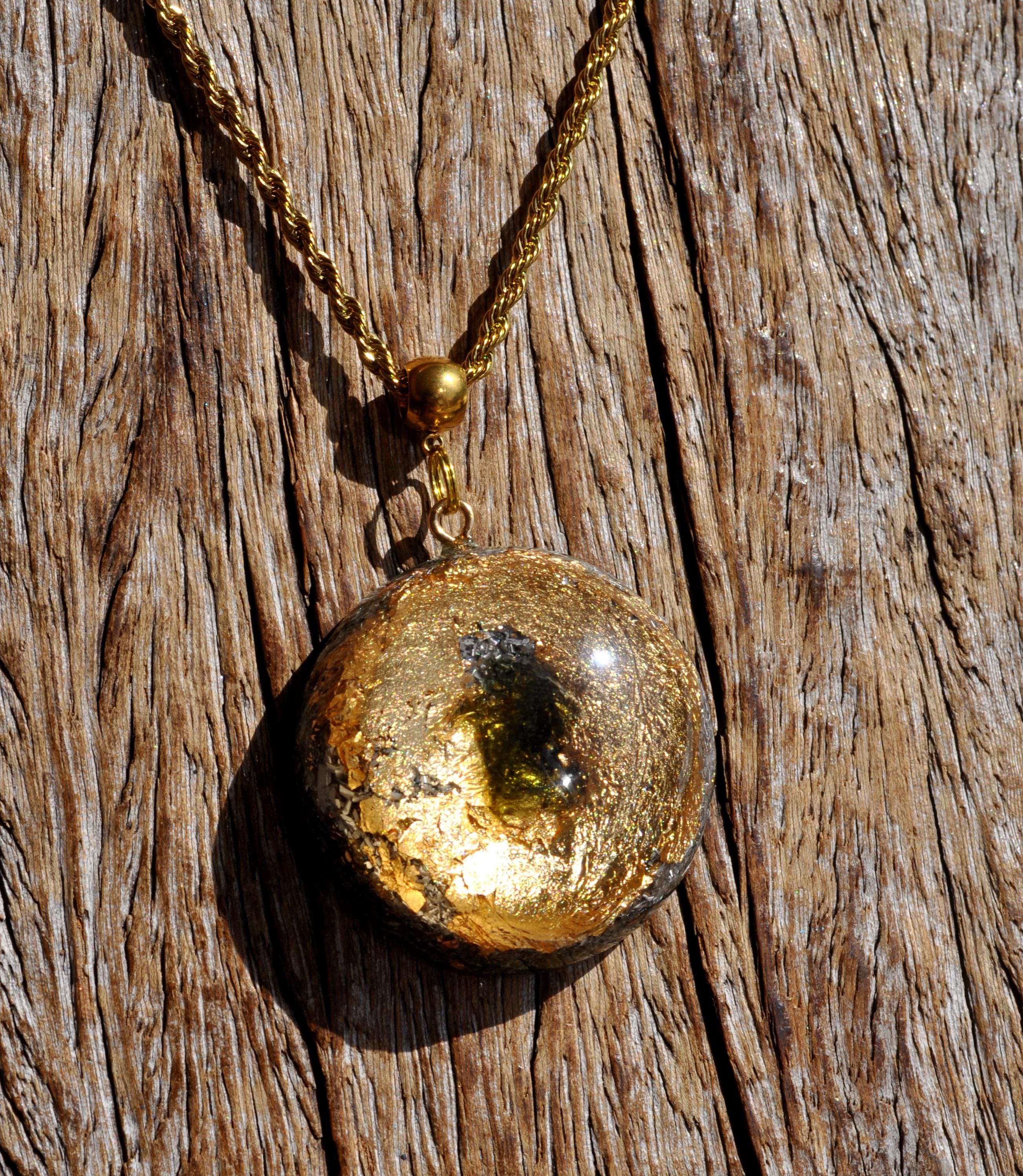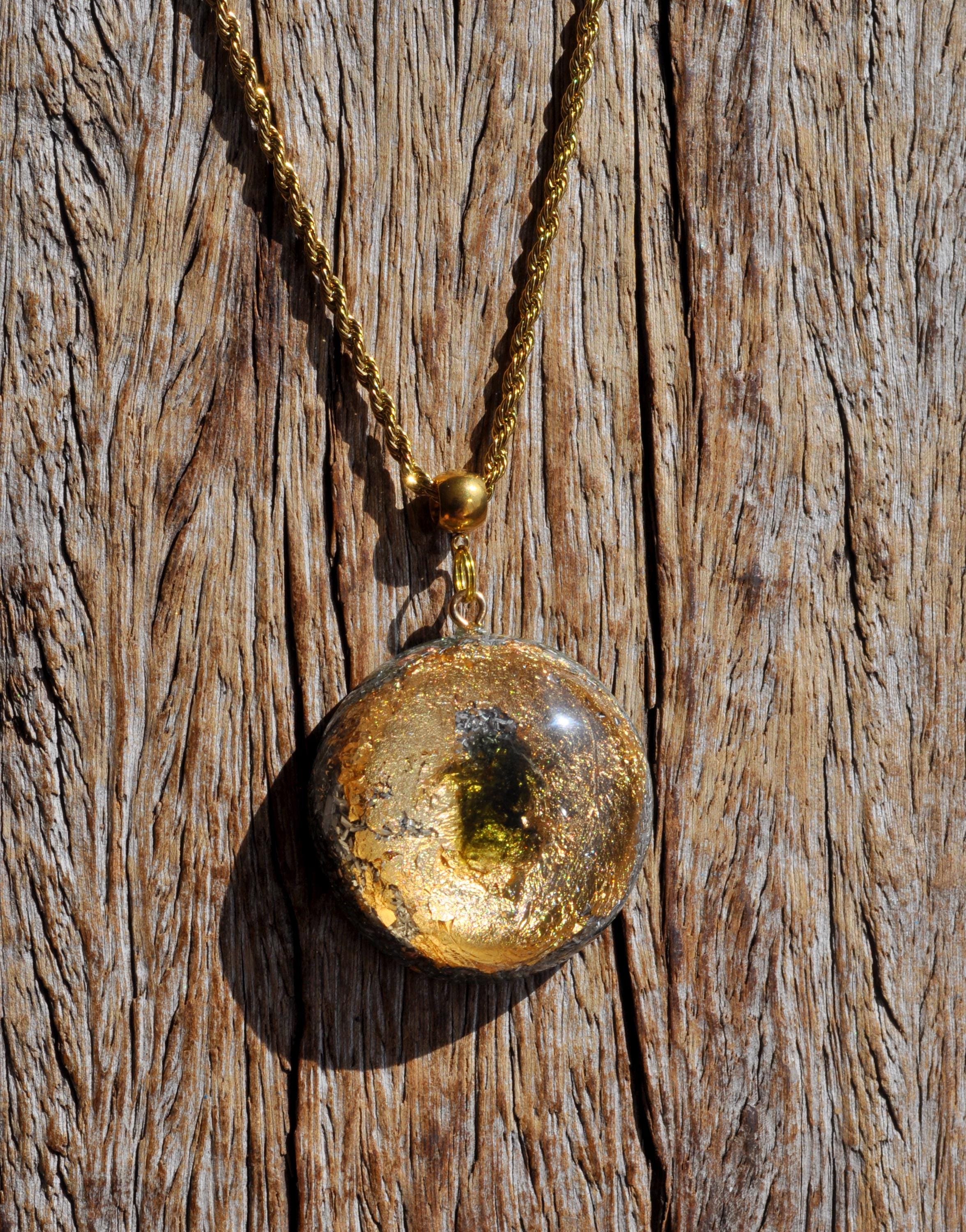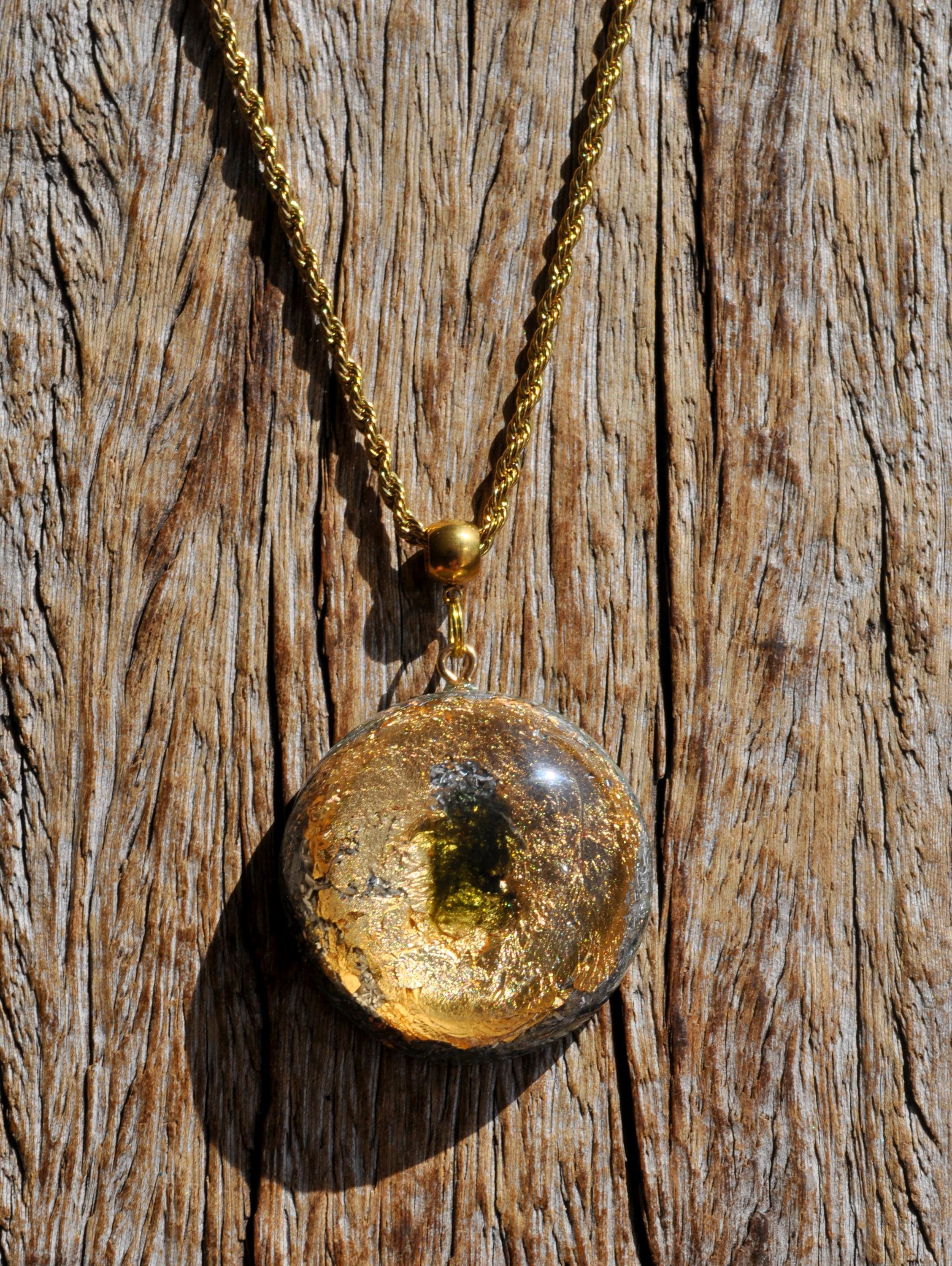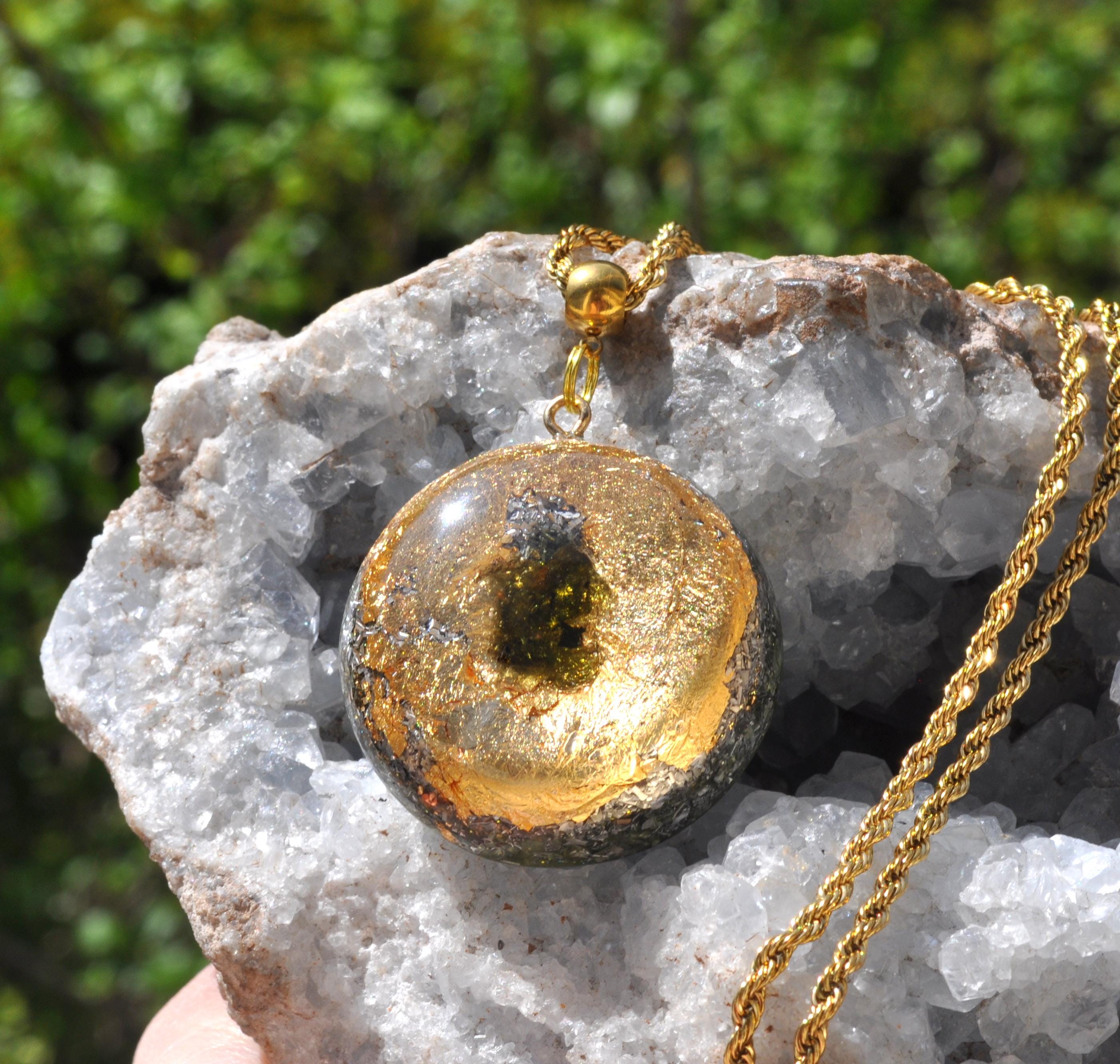 This handcrafted Orgonite® pendant features a striking 5-carat raw Moldavite crystal from the Czech Republic, surrounded by 24K gold flakes and set in durable resin. Measuring approximately 4.2 cm / 1.65 inches, it combines beauty, craftsmanship, and unique materials for anyone who appreciates natural stones and artistic jewelry.