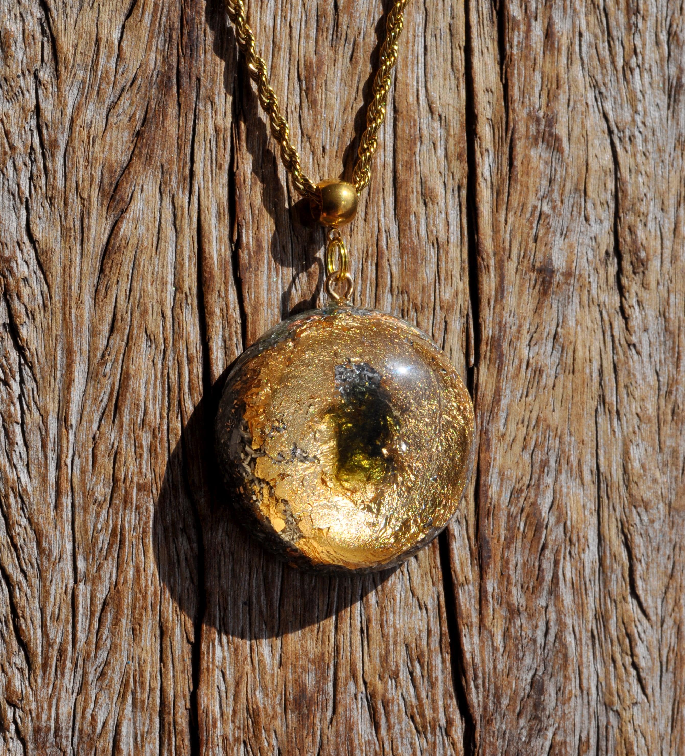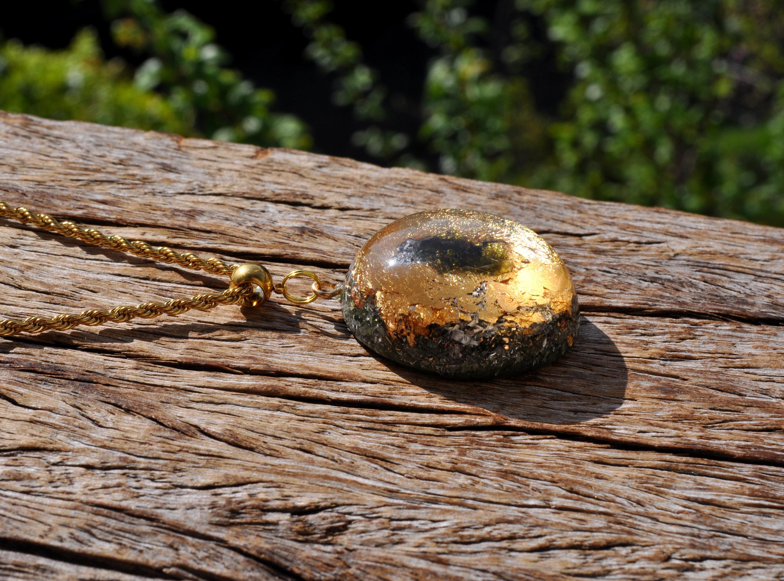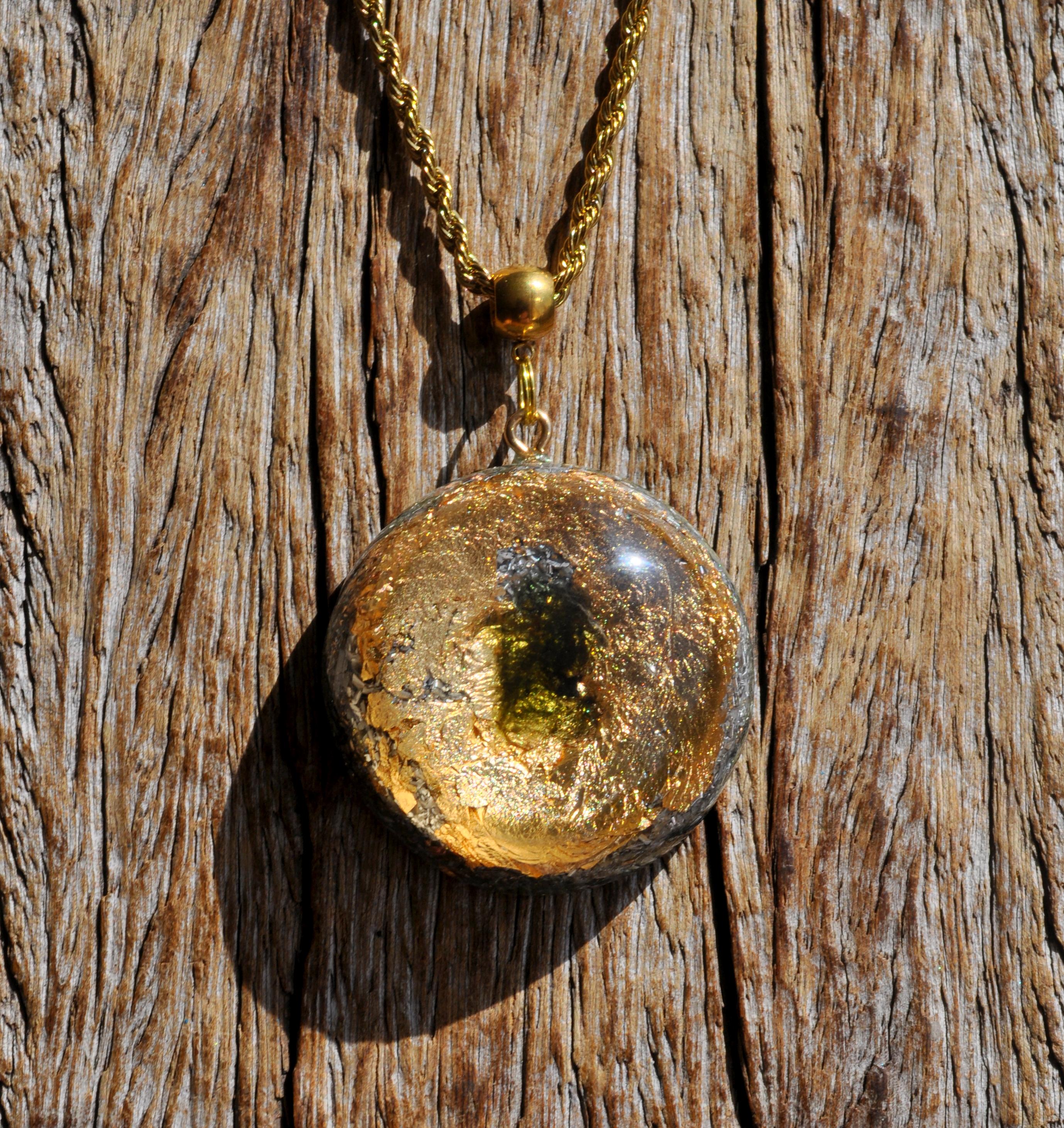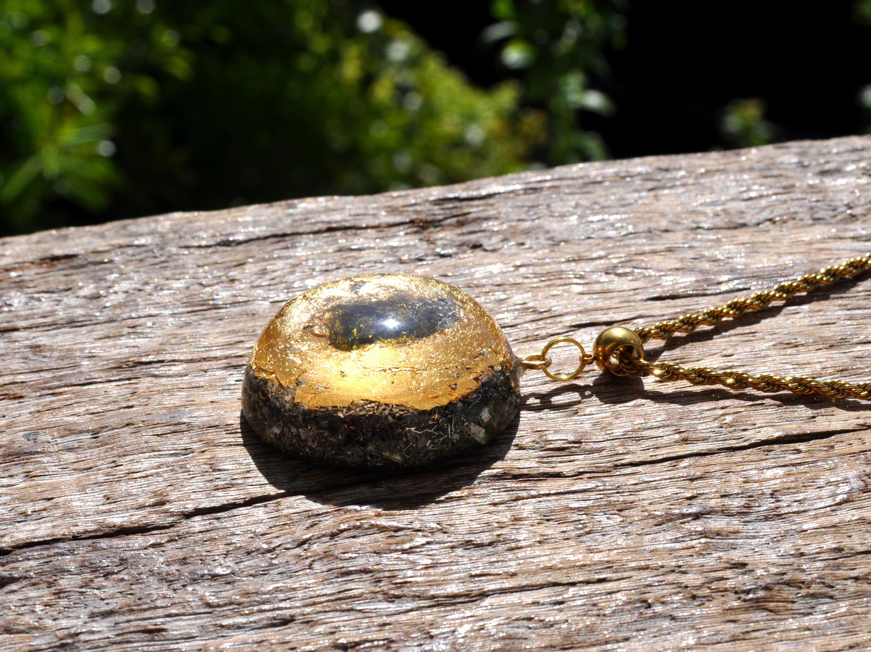 This handcrafted Orgonite® pendant features a striking 5-carat raw Moldavite crystal from the Czech Republic, surrounded by 24K gold flakes and set in durable resin. Measuring approximately 4.2 cm / 1.65 inches, it combines beauty, craftsmanship, and unique materials for anyone who appreciates natural stones and artistic jewelry.