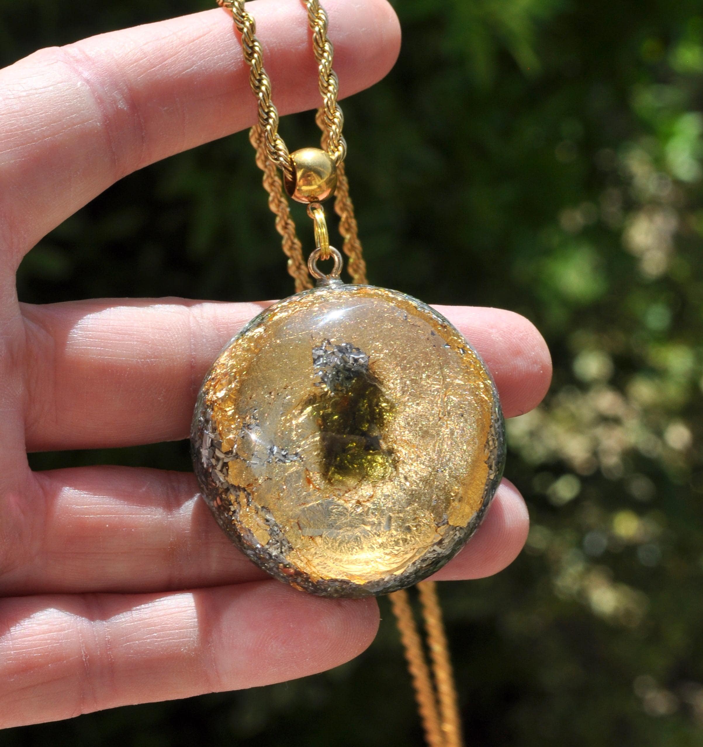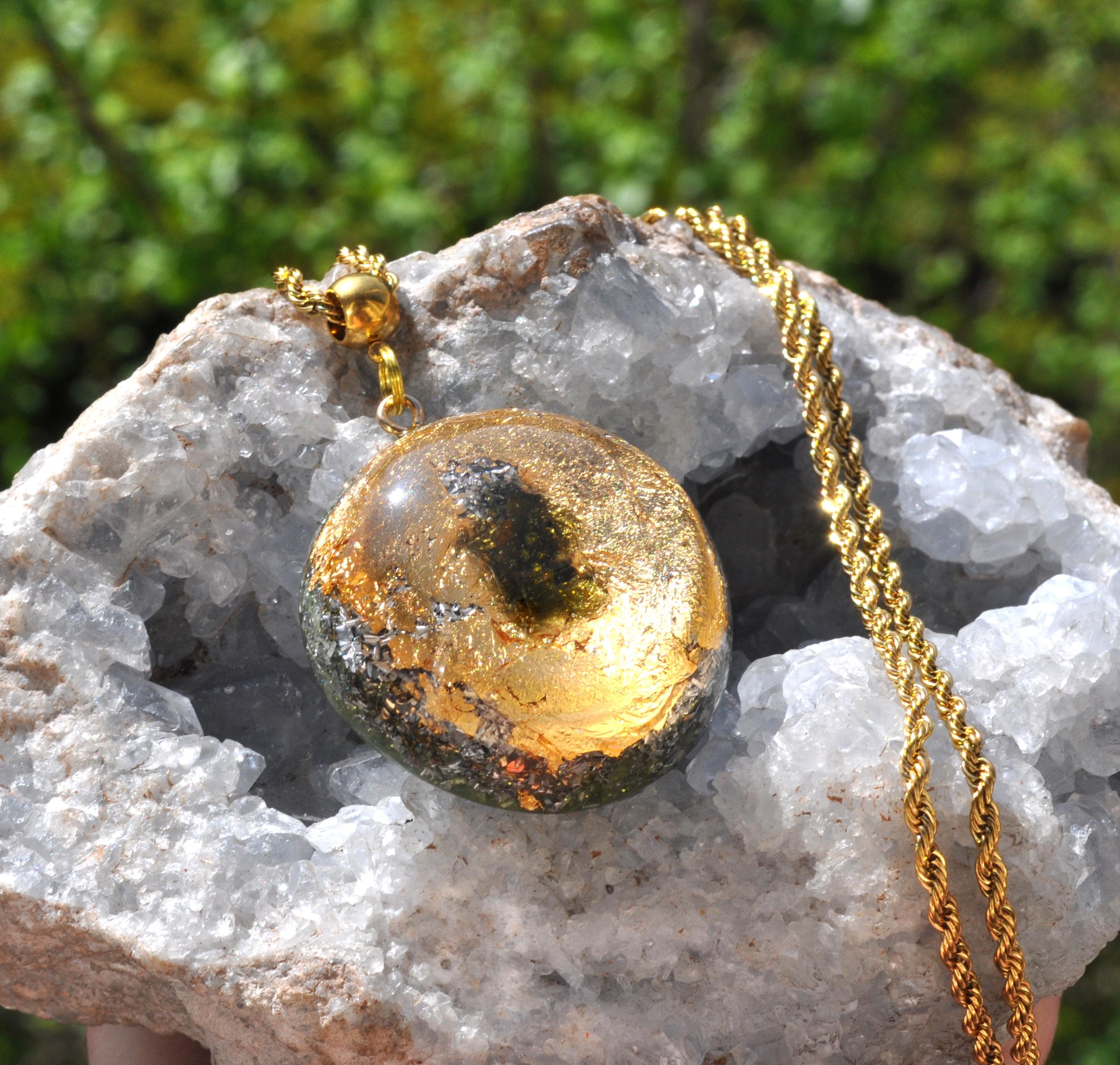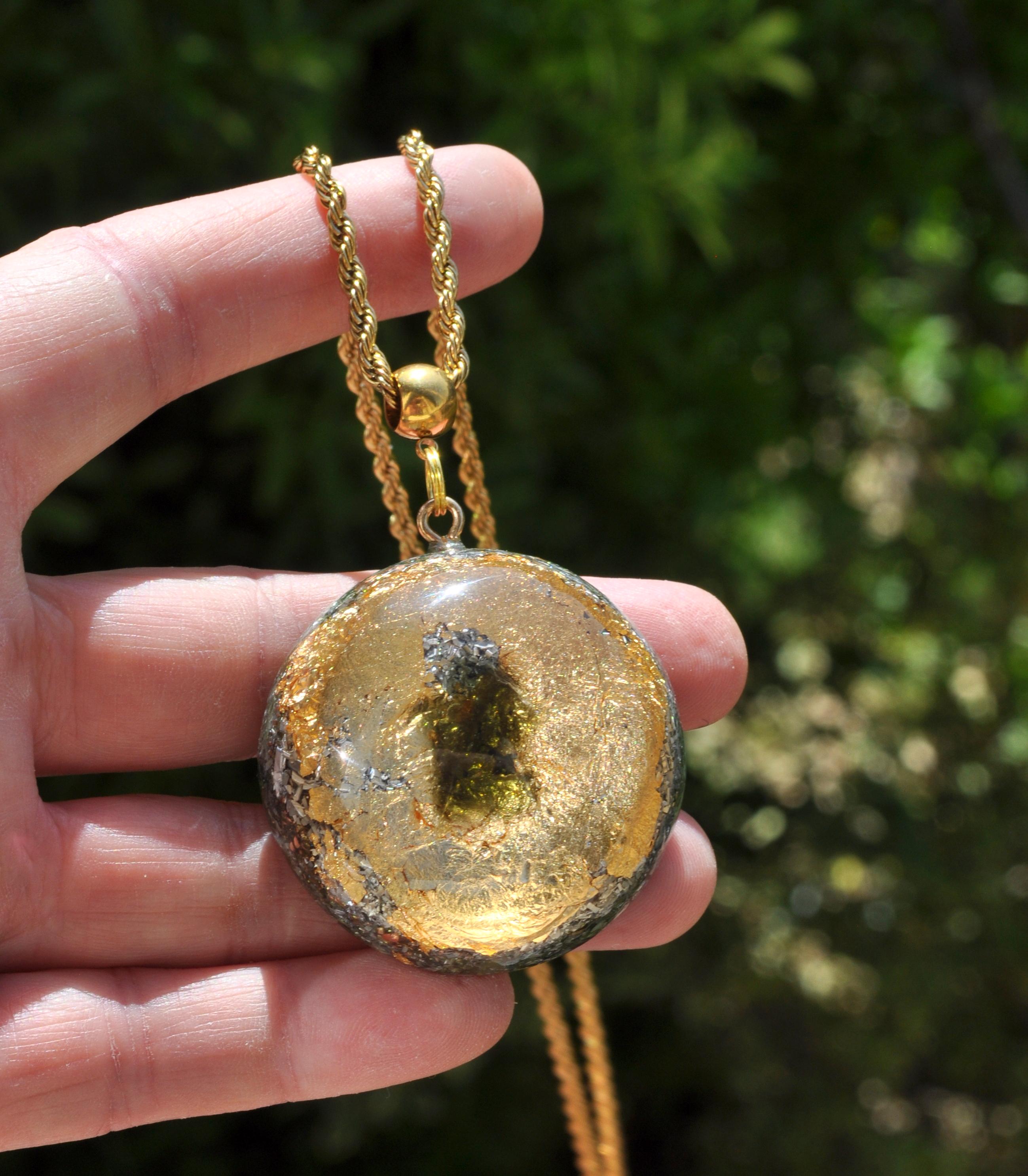 All materials are encased in durable resin with at least 50% metal shavings, following traditional Orgonite® design principles.