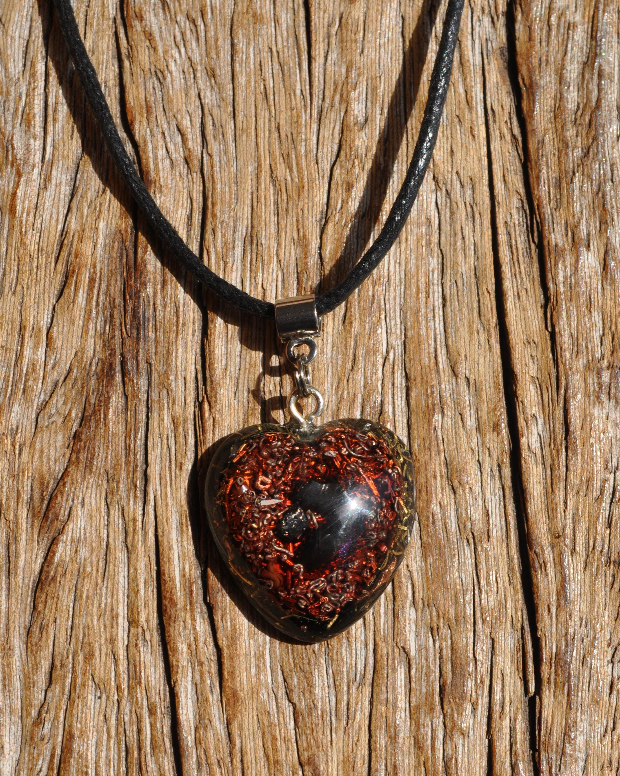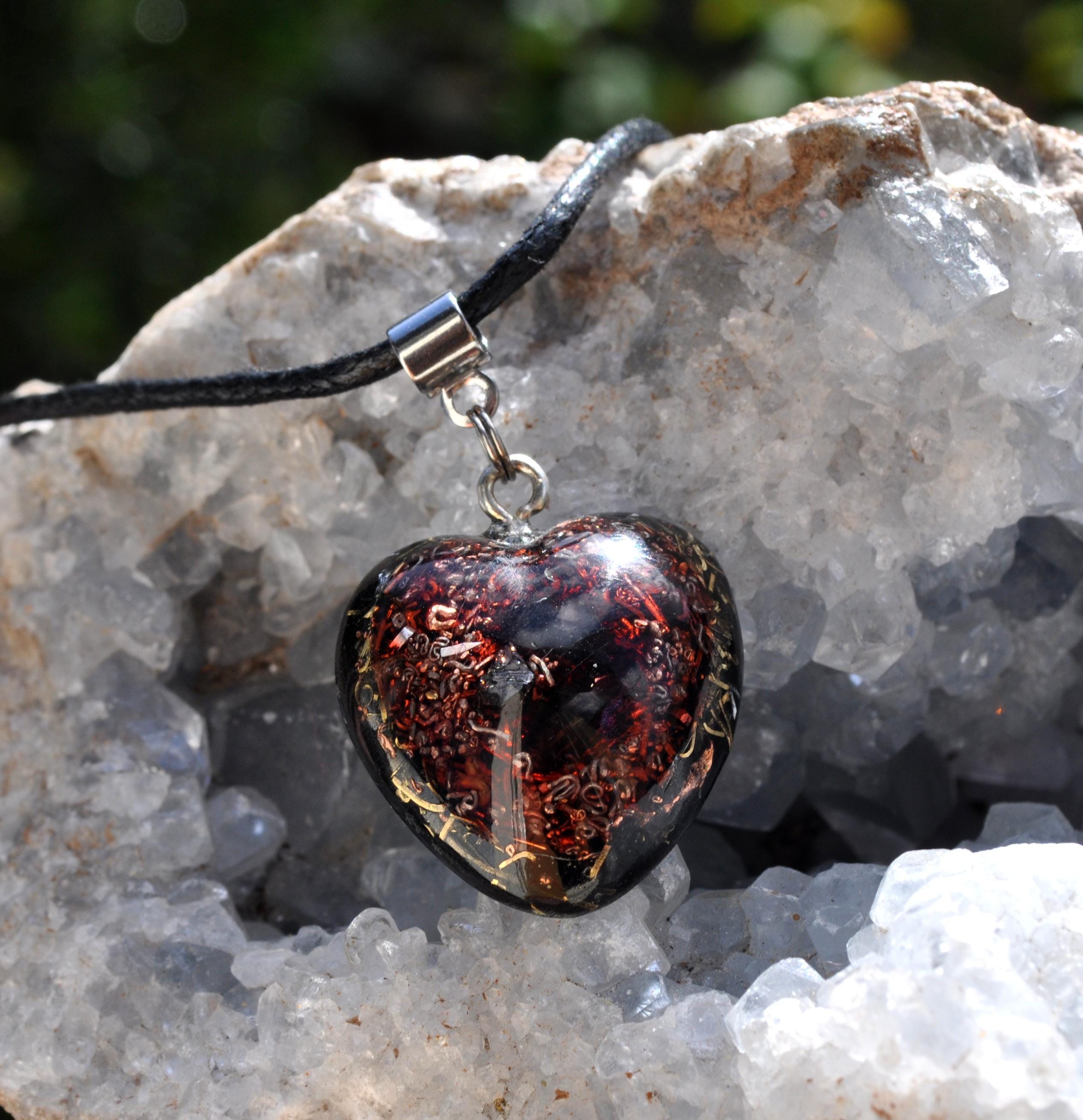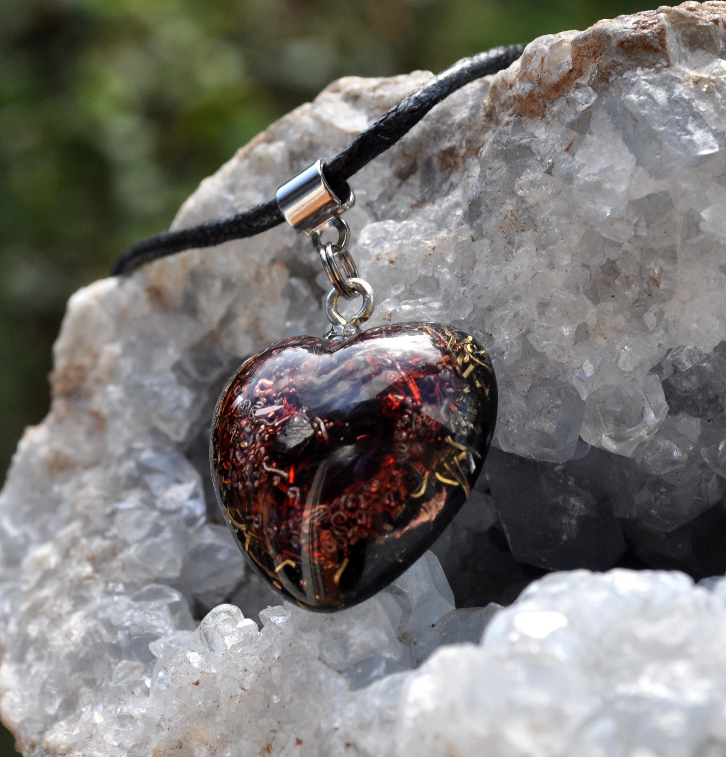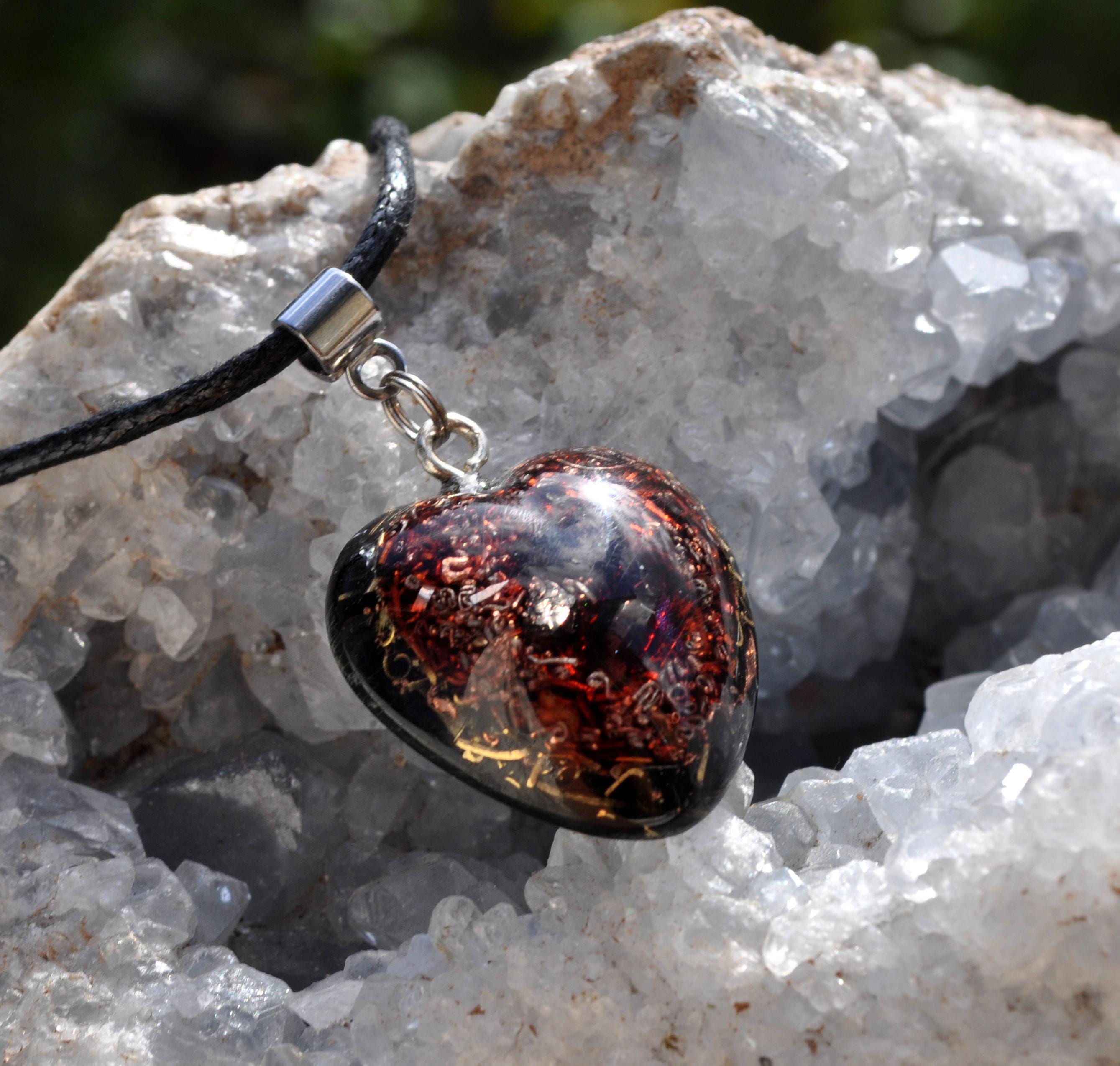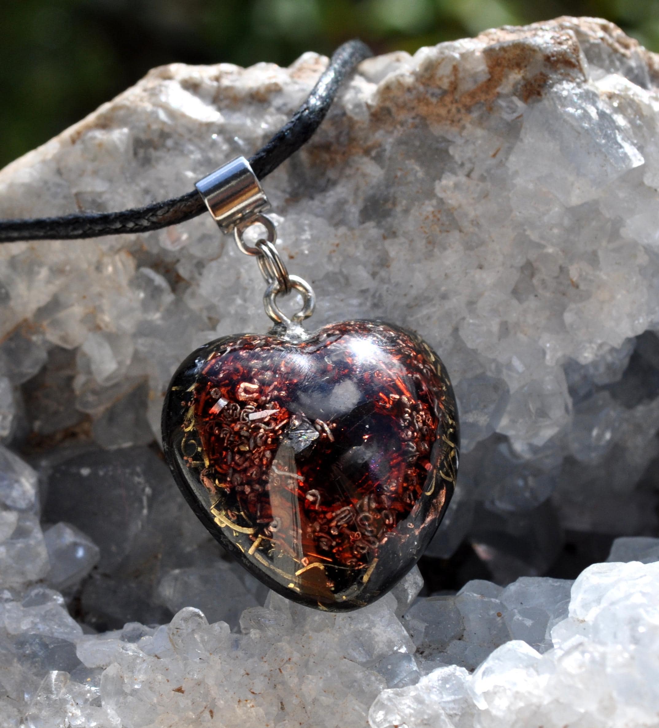 Elevate your energy and style with this handmade heart-shaped Orgonite® pendant, featuring a layered design with black resin in the back and vibrant red resin in the front. Embedded within are three raw Elite Shungite stones surrounded by brass, copper, and bronze metal shavings for a classic 50/50 resin-to-metal Orgonite® structure.