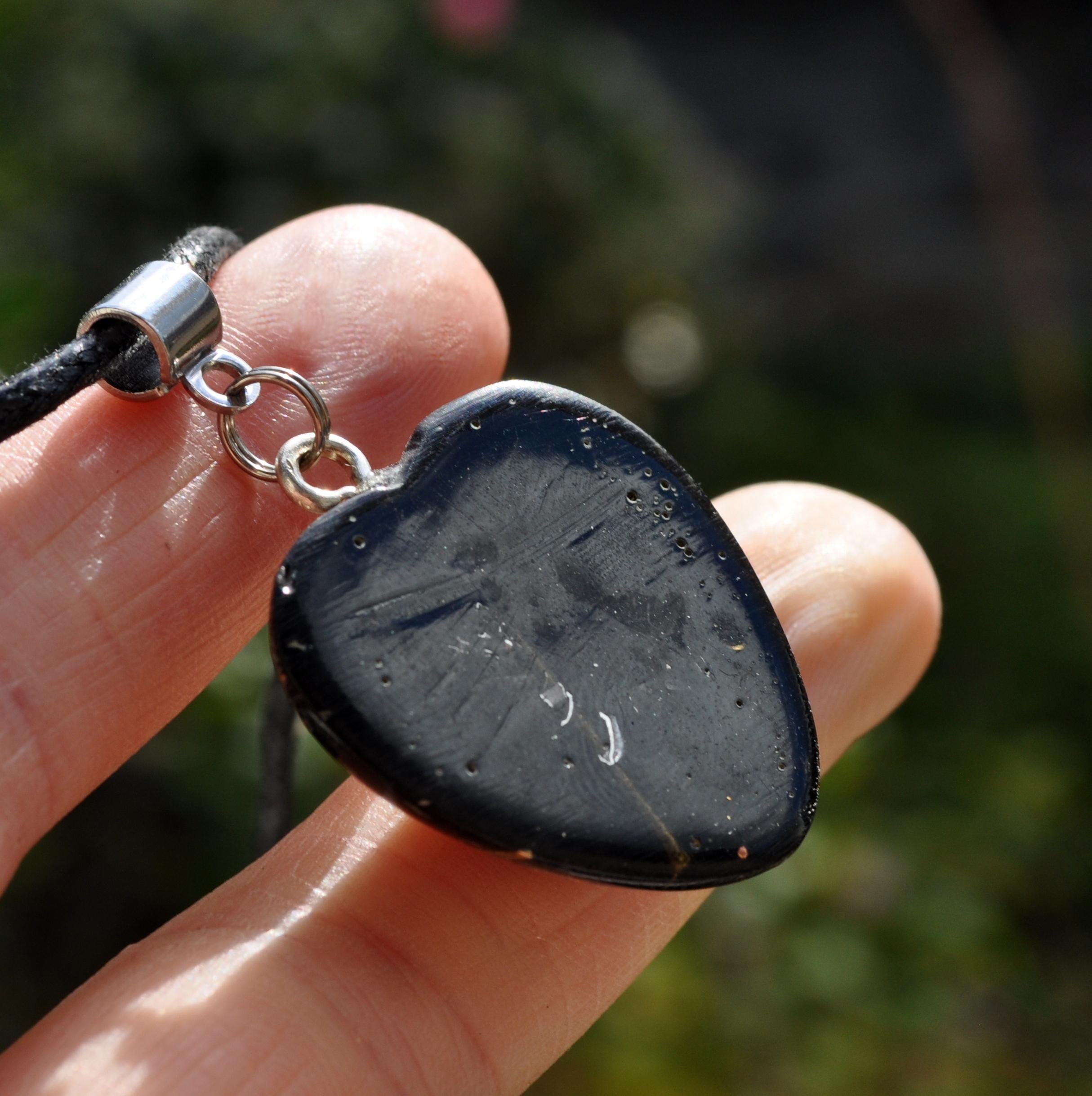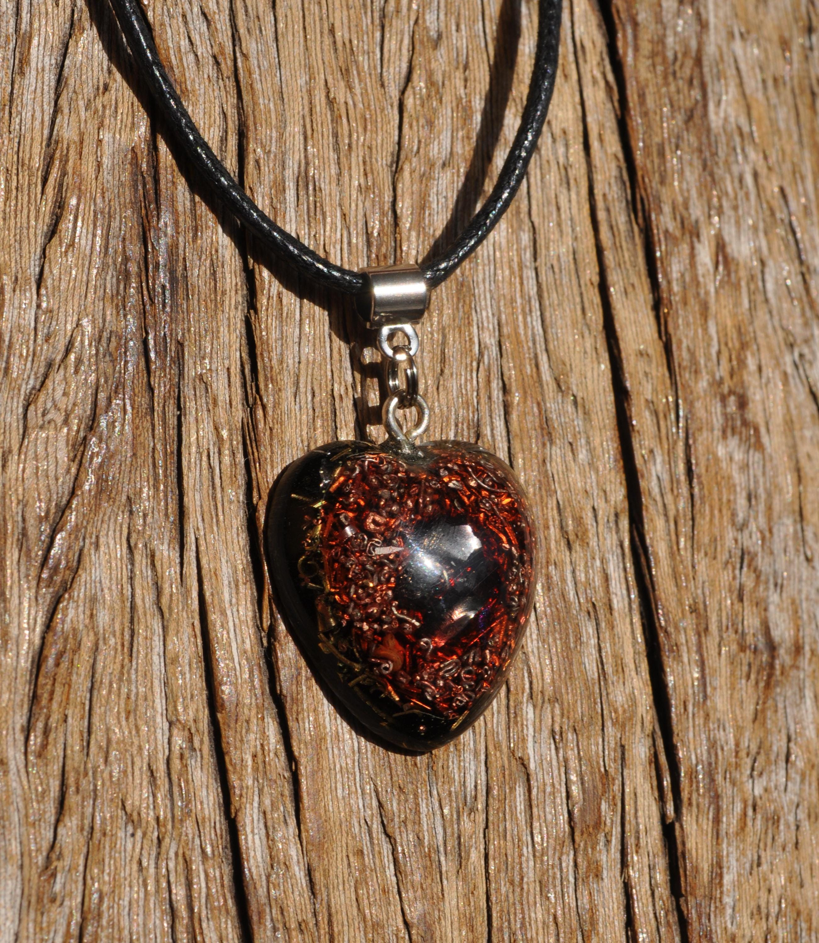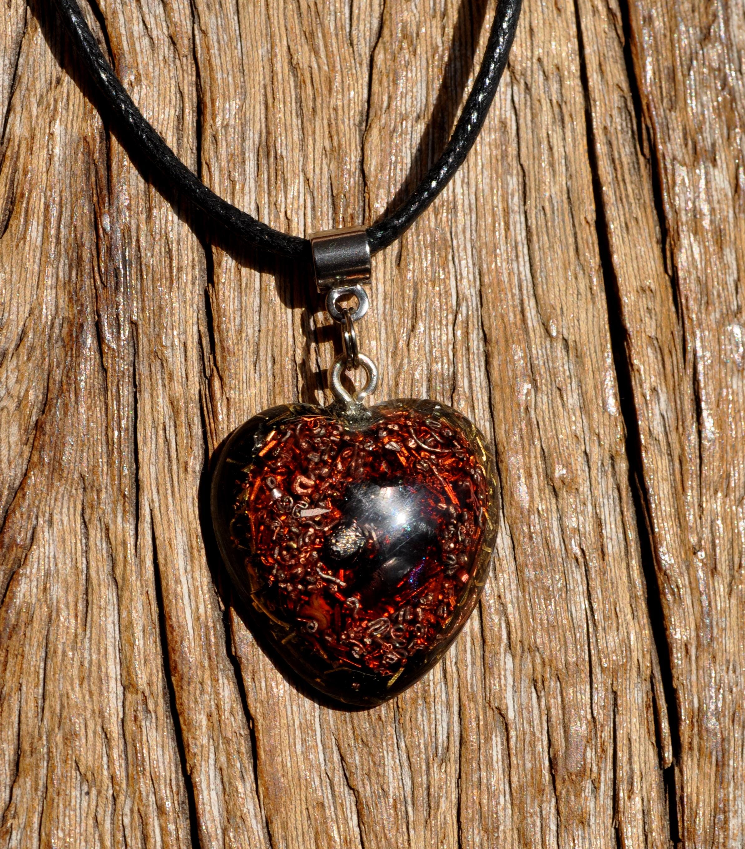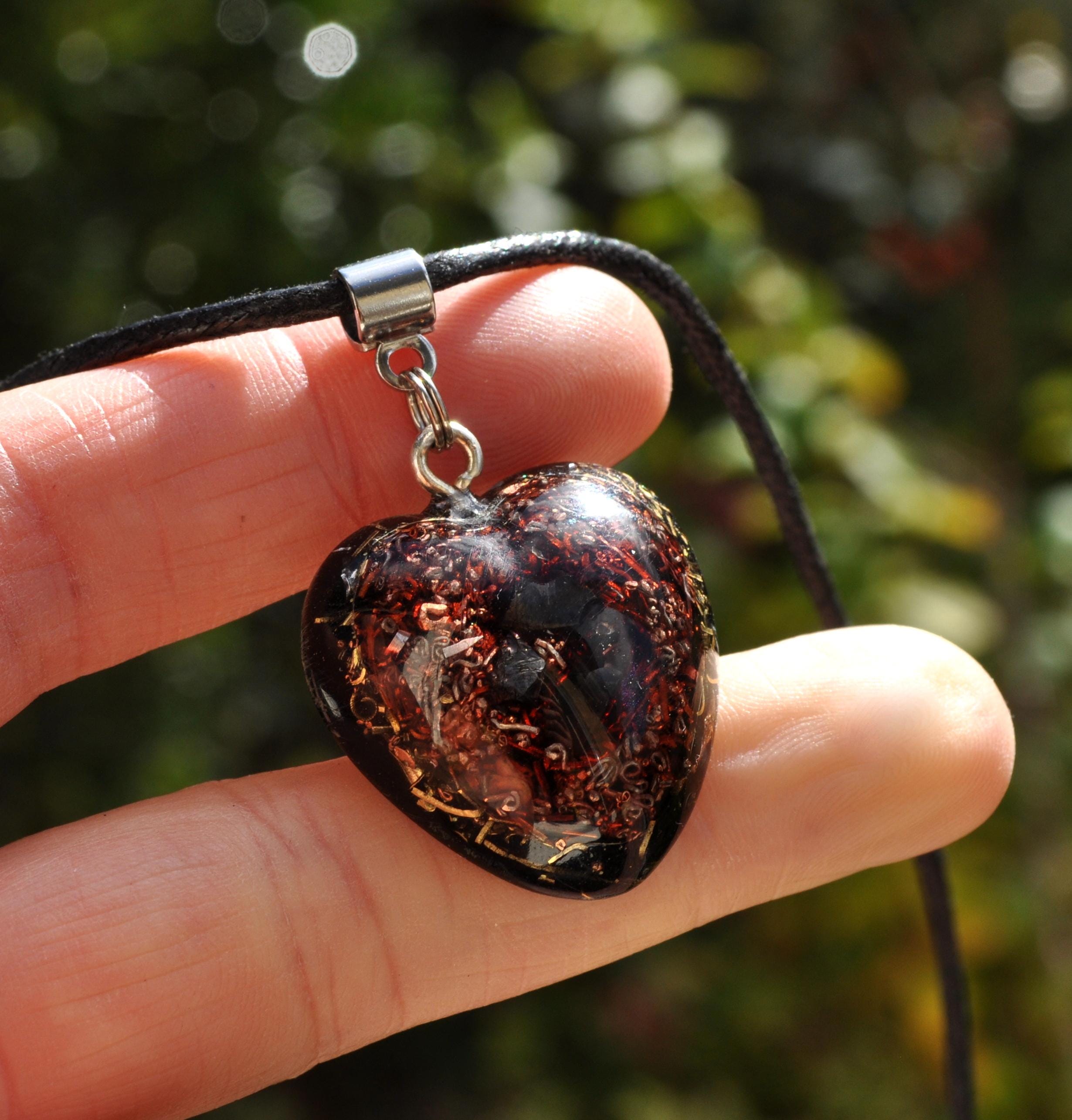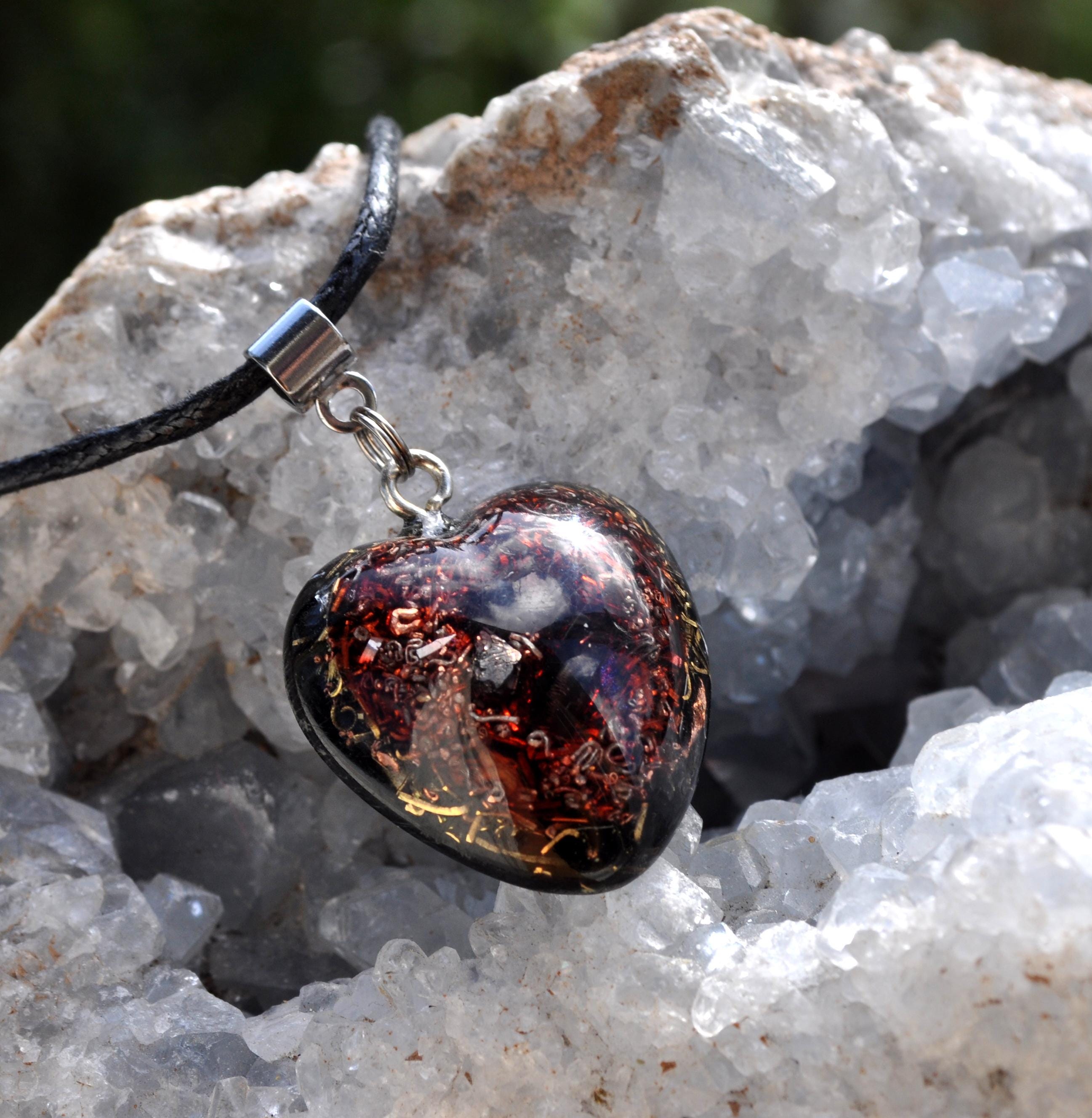 Elevate your energy and style with this handmade heart-shaped Orgonite® pendant, featuring a layered design with black resin in the back and vibrant red resin in the front. Embedded within are three raw Elite Shungite stones surrounded by brass, copper, and bronze metal shavings for a classic 50/50 resin-to-metal Orgonite® structure.