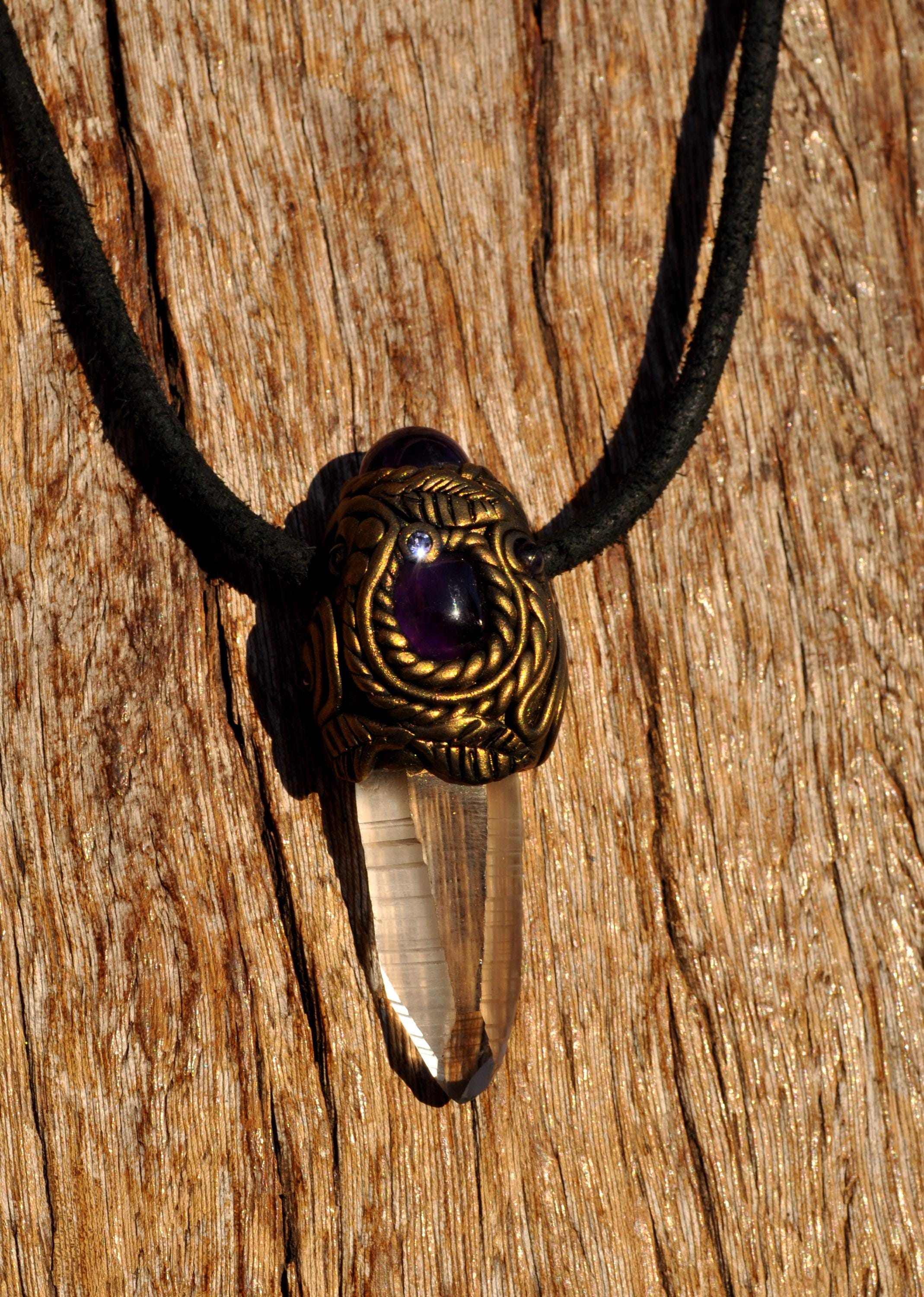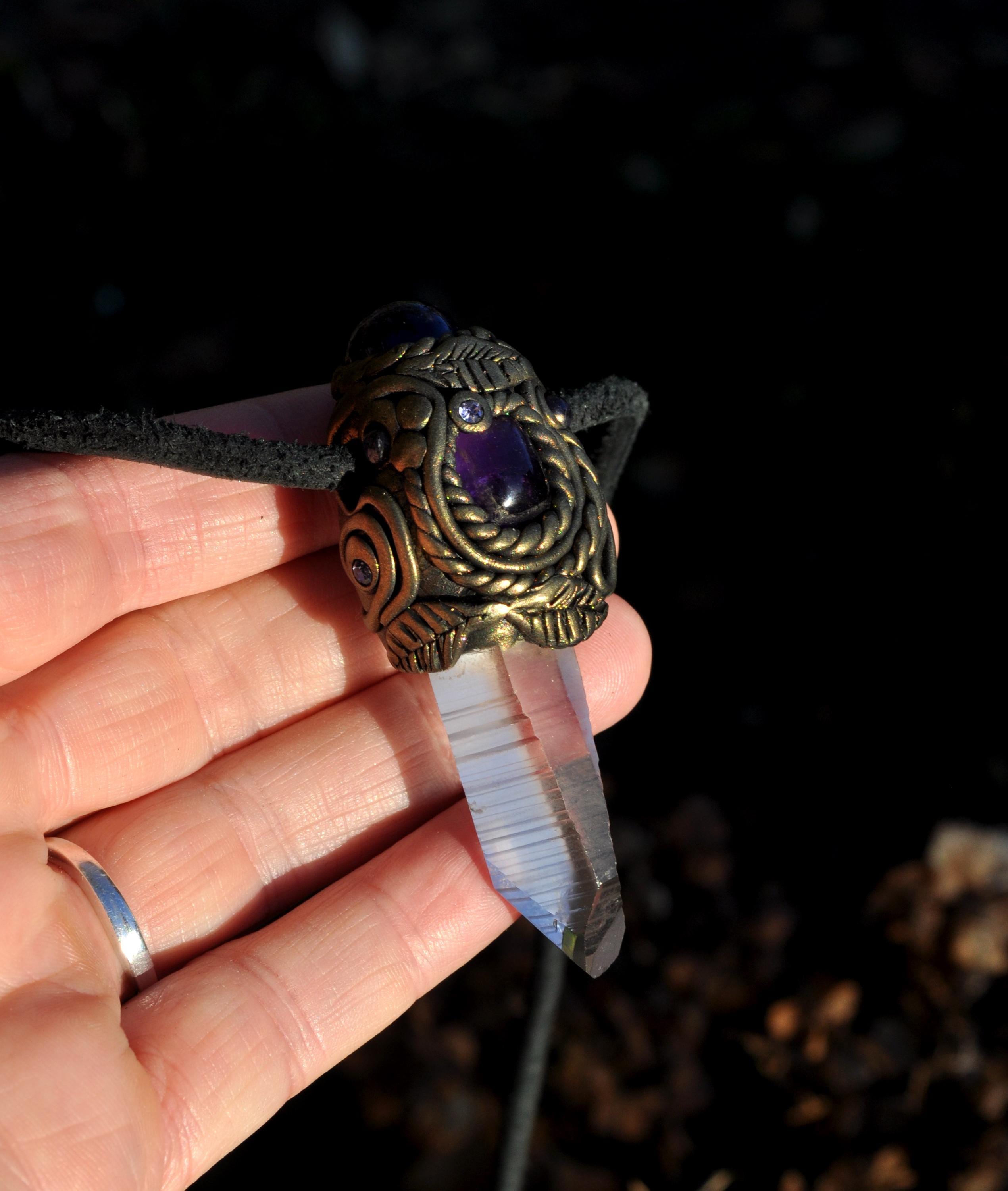 This large handmade pendant brings together two stones admired for their beauty and presence: a naturally terminated six-sided Lemurian Seed Crystal from Brazil and a polished Amethyst, complemented by a small Amethyst sphere set at the top. The result is a piece that feels as meaningful as it looks.