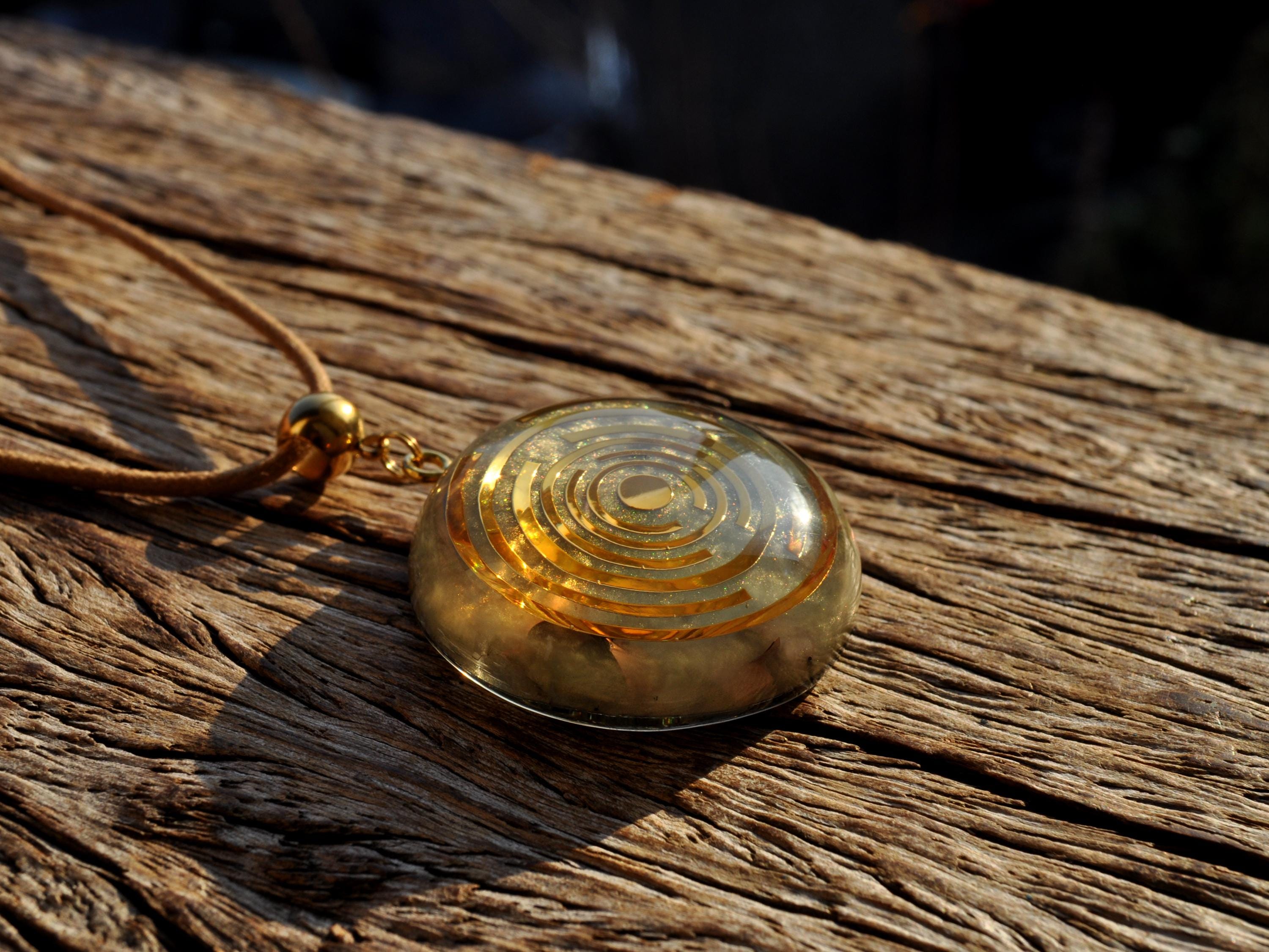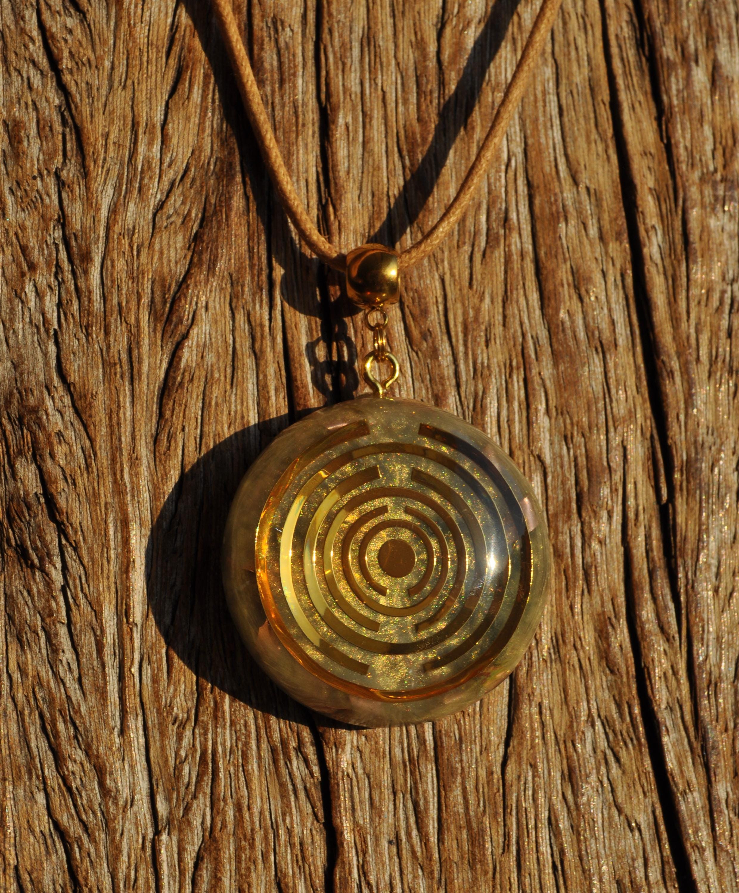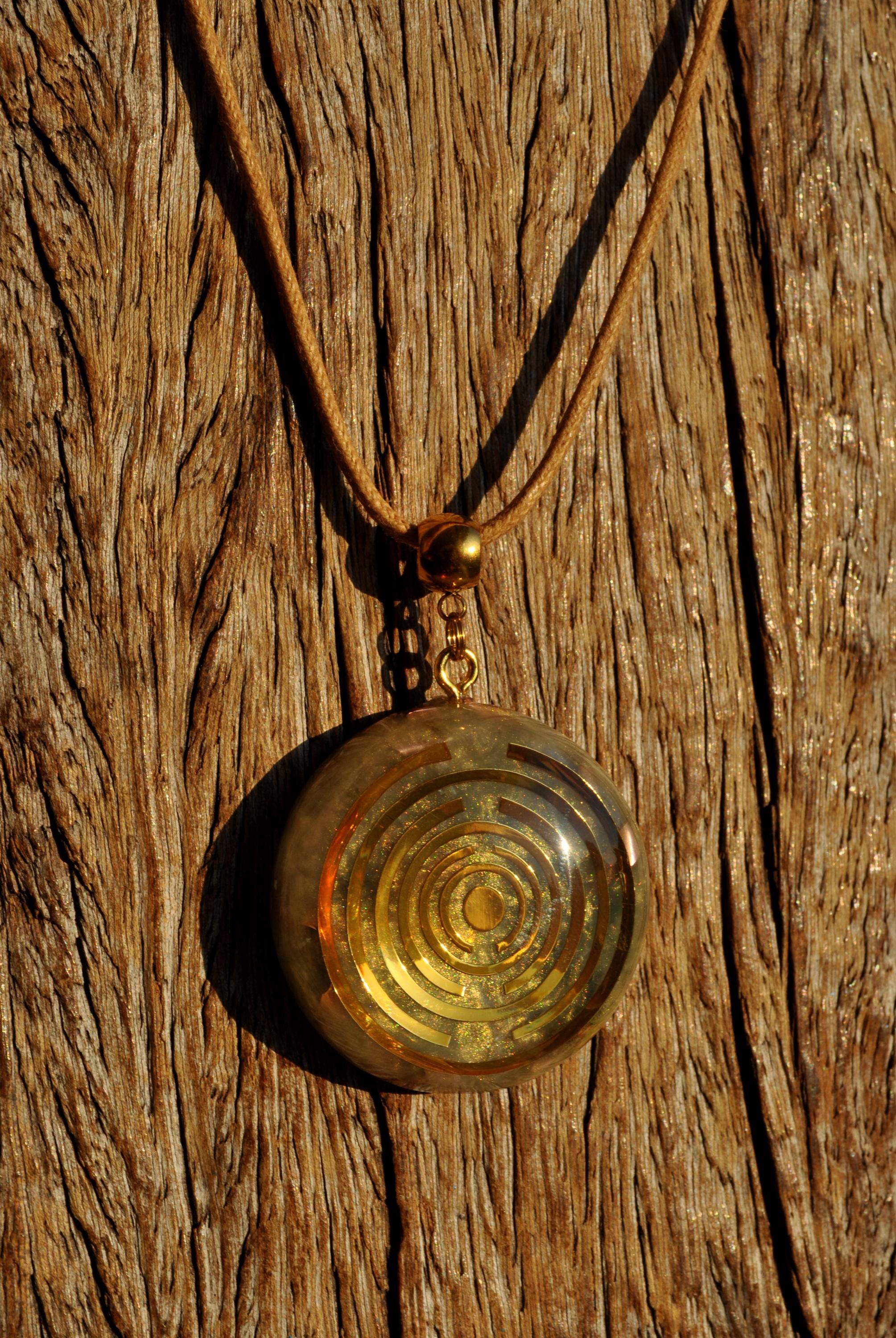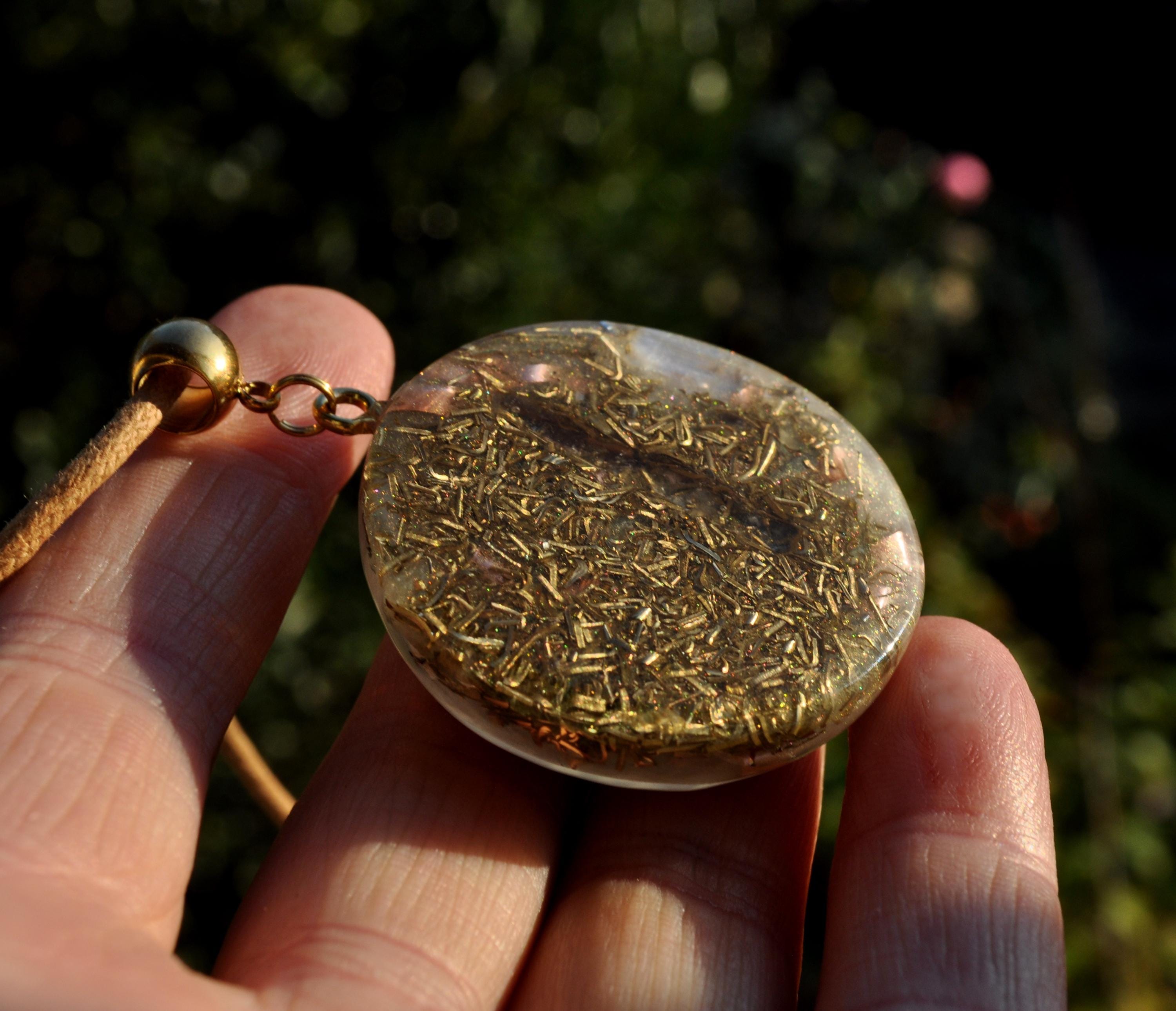 The pendant features a copper-plated MWO at its center, set in light gold resin with a carefully crafted blend of metal shavings and natural crystals. Many wearers report feeling more balanced, grounded, or centered when wearing Lakhovsky-inspired pieces. Each pendant is meticulously handmade, ensuring that no two are exactly alike. You will receive the exact pendant as shown in the pictures.