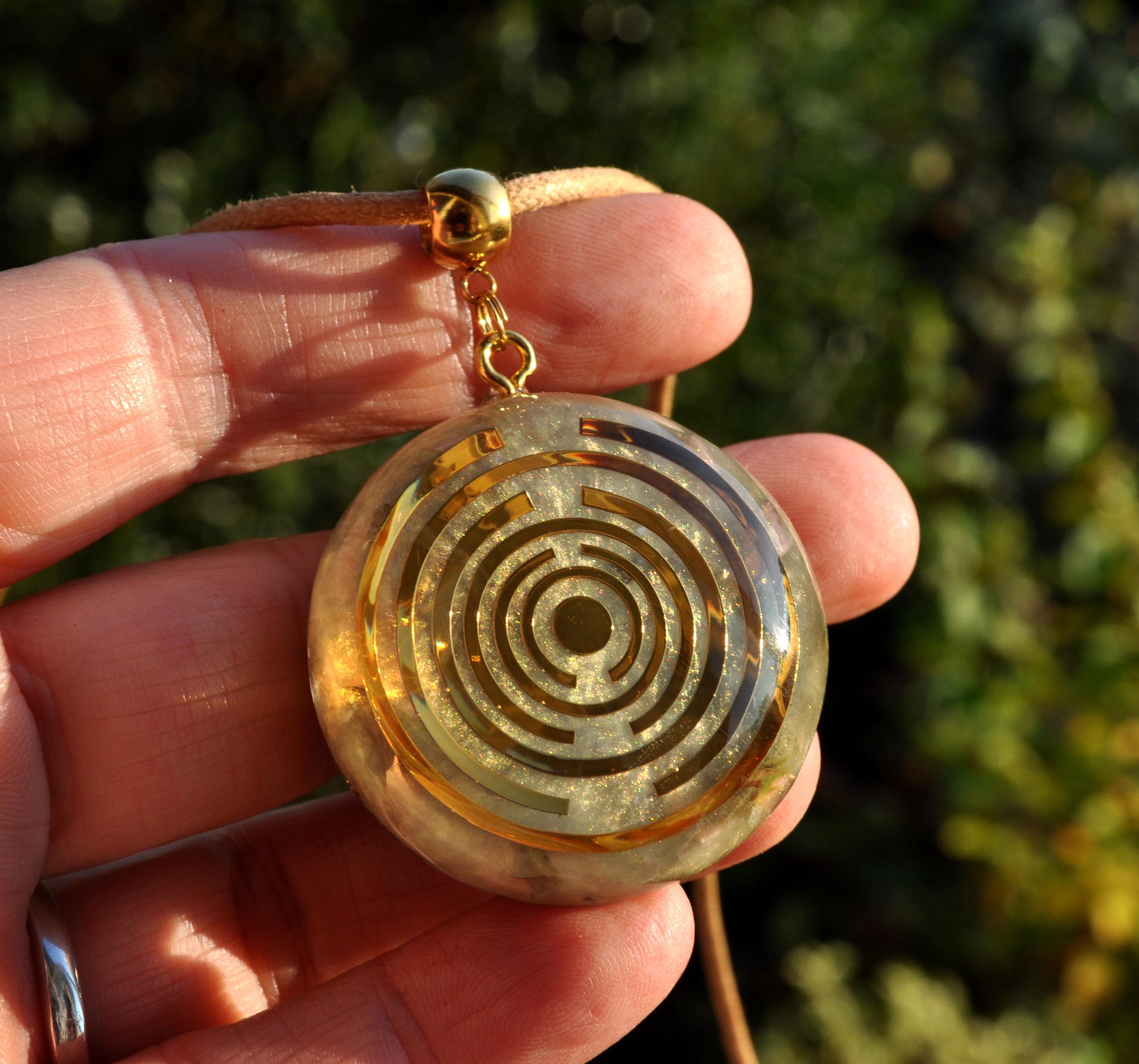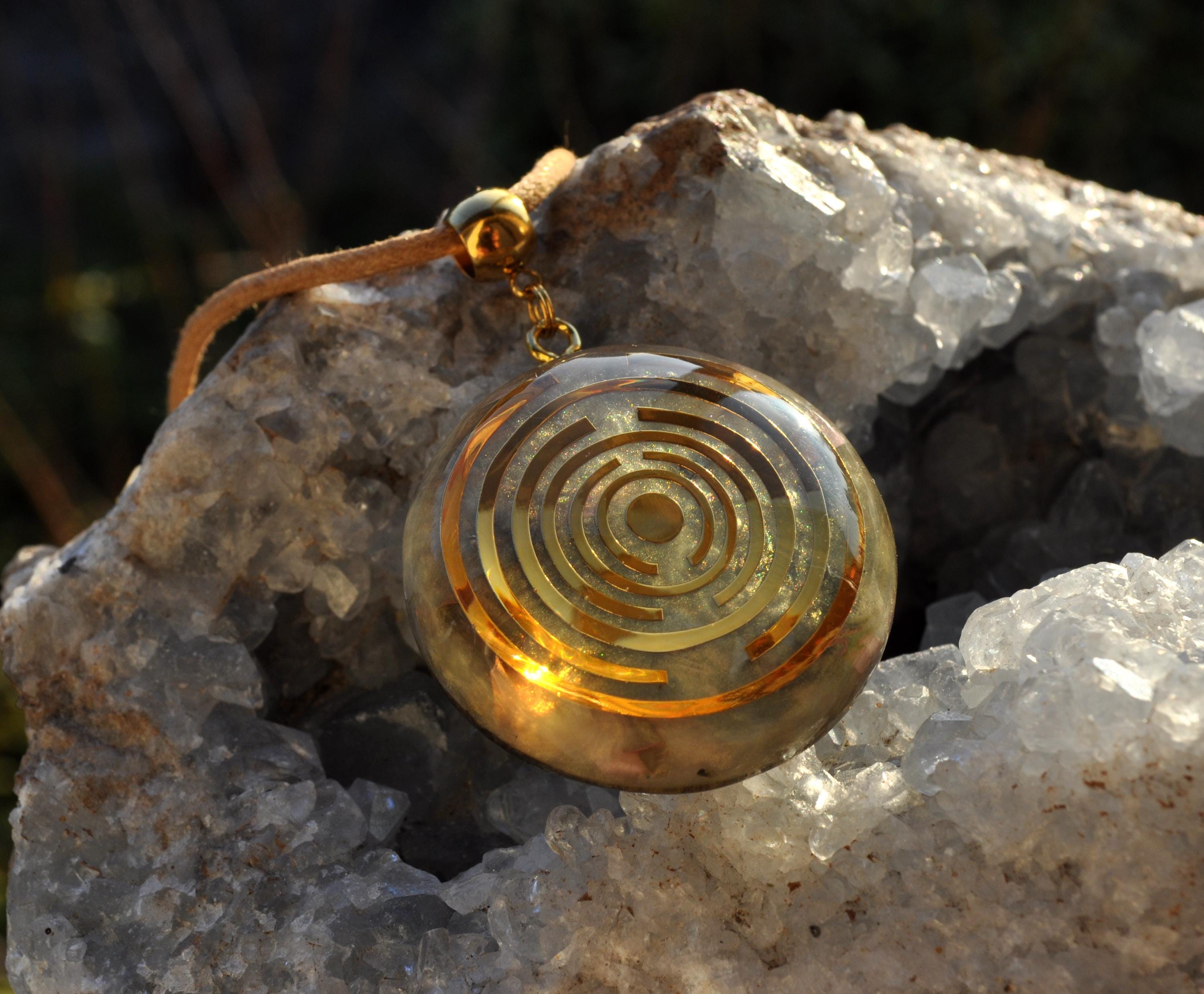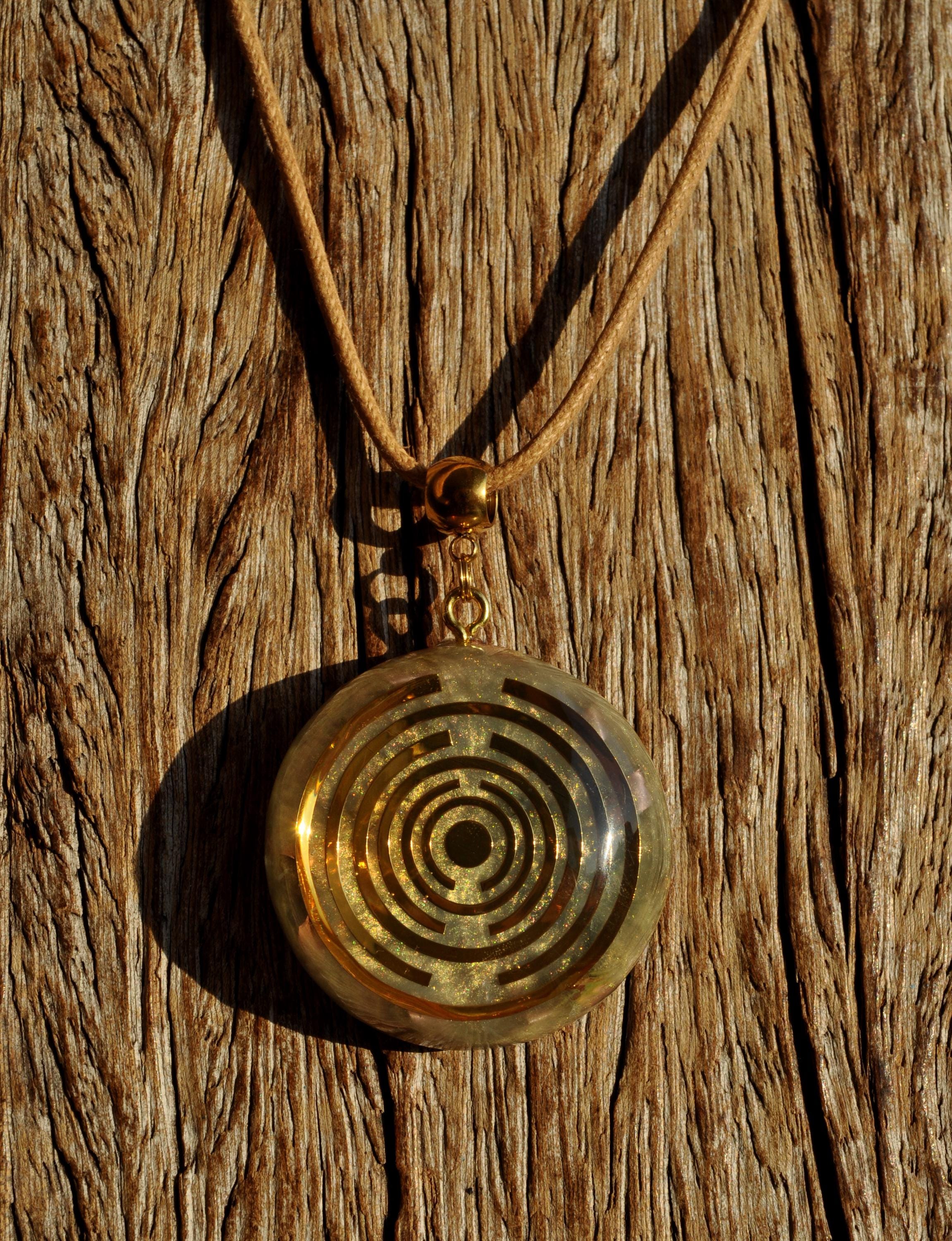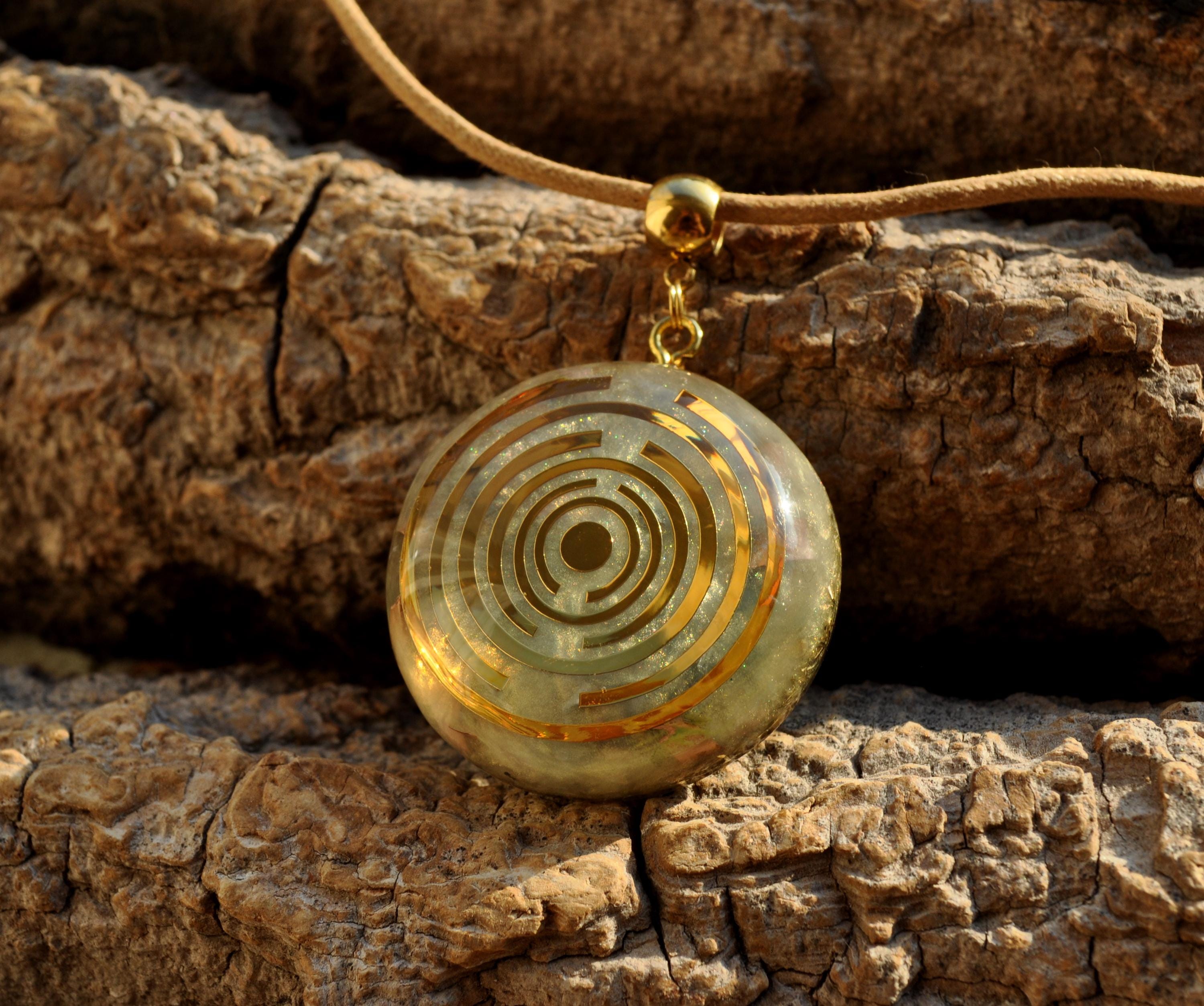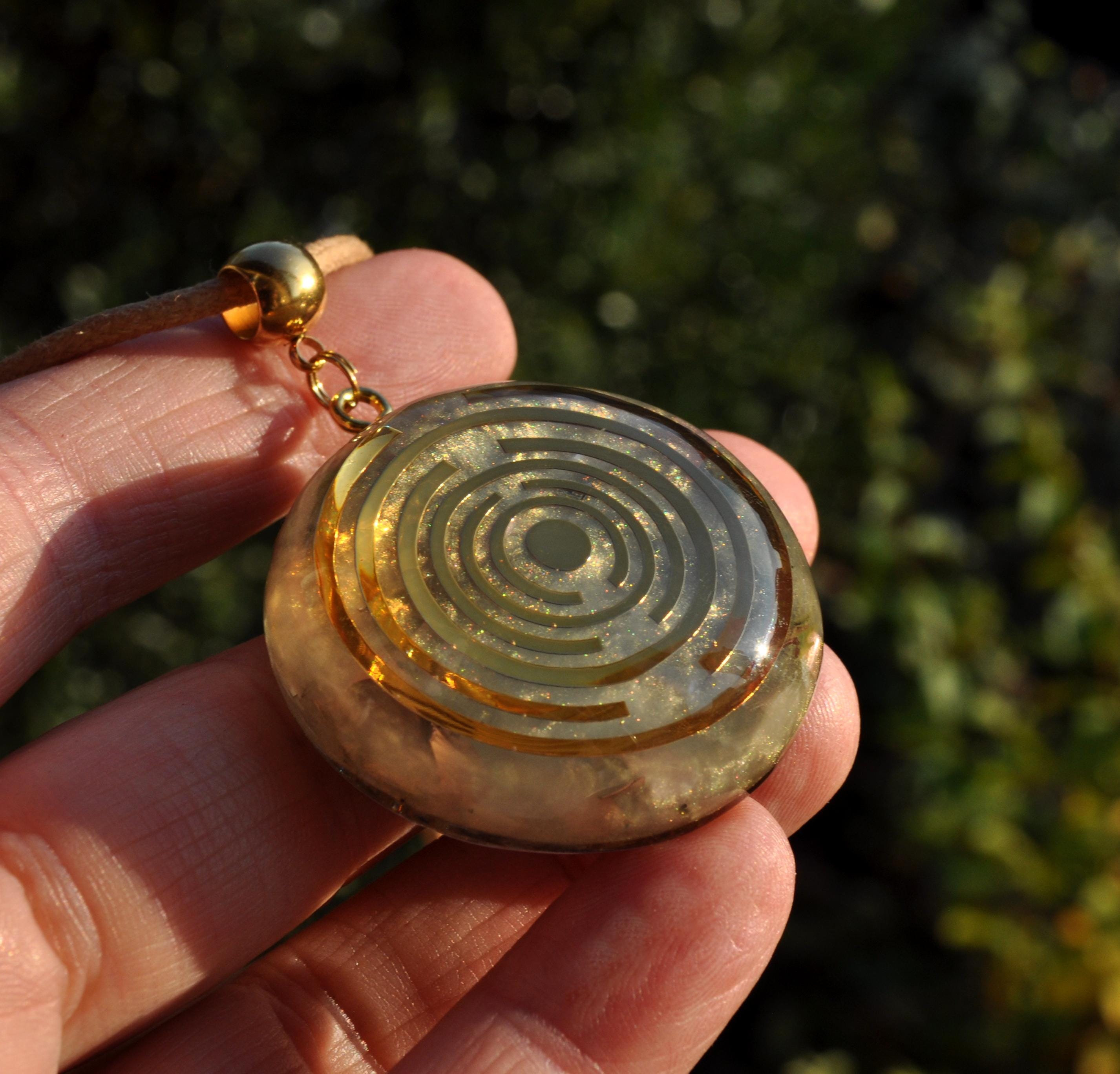 The pendant features a copper-plated MWO at its center, set in light gold resin with a carefully crafted blend of metal shavings and natural crystals. Many wearers report feeling more balanced, grounded, or centered when wearing Lakhovsky-inspired pieces. Each pendant is meticulously handmade, ensuring that no two are exactly alike. You will receive the exact pendant as shown in the pictures.