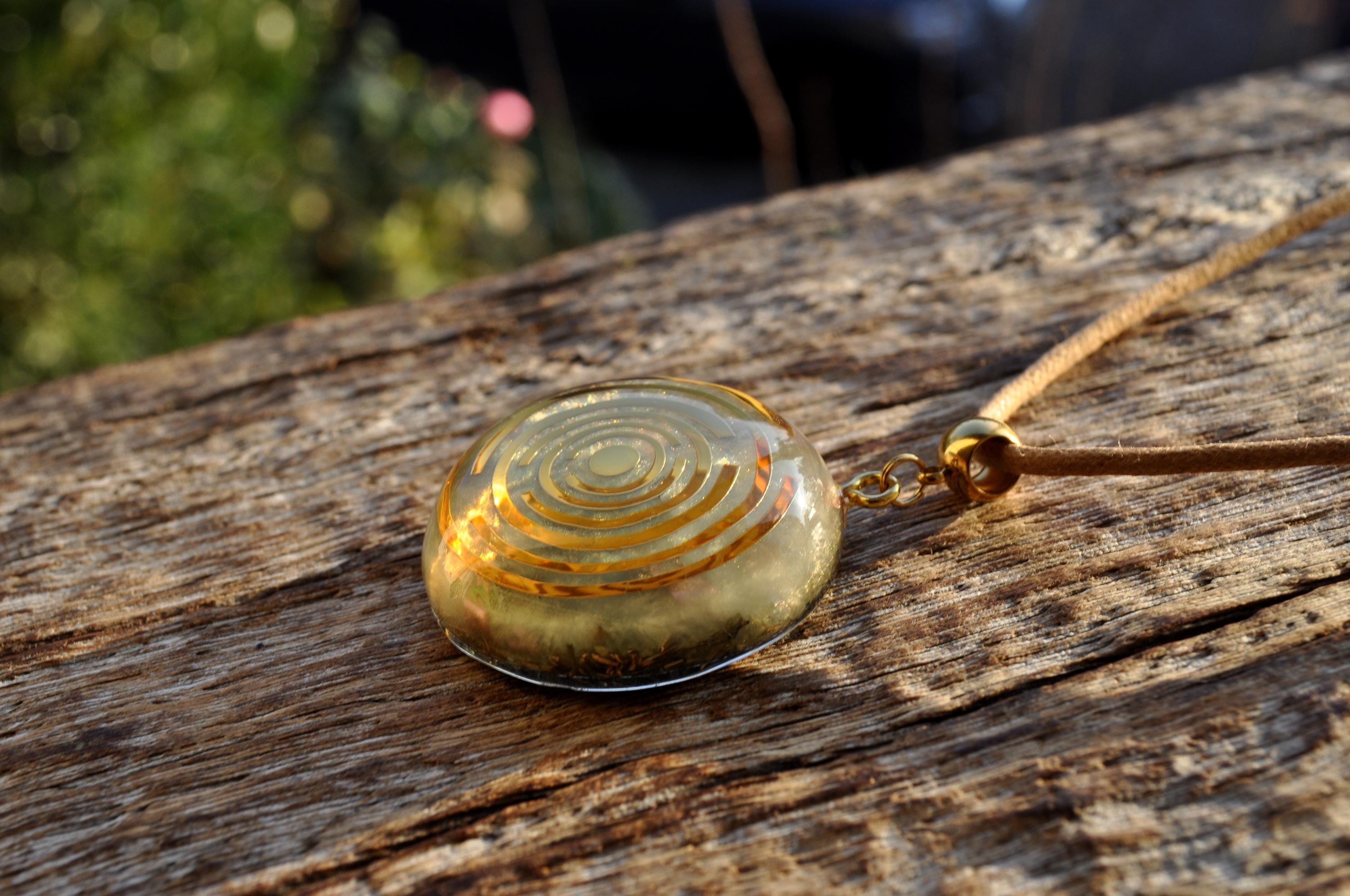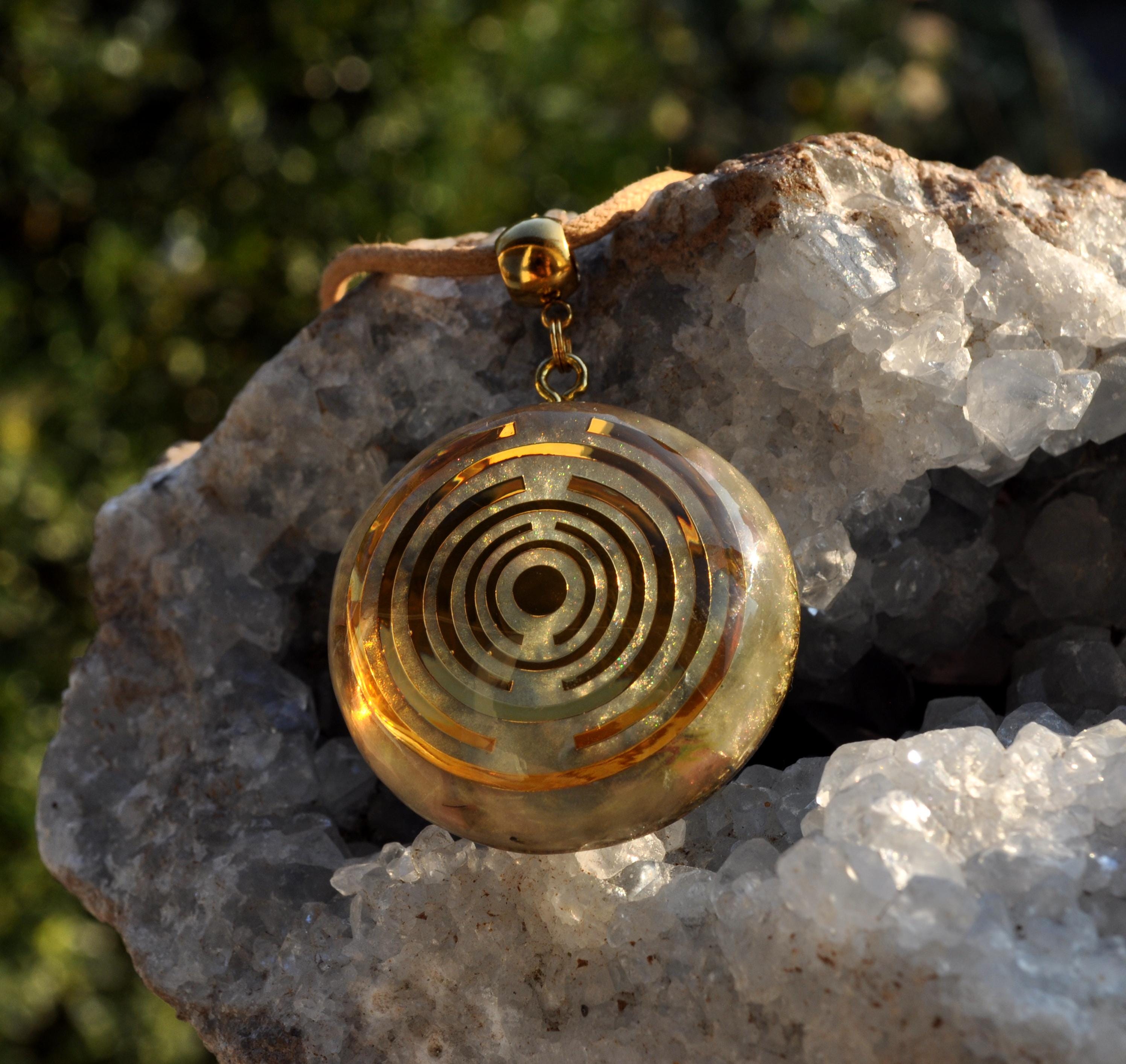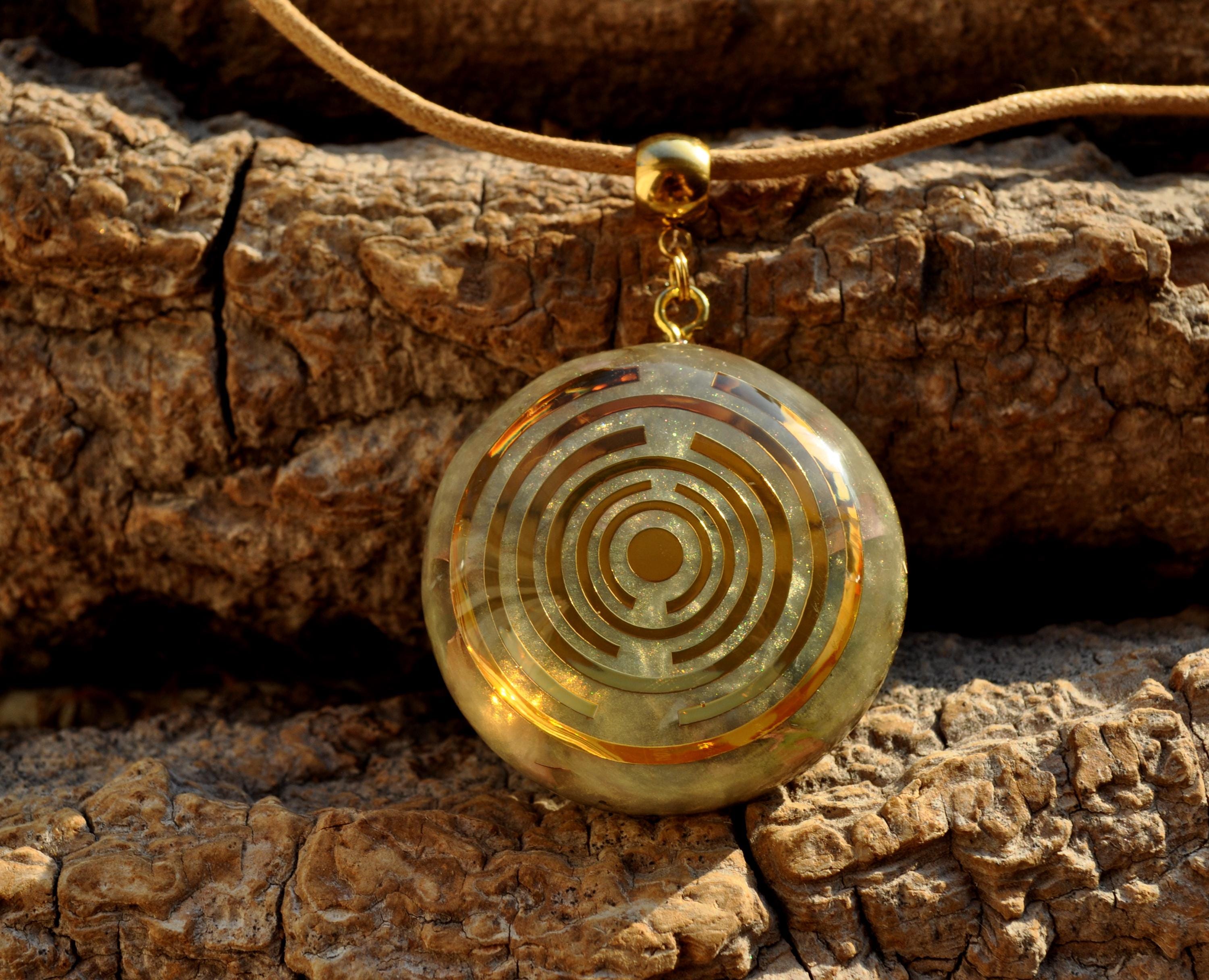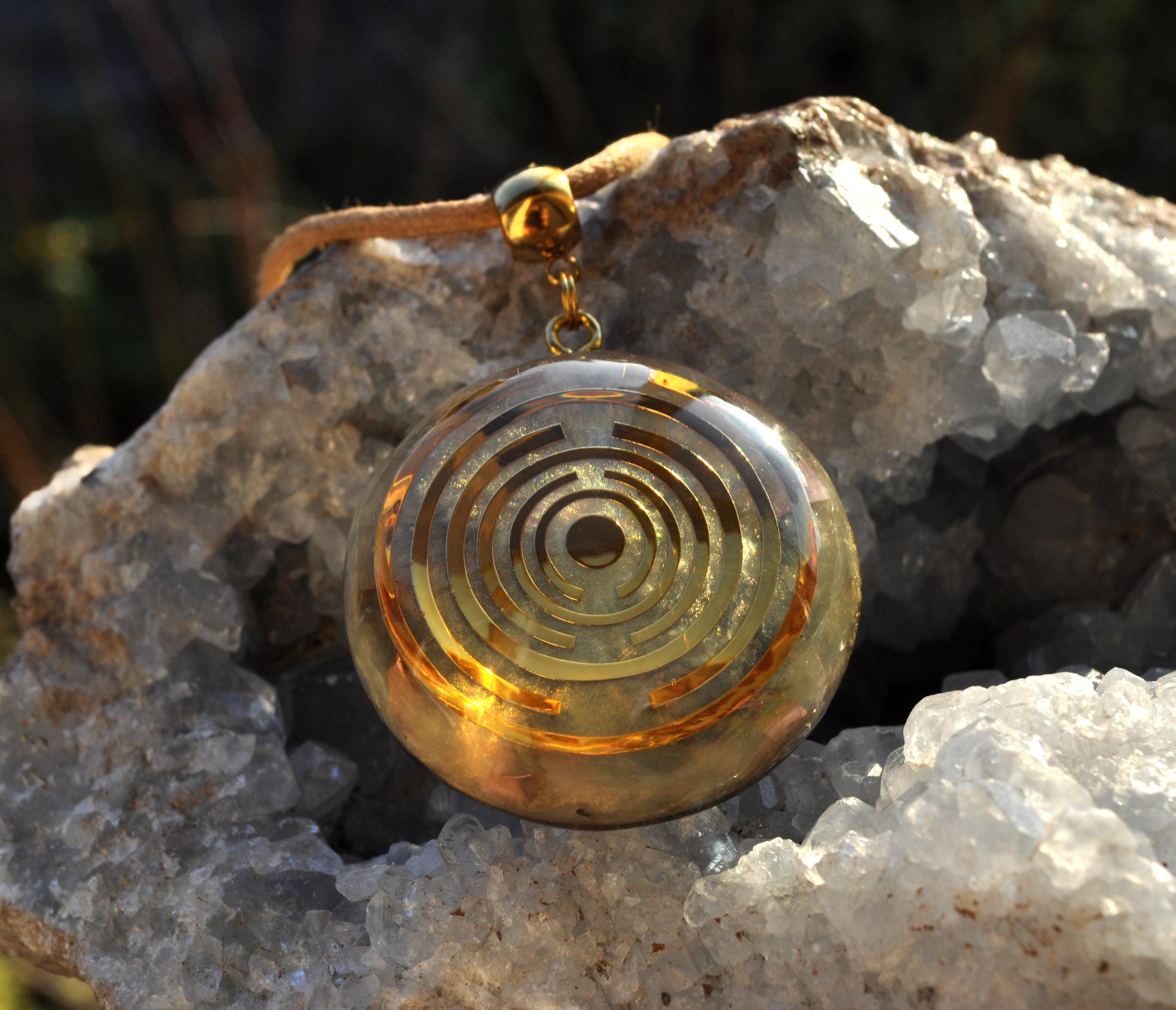 The pendant features a copper-plated MWO at its center, set in light gold resin with a carefully crafted blend of metal shavings and natural crystals. Many wearers report feeling more balanced, grounded, or centered when wearing Lakhovsky-inspired pieces. Each pendant is meticulously handmade, ensuring that no two are exactly alike. You will receive the exact pendant as shown in the pictures.