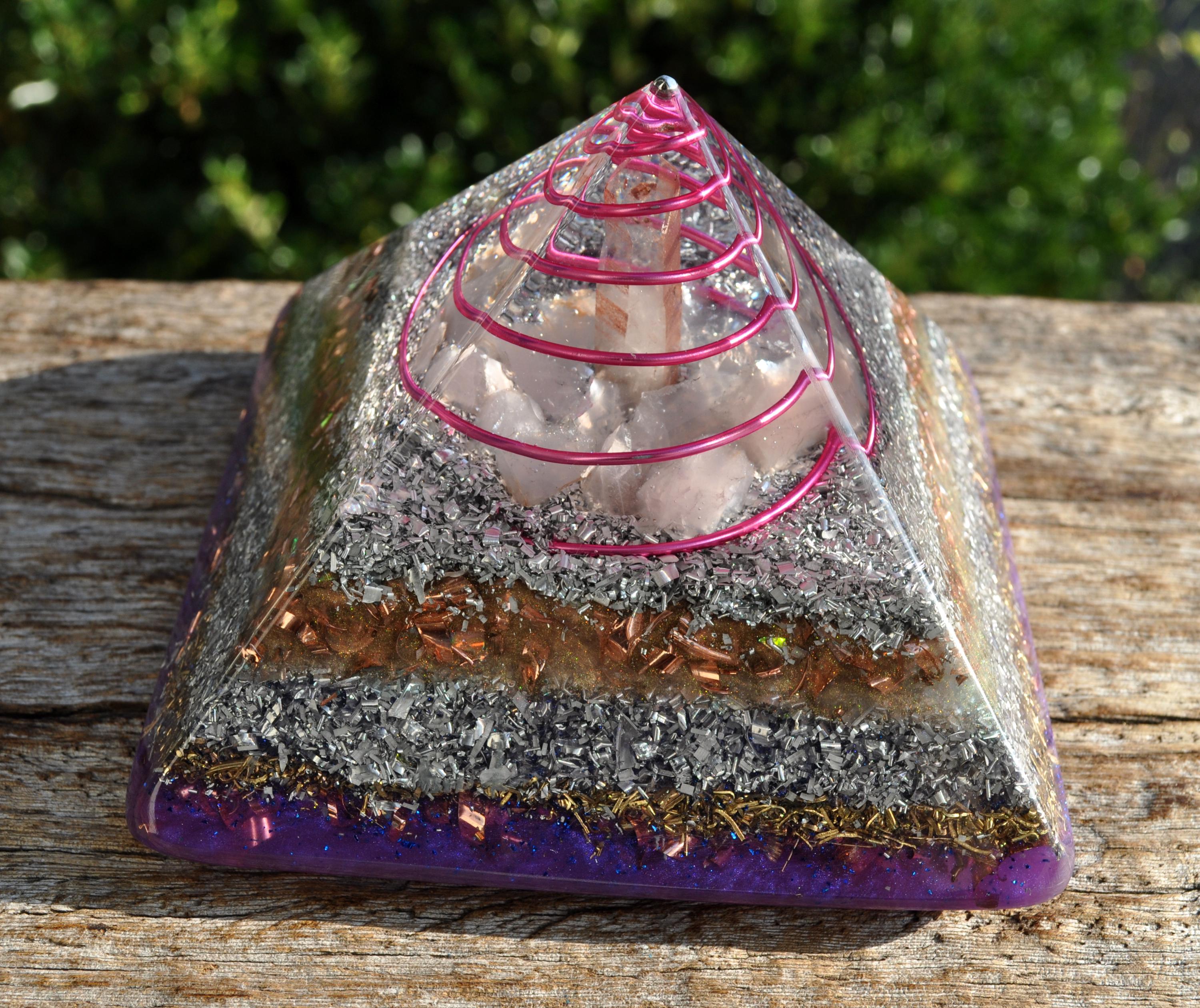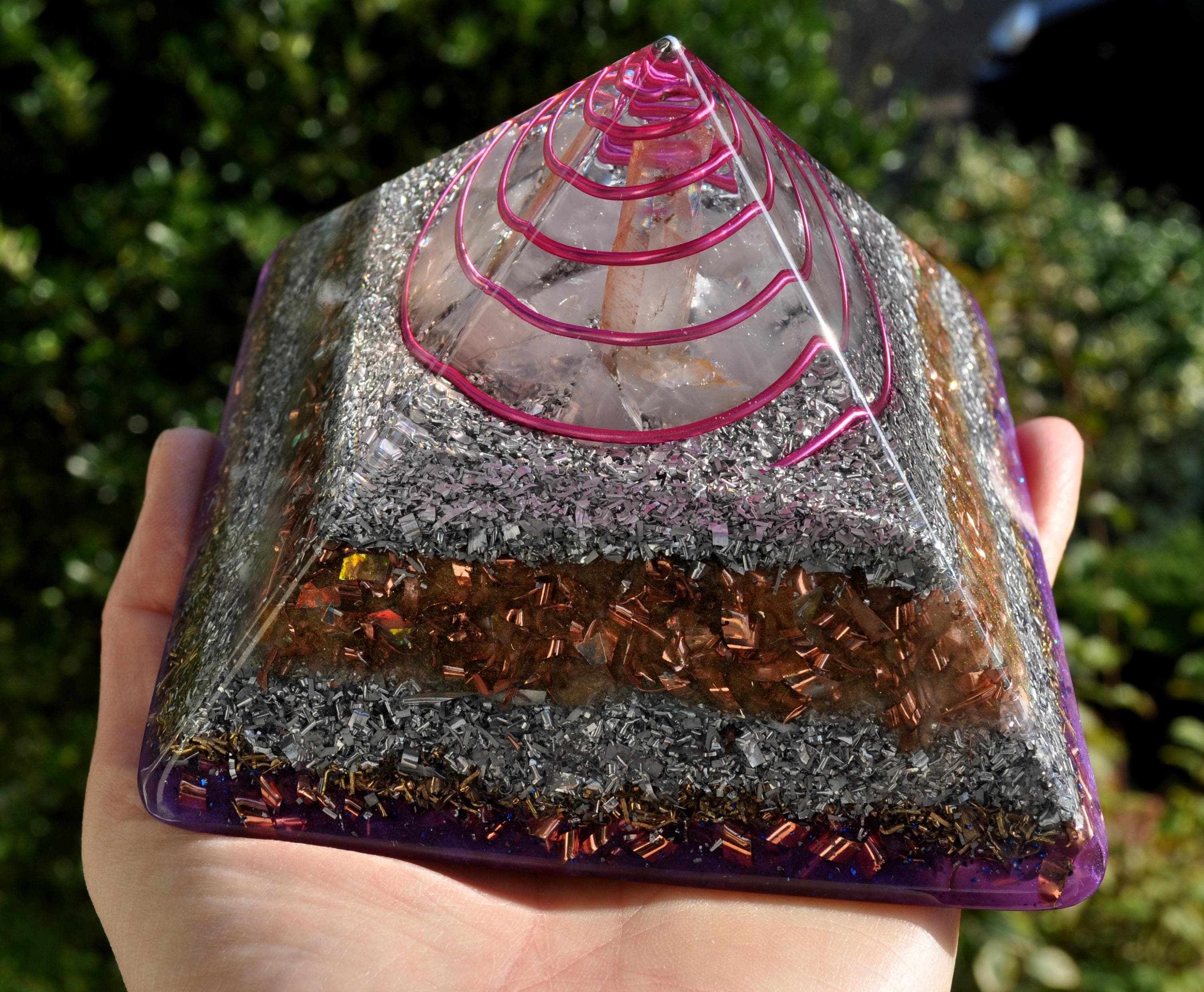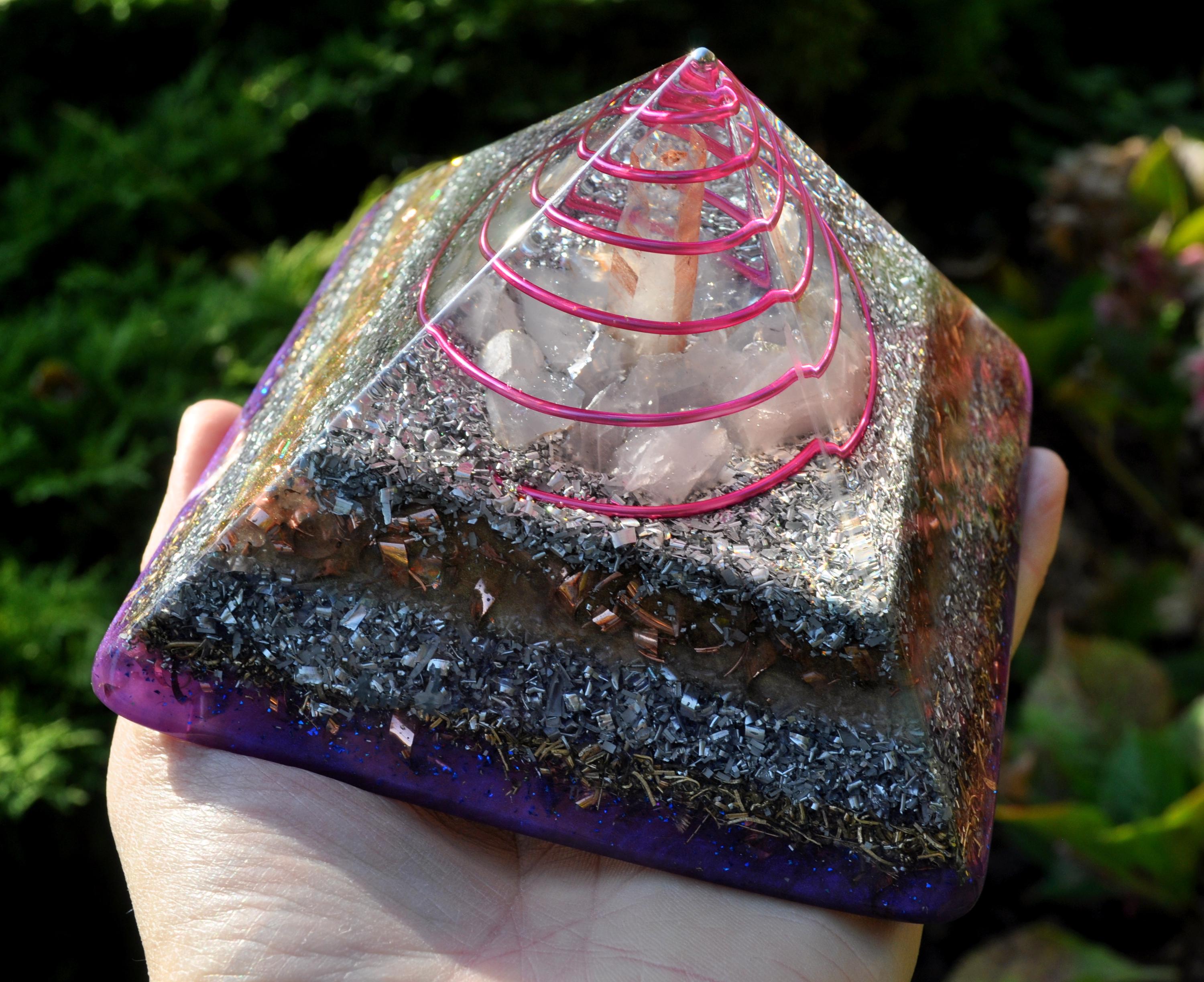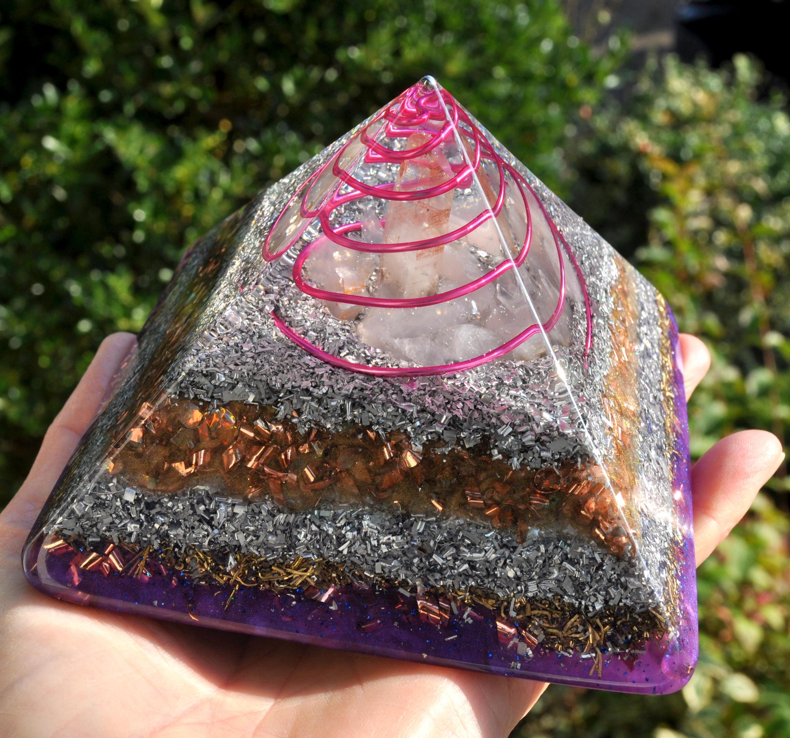 Handmade Orgonite® Giza Pyramid Golden Triangle Amethyst Rose Quartz Clear Quartz Shungite Black Tourmaline Decor