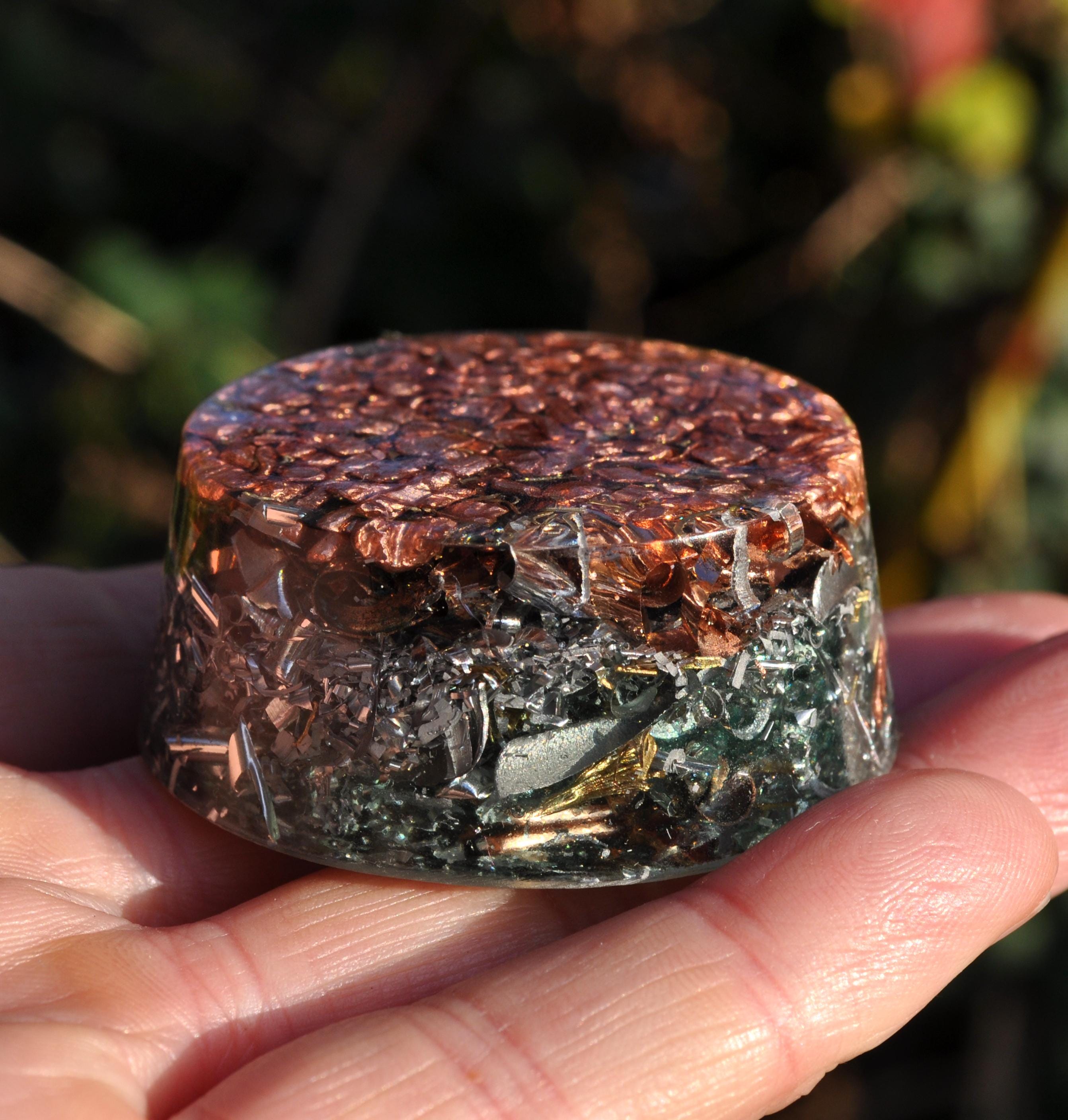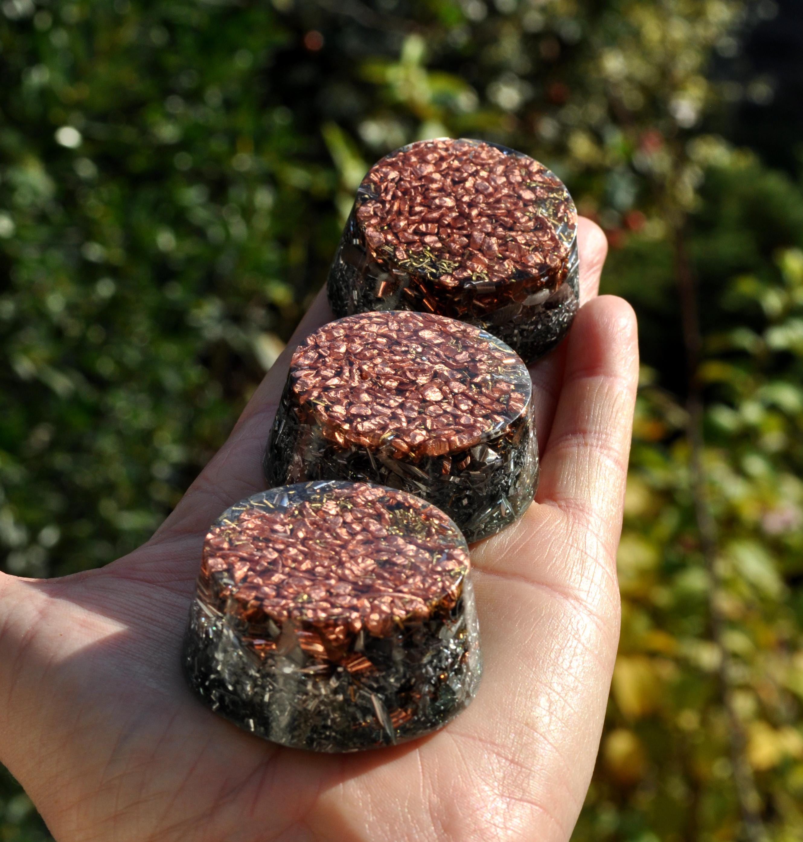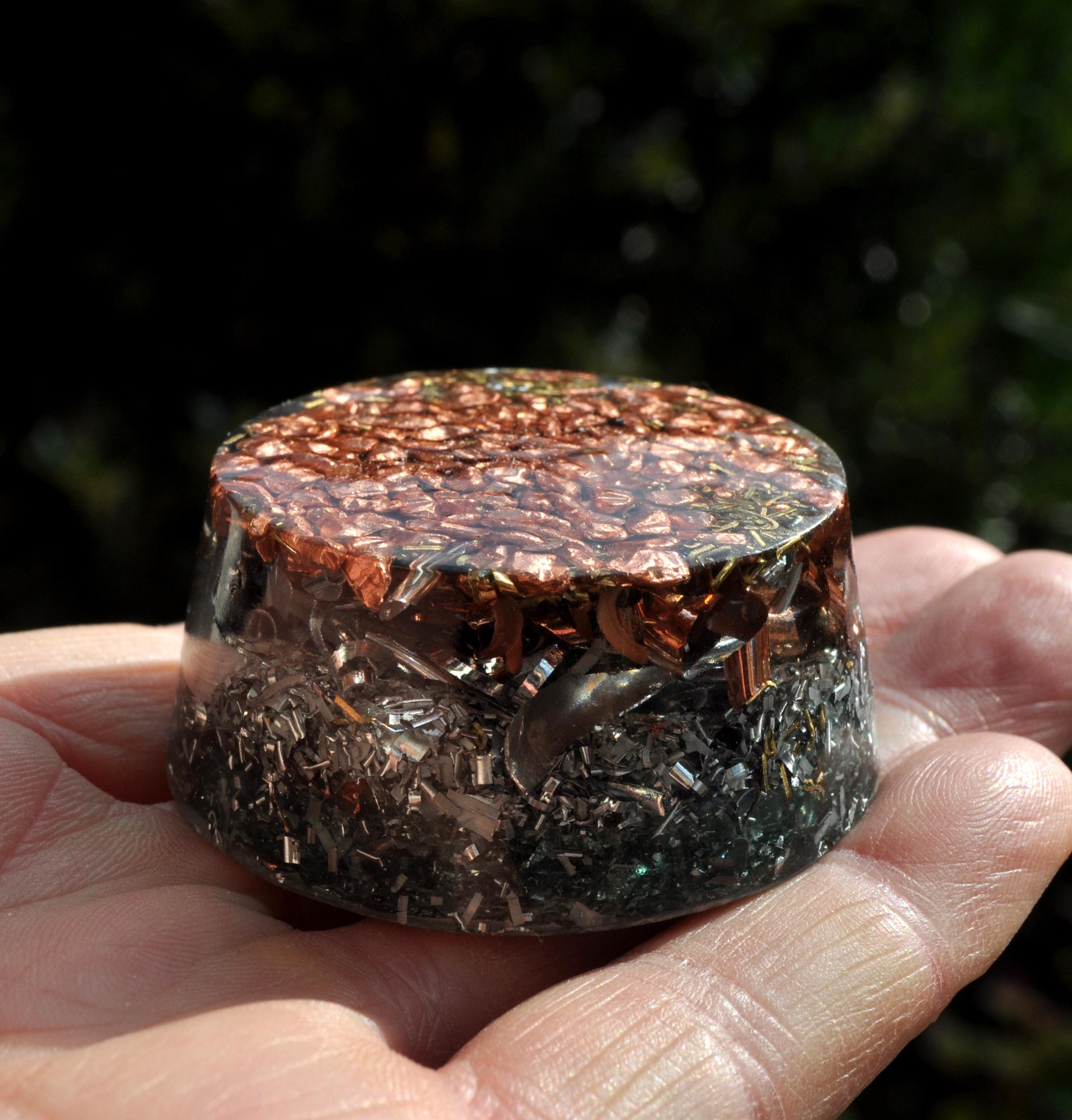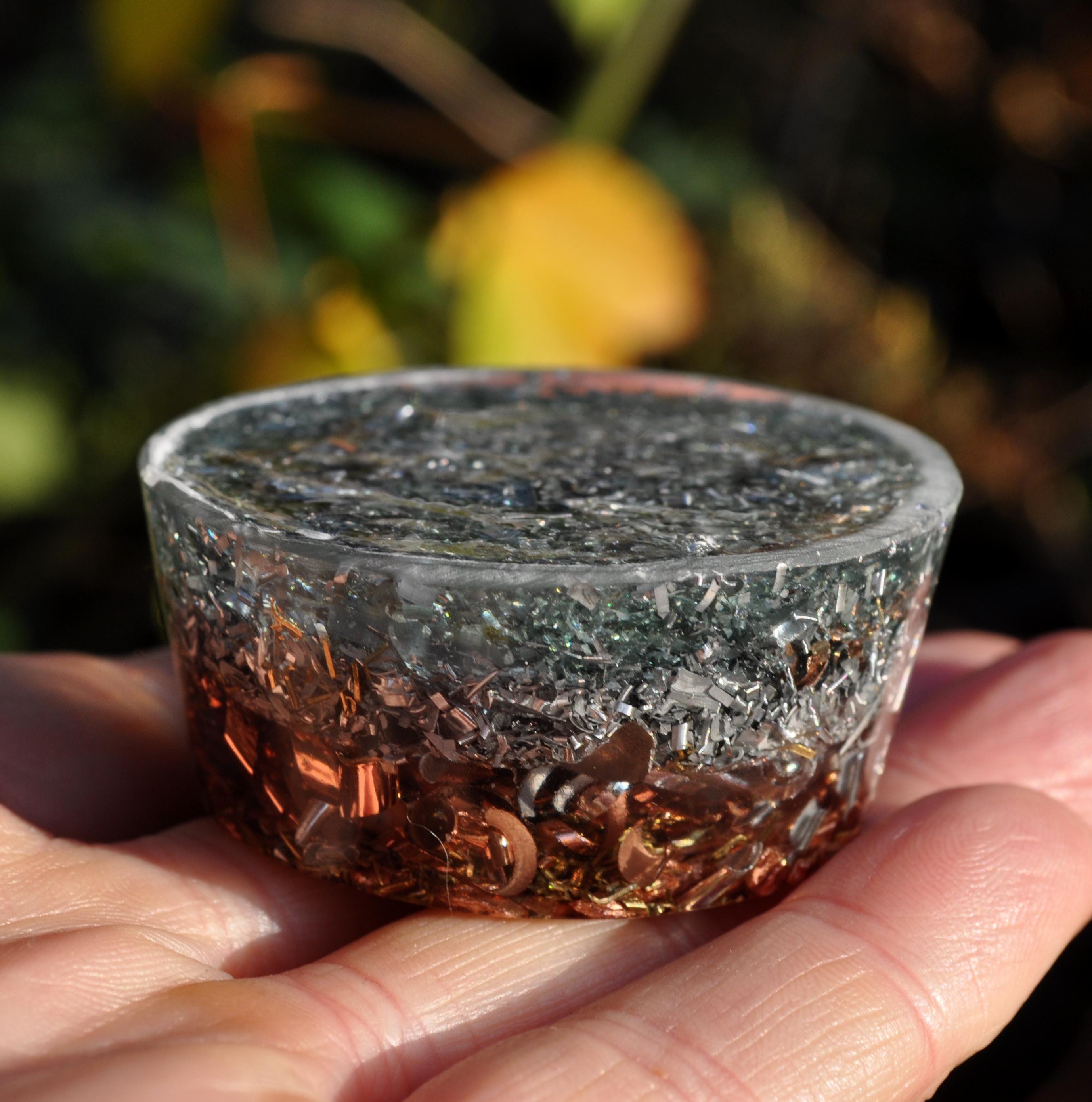 These handmade orgonite towerbusters are crafted in small batches in Eindhoven, Netherlands. The top layer features copper shavings, giving the piece a warm, high-quality appearance. Copper is often valued in orgonite builds for its strong conductivity and its ability to support smooth, balanced energy flow.