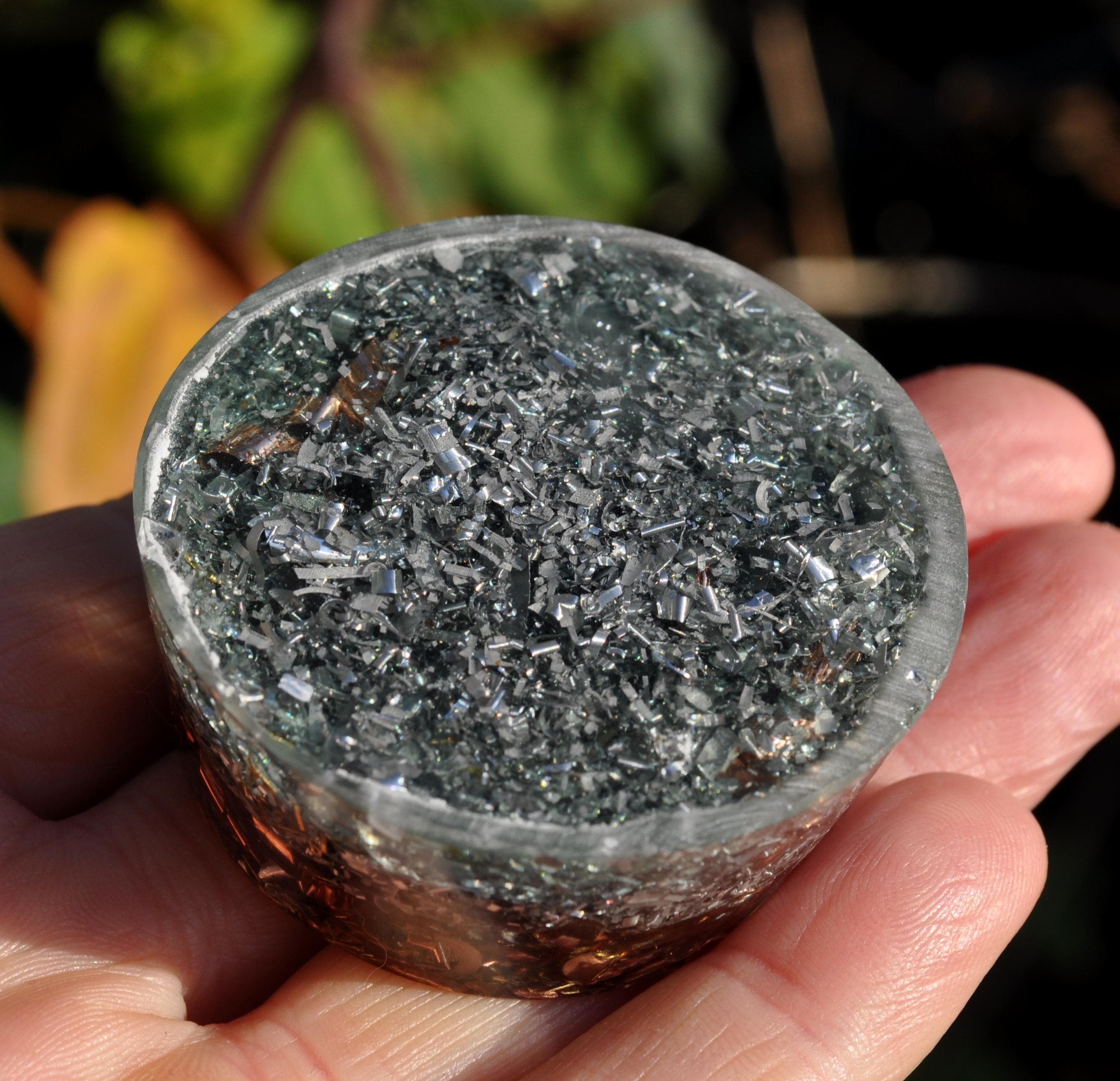 For a good orgonite you need a lot of metal shavings for it to work properly. The aluminum that is present in my orgonites is made of residual material and is therefore being recycled. It is a good conductor and cheaper and lighter than copper. In addition, aluminum offers effective protection against electromagnetic radiation, because the stronger a material conducts, the better the shielding ability is.