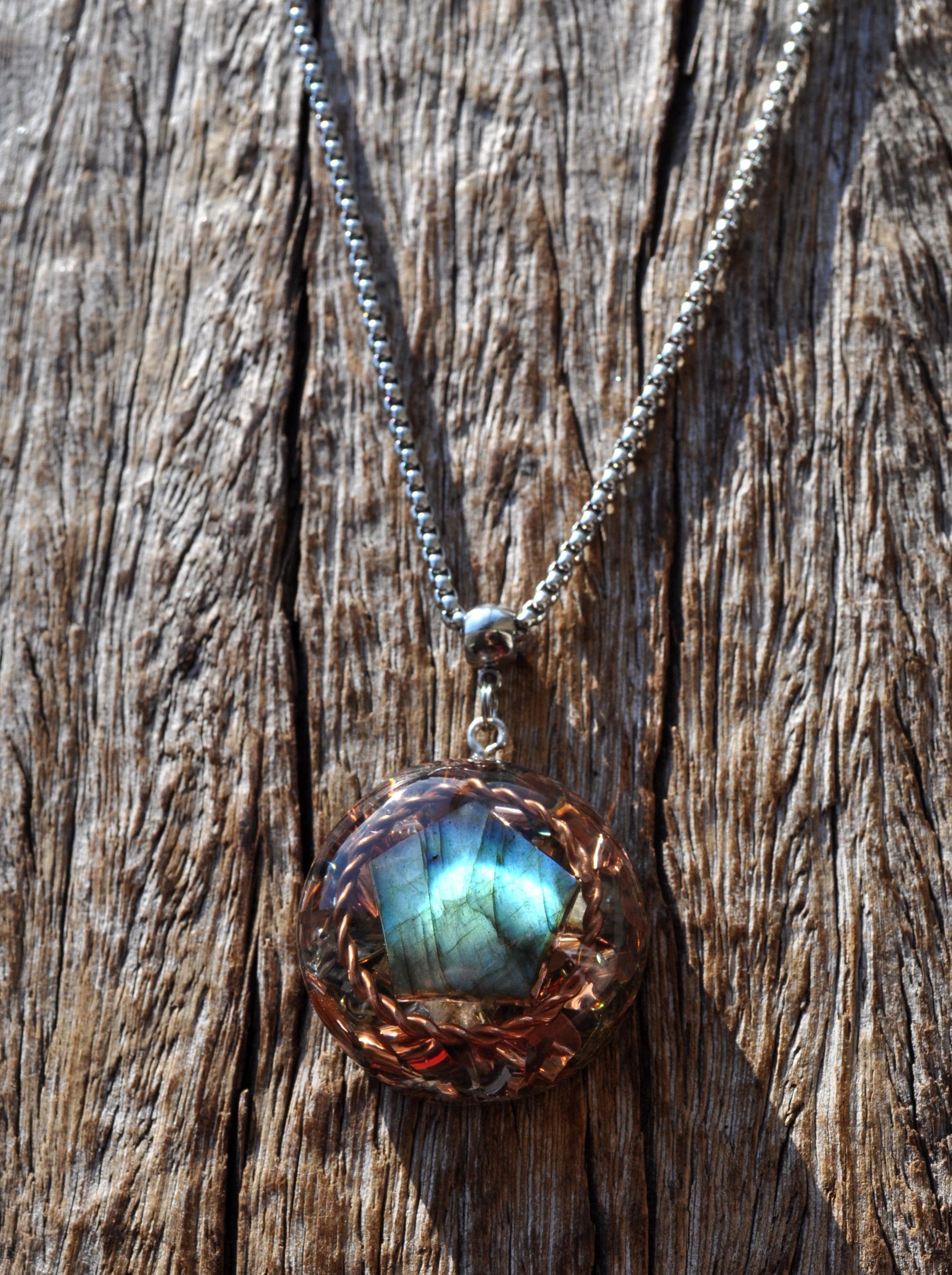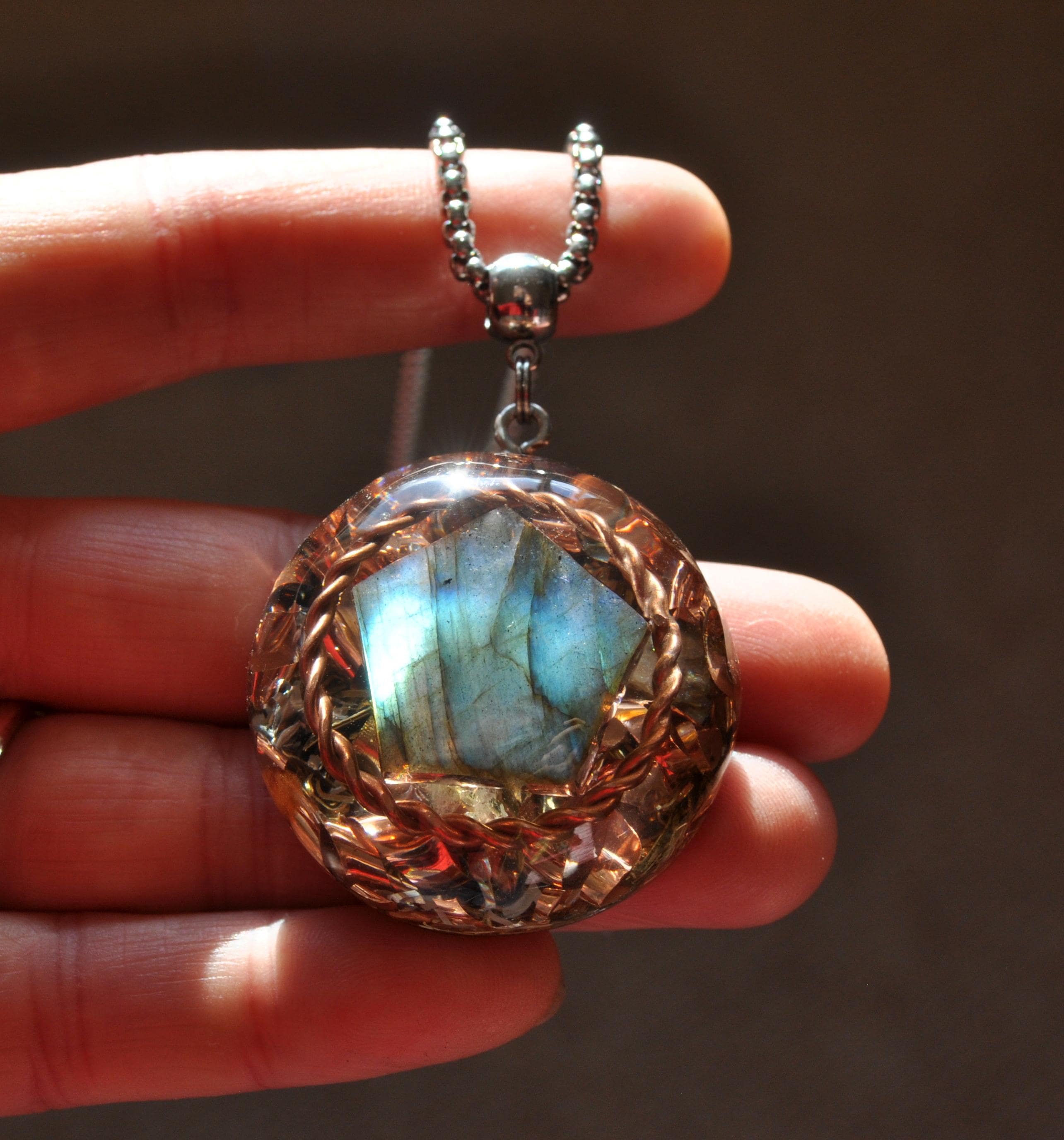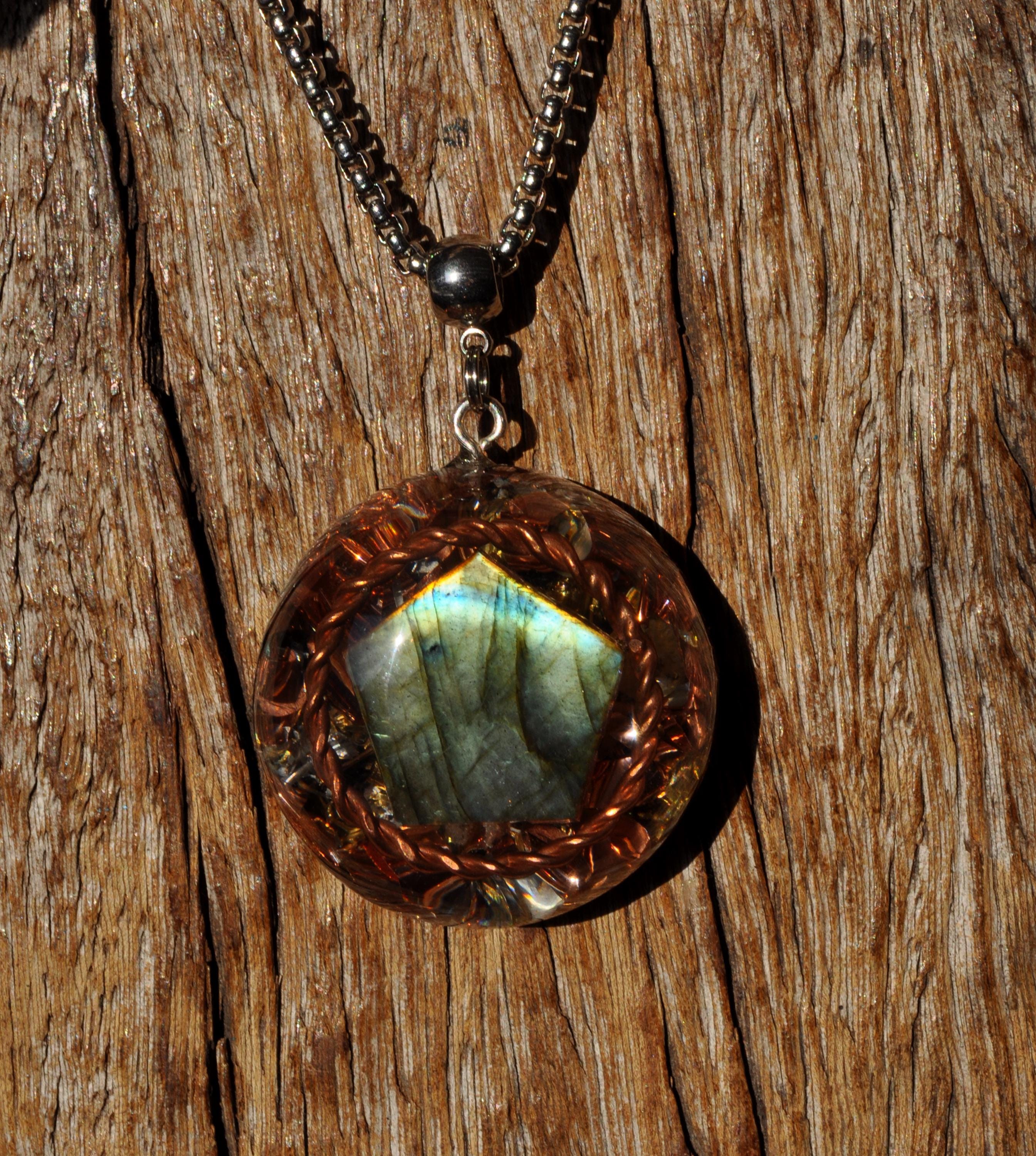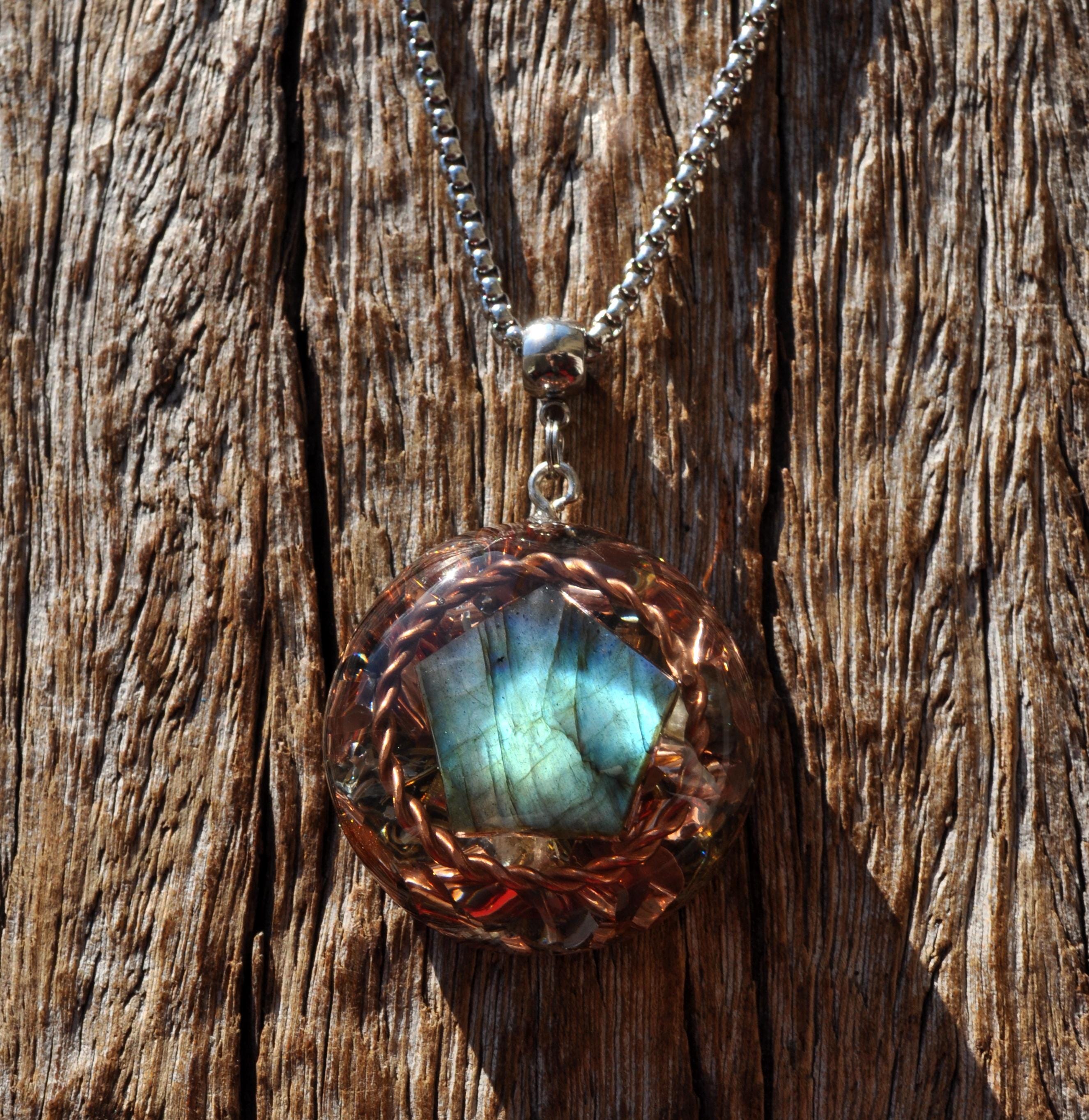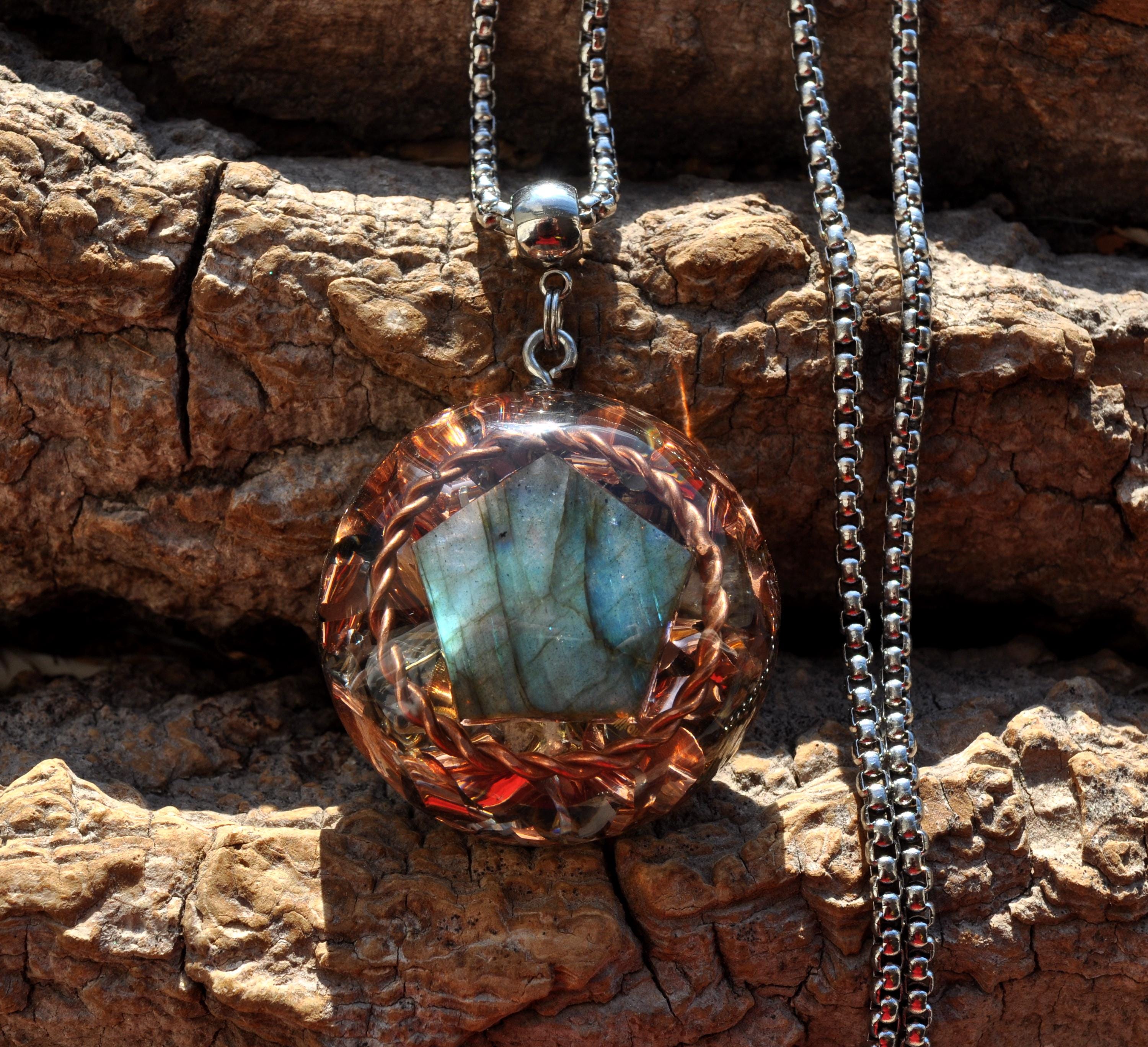 ✨ Orgonite Pendant with Copper Tensor Ring & Hexagonal Labradorite – Stainless Steel Necklace ✨