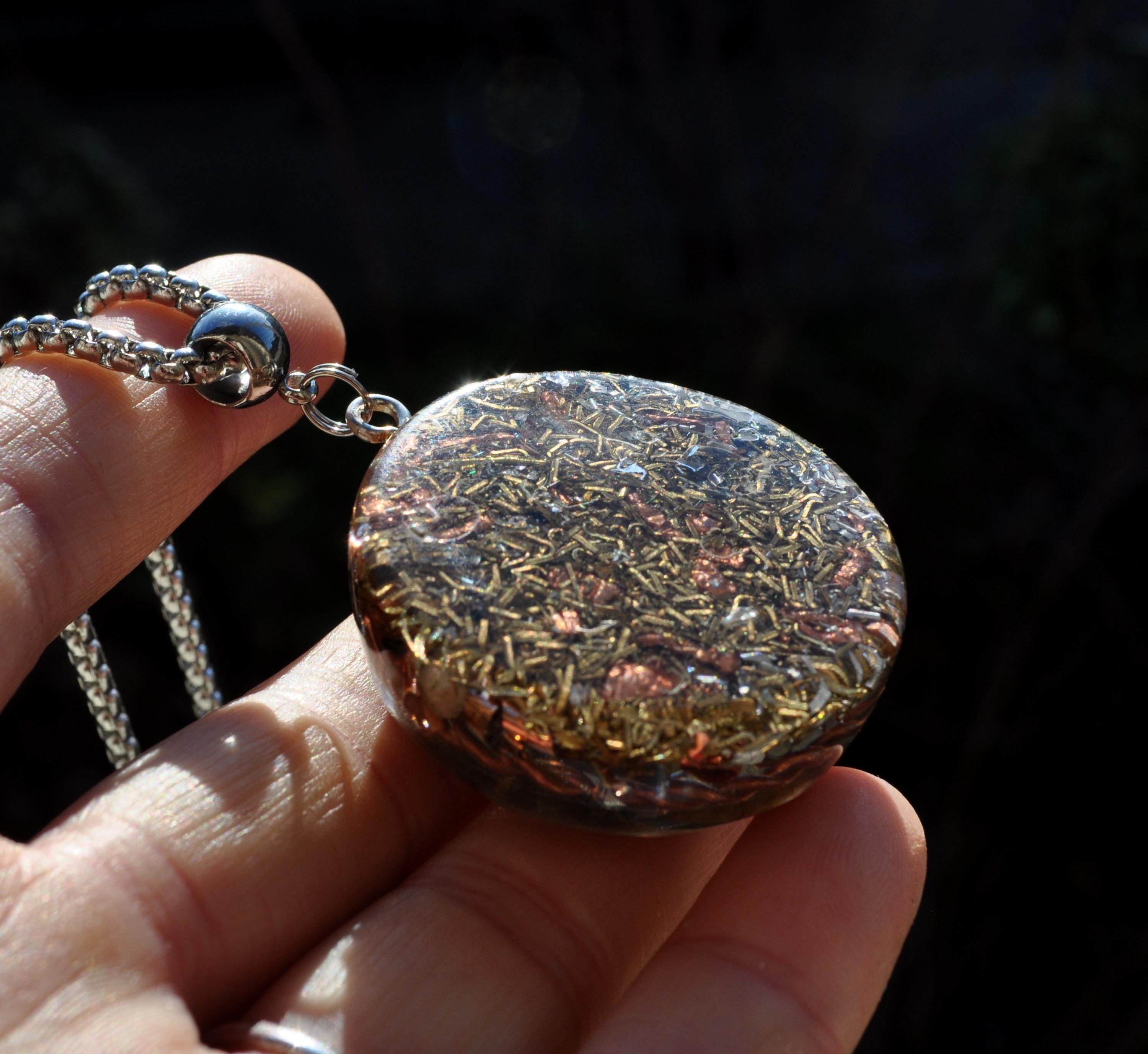 Experience the unique energy and symbolism of this orgonite pendant with a hand-crafted Copper Tensor Ring, designed with intention and care. This pendant is believed to support your spiritual journey, intuition, and energetic balance. It comes ready to wear on a sturdy stainless steel necklace with a secure lobster clasp.