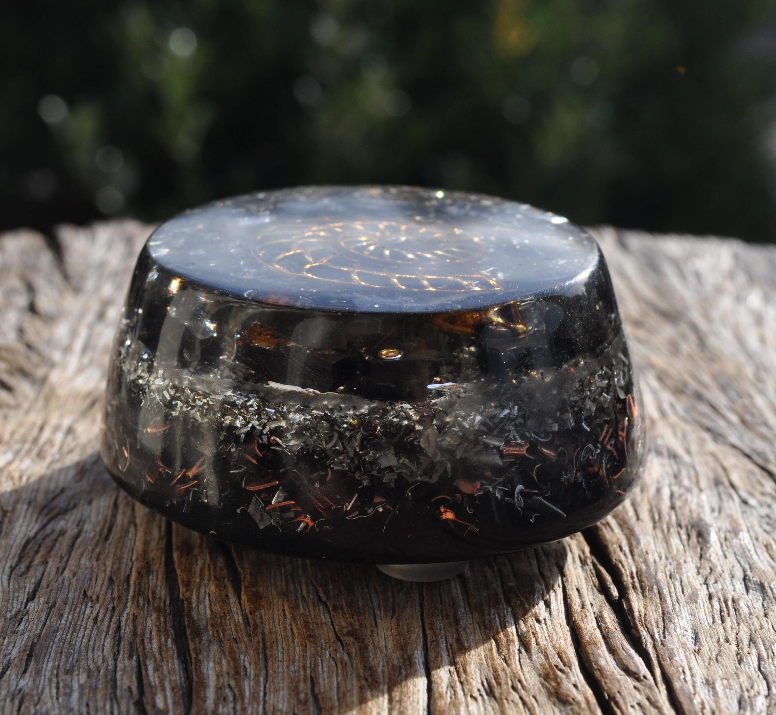 The orgonite blend includes aluminum, brass, bronze, and copper shavings, with Elite Shungite clearly visible near the top. Shungite is often chosen for orgonite pieces because of its long-standing association with grounding and EMF-related applications. Many people place orgonite near electronics, workspaces, or living areas as part of a balanced environment.