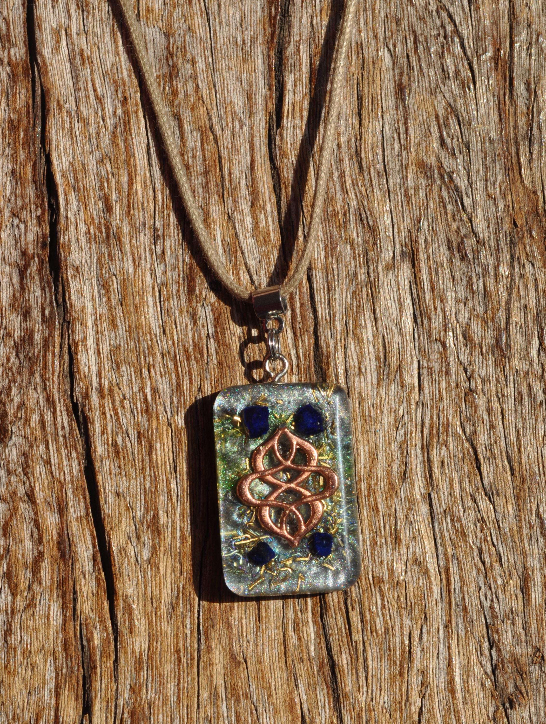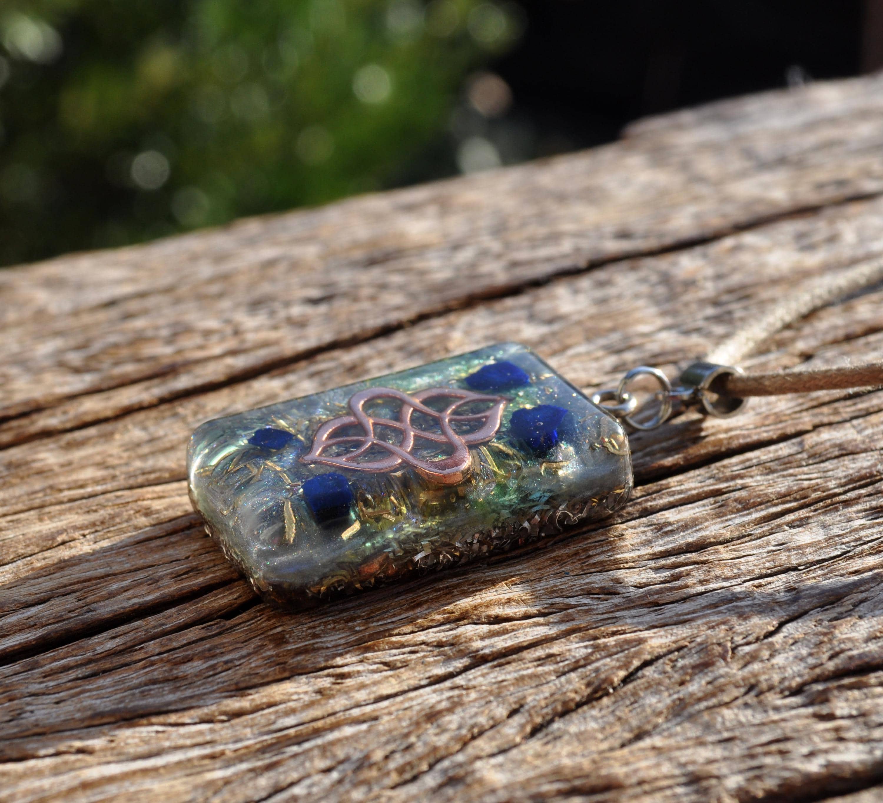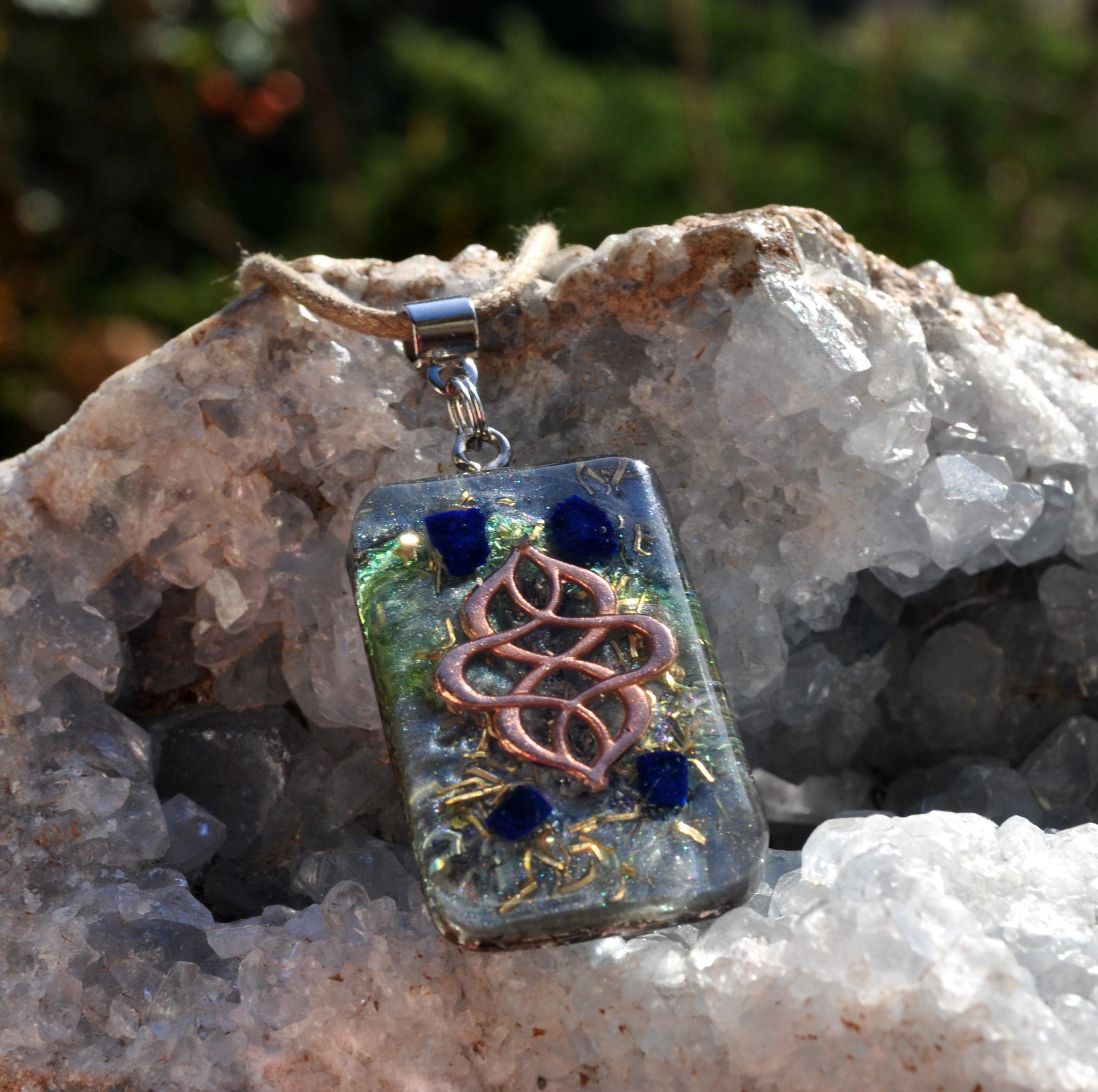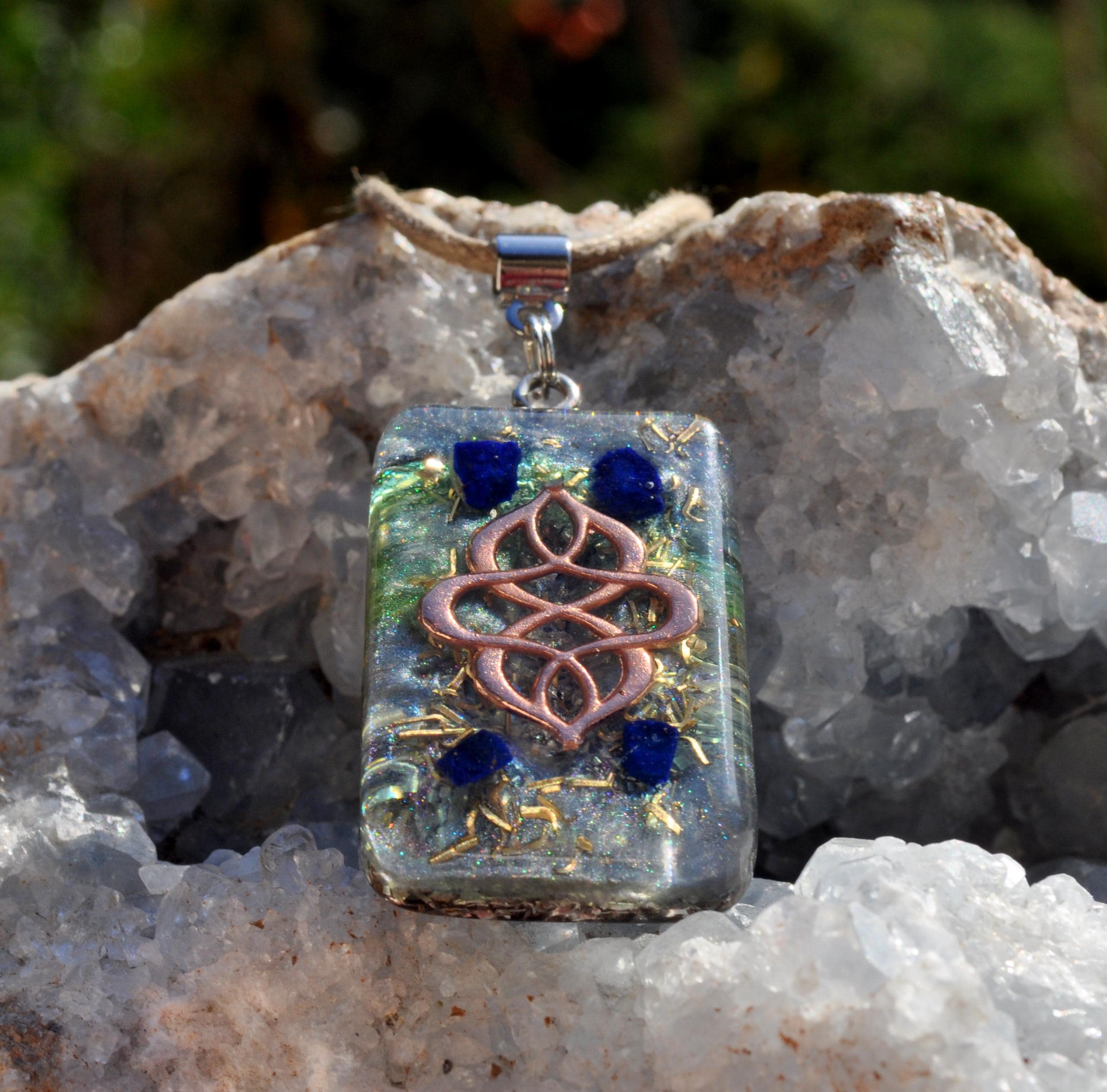 Handmade Rectangular Orgonite® Pendant with Raw Azurite & Rose Gold Detail