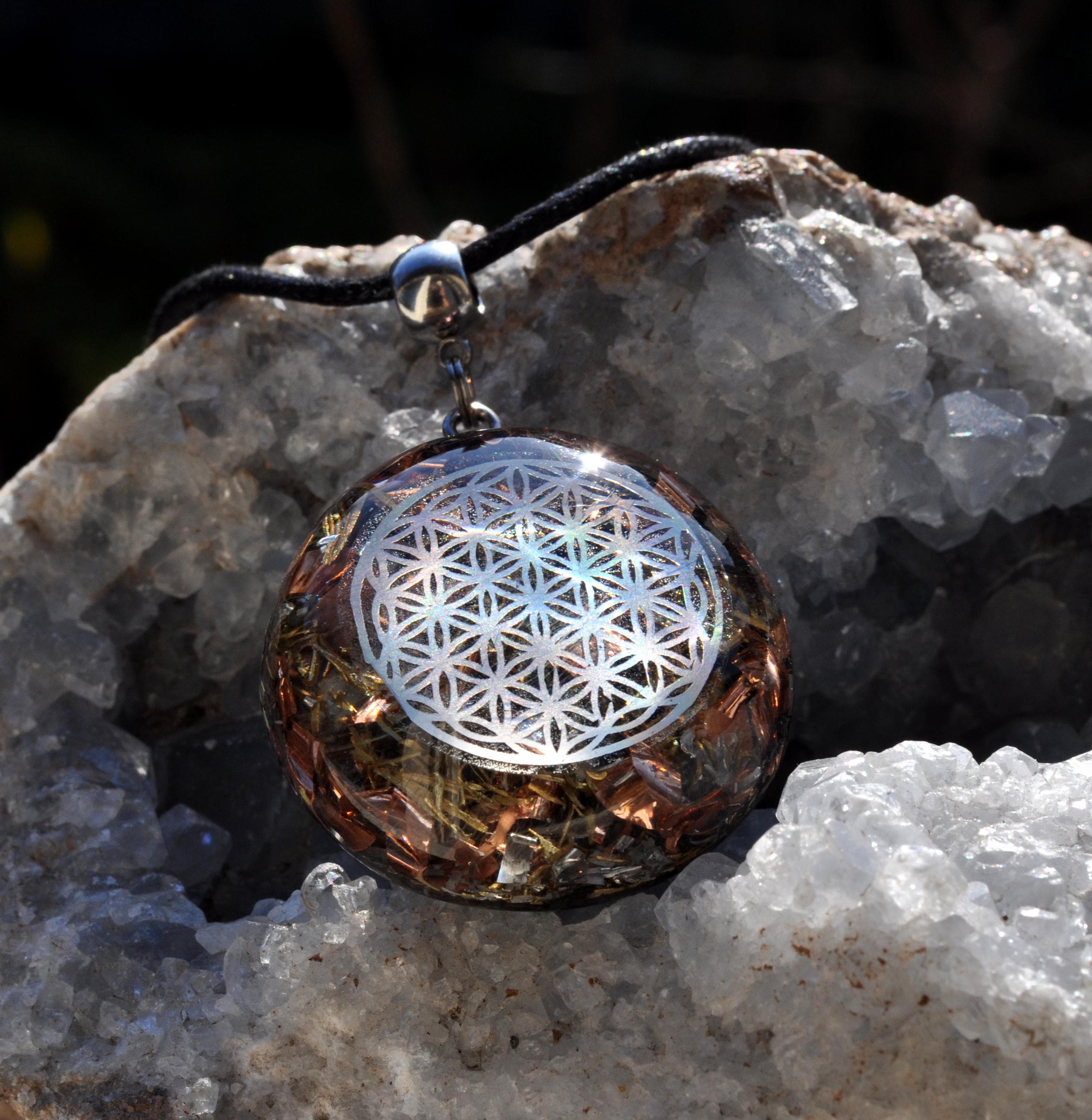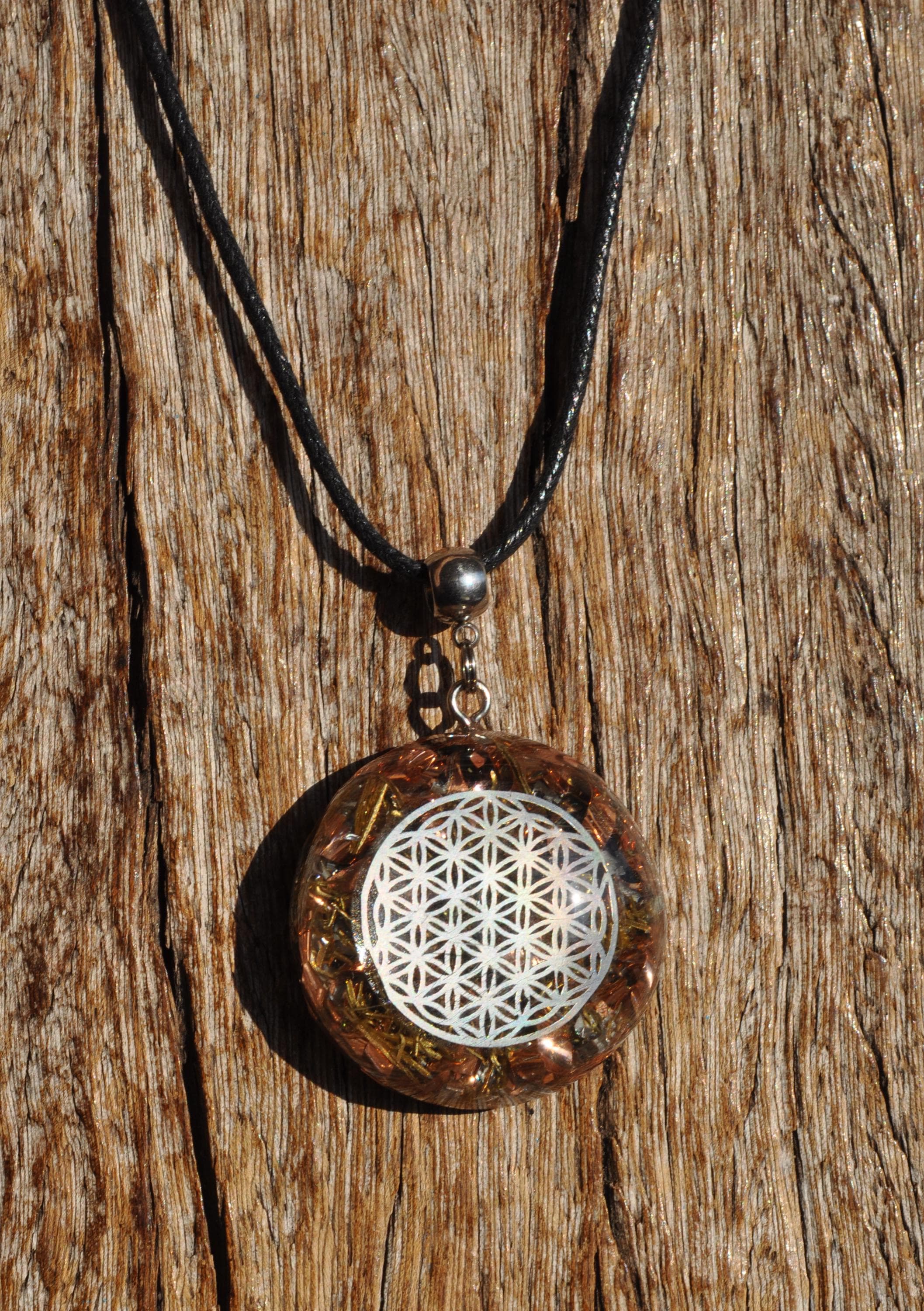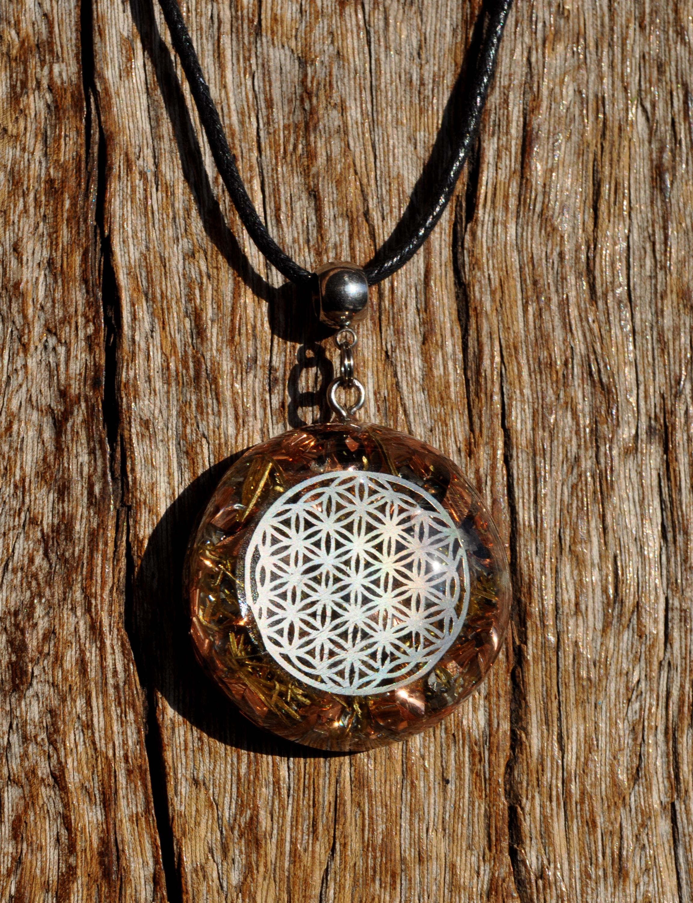 This handmade Orgonite pendant features a Flower of Life symbol set in a clear, transparent resin dome so you can easily see the metal shavings inside (mainly copper and brass). The pendant is hand-shaped and hand-polished for a smooth, glass-like finish and comes on an adjustable cotton cord for comfortable daily wear.