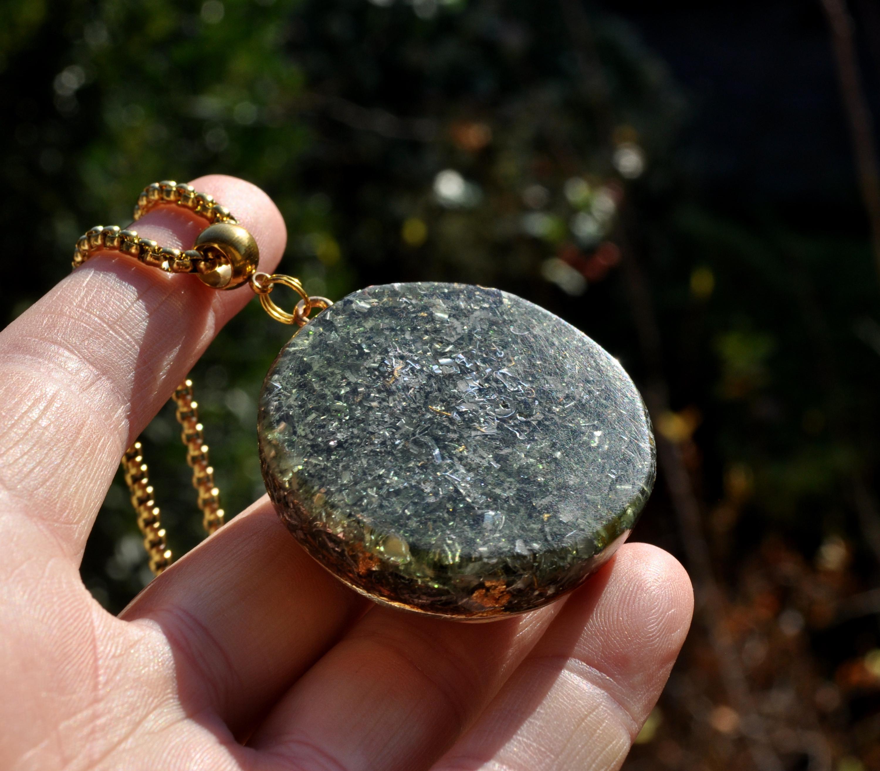 This 4.2 cm / 1.65" in diameter Orgonite® pendant features a rare large gemmy Chrome Diopside which you can see in the front and is surrounded with 24k leaf Gold. It furthermore consists of Rose Quartz (love, self-love), black Tourmaline (protects and grounds excess energy), Elite Shungite (protect), Pyrite (to enhance and protect), Rhodizite (to amplify), Selenite (to clear and charge) and a terminated clear quartz (for piezo-electric effect) all within a durable resin setting.