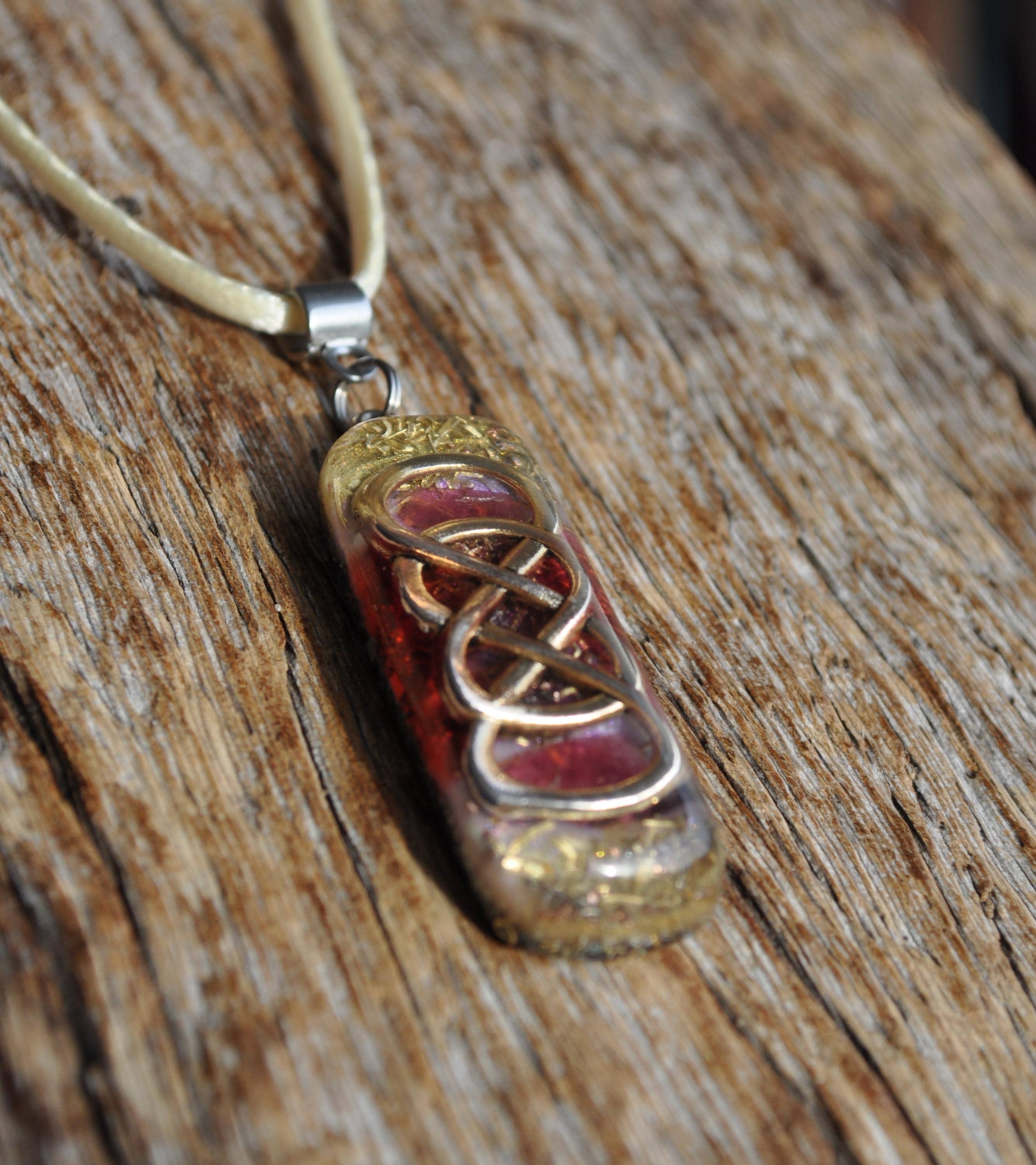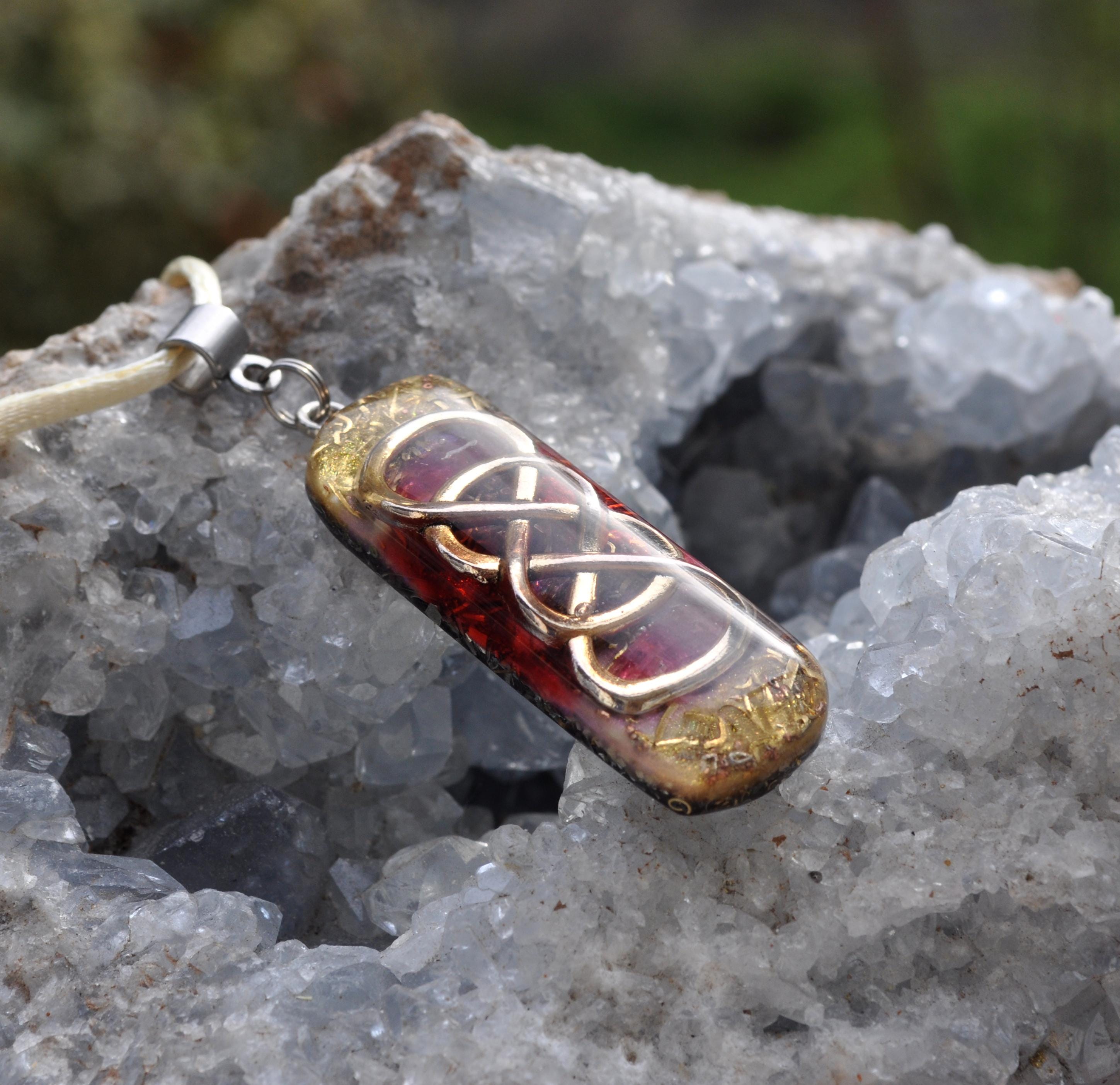 Orgonite® transforms stagnant or negative energy into positive energy. The resin and metal combination “scrubs” energy, while embedded quartz crystals enhance the pendant’s protective and balancing properties.