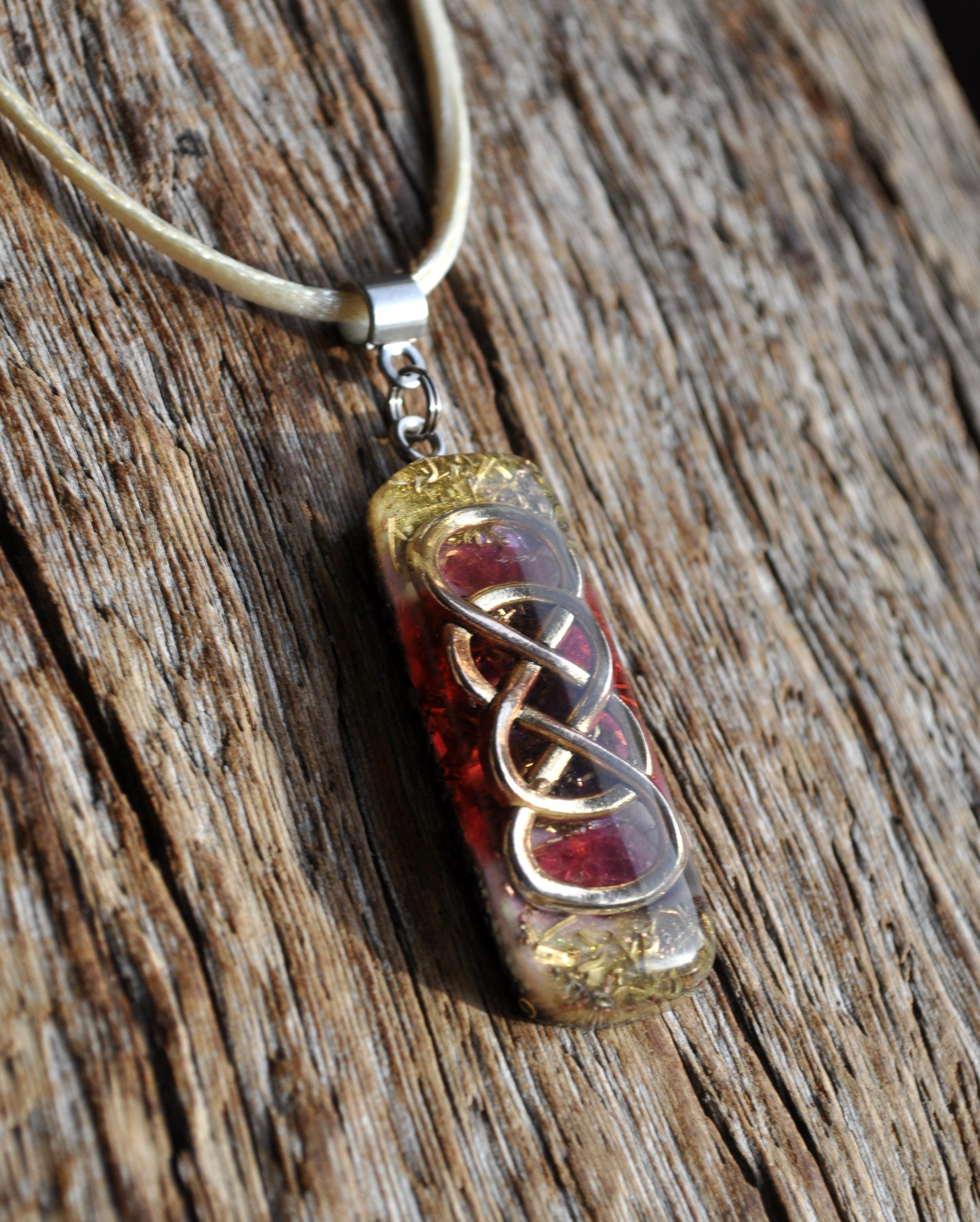 The pendant’s multicolor resin showcases pink, red, and golden hues, beautifully highlighting the crystals and the stainless steel Double Infinity charm. This unique combination creates a talisman for love, harmony, and energetic protection.