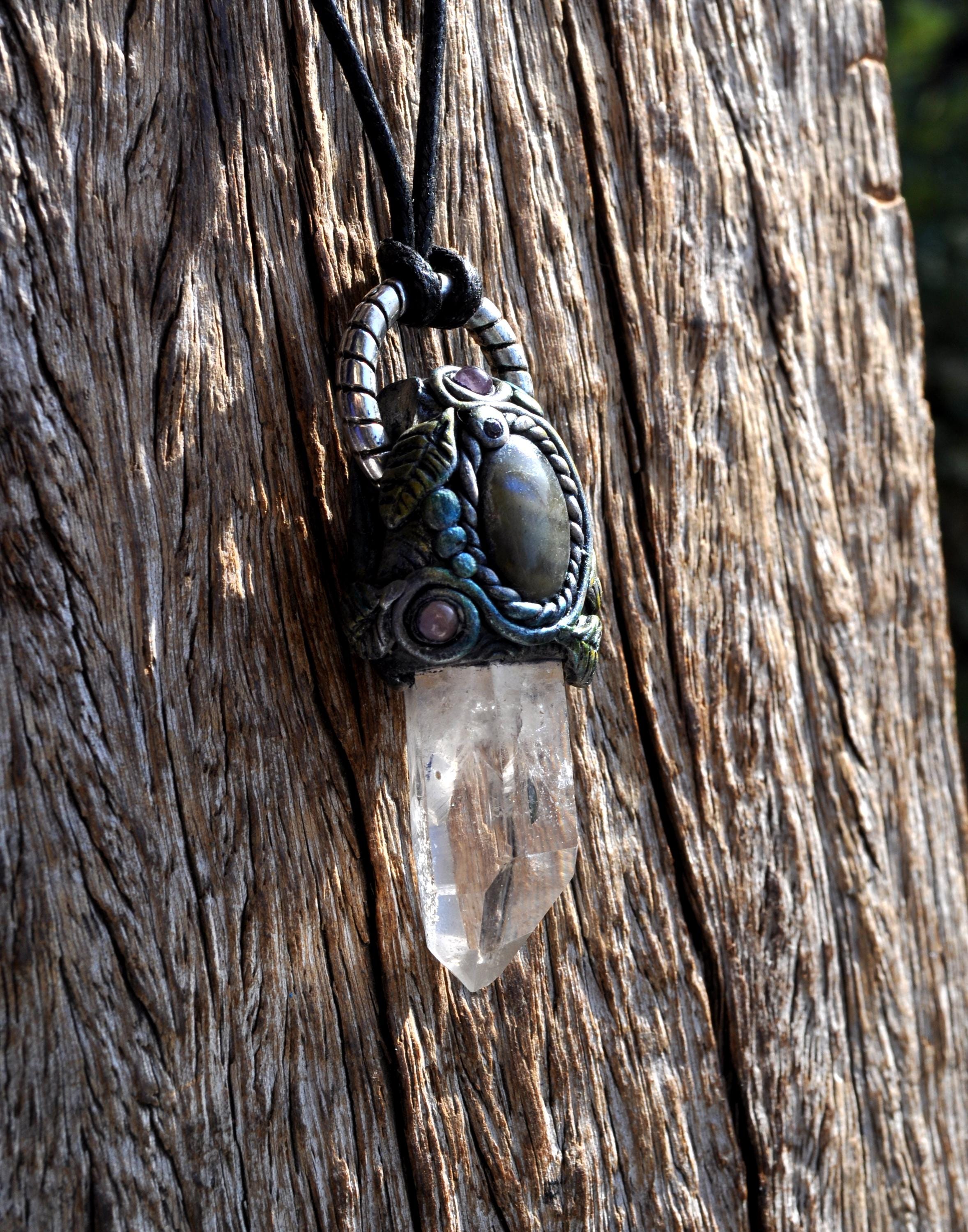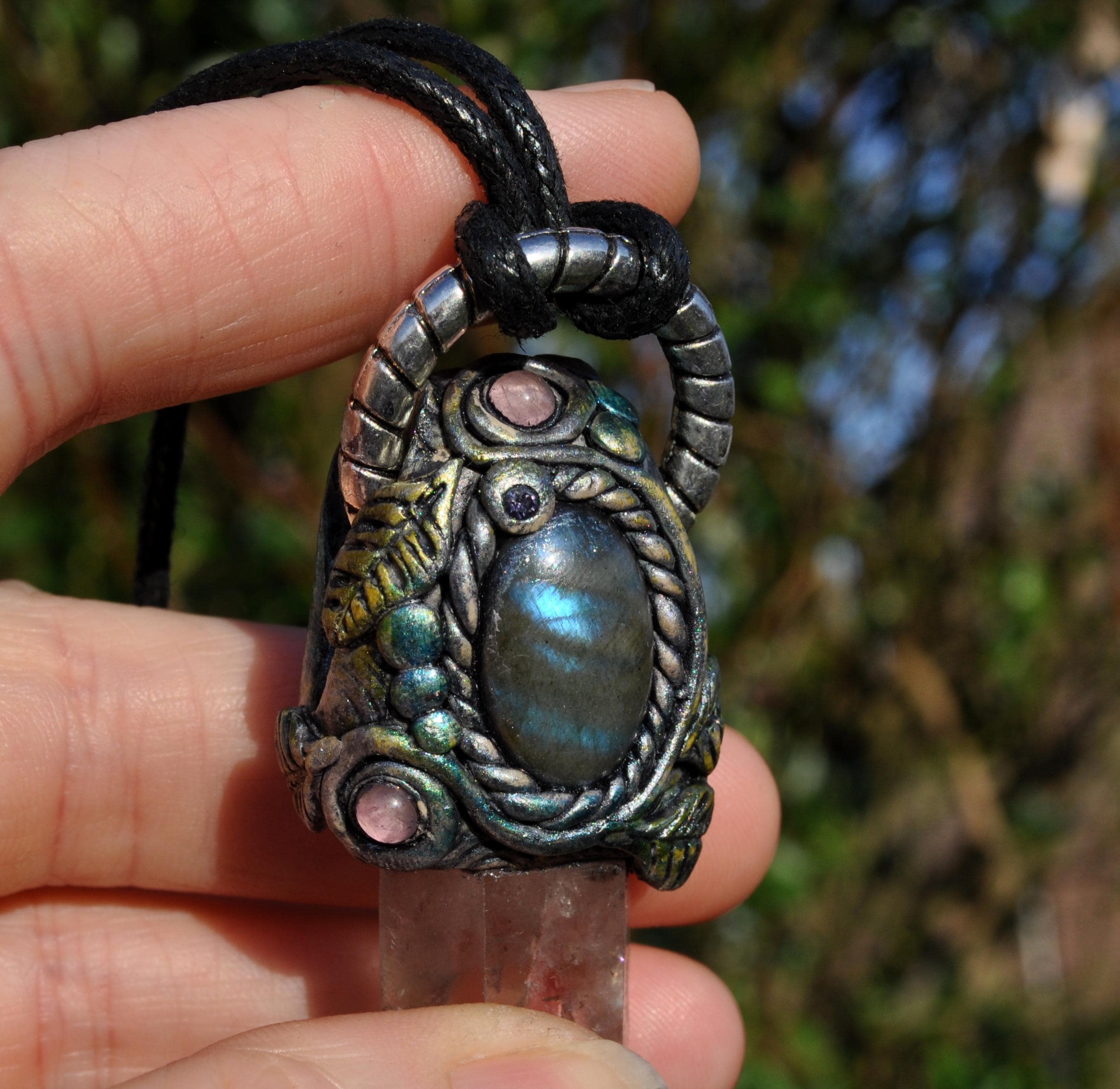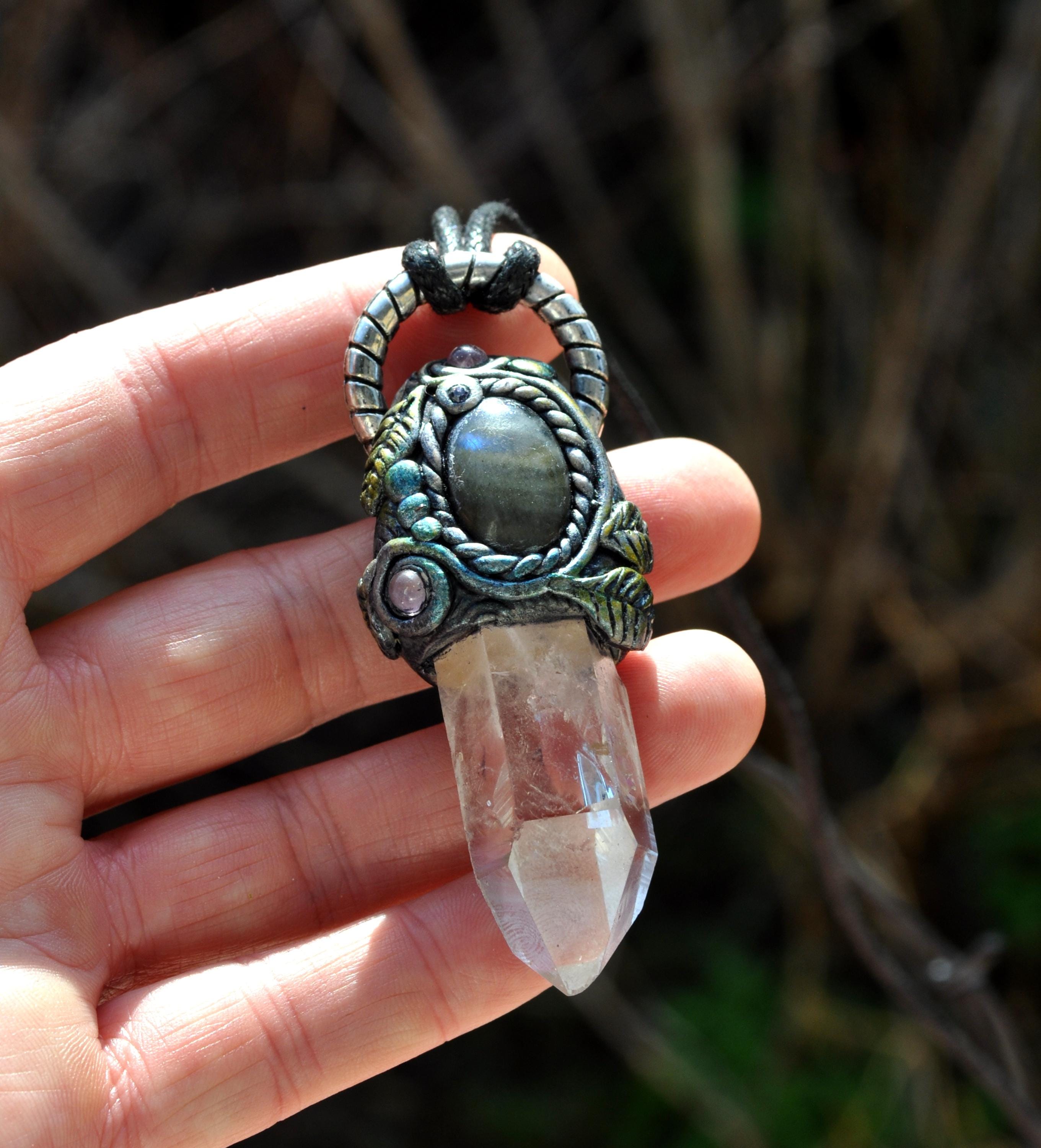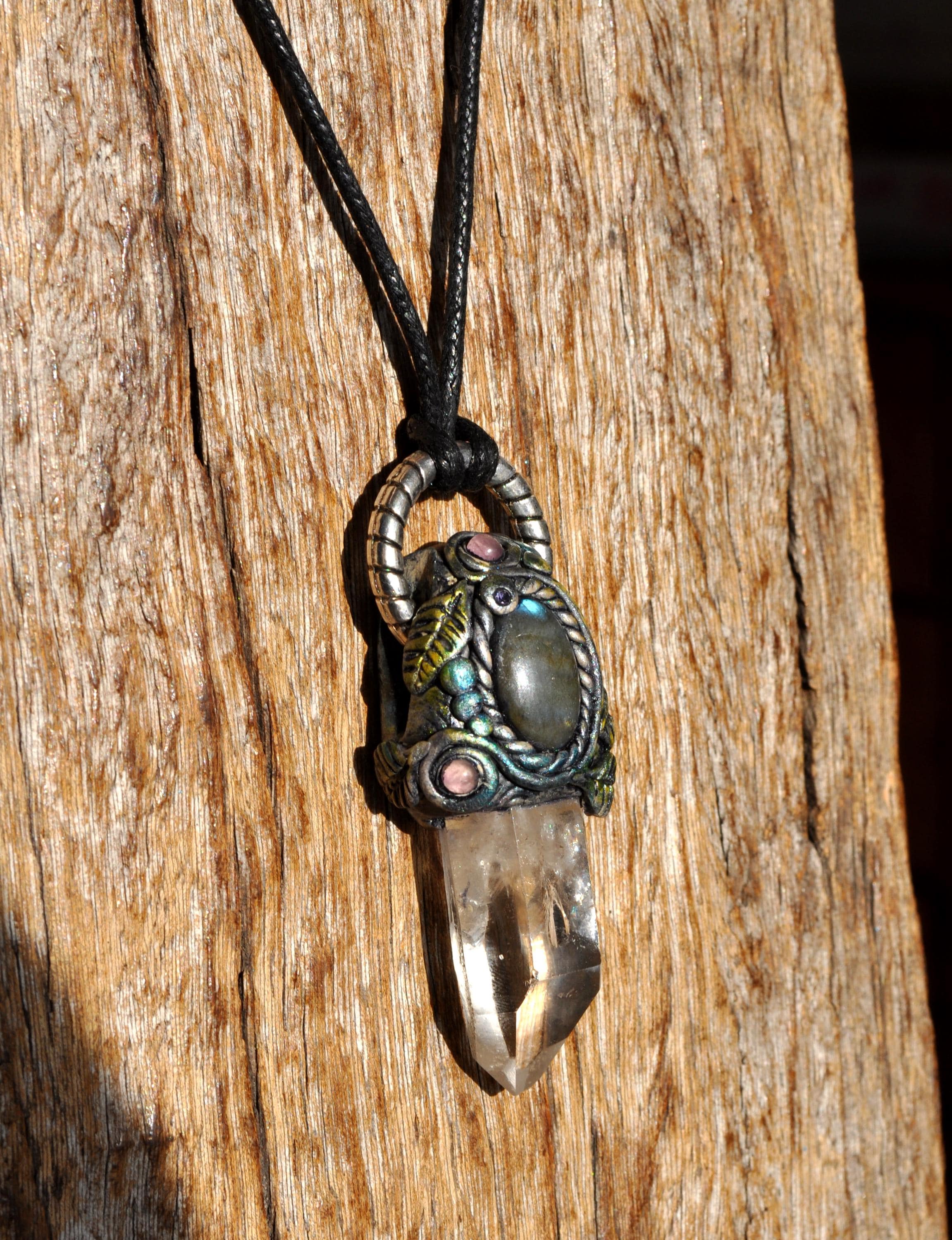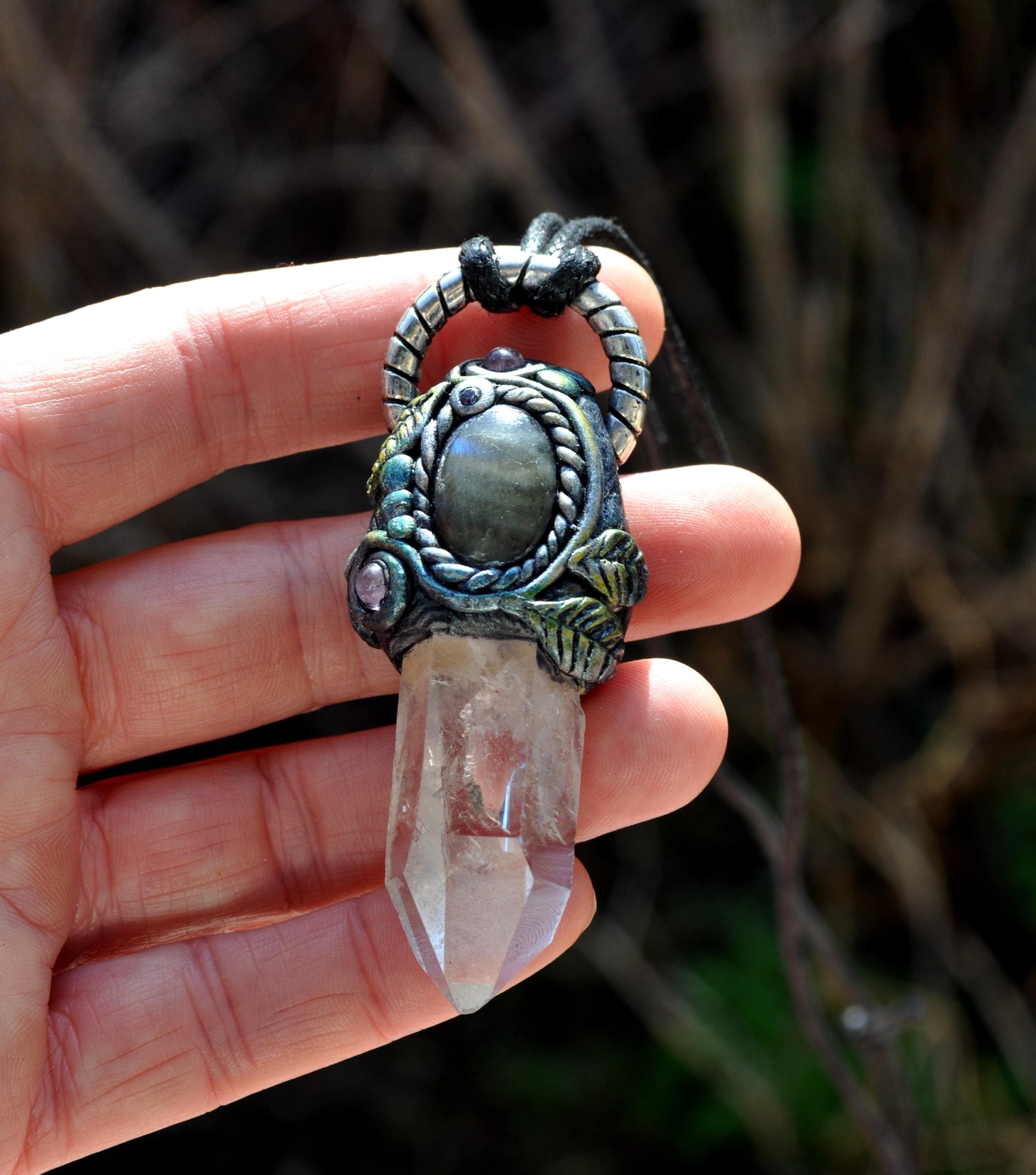 This unique pendant features a natural, terminated Clear Quartz point from Minas Gerais topped with a polished Labradorite and accented with two small Rose Quartz crystals. The setting is hand-sculpted and hand-painted from air-dry clay that cures into a strong and durable finish. Comes on a strong, adjustable cord.