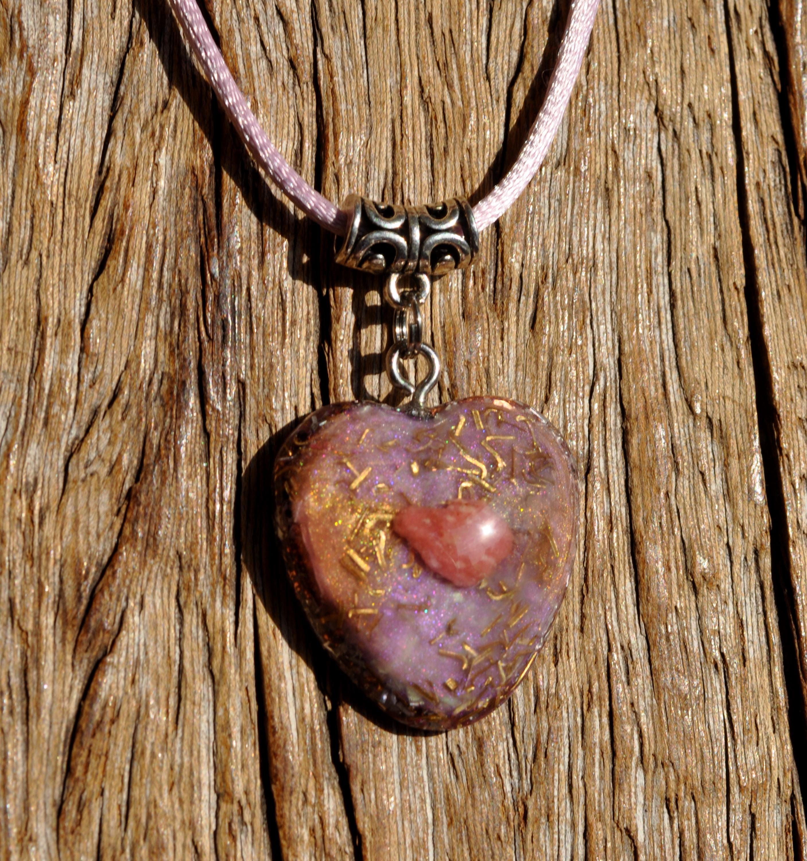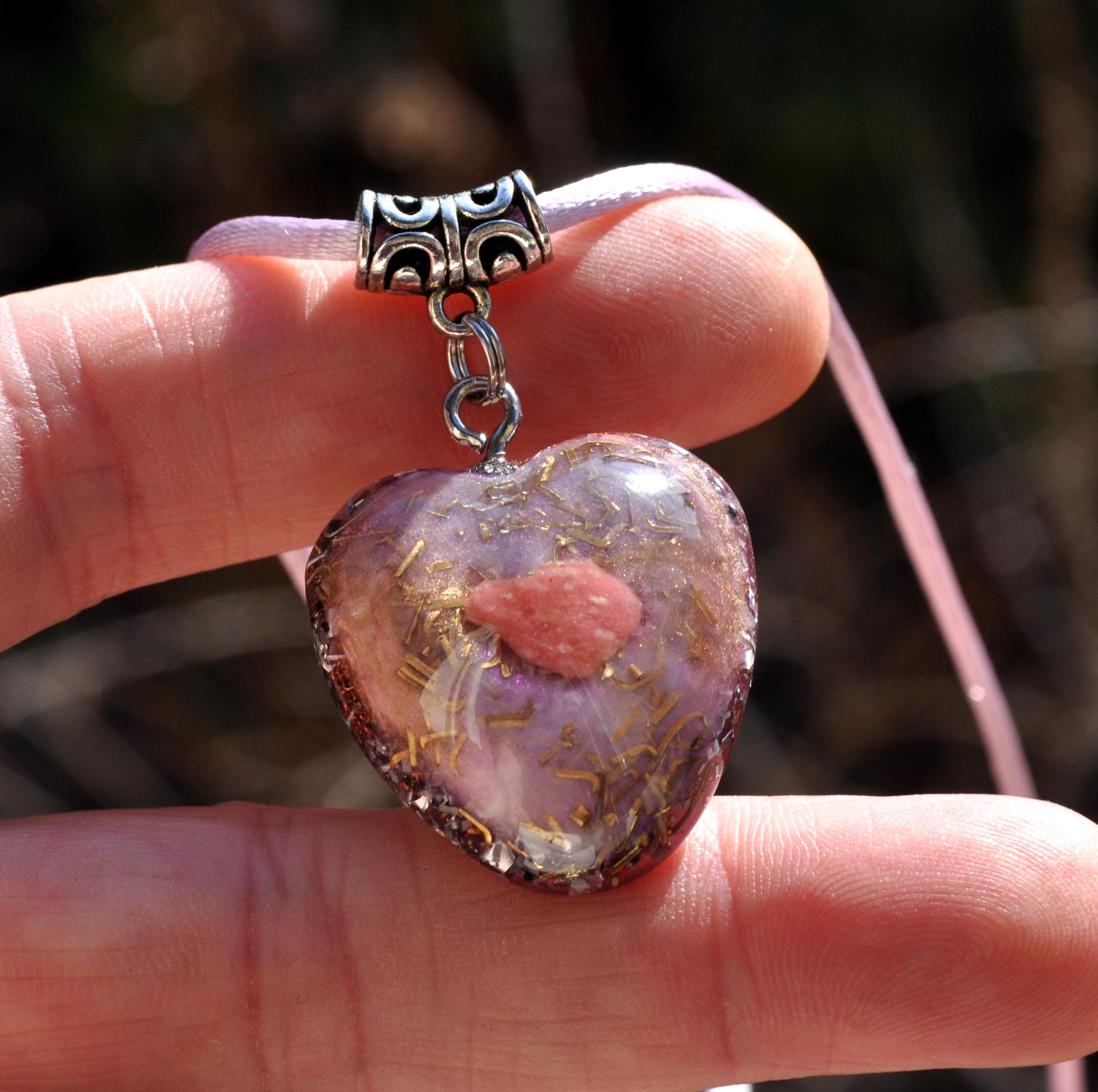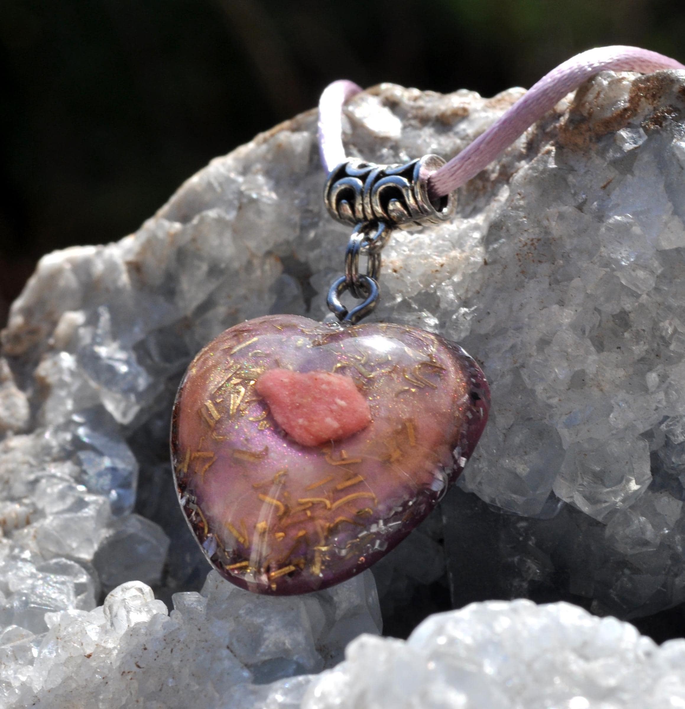 Heart-Shaped Orgonite® Pendant with Thulite, Black Tourmaline, Selenite & Clear Quartz – Handmade Crystal Jewelry