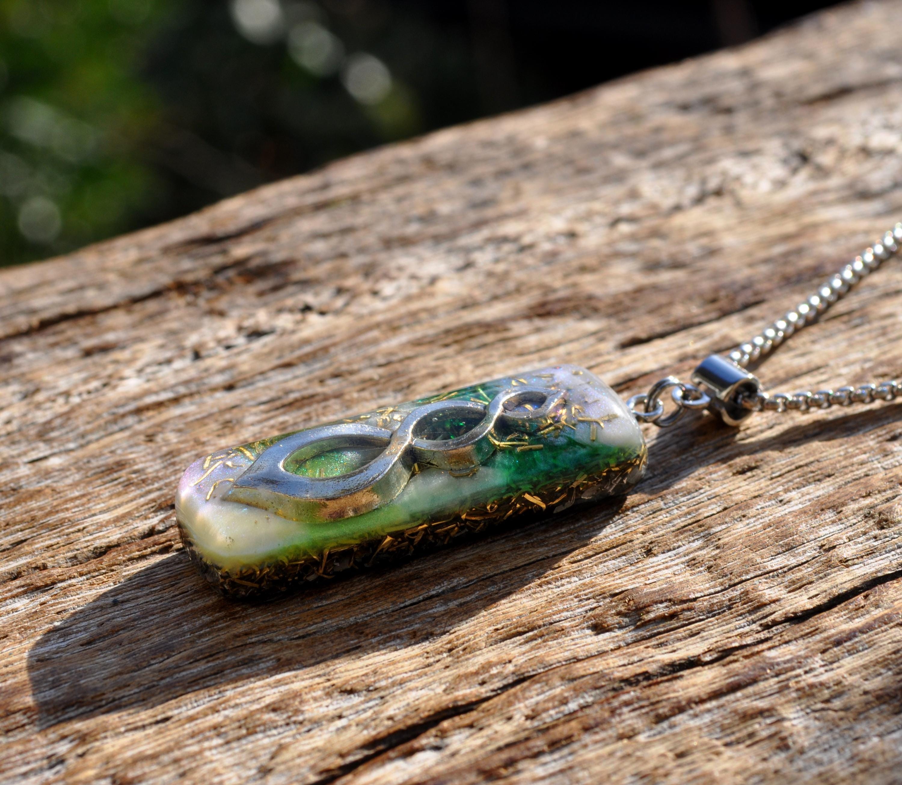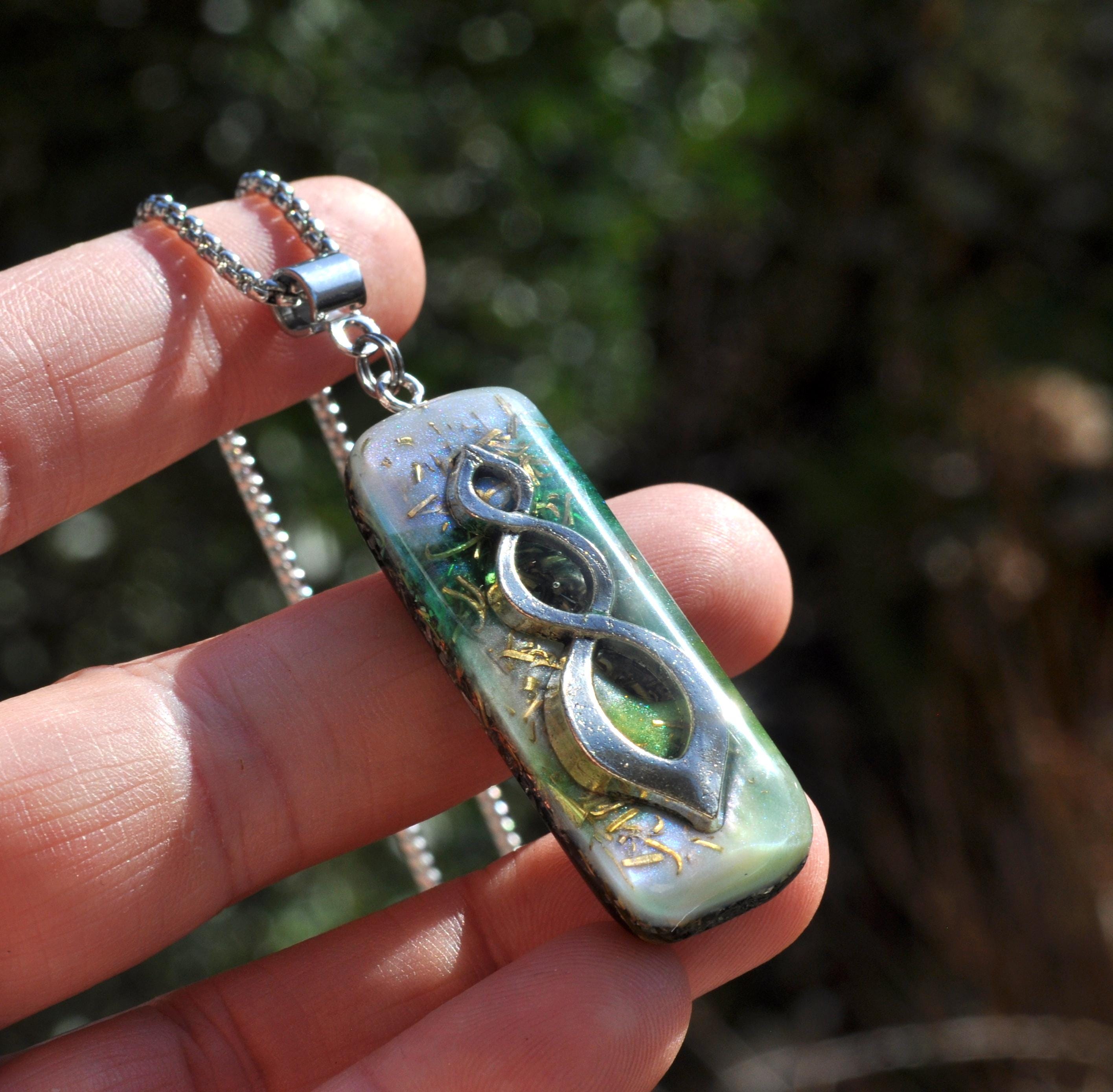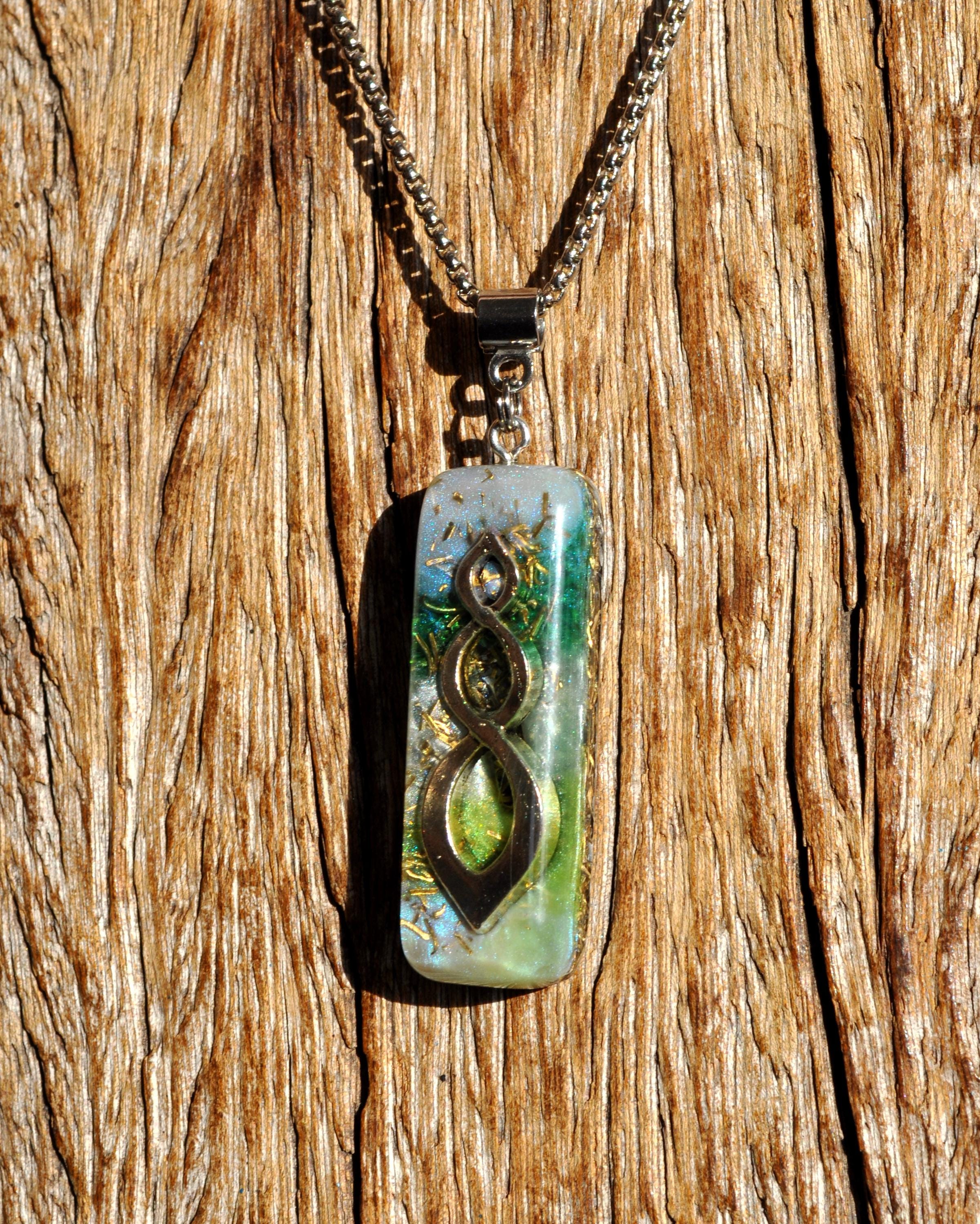 Even though it isn’t visible, the Clear Quartz inside the pendant is included for its energy of clarity, openness, and balance. It’s believed to harmonize and amplify the properties of the other stones in the Orgonite® blend.