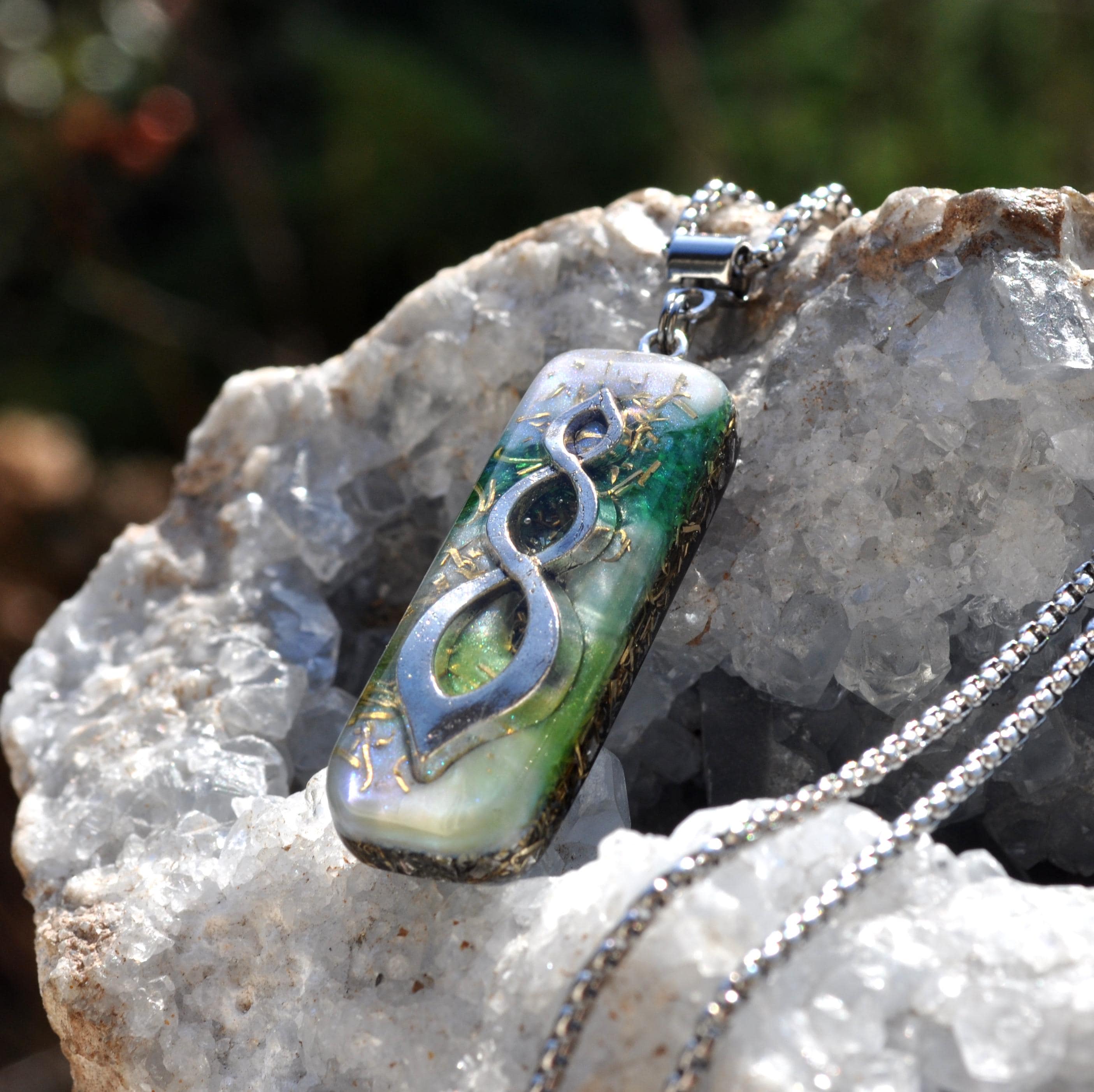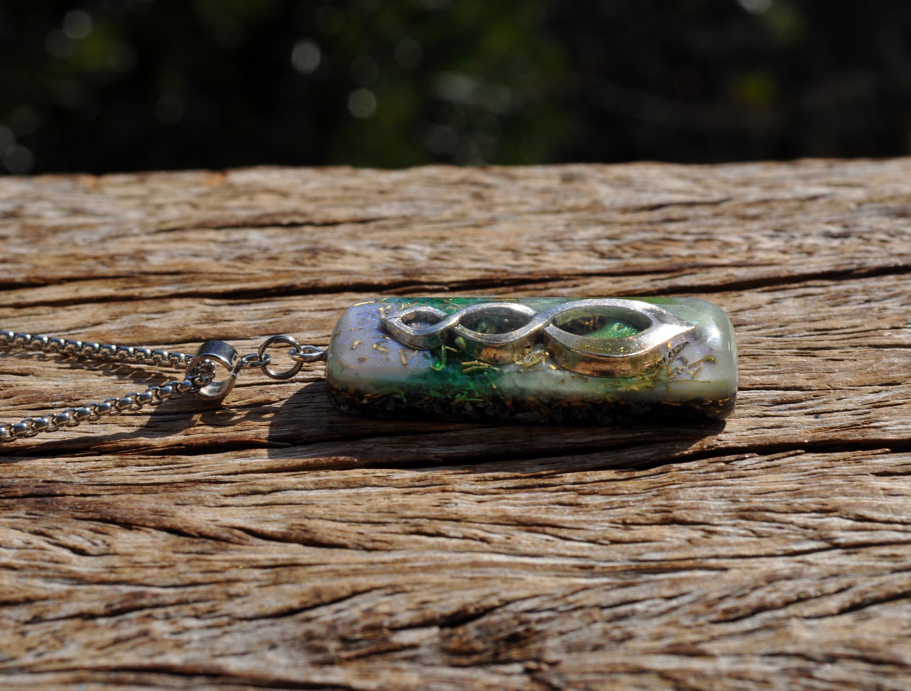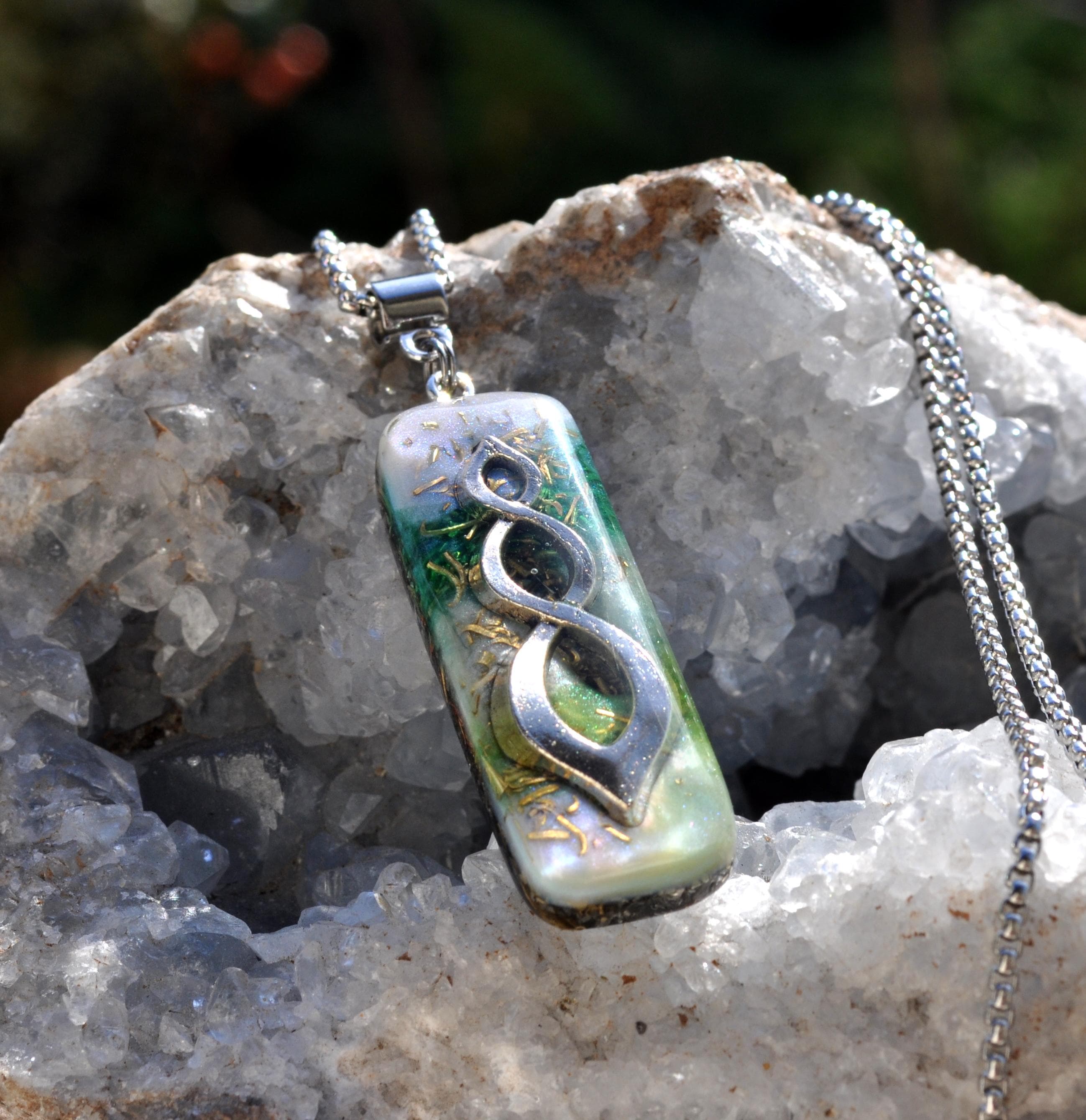 Even though it isn’t visible, the Clear Quartz inside the pendant is included for its energy of clarity, openness, and balance. It’s believed to harmonize and amplify the properties of the other stones in the Orgonite® blend.