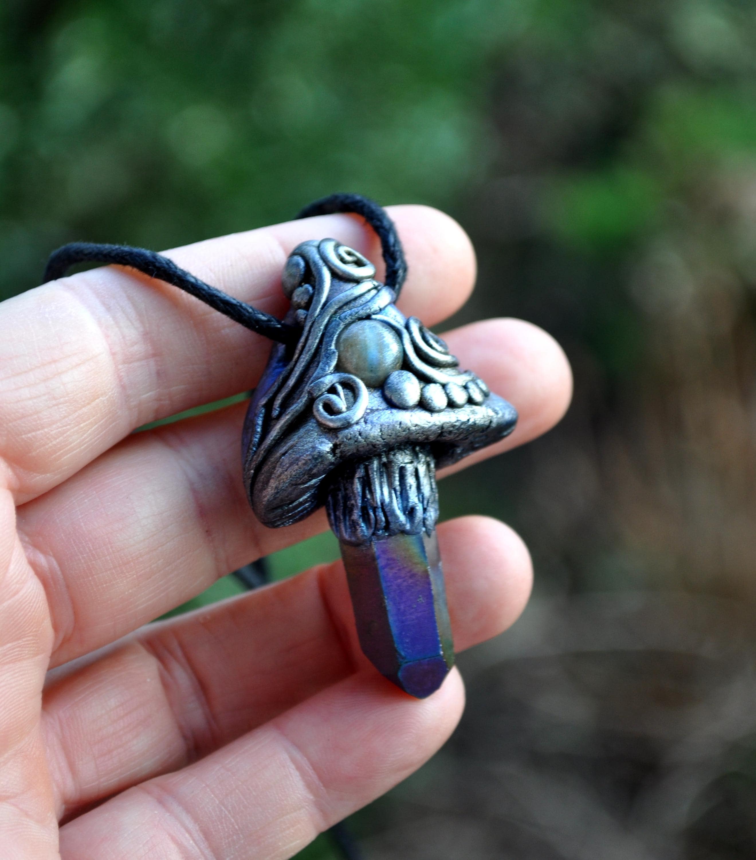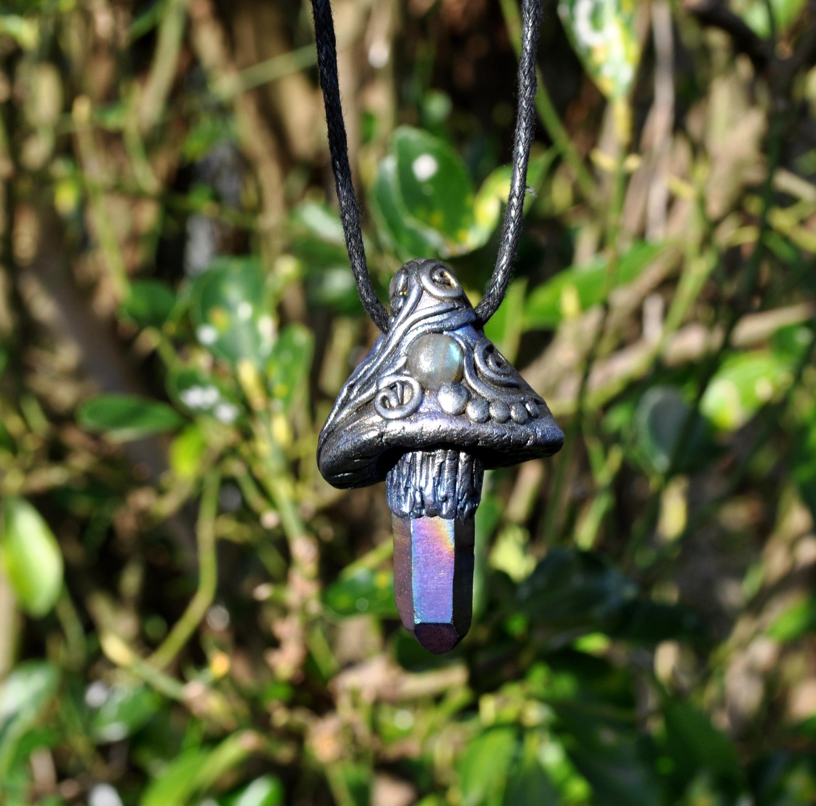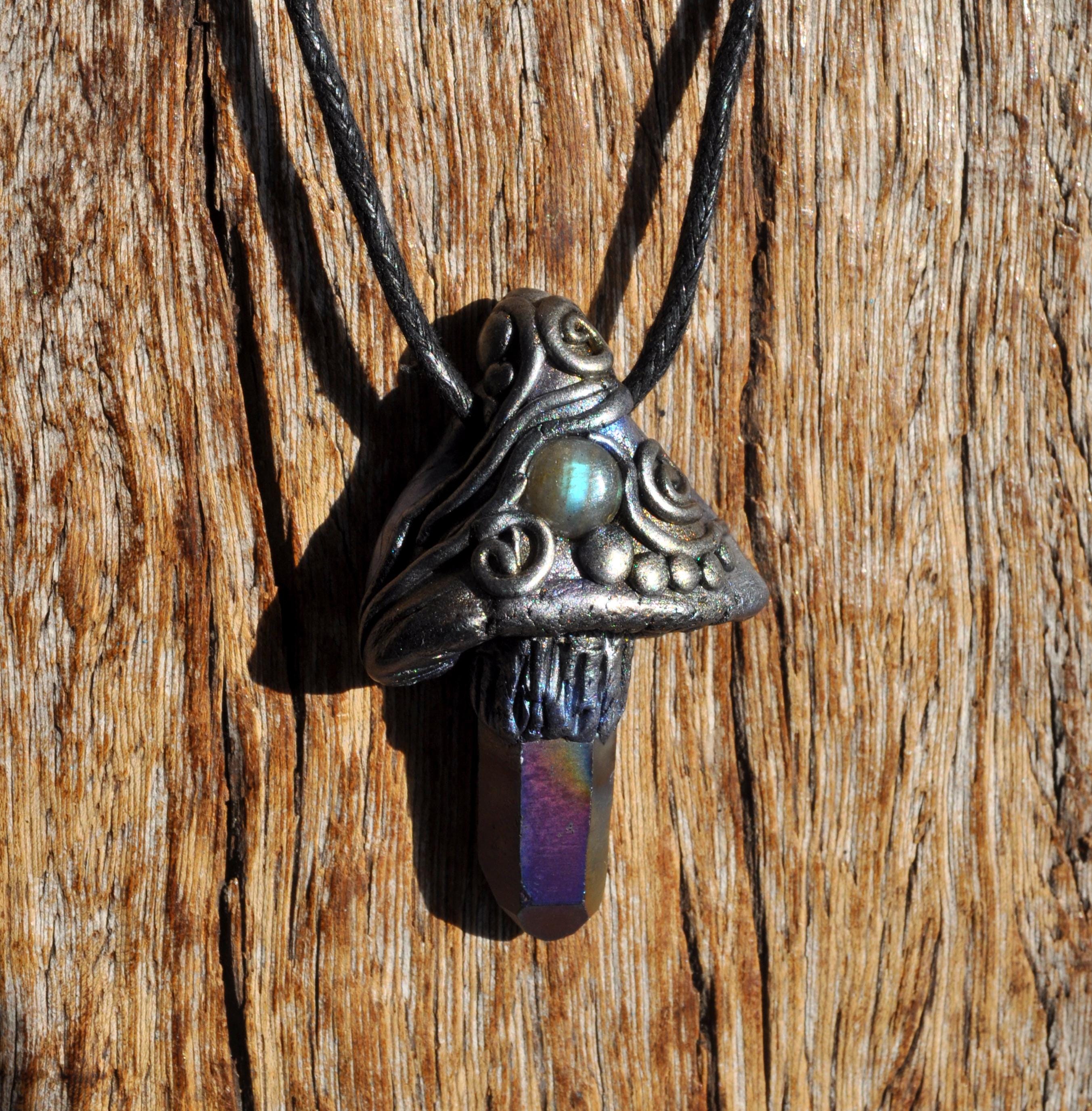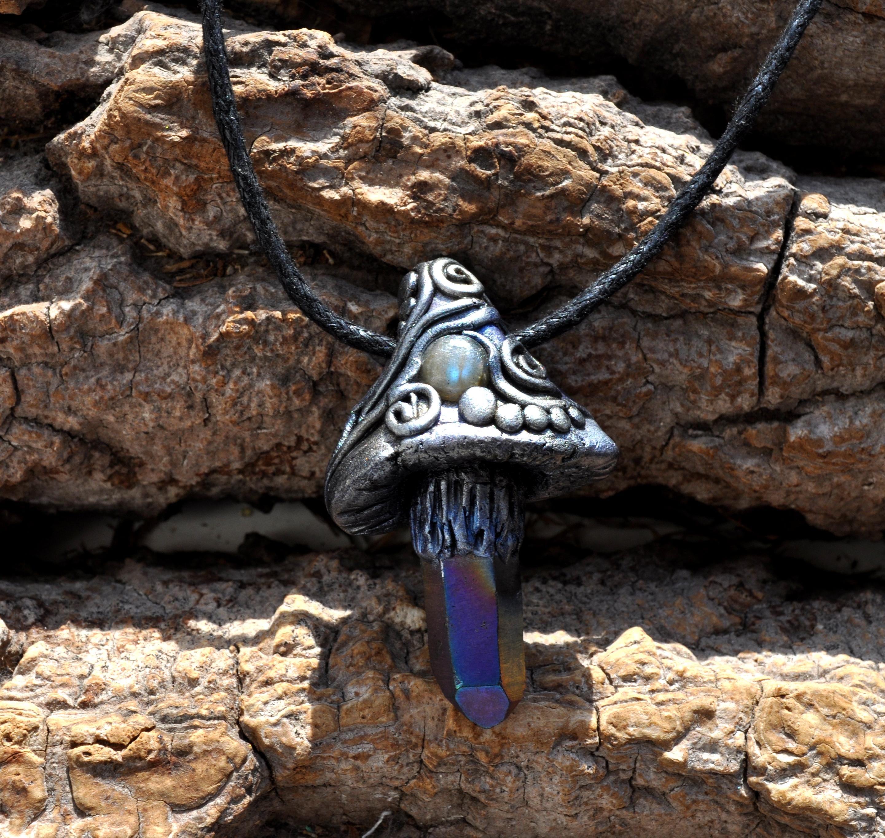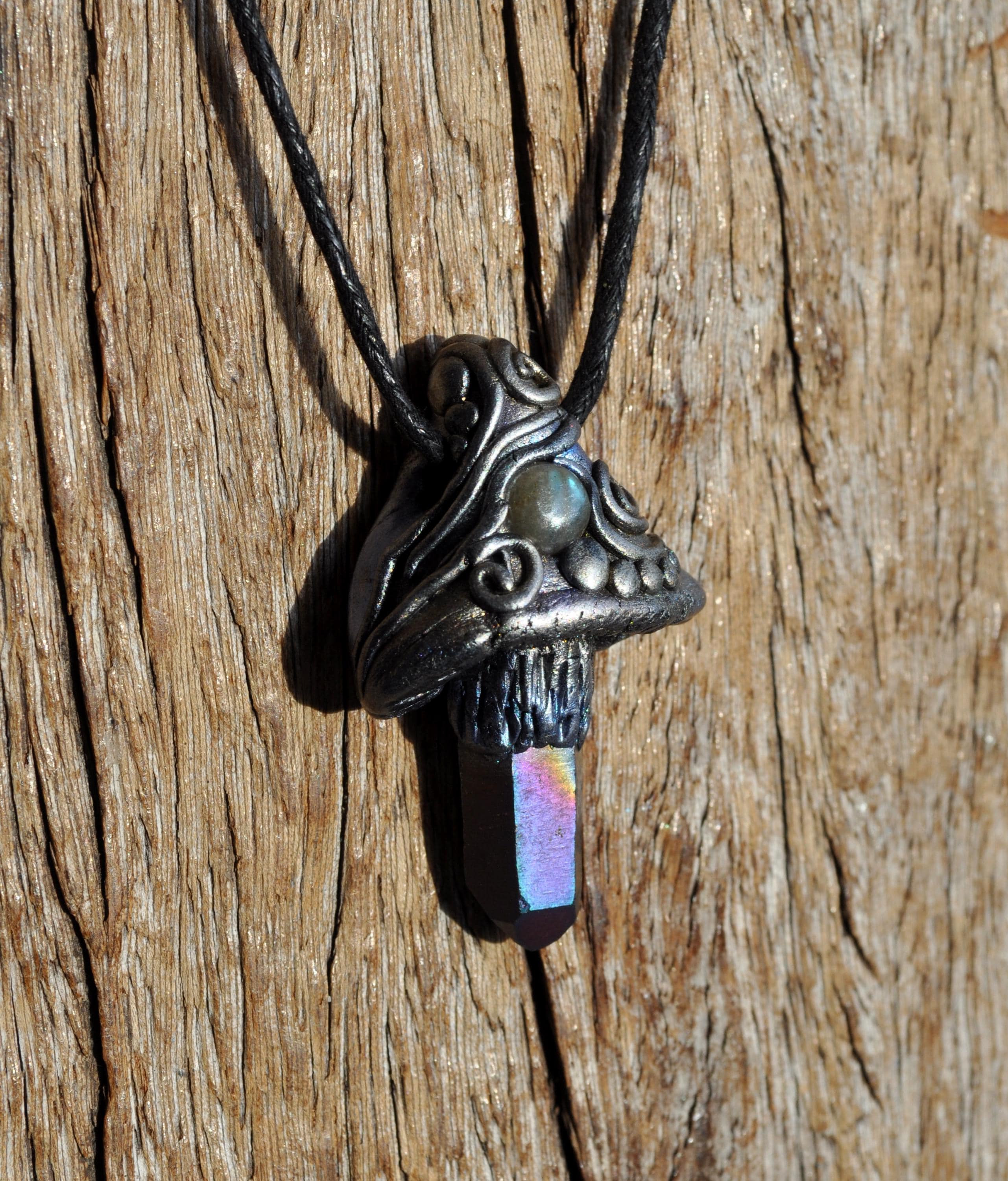 Hand-Sculpted Mushroom Pendant with Titanium Quartz and Labradorite