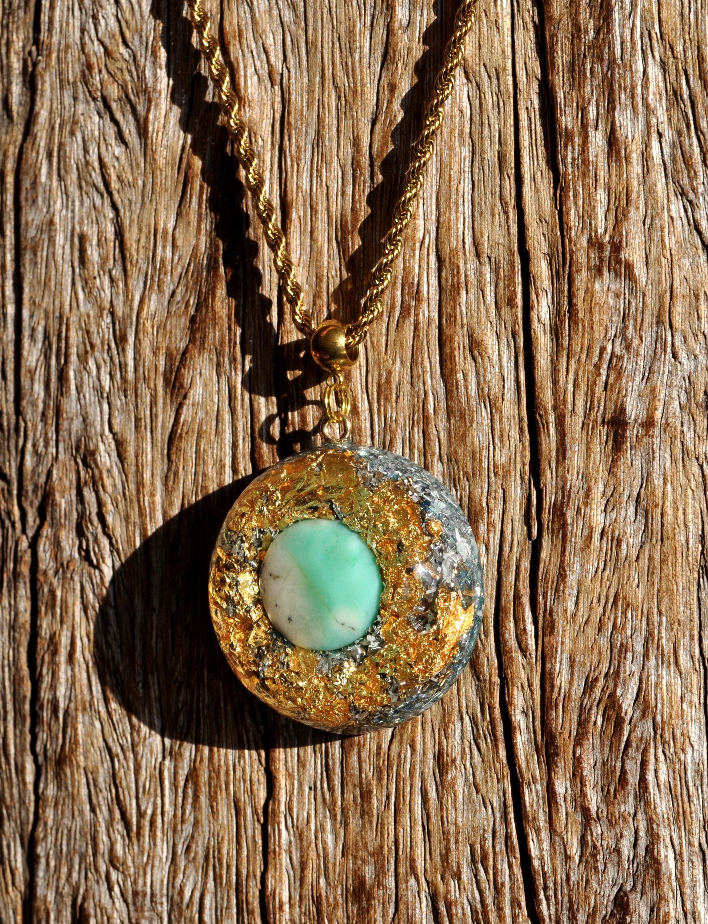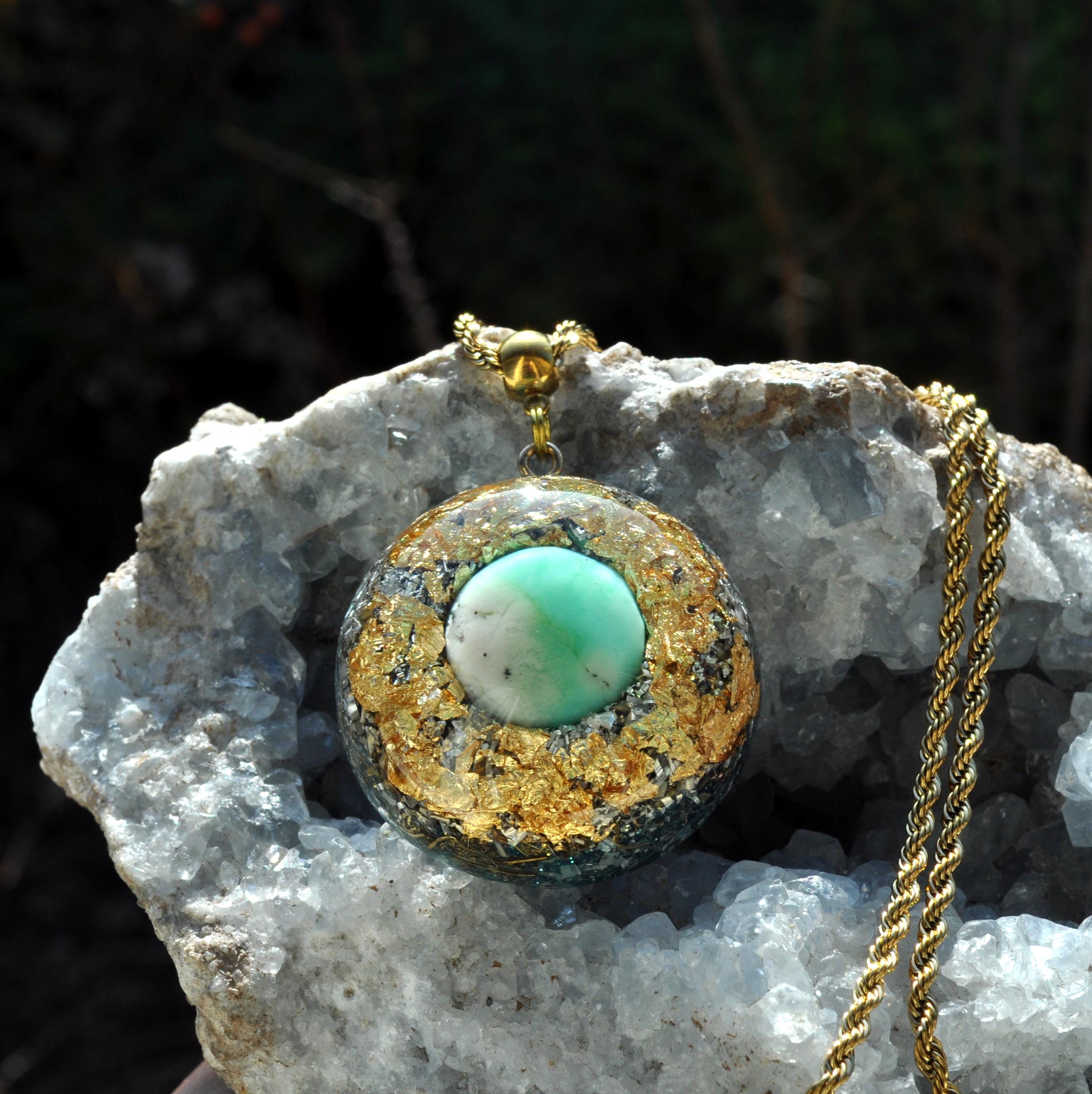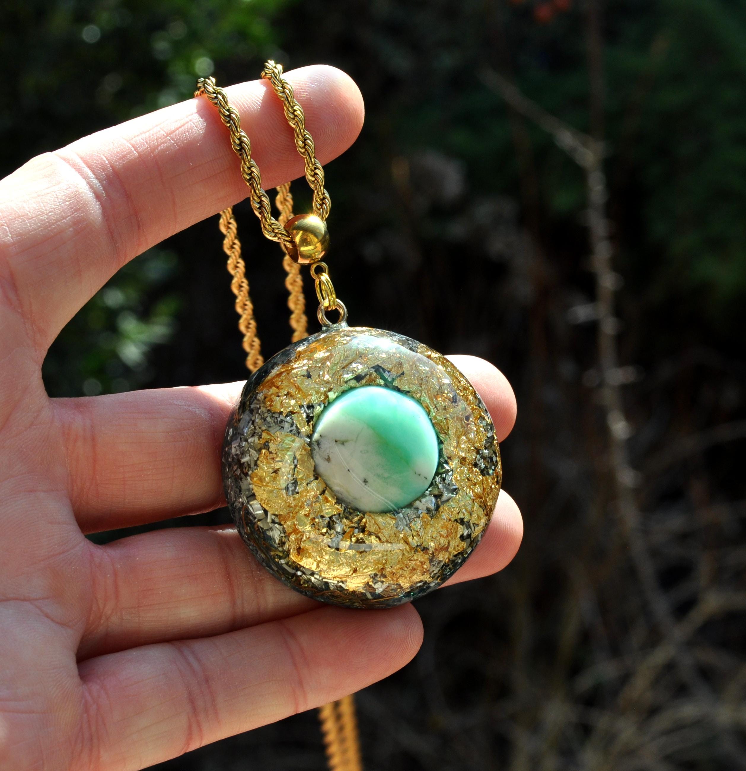 Unique Orgonite Pendant with Chrysophrase and Gold leaf