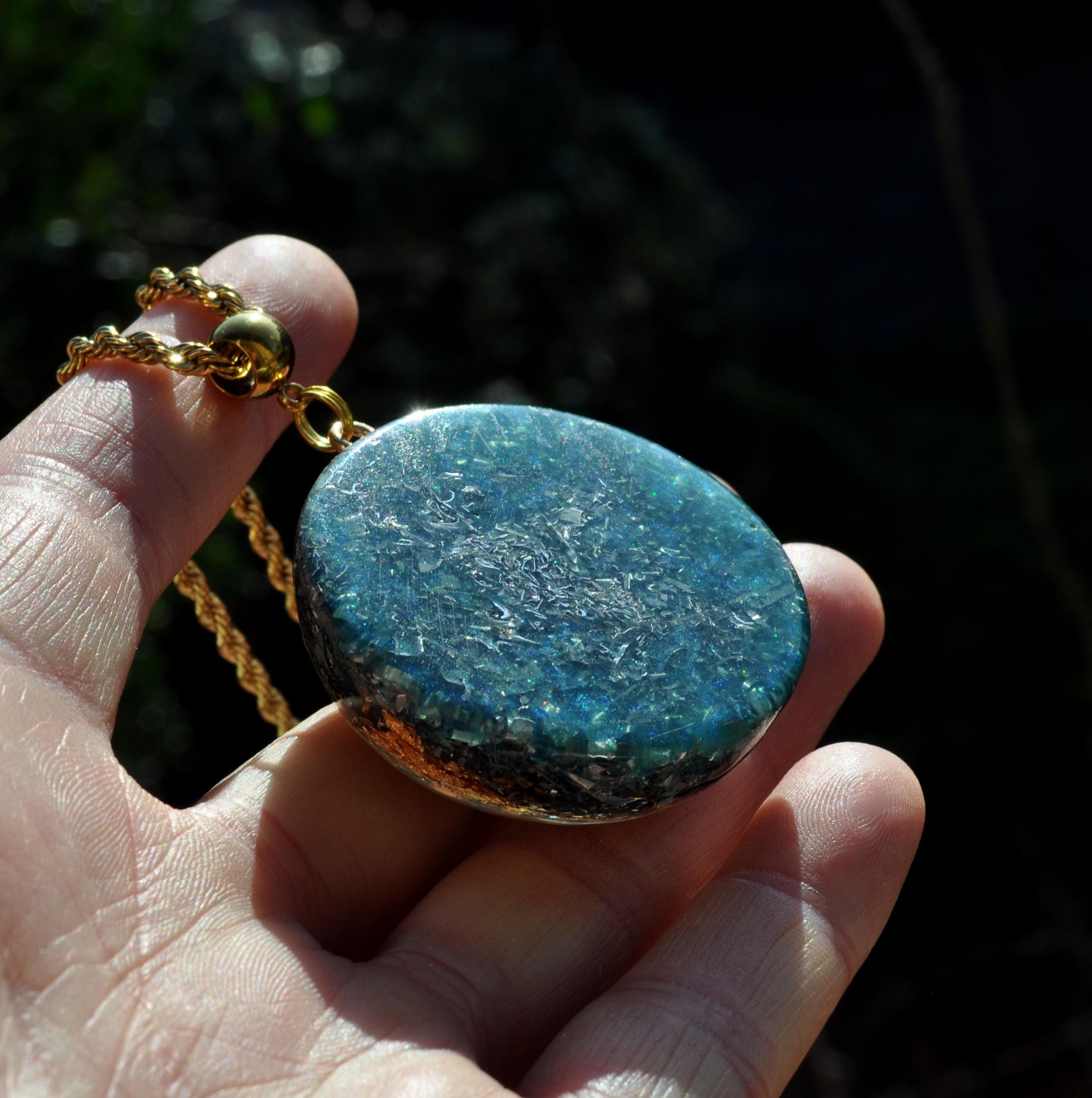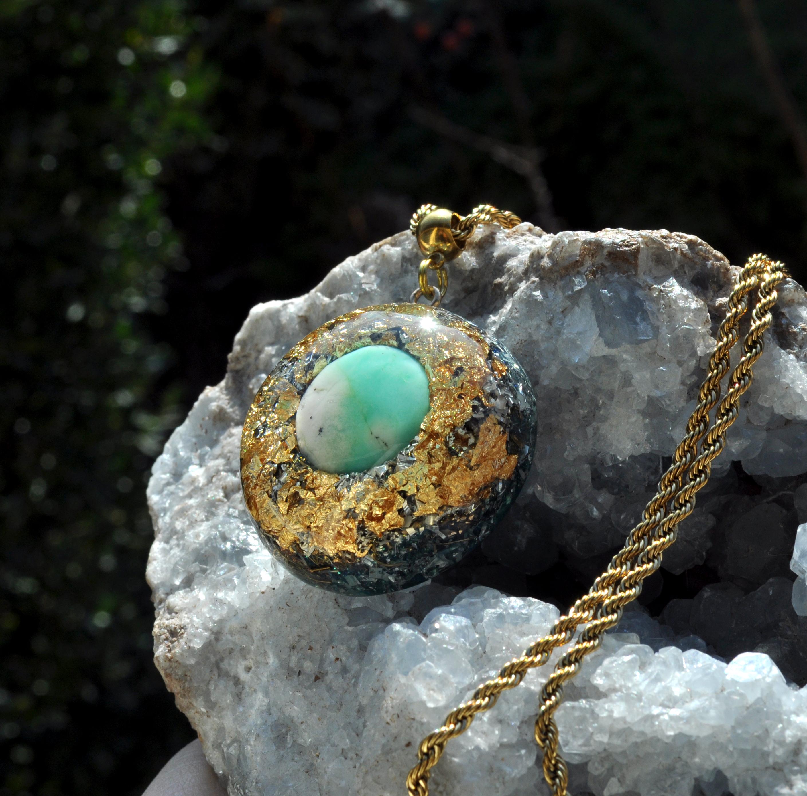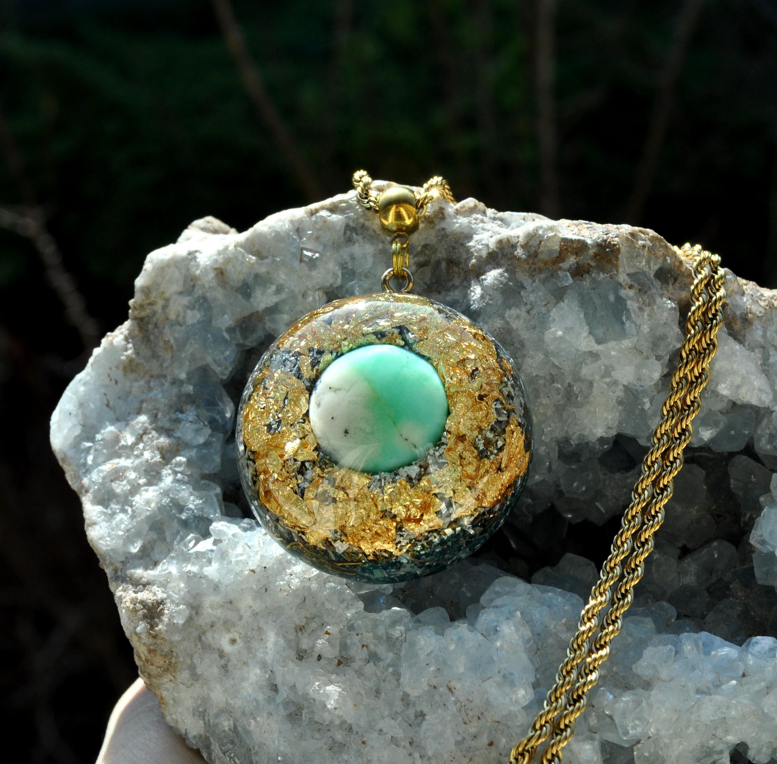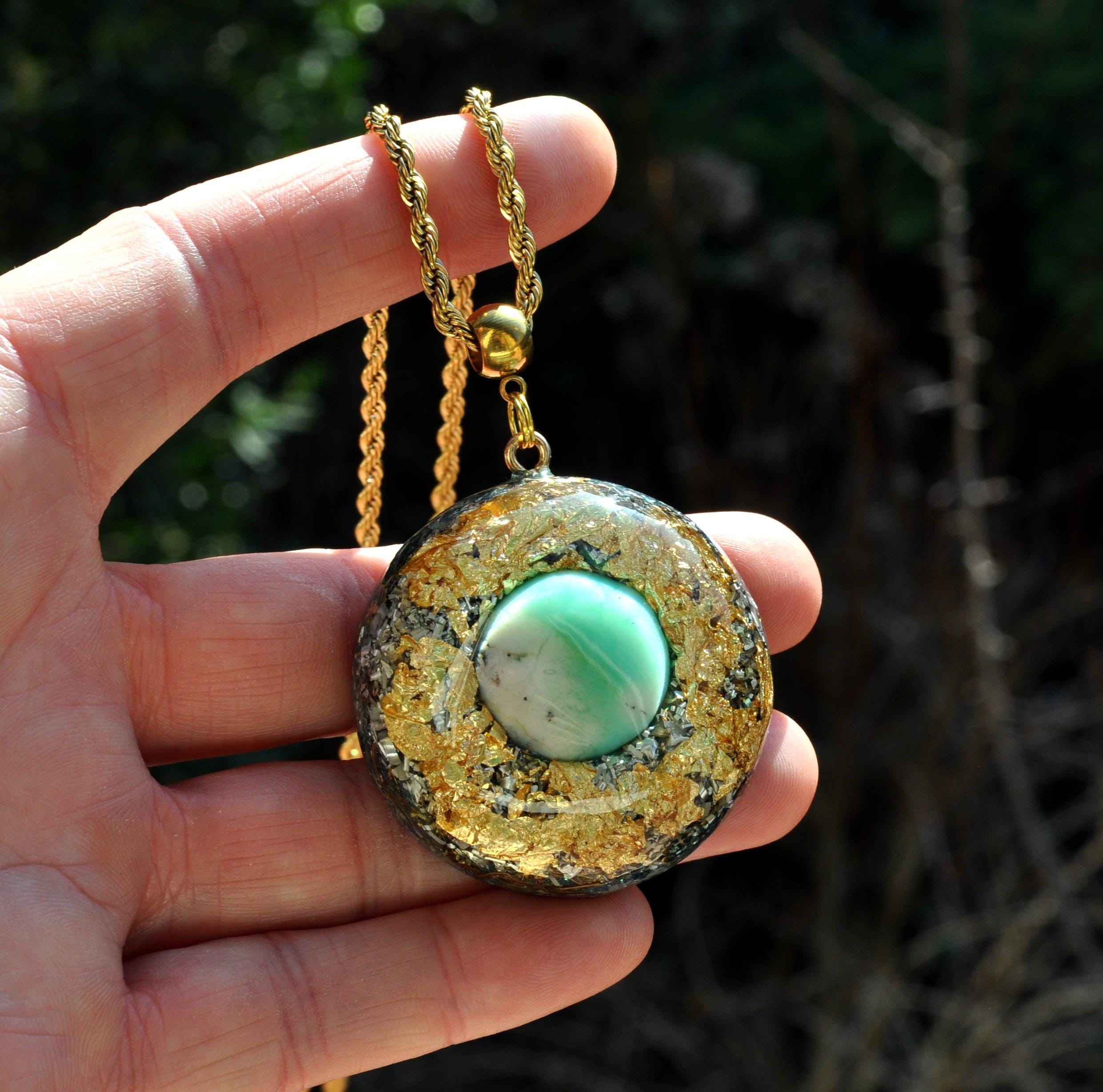 Unique Orgonite Pendant with Chrysophrase and Gold leaf