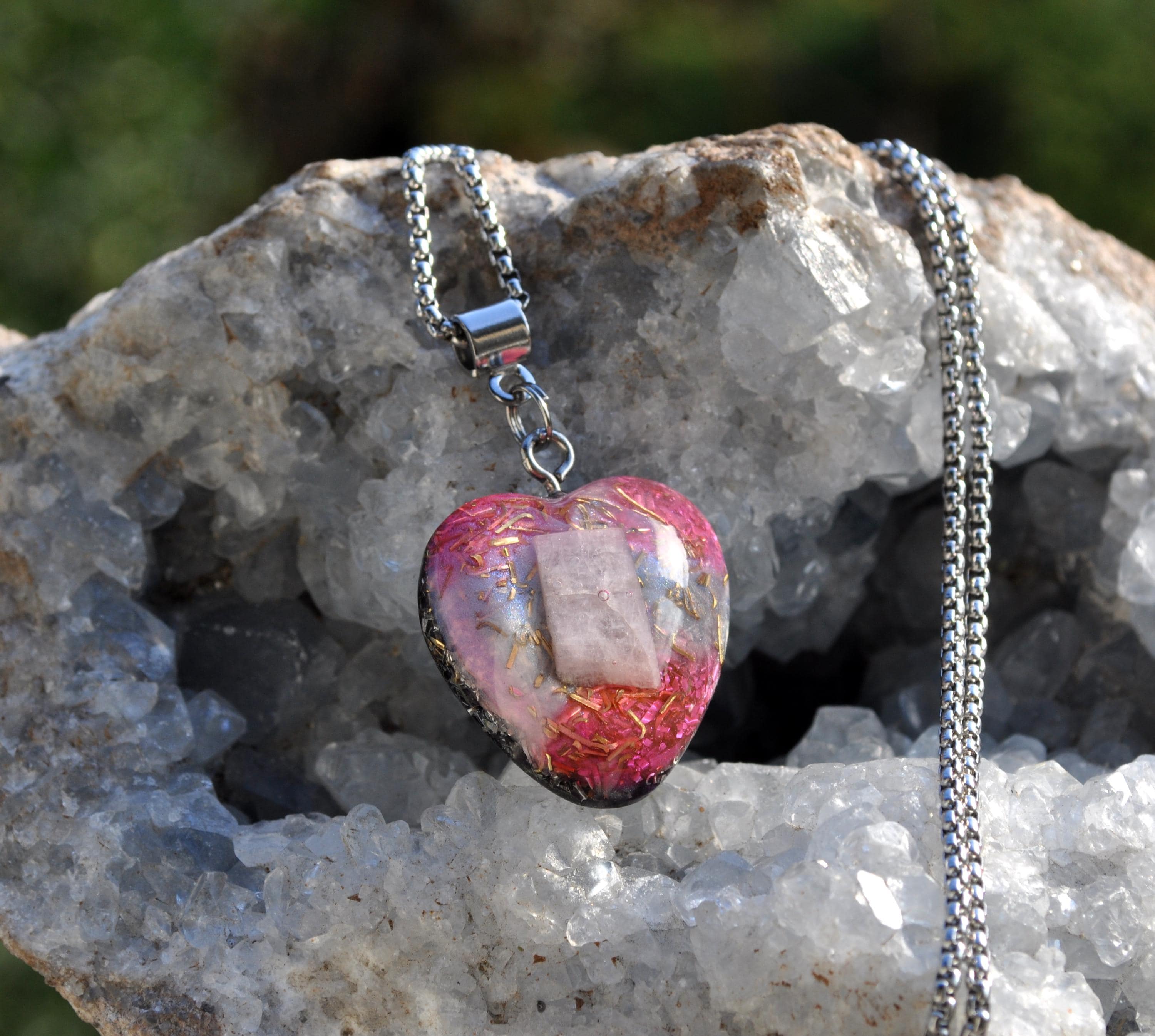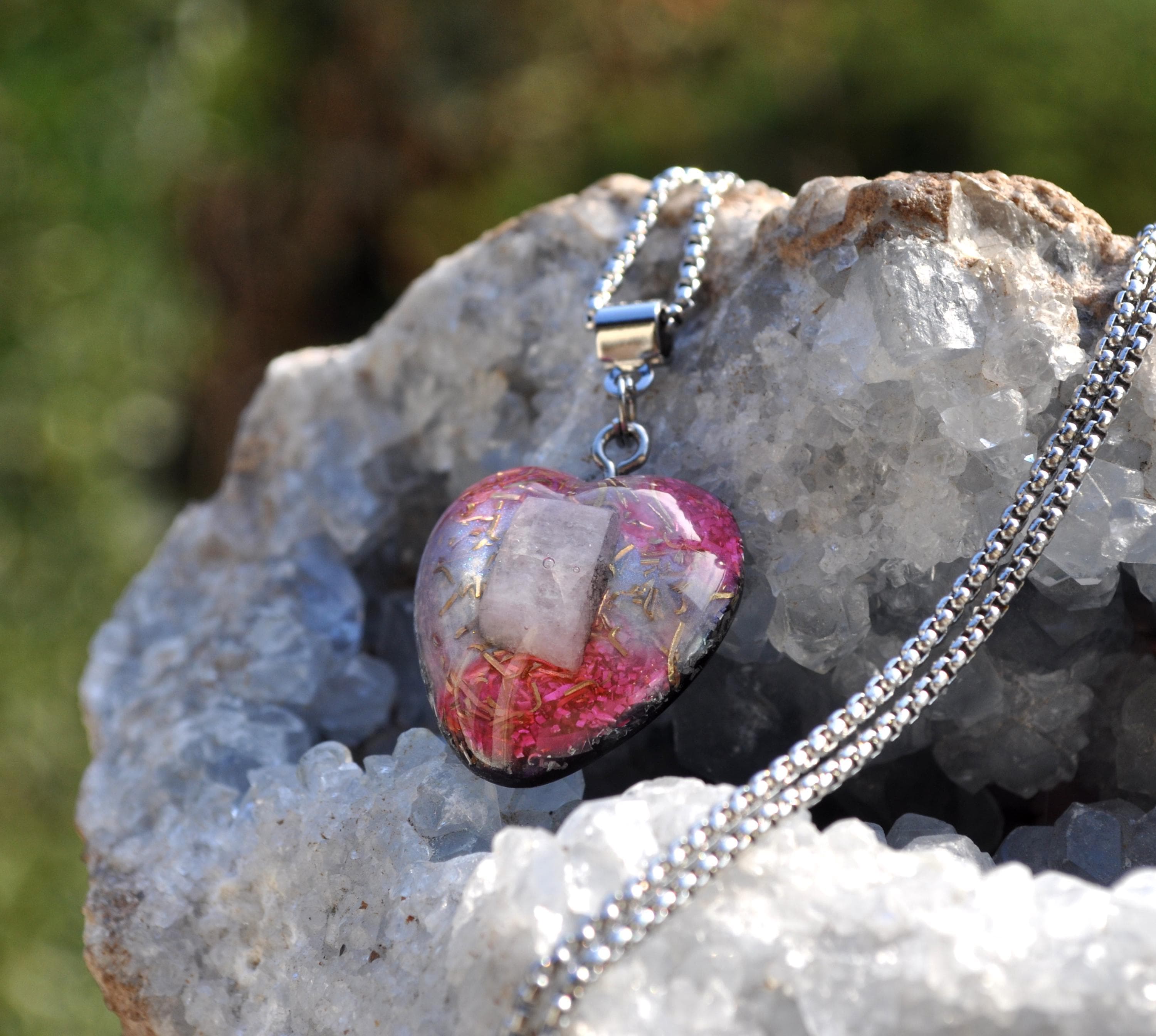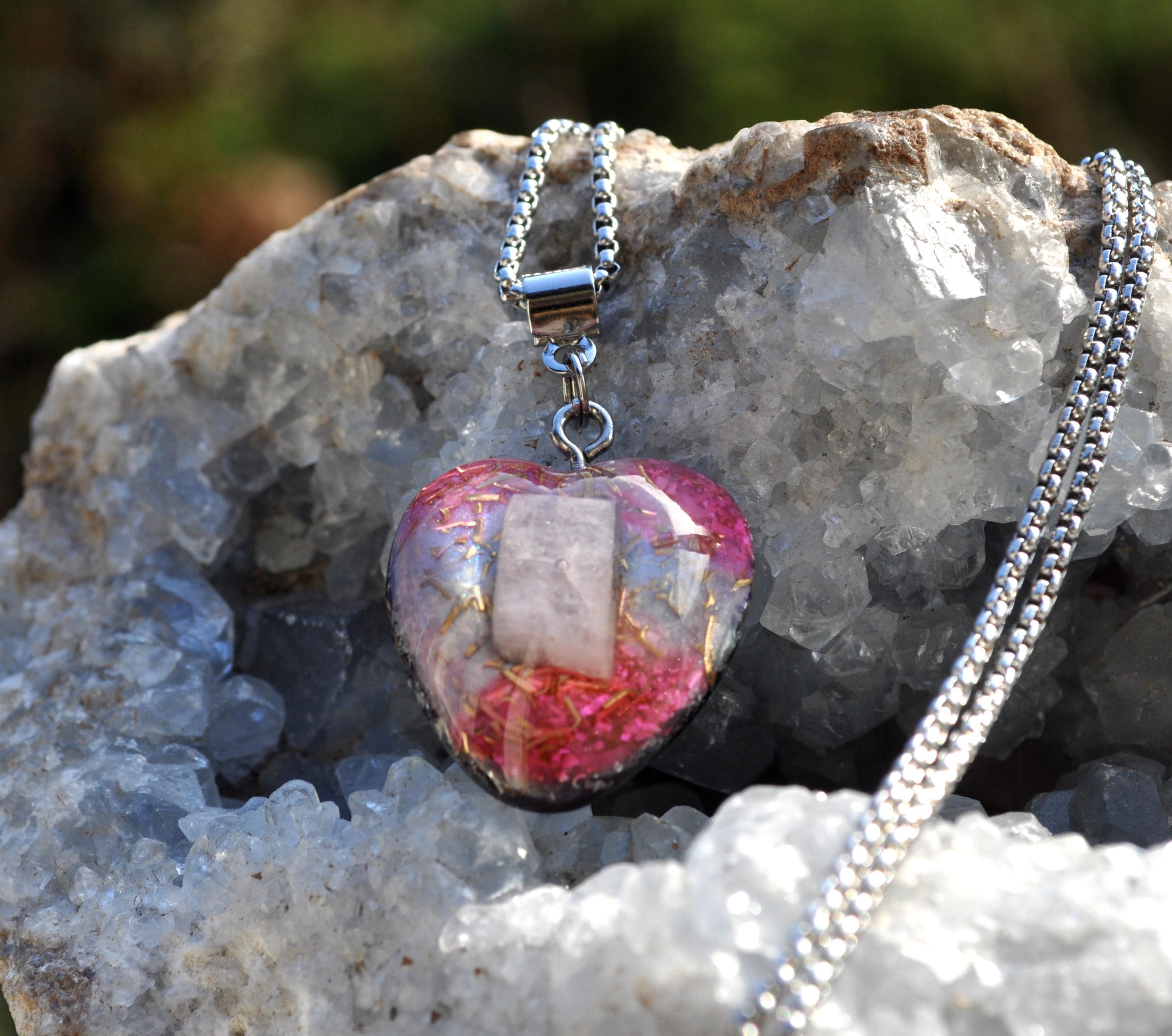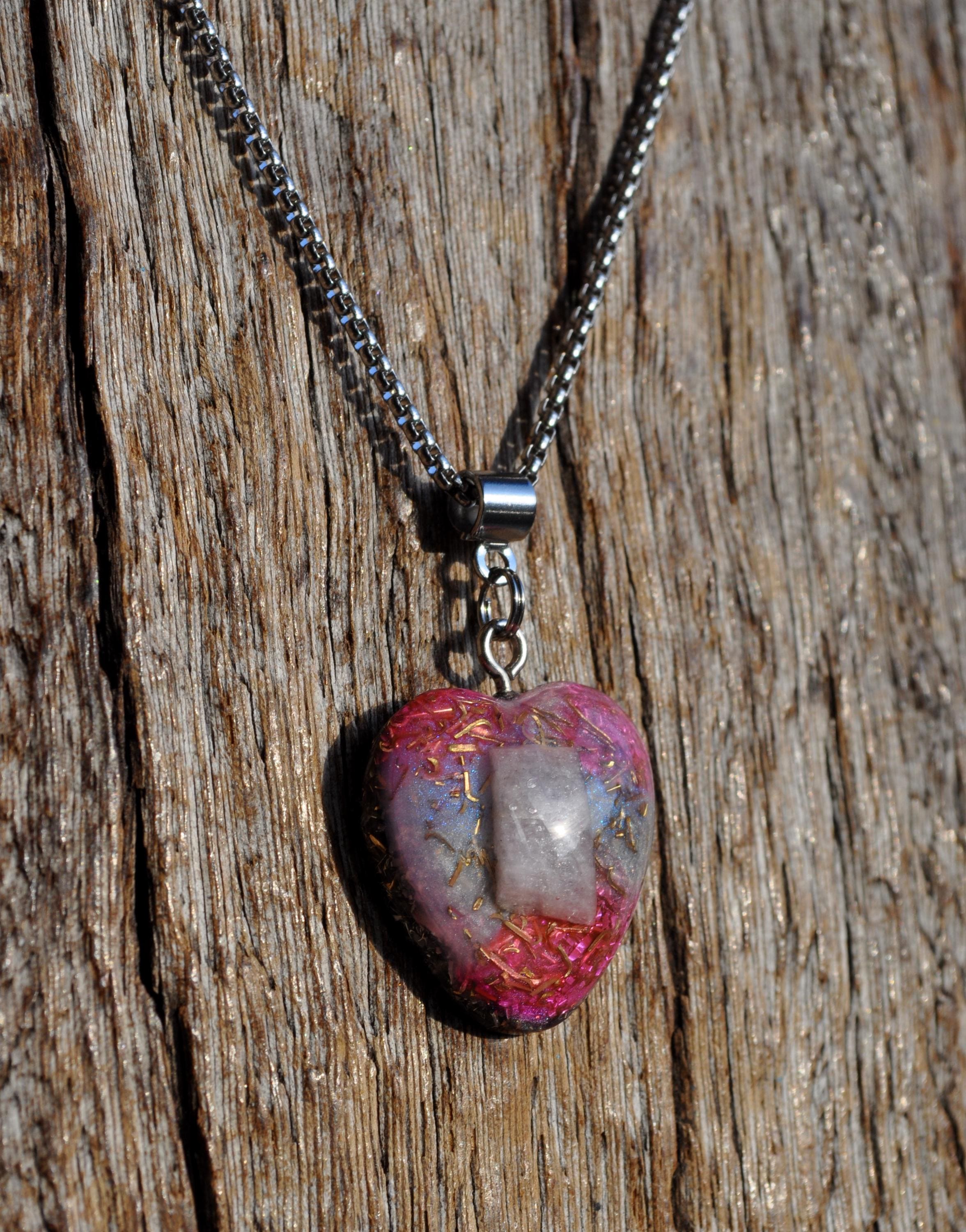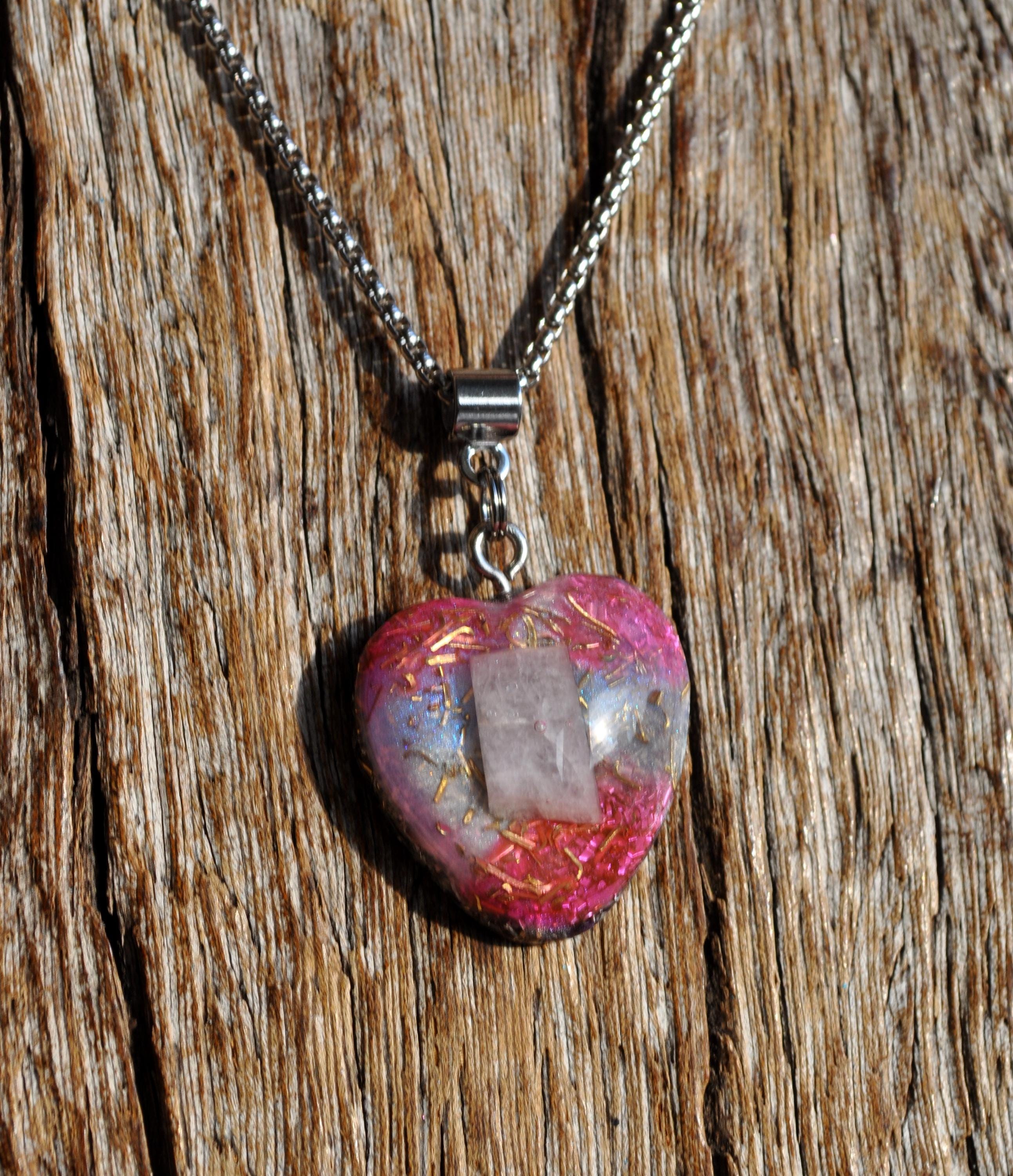 Heart-Shaped Kunzite Orgonite Pendant – Handcrafted Crystal Necklace