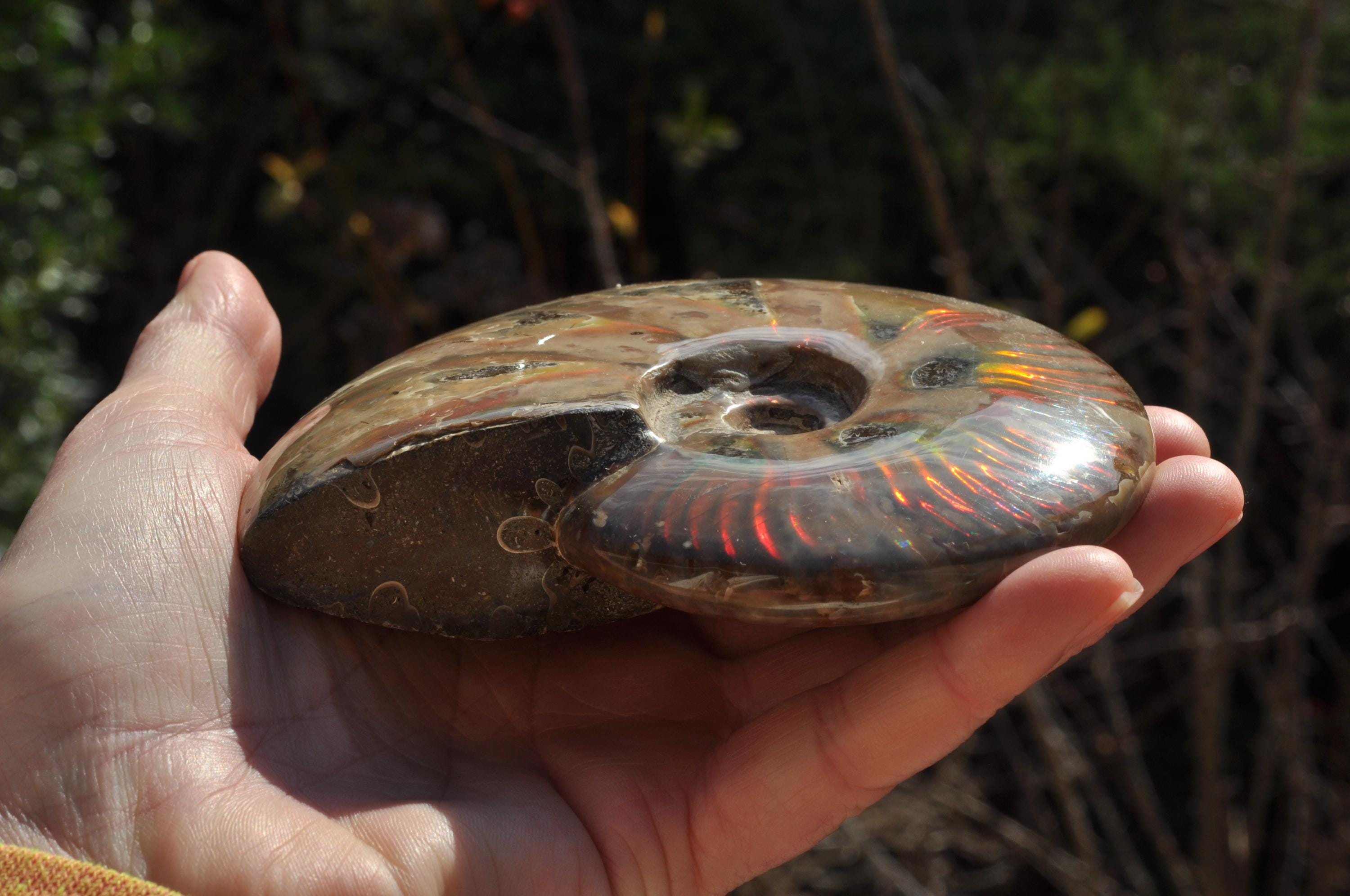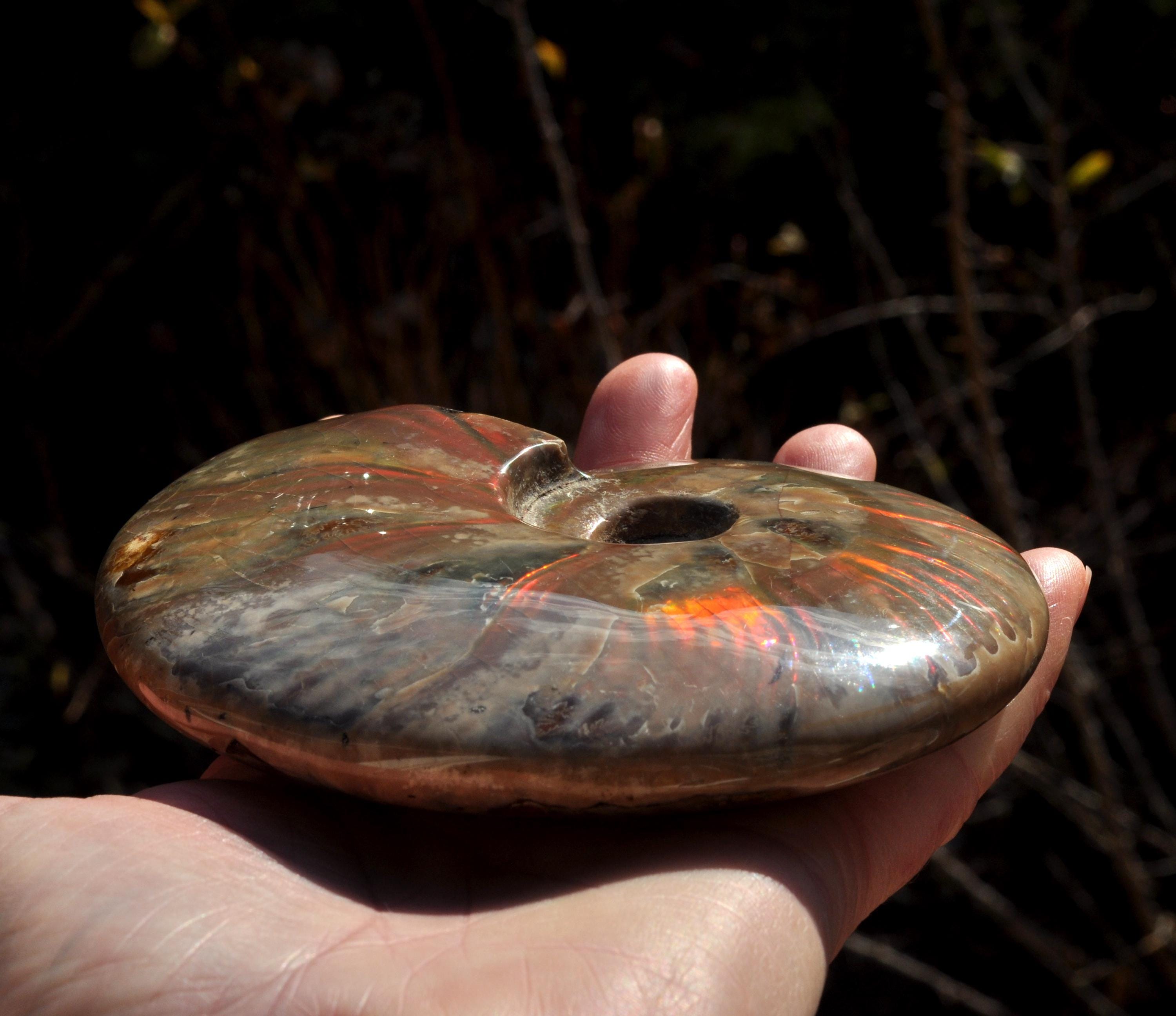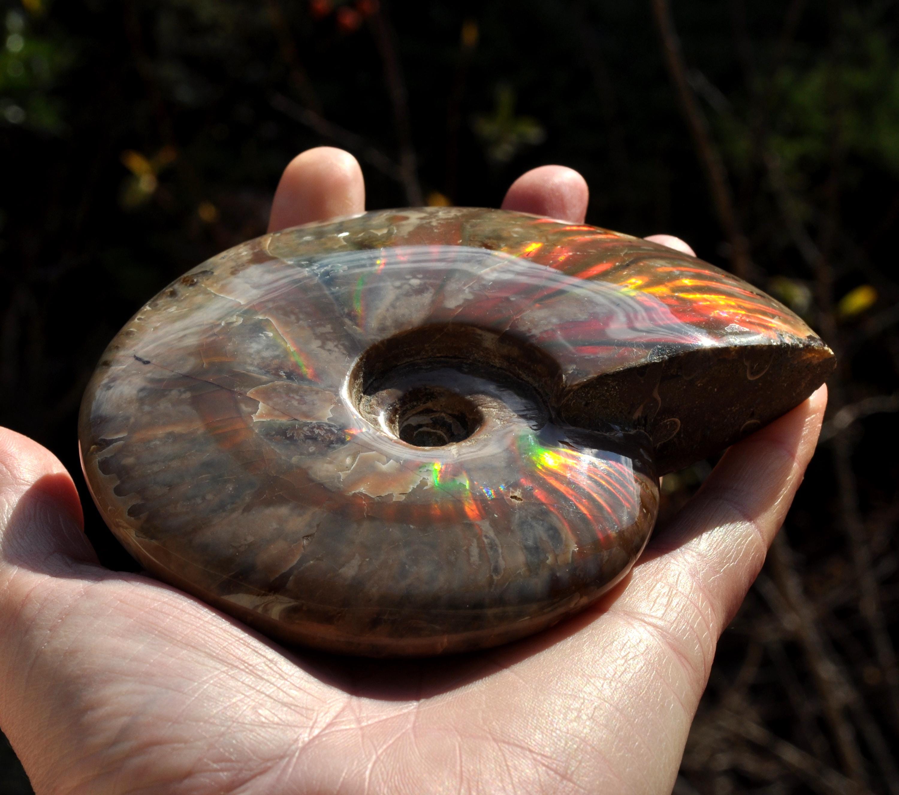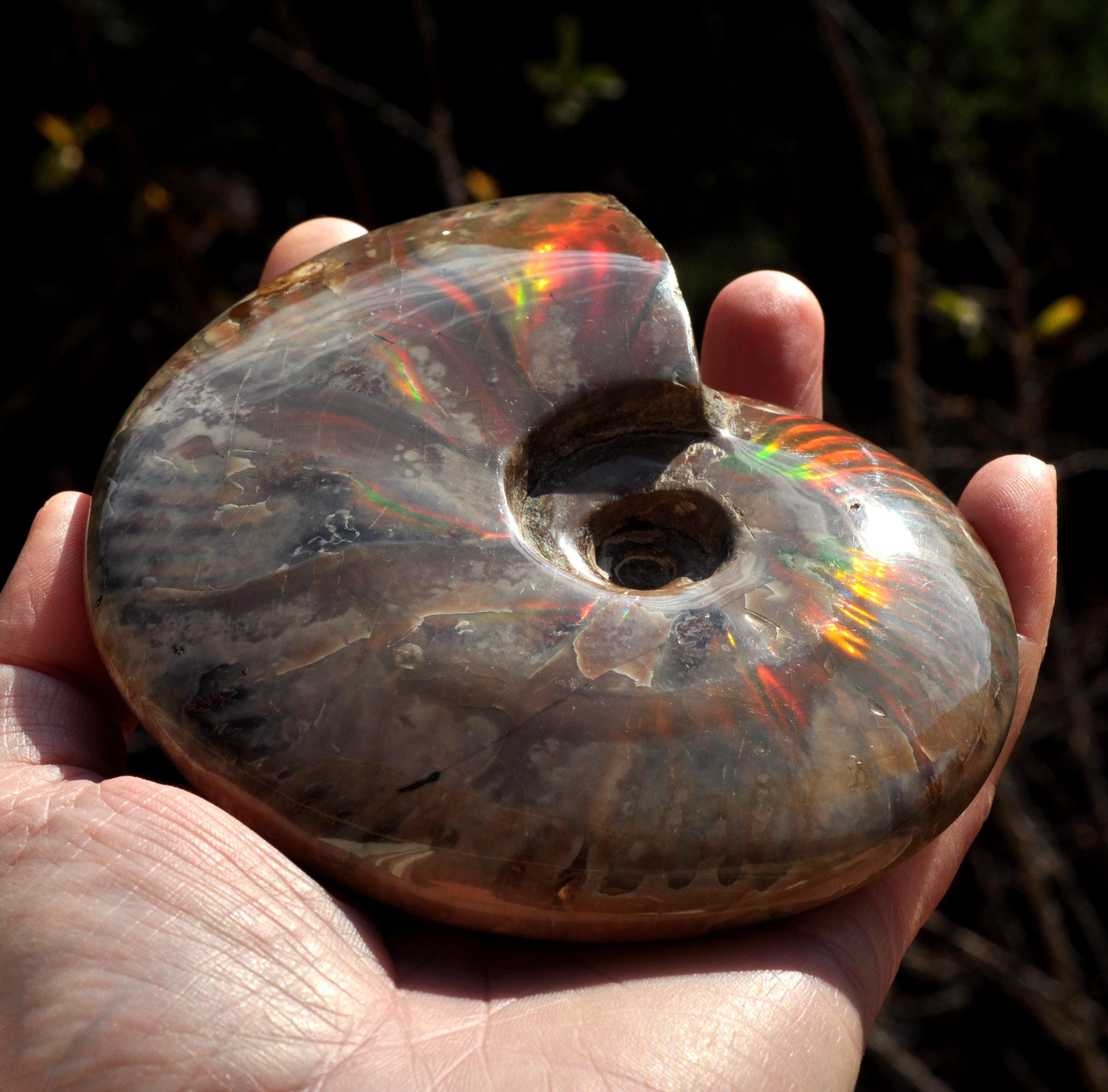 Under unique fossilization conditions, the original nacreous shell transforms into a surface of brilliant iridescent colors — flashes of green, red, blue, and gold that dance in the light. These colors come from the microstructure of the fossilized shell, creating a shimmering, rainbow-like effect that has fascinated collectors and spiritual seekers alike.