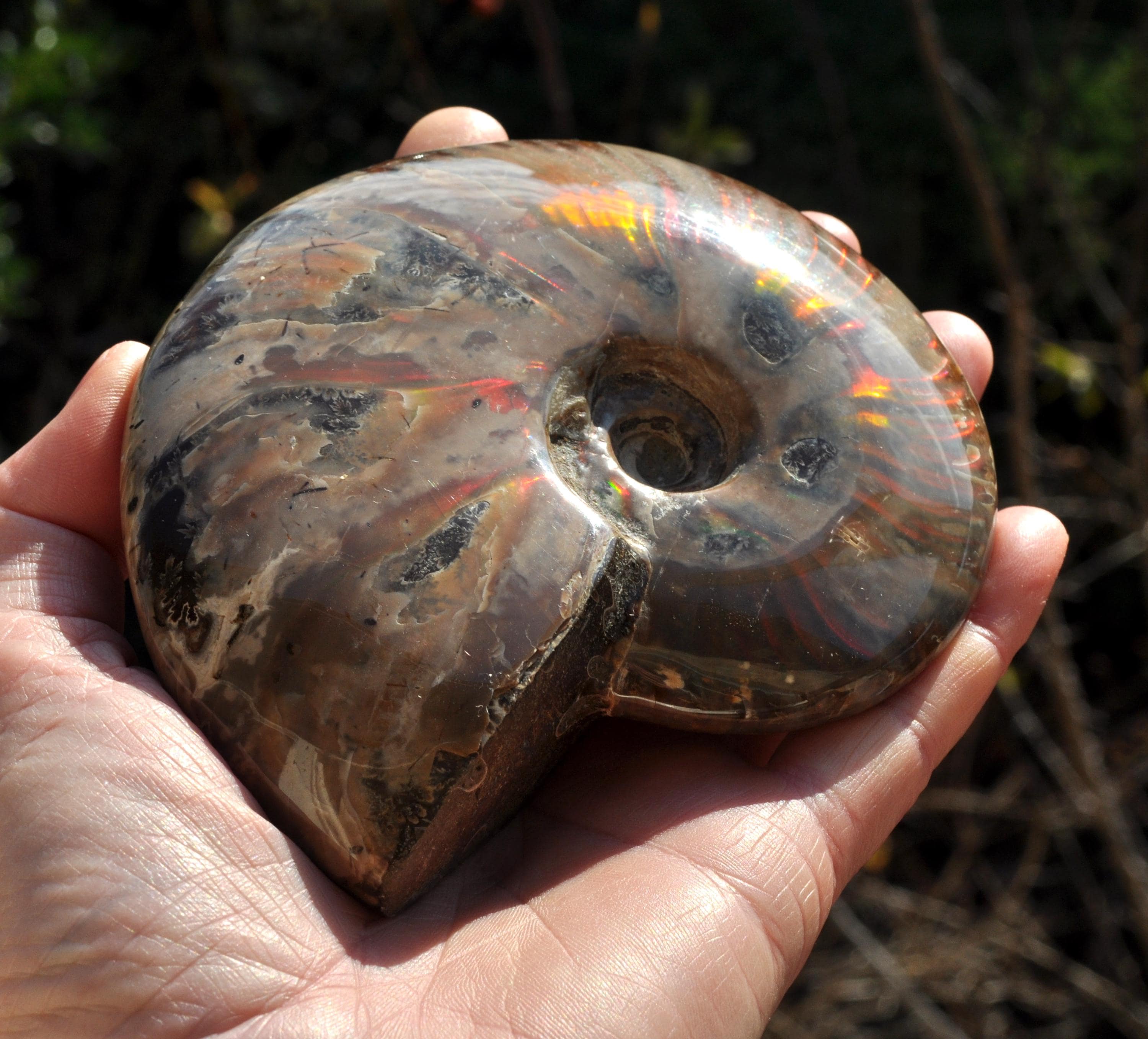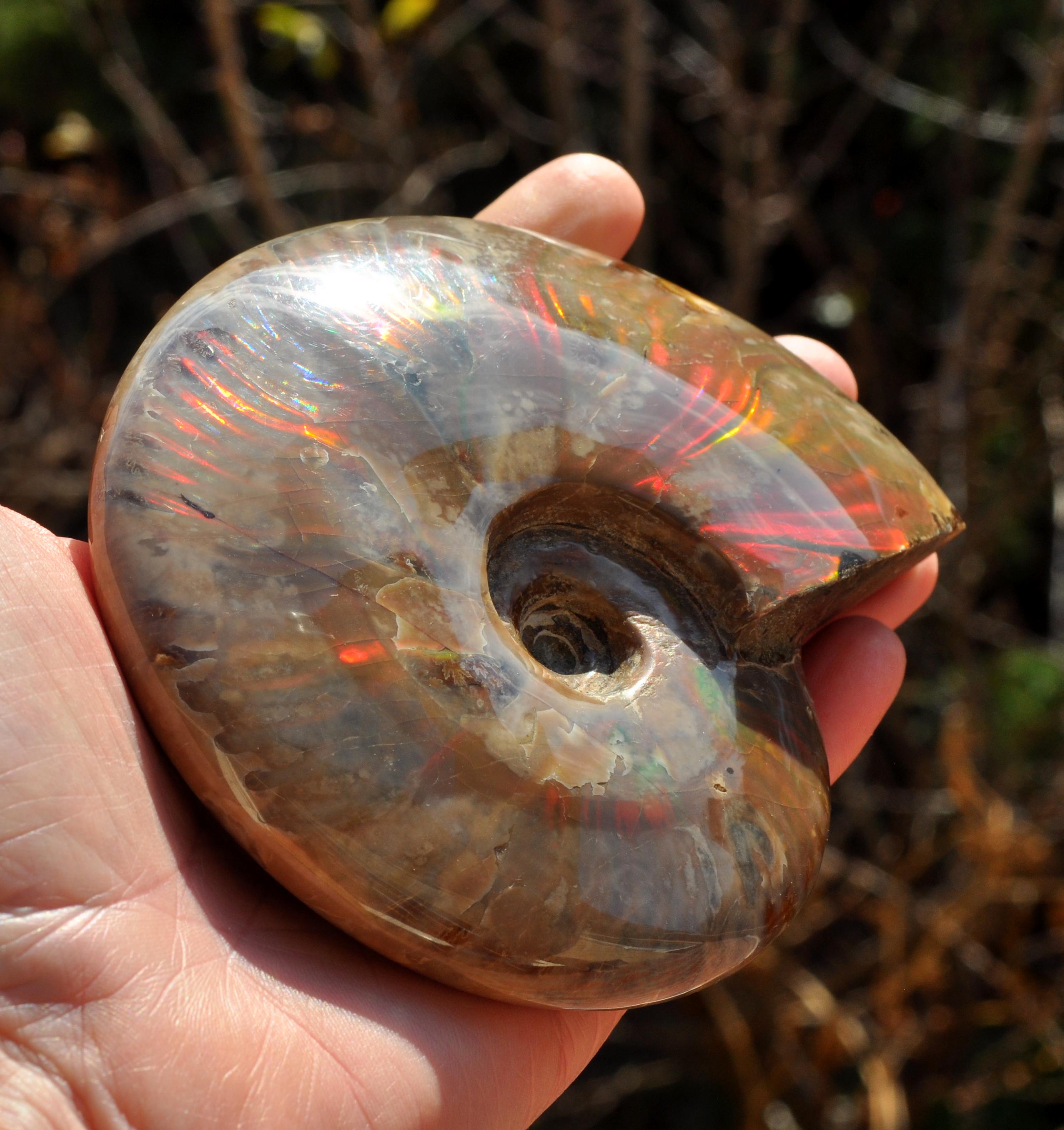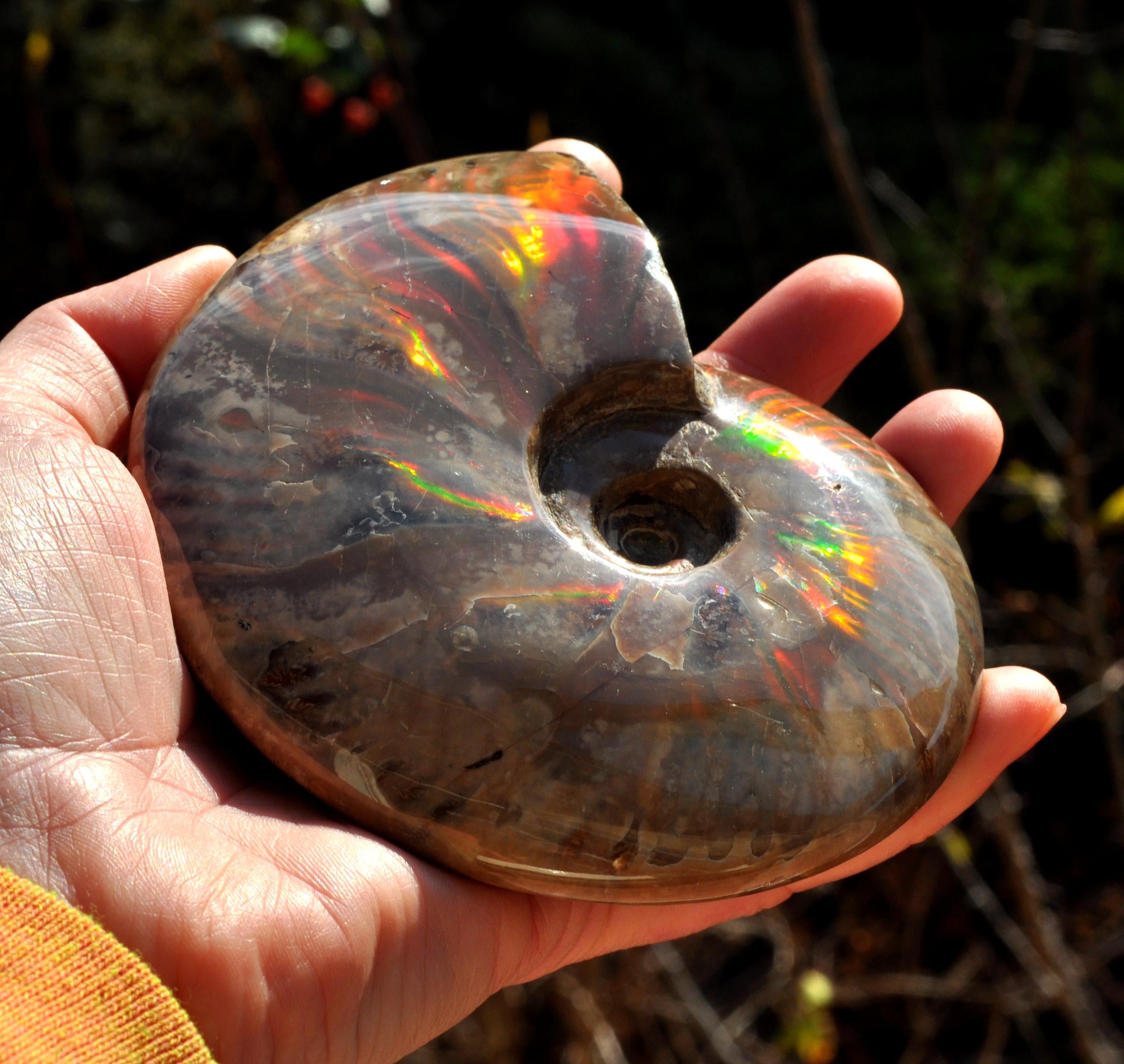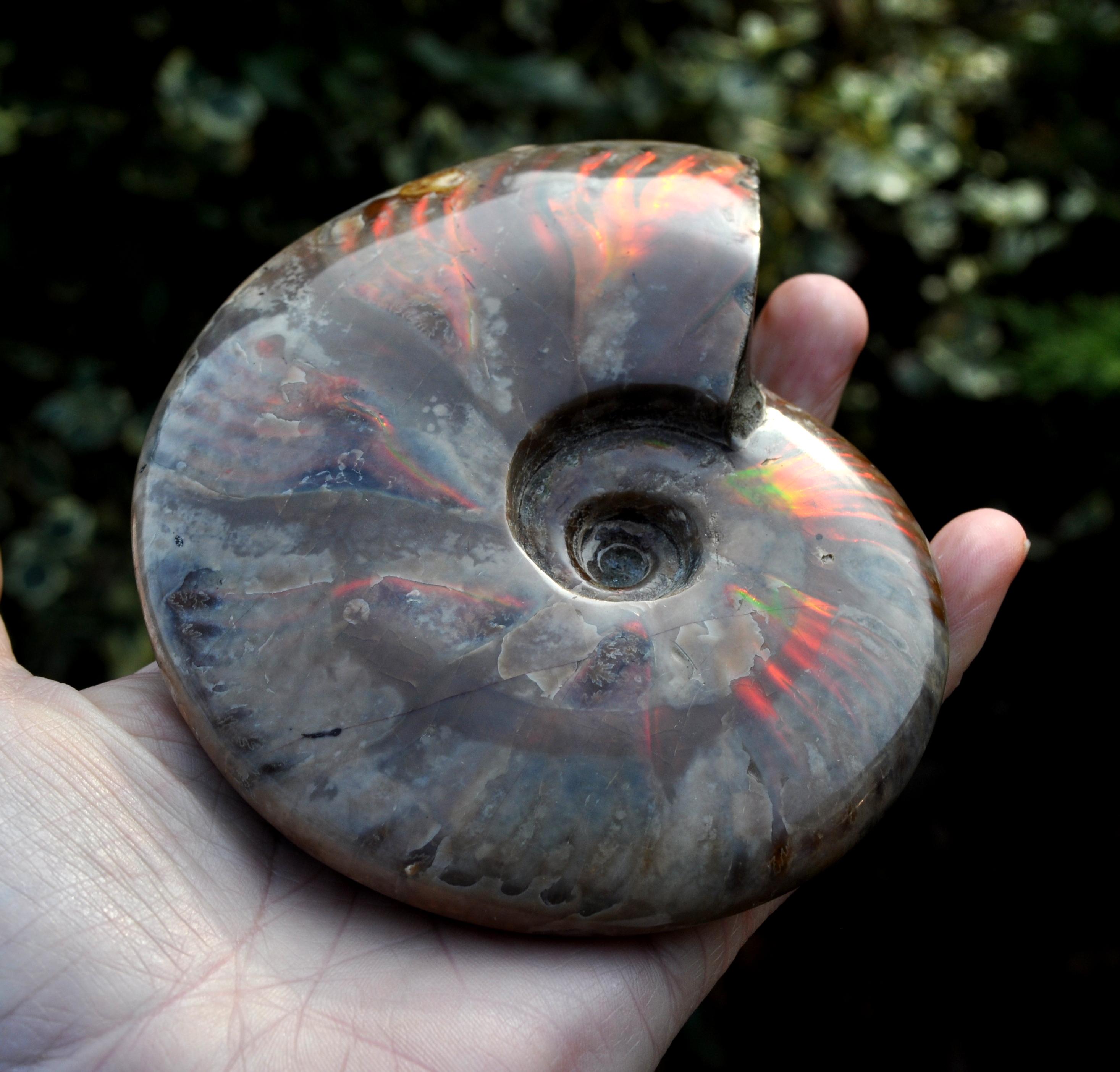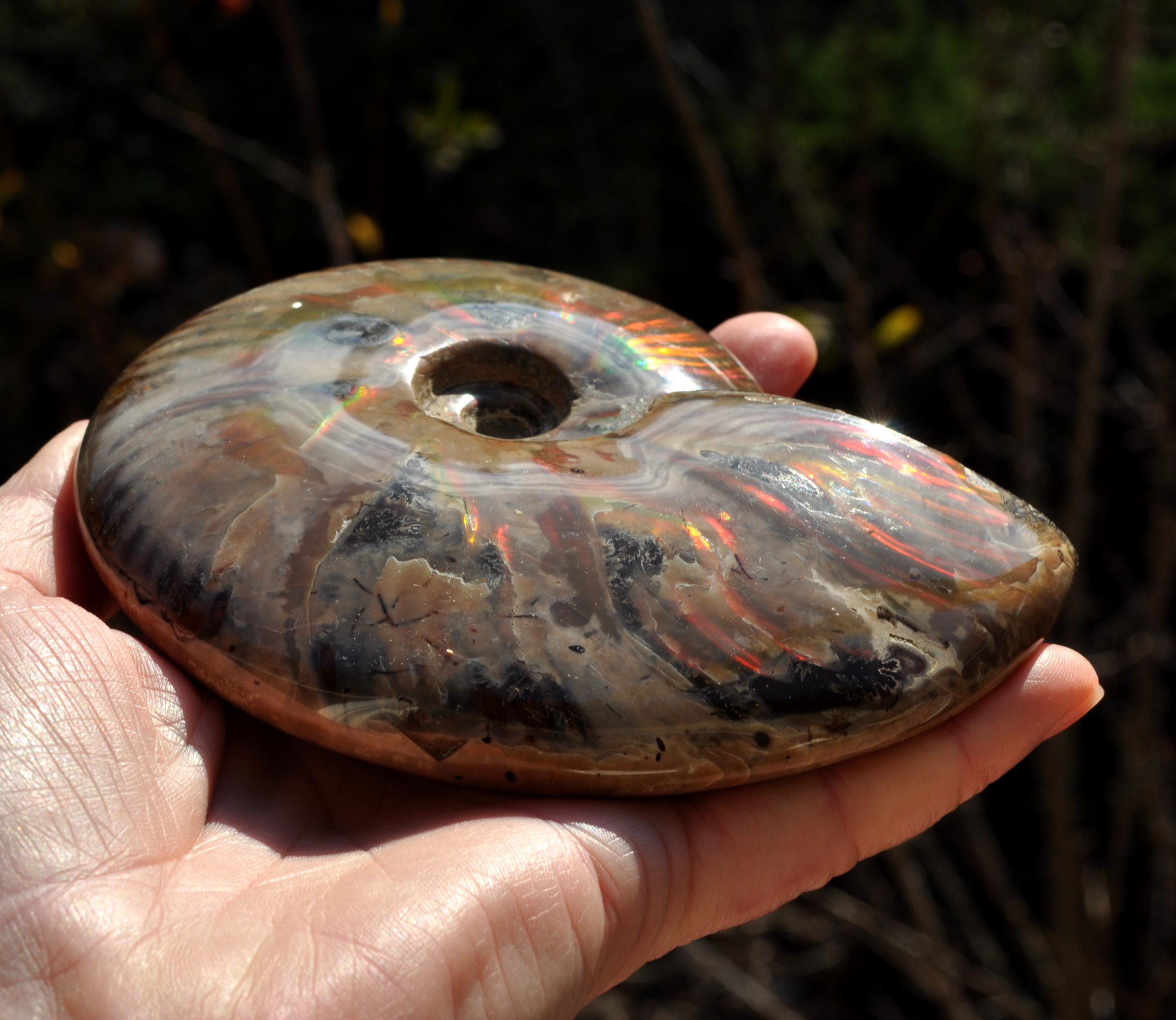 Under unique fossilization conditions, the original nacreous shell transforms into a surface of brilliant iridescent colors — flashes of green, red, blue, and gold that dance in the light. These colors come from the microstructure of the fossilized shell, creating a shimmering, rainbow-like effect that has fascinated collectors and spiritual seekers alike.