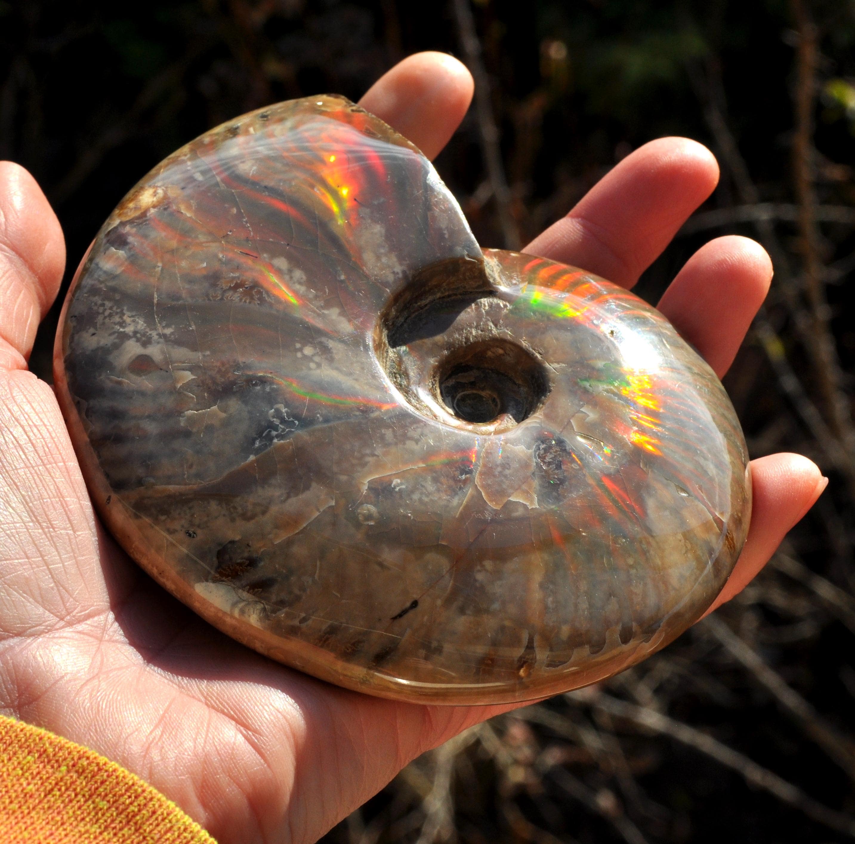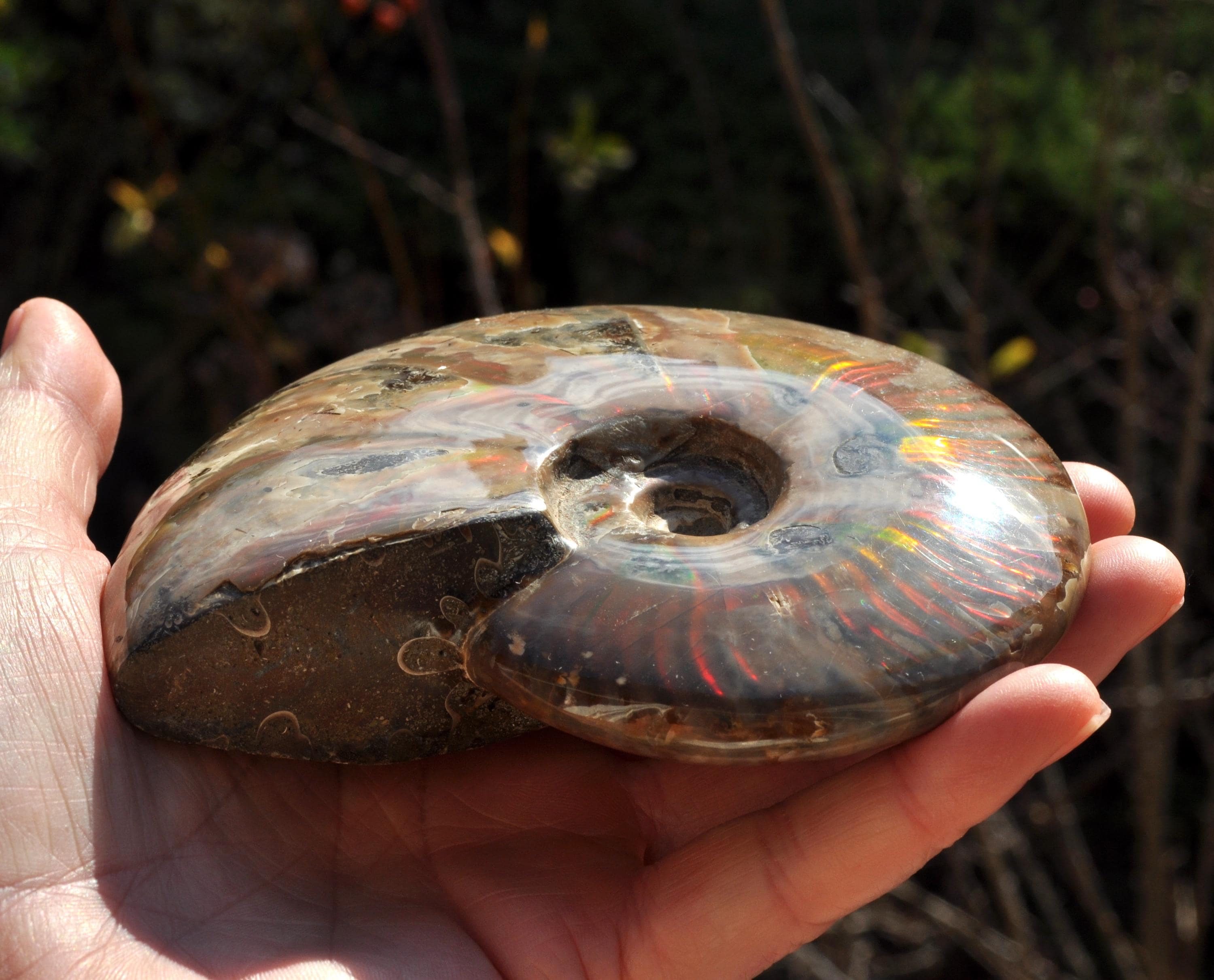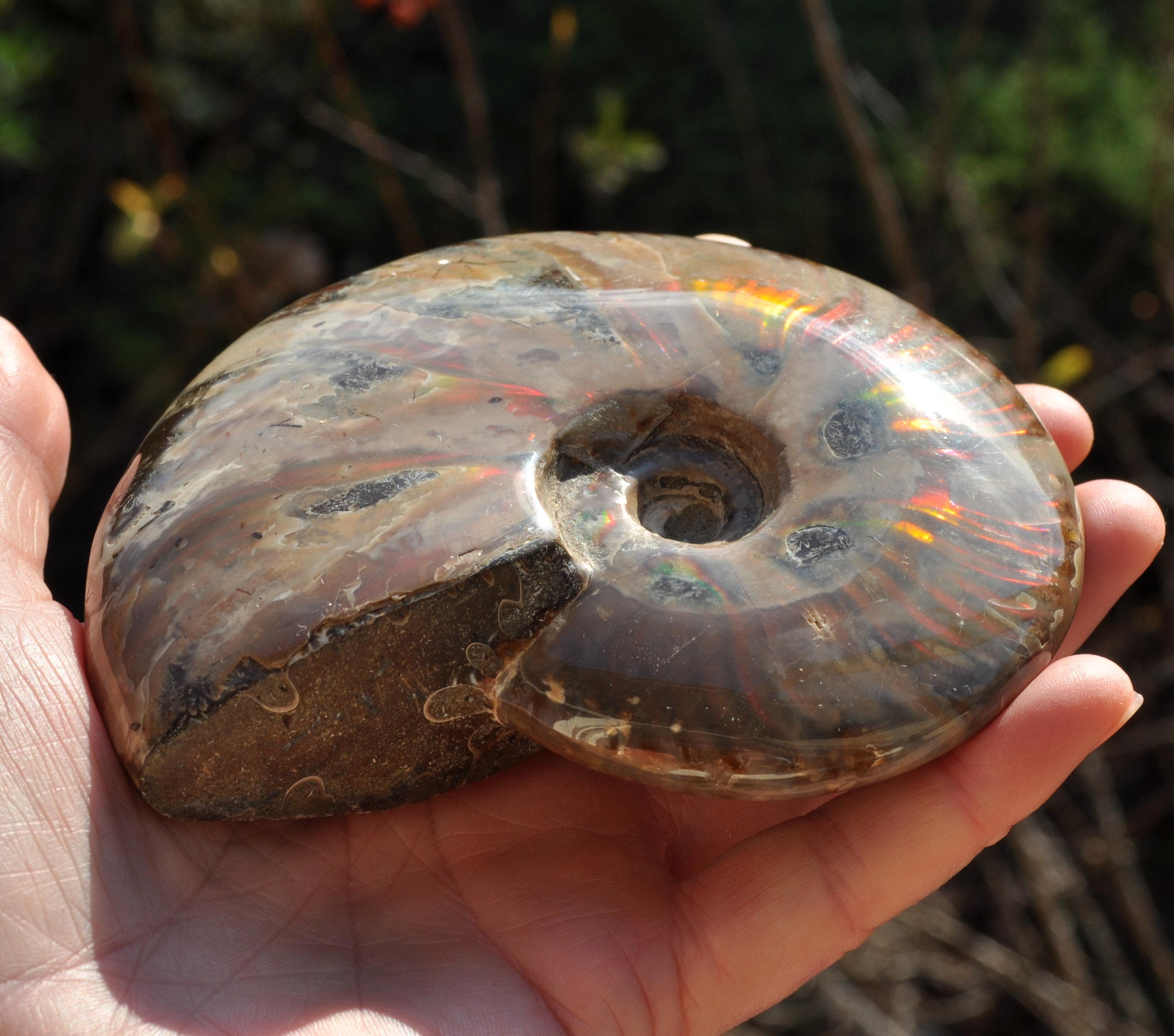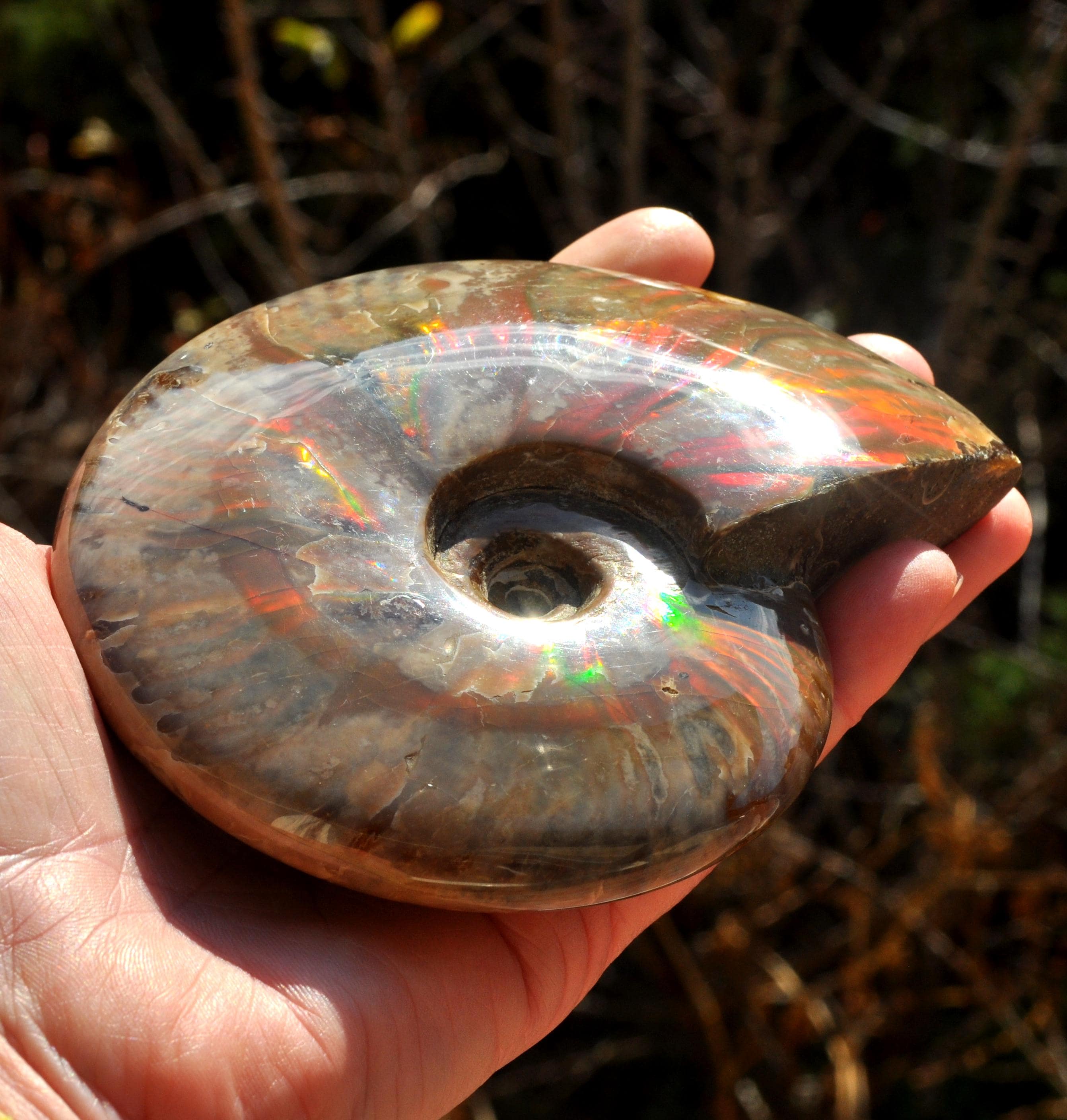 Under unique fossilization conditions, the original nacreous shell transforms into a surface of brilliant iridescent colors — flashes of green, red, blue, and gold that dance in the light. These colors come from the microstructure of the fossilized shell, creating a shimmering, rainbow-like effect that has fascinated collectors and spiritual seekers alike.