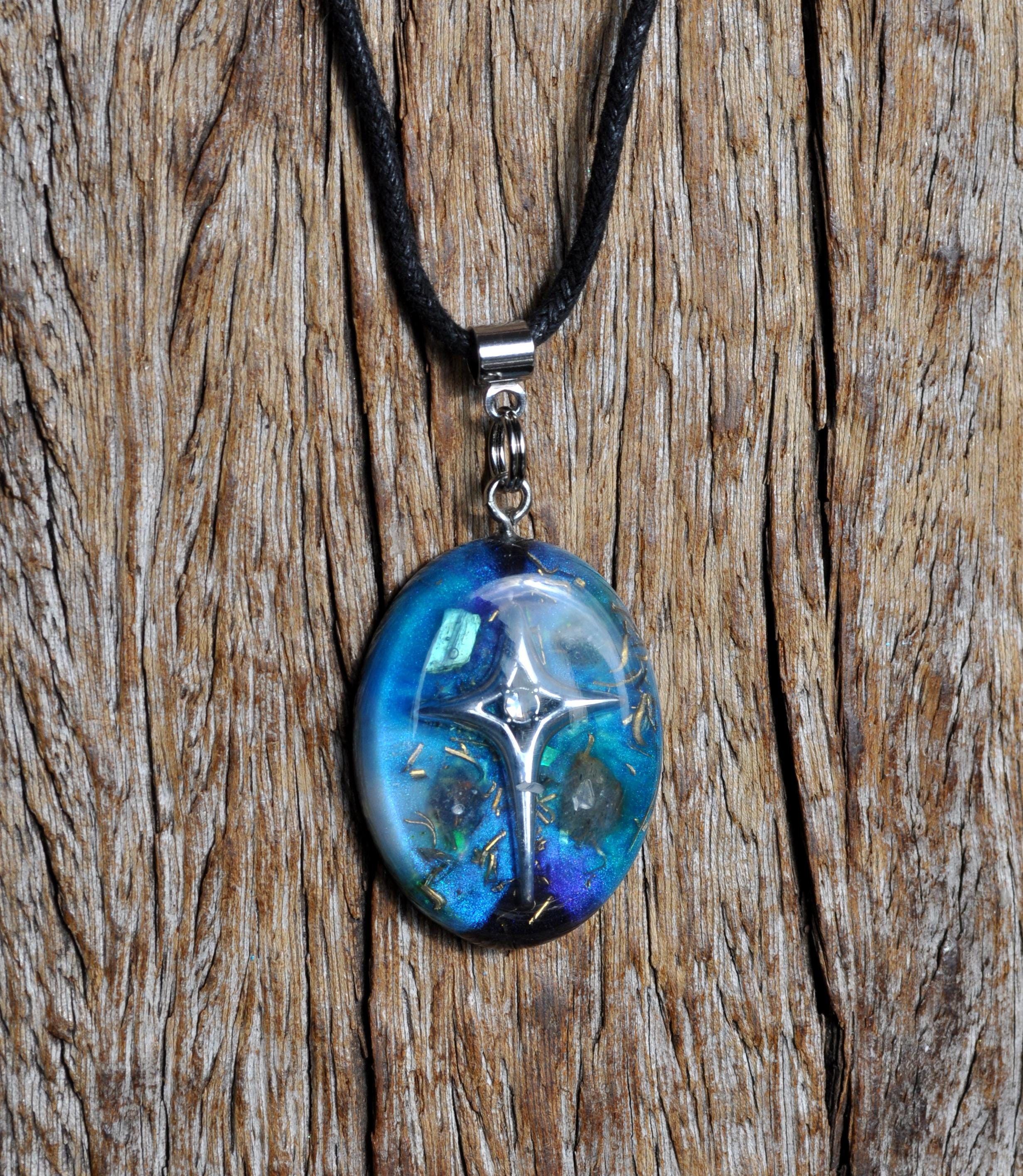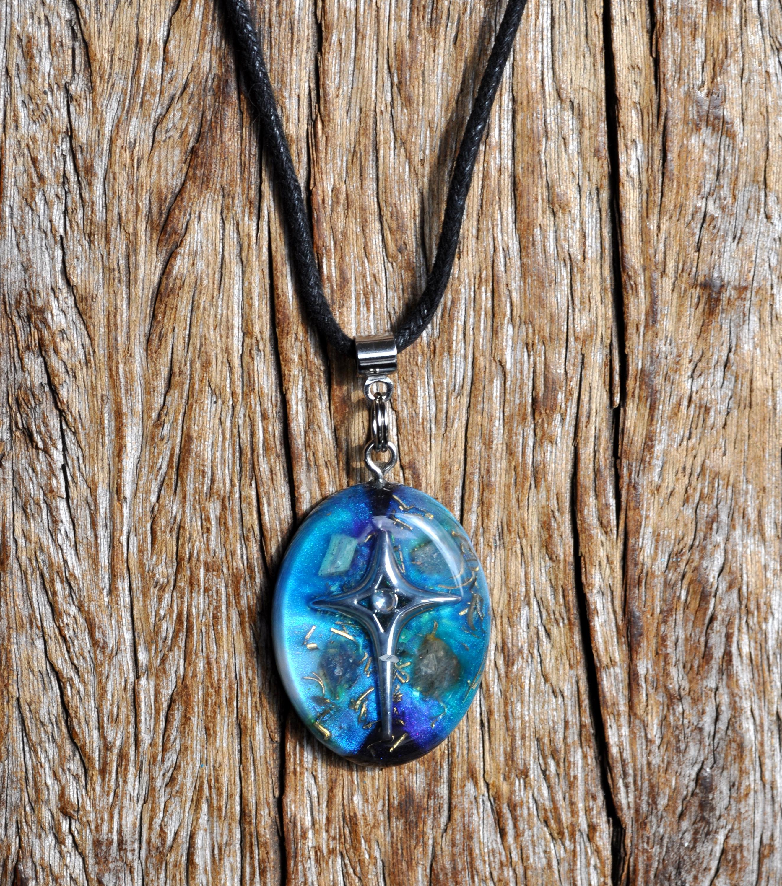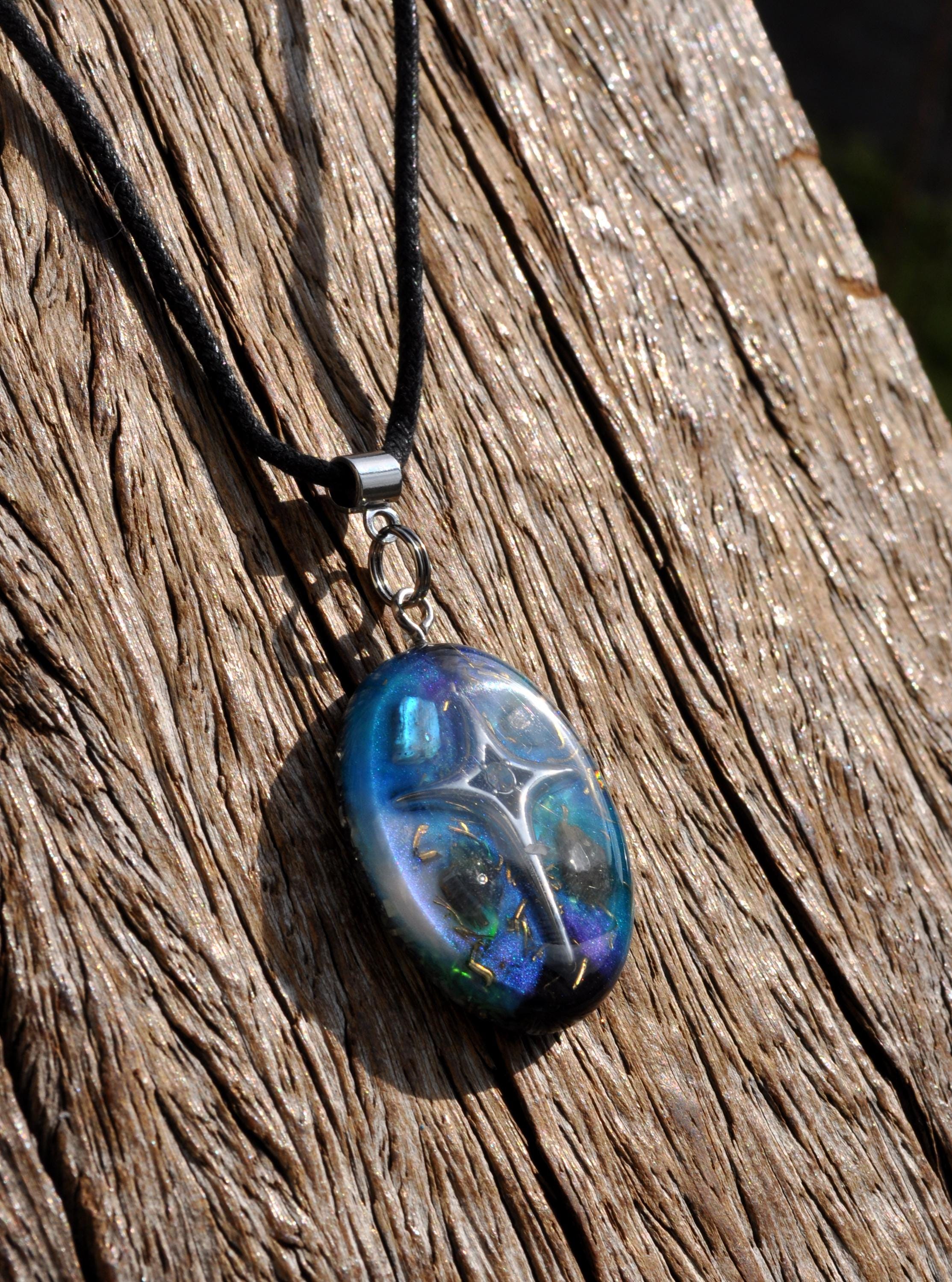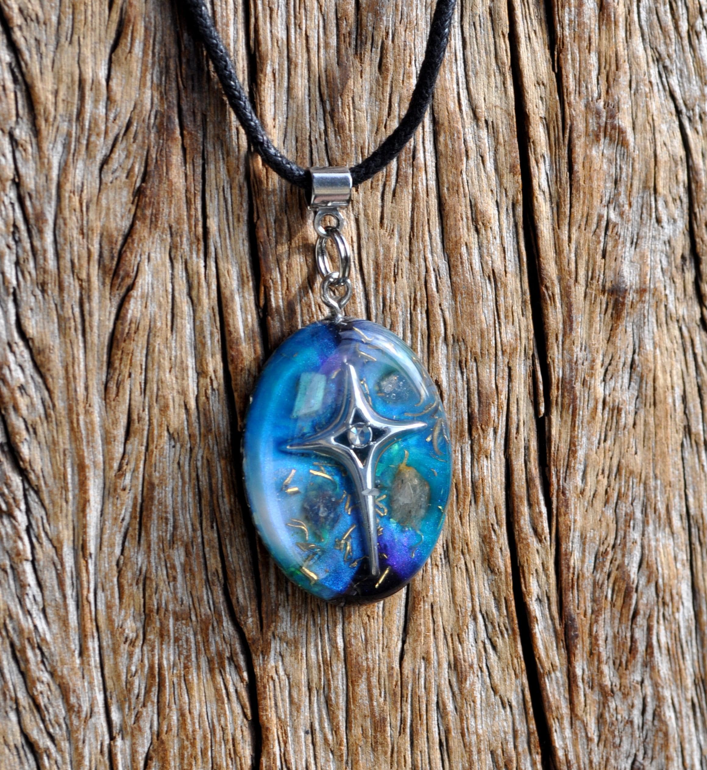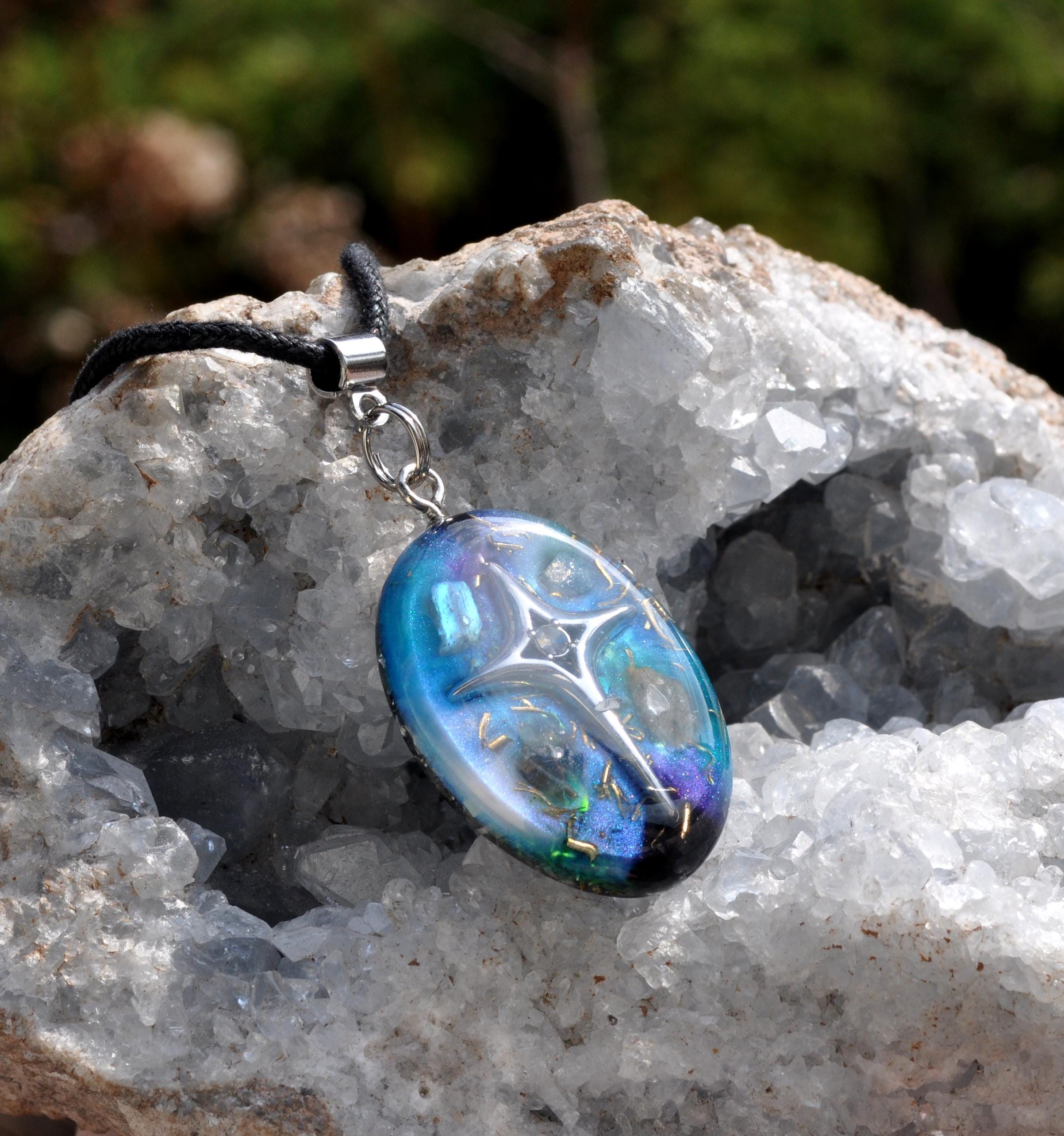 This handmade OrgoniteĀ® pendant is a unique spiritual accessory designed to balance energy, strengthen intuition, and deepen your cosmic connection. A detailed star design rests on hand-poured cosmic resin in purple, blue, black, and silver ā colors inspired by the mystery of the night sky.