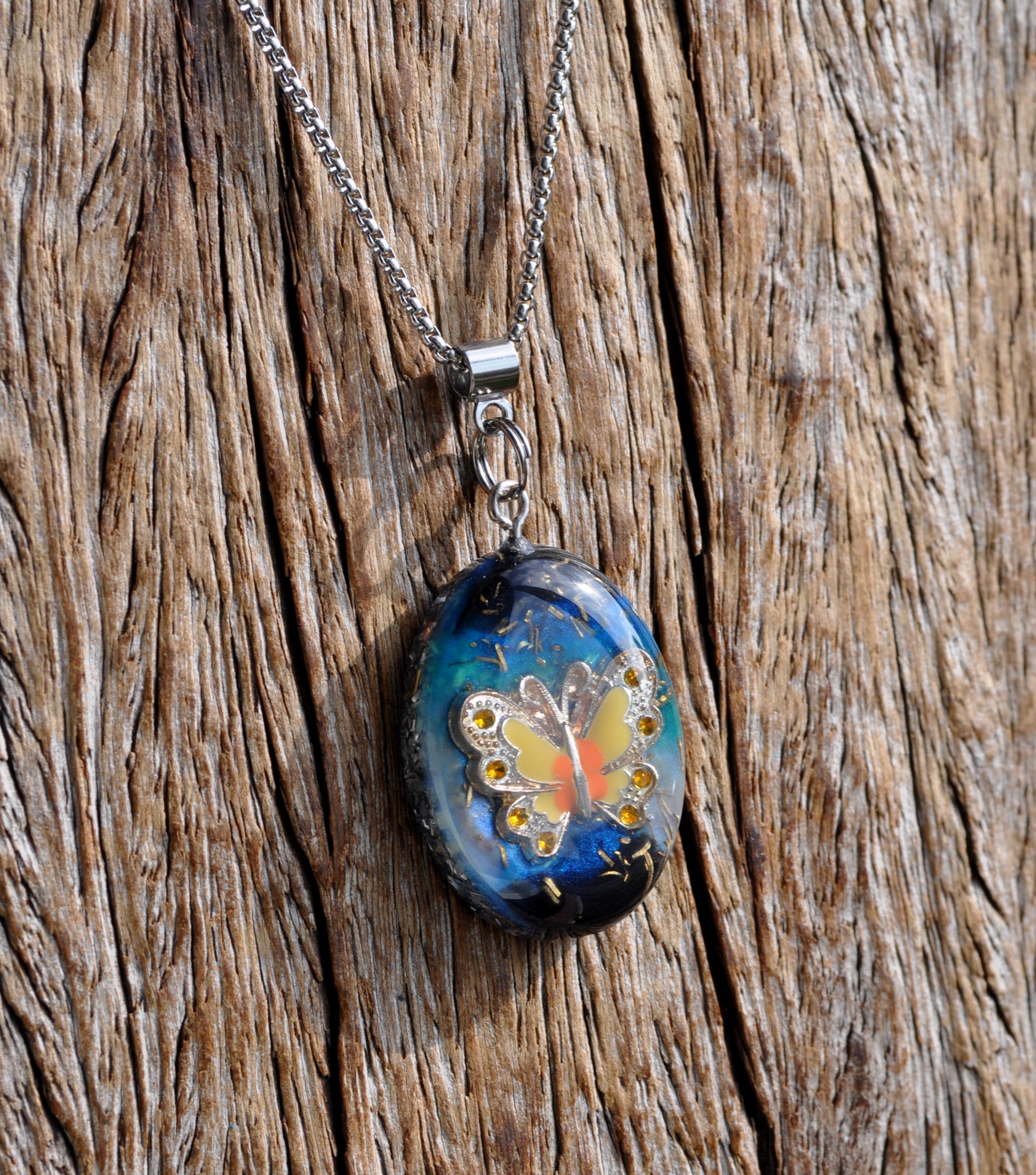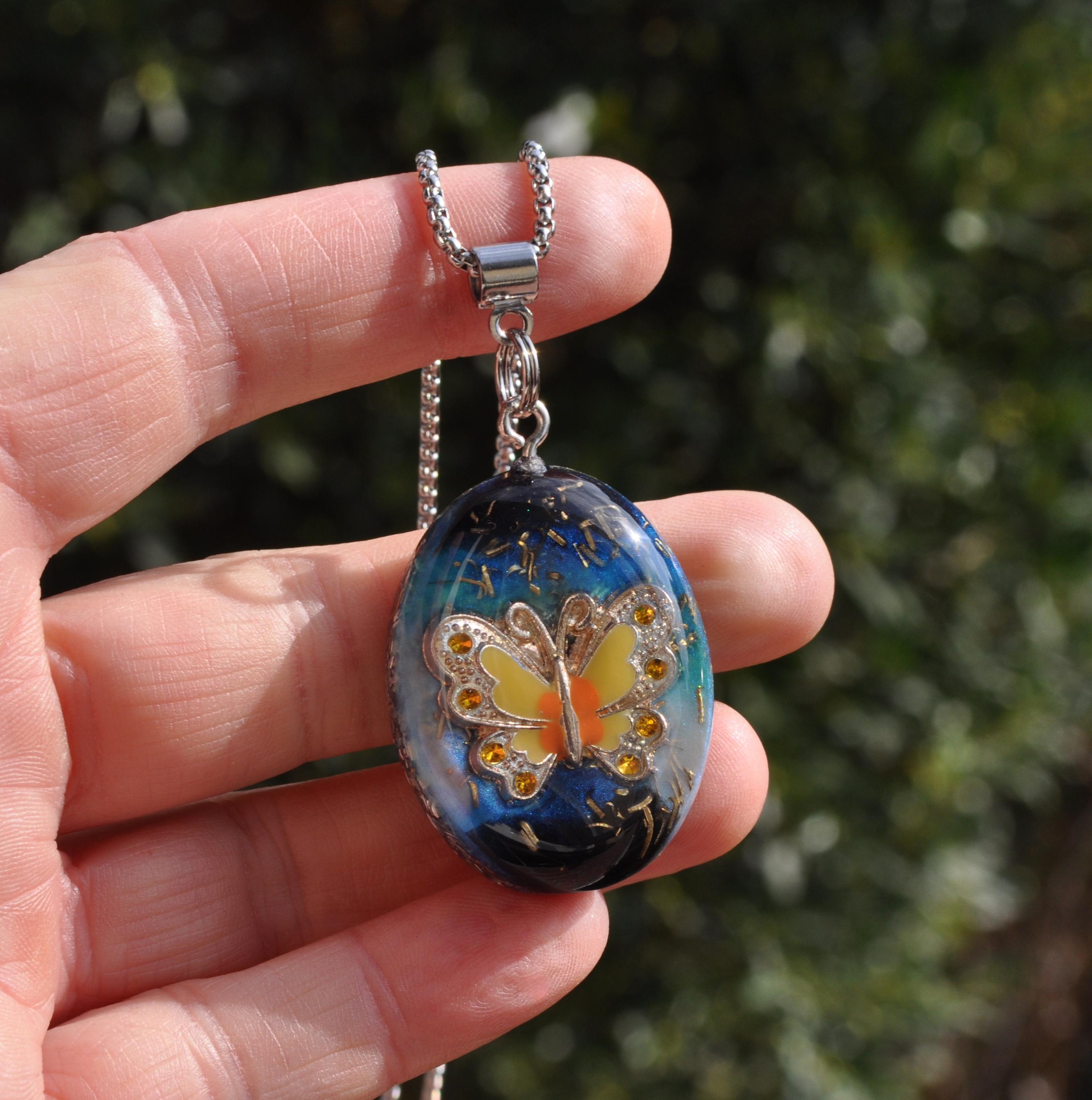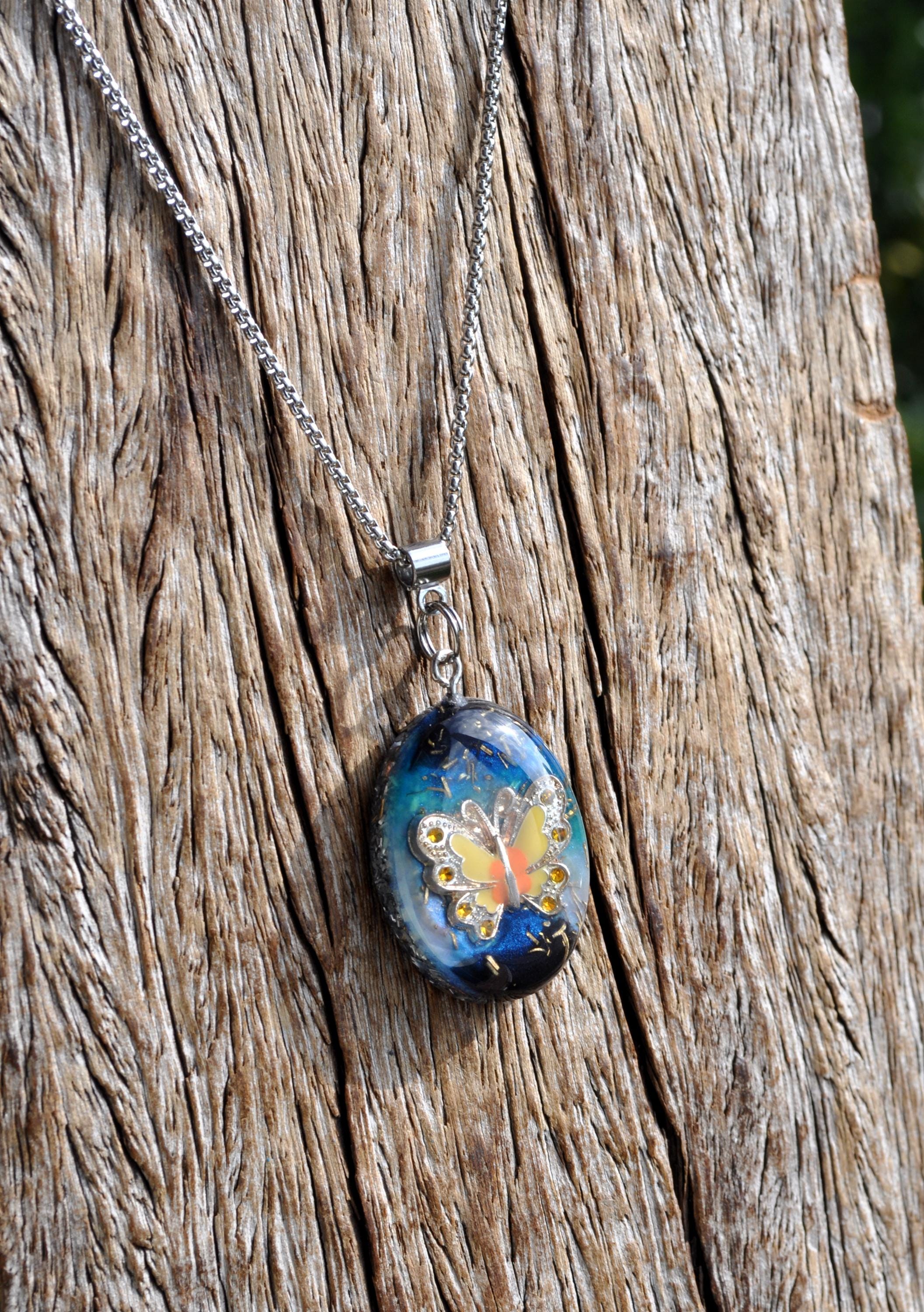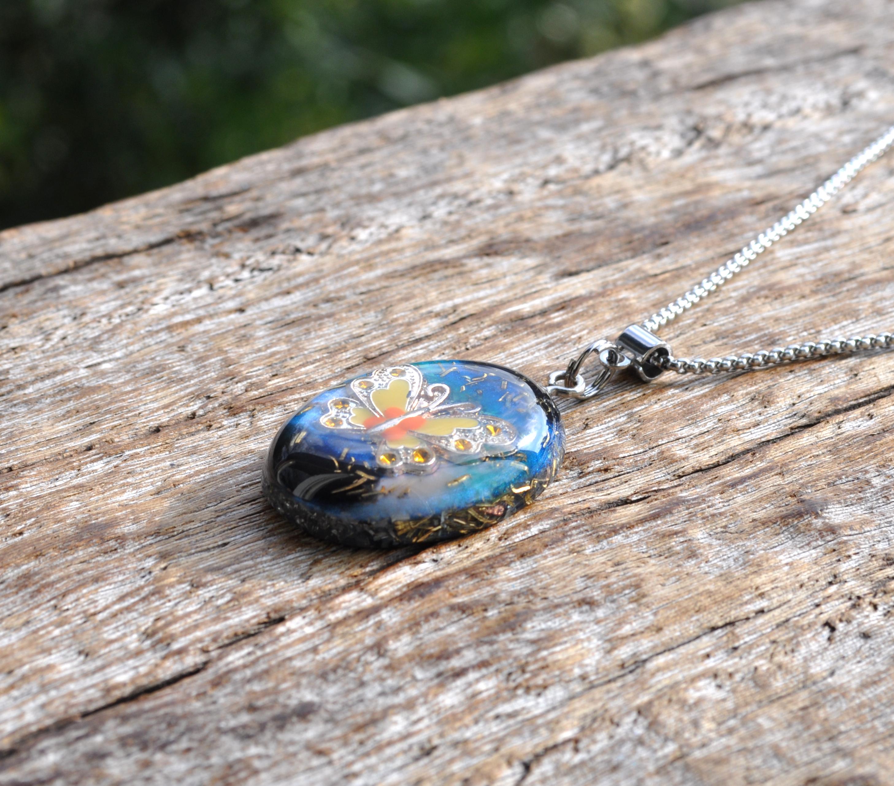 This unique Orgonite® butterfly necklace features a beautiful yellow, orange and silver enamel butterfly. Behind the butterfly I created a colorful resin background with hints of blue, turquoise and black, finished with metal shavings for a special layered look.