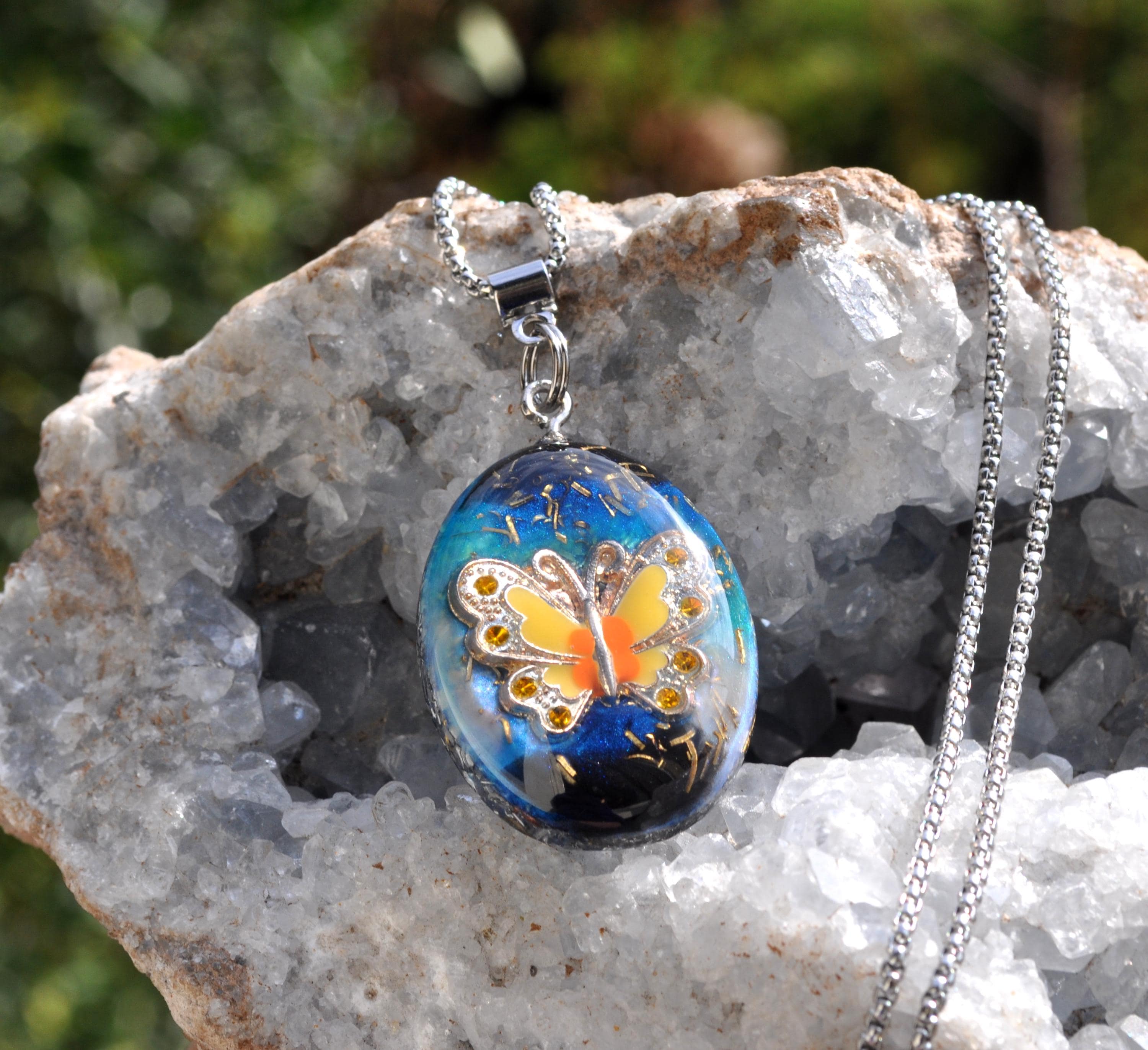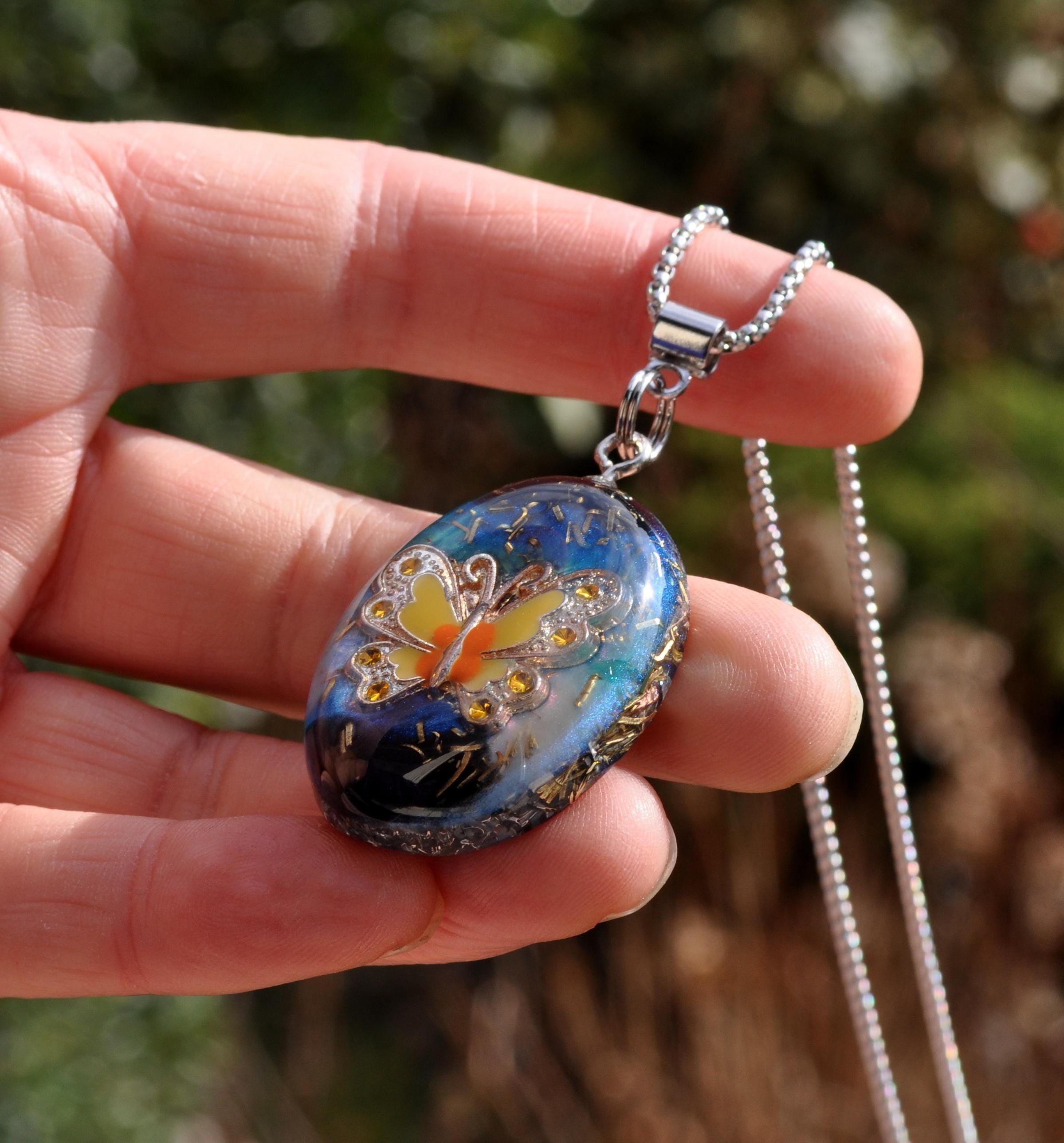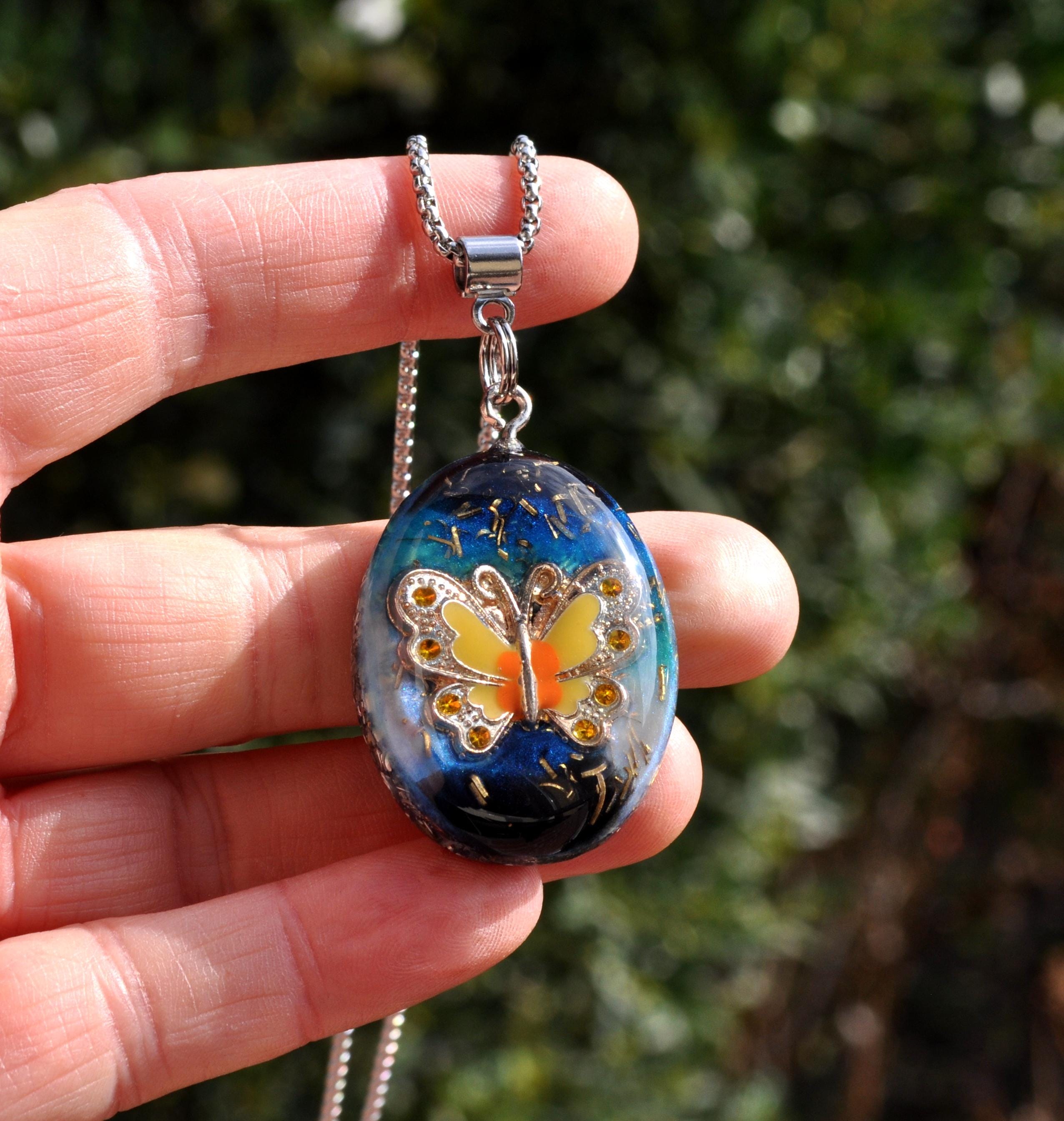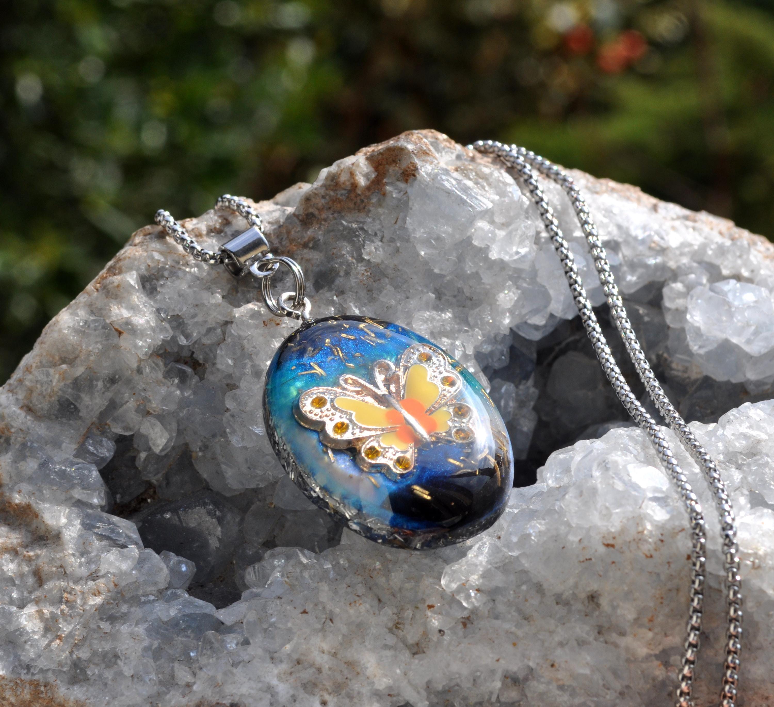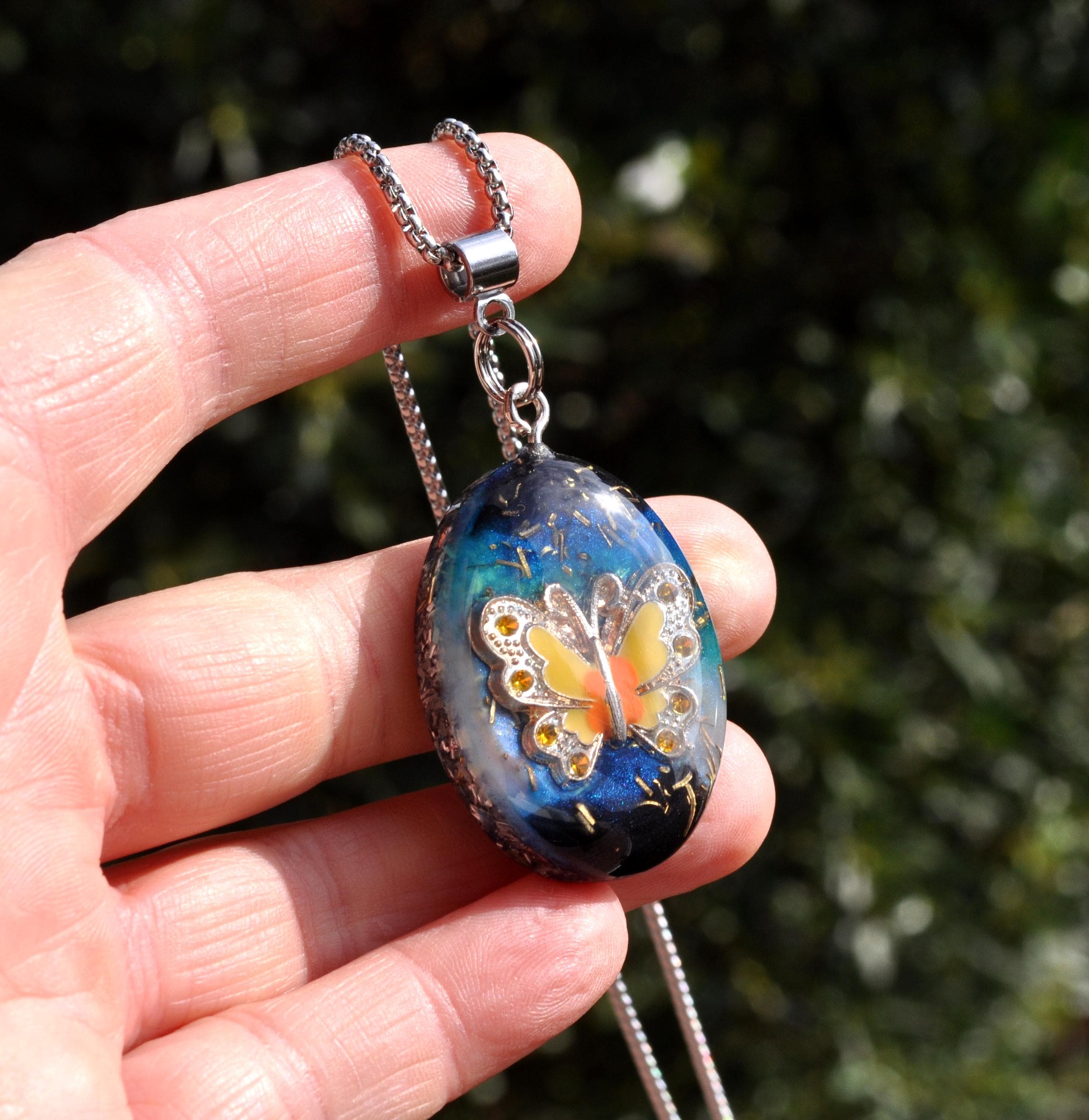 This unique Orgonite® butterfly necklace features a beautiful yellow, orange and silver enamel butterfly. Behind the butterfly I created a colorful resin background with hints of blue, turquoise and black, finished with metal shavings for a special layered look.